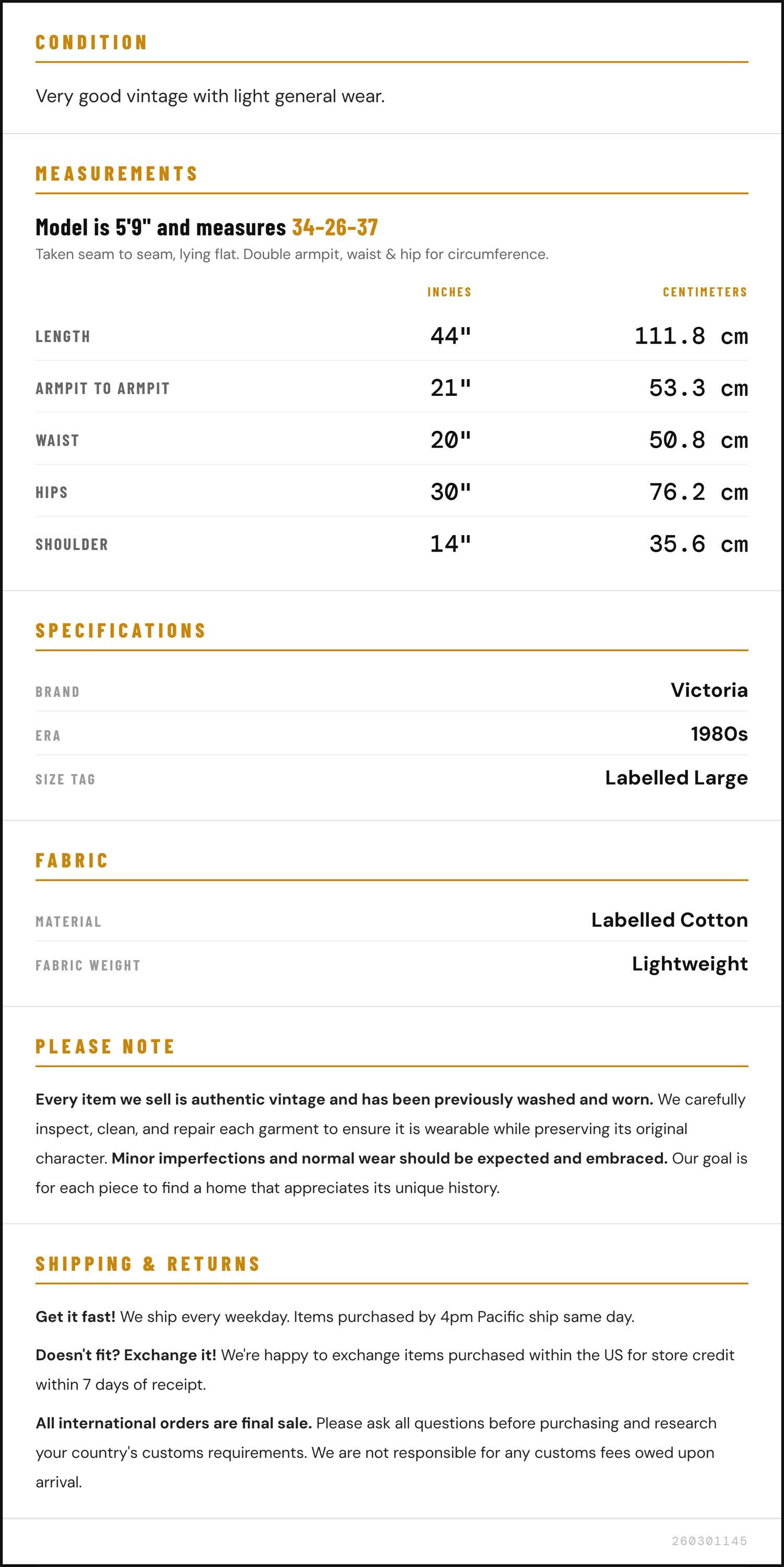 Taken from seam to seam while the garment is lying flat. Double the armpit, waist, and hip measurements.
