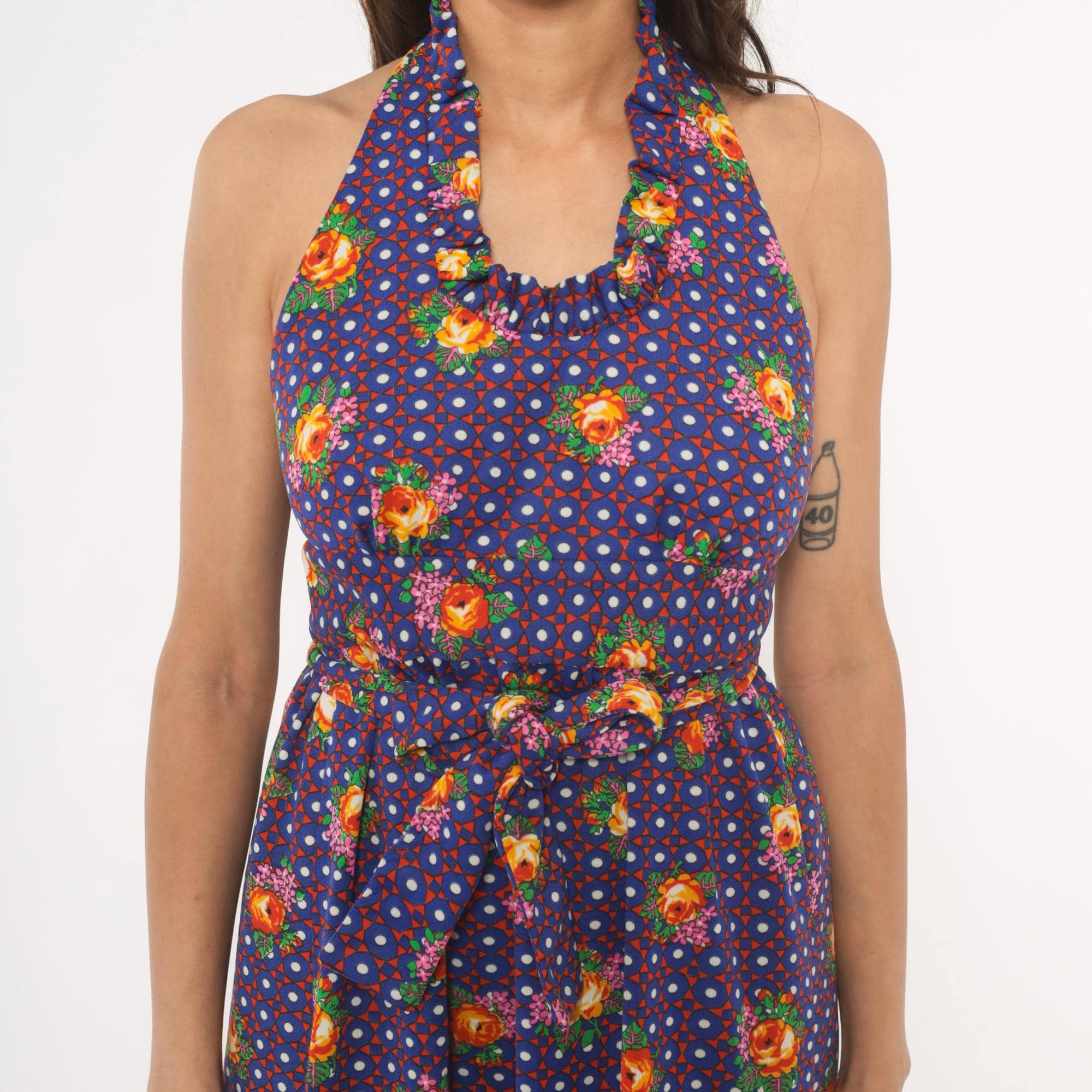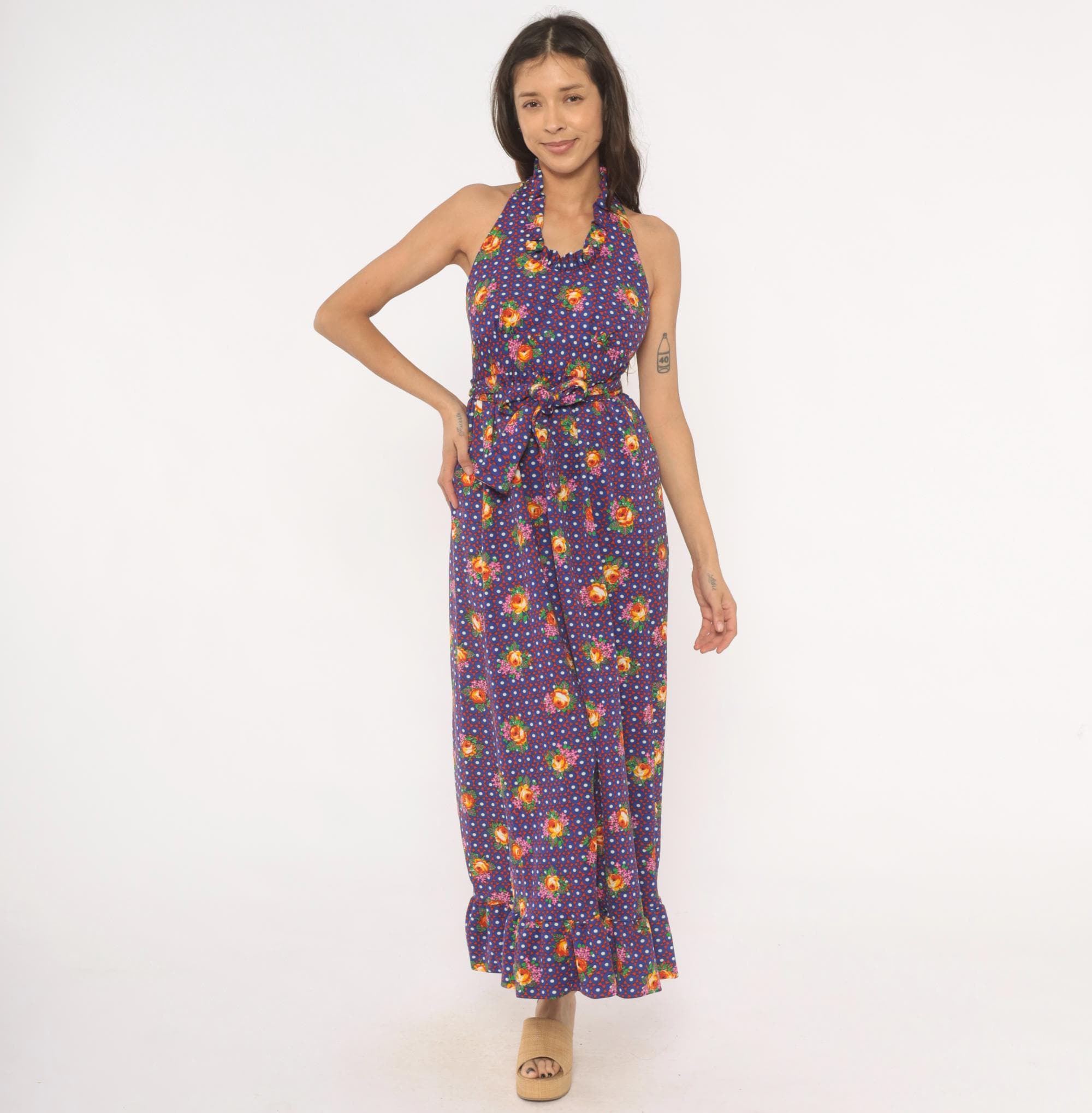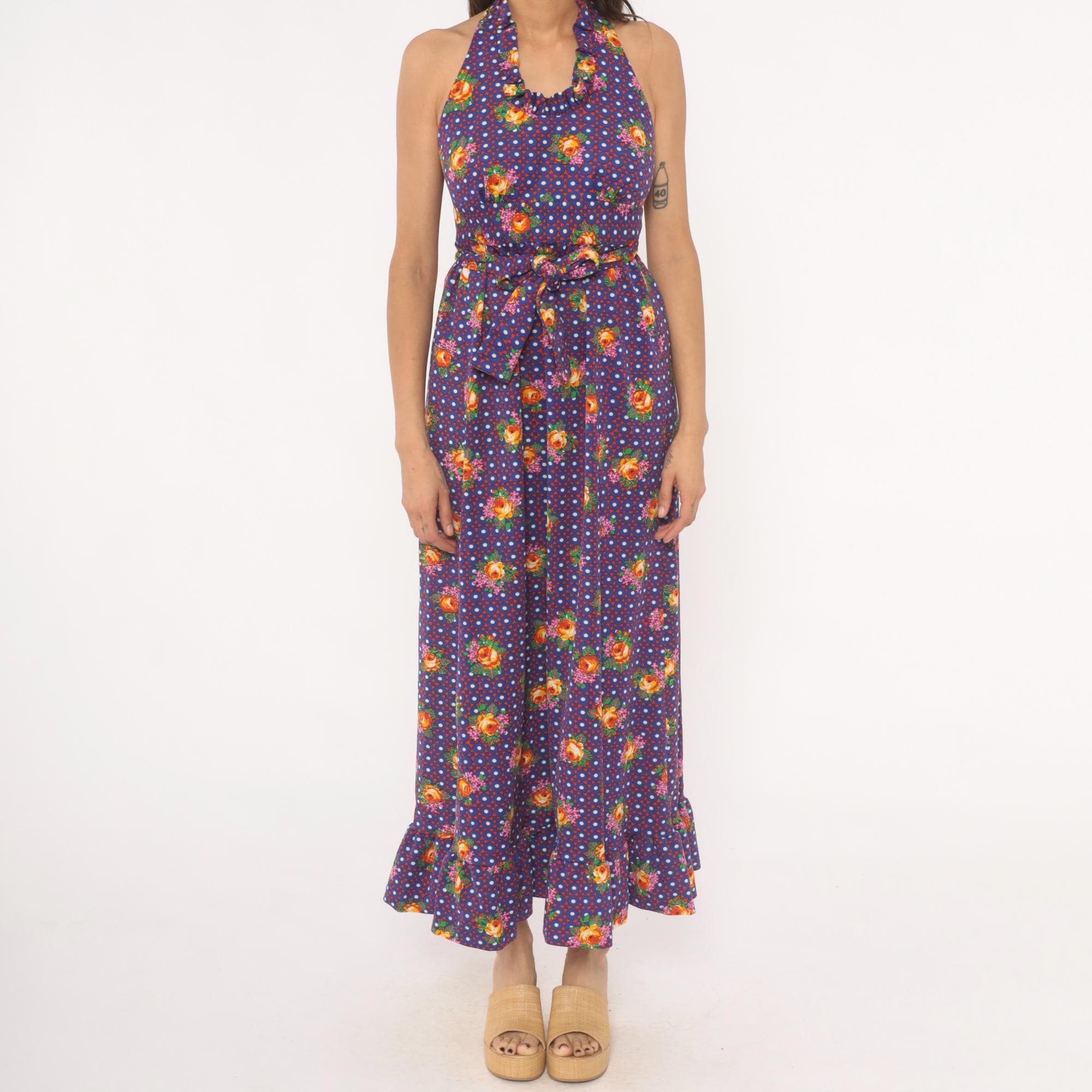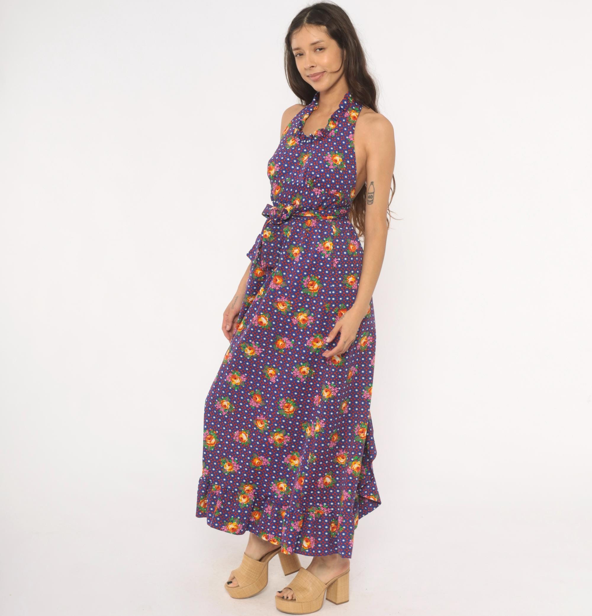 70s halter neck dress in purple and cobalt with an allover polka dot and rose floral print in orange, pink, yellow, and green. Scoop neckline with ruffle trim, open back, and wrap around style tie belt.
