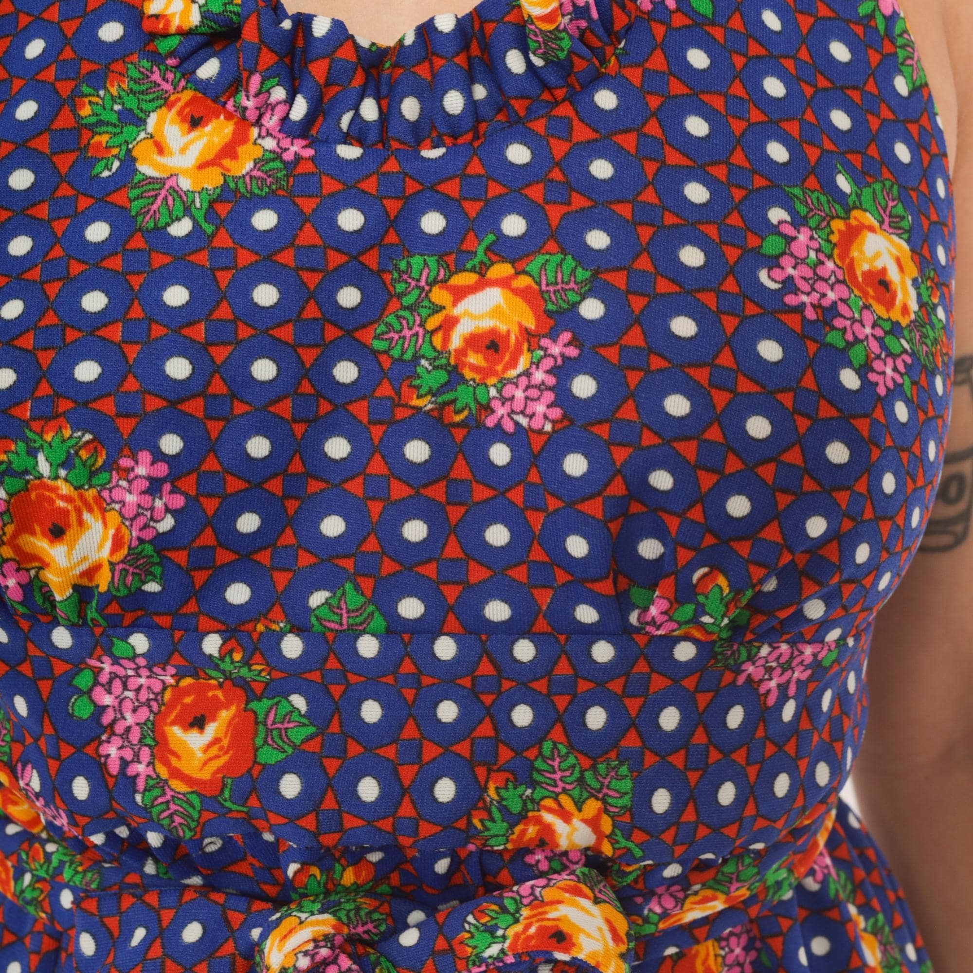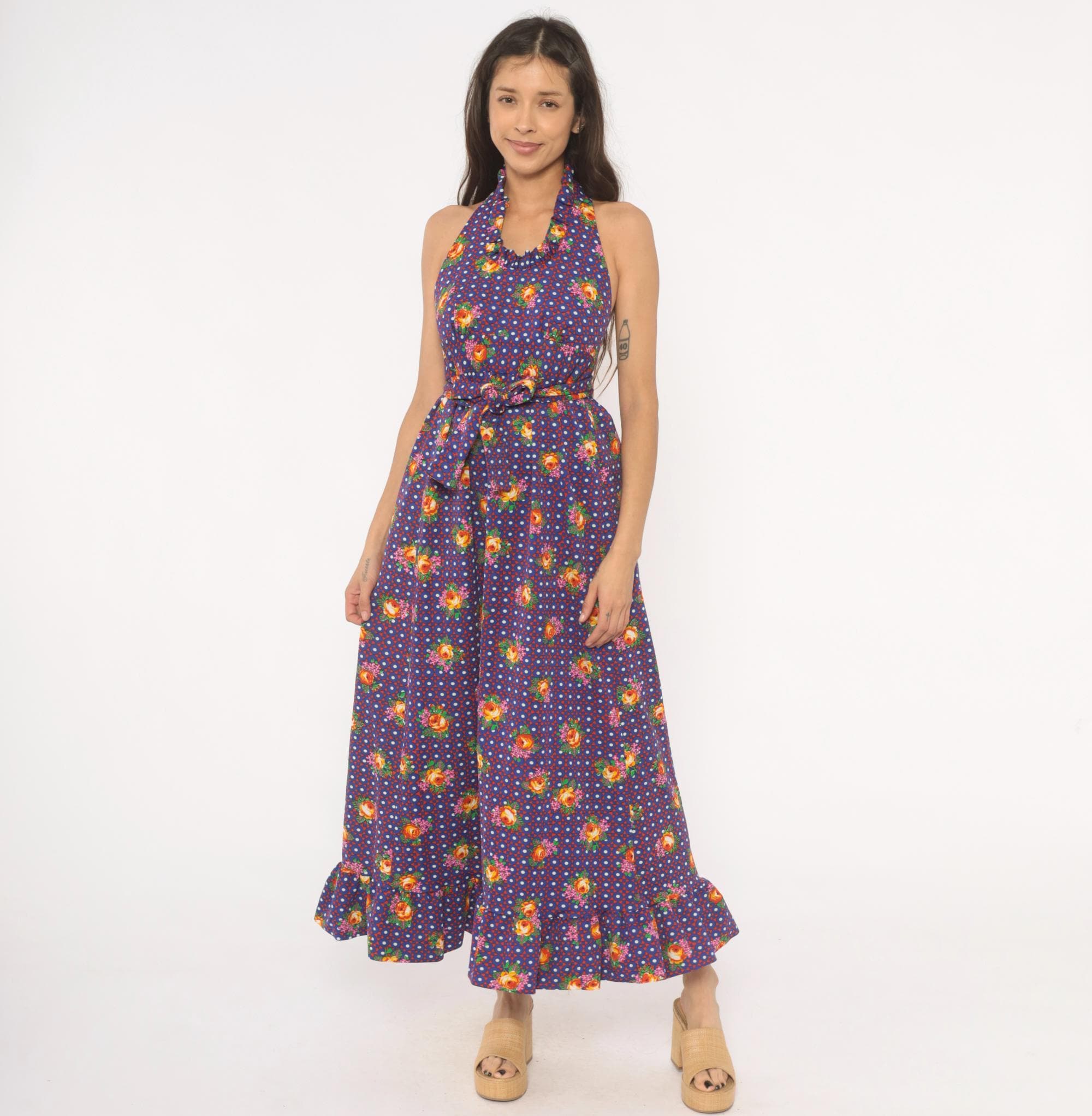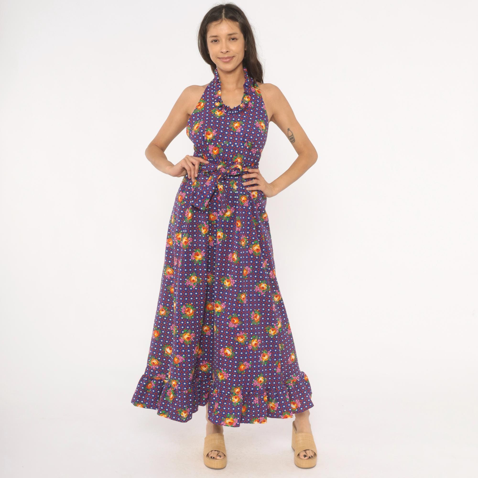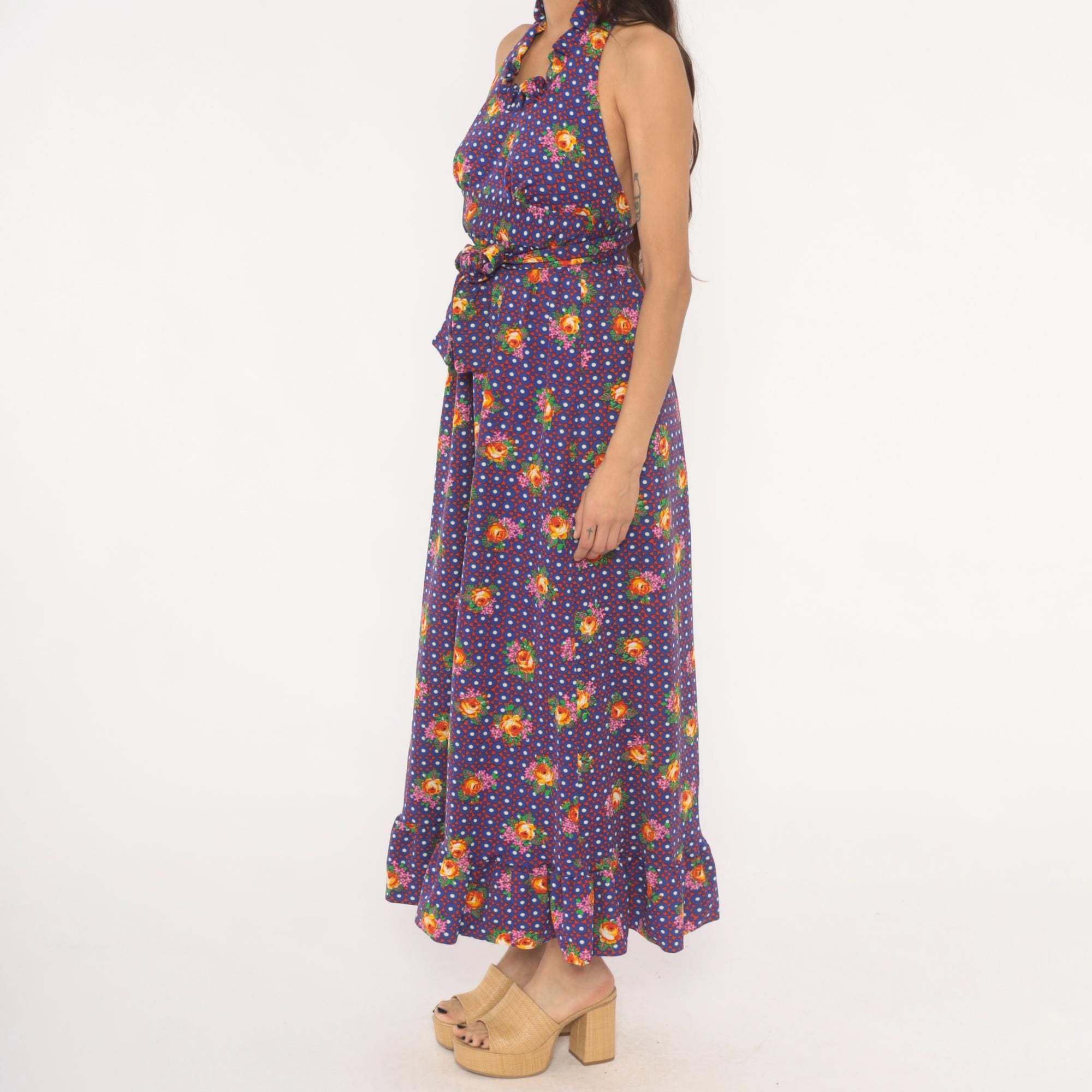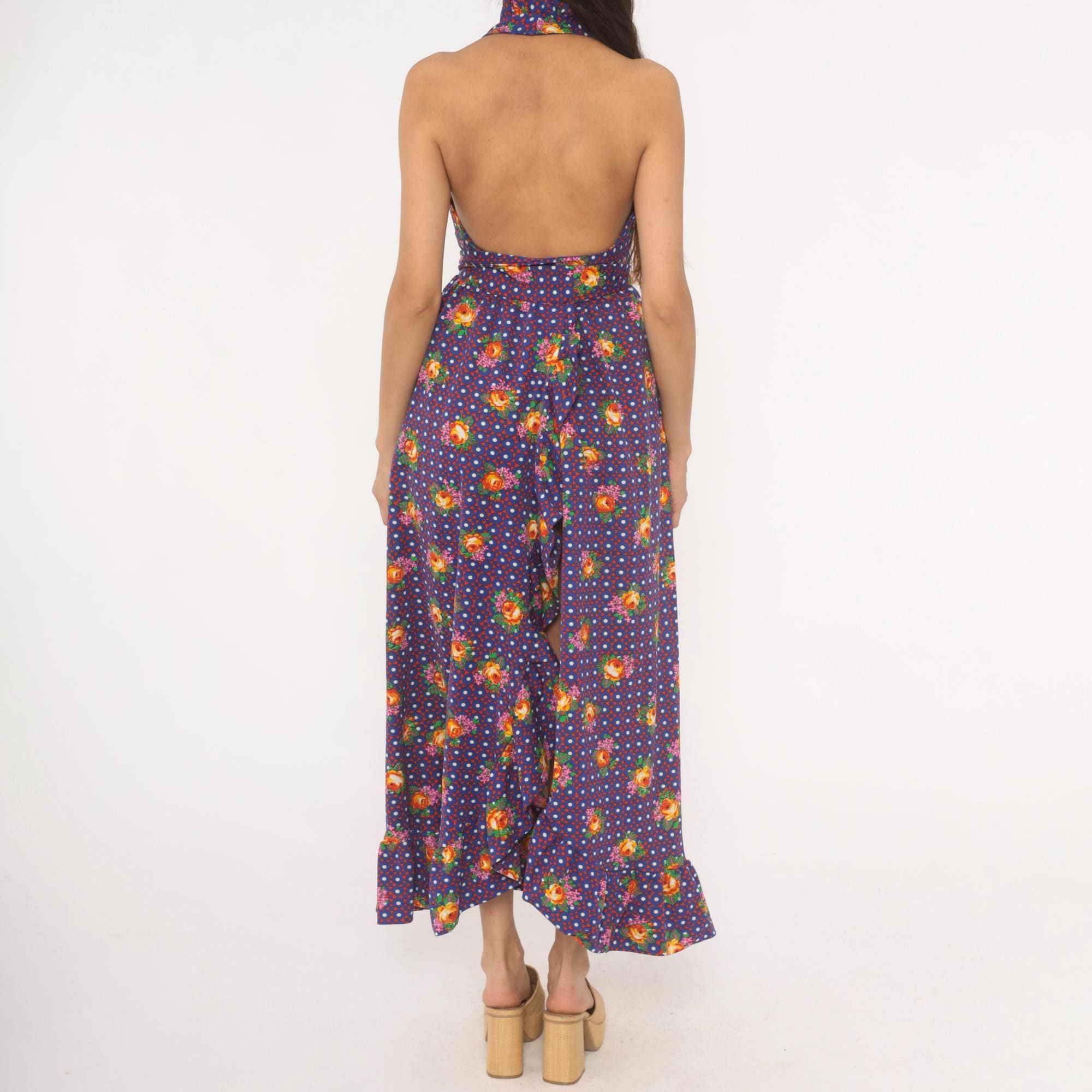 70s halter neck dress in purple and cobalt with an allover polka dot and rose floral print in orange, pink, yellow, and green. Scoop neckline with ruffle trim, open back, and wrap around style tie belt.