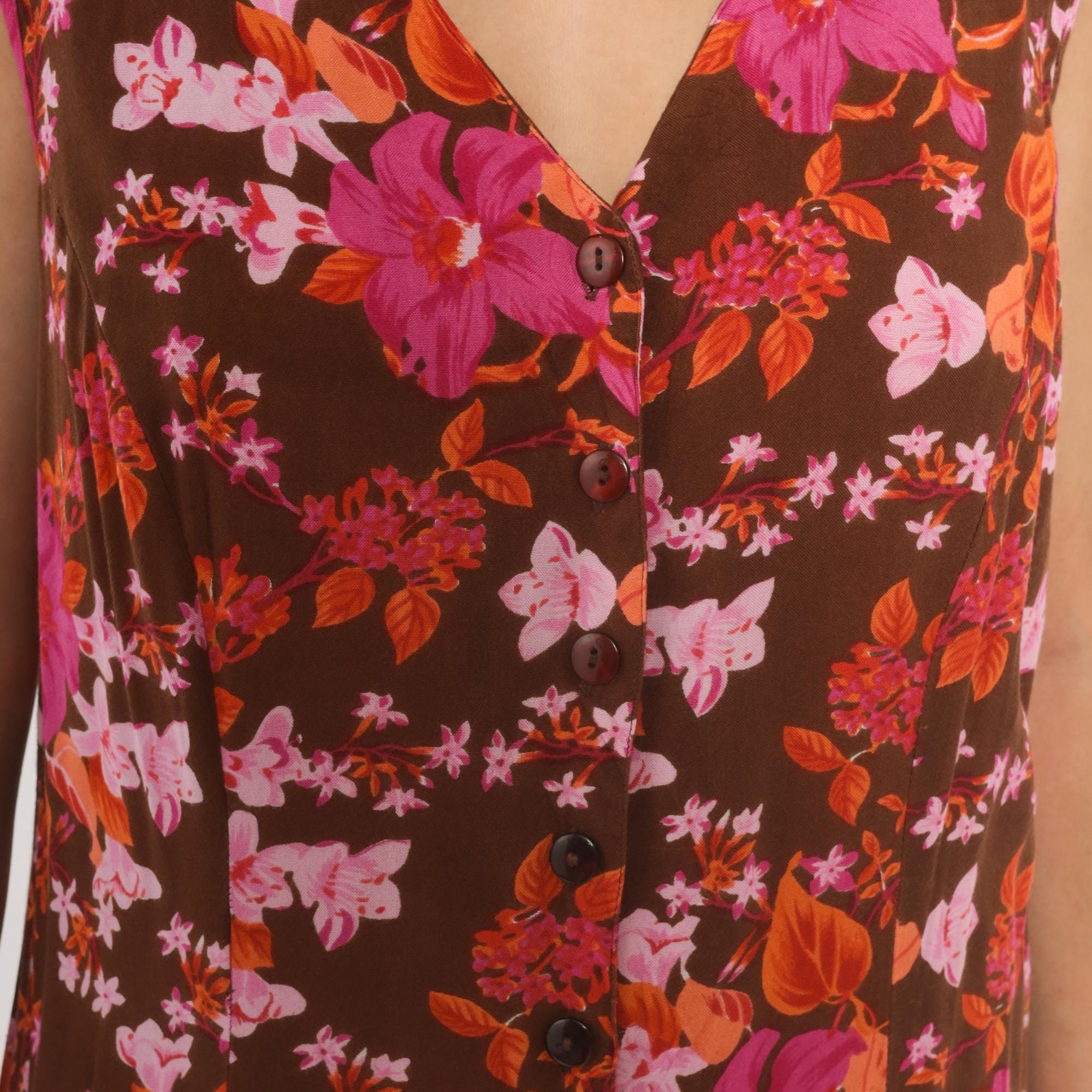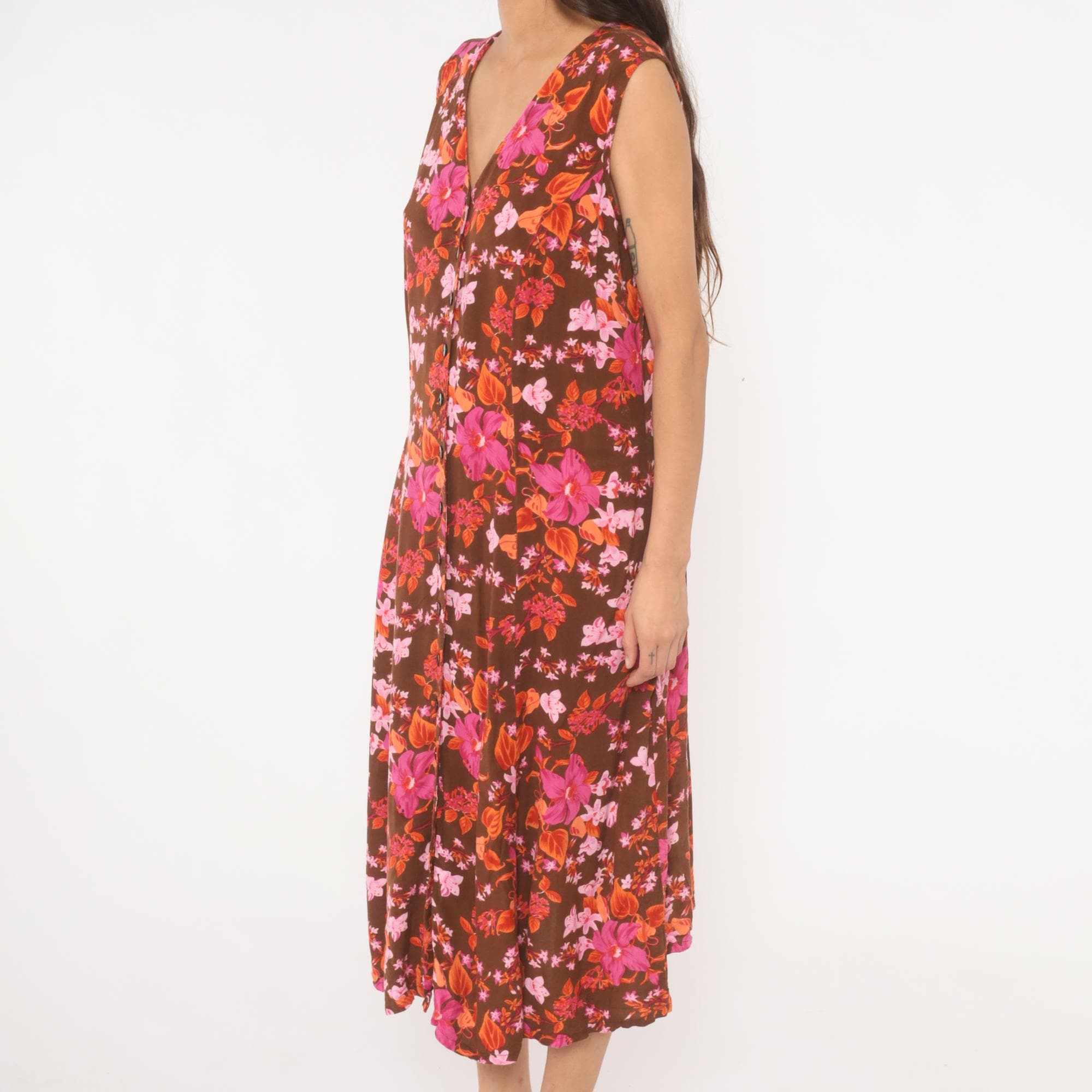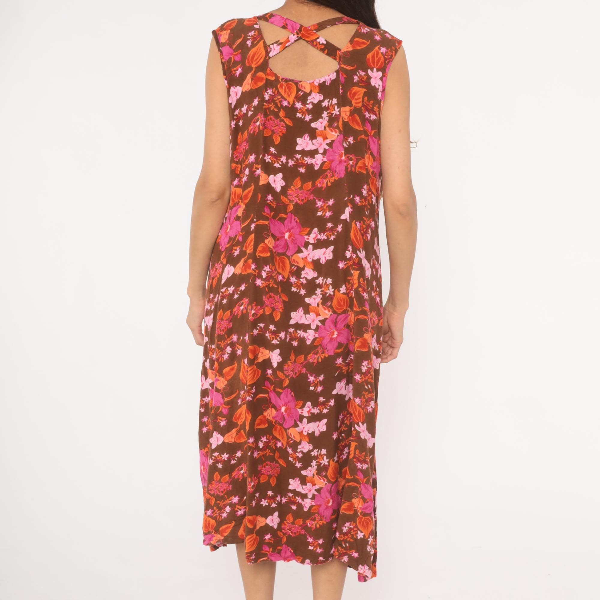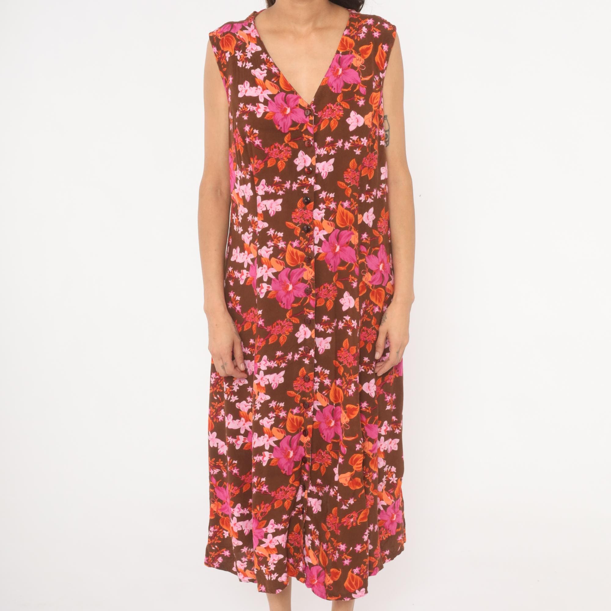 2000s brown midi dress from Roaman's with a dense tropical floral print in magenta, pink, coral, and burnt orange tones. V-neckline with button front closure running the full length, sleeveless cut with criss-cross strap detail at the upper back. Loose, straight silhouette with a relaxed shift shape through the body.