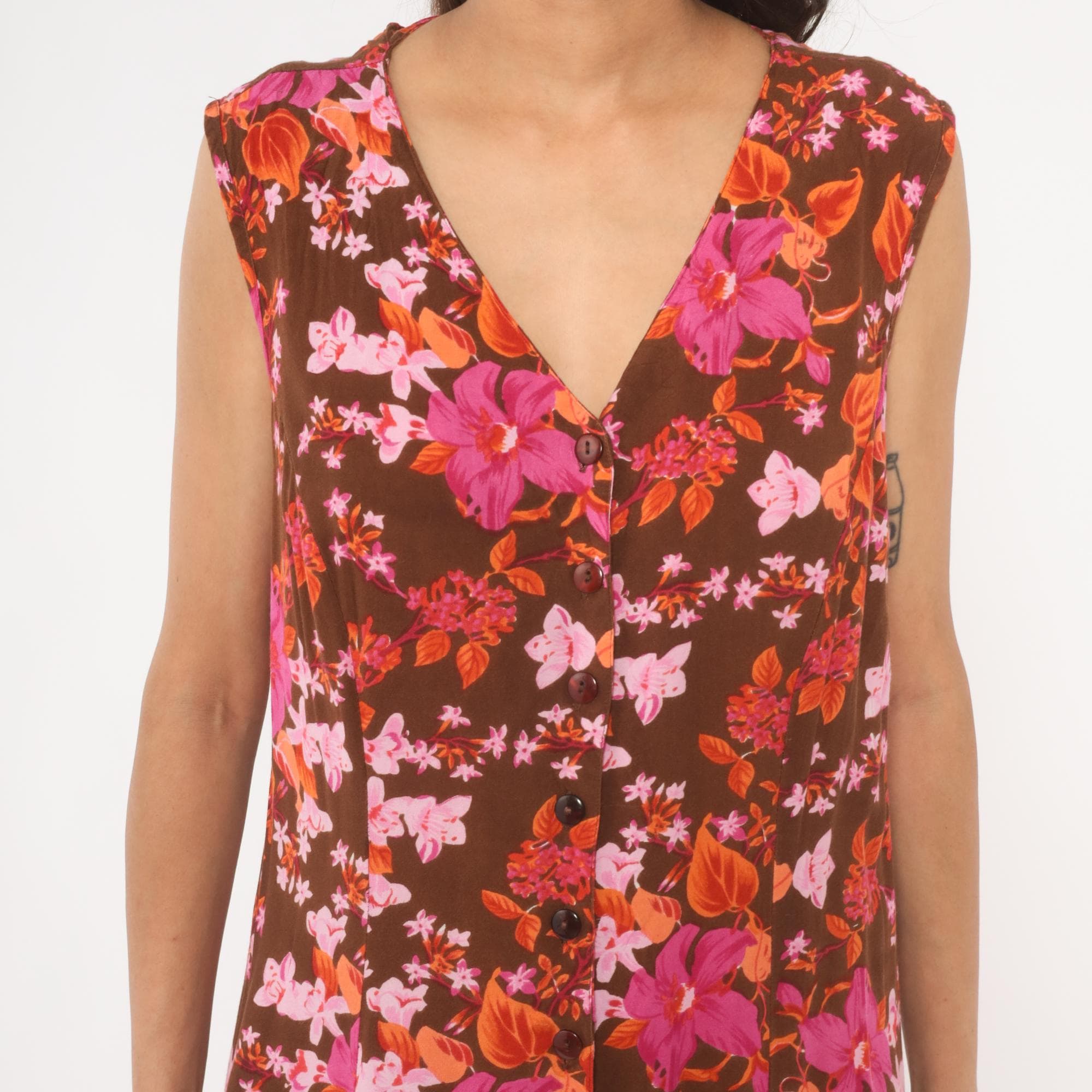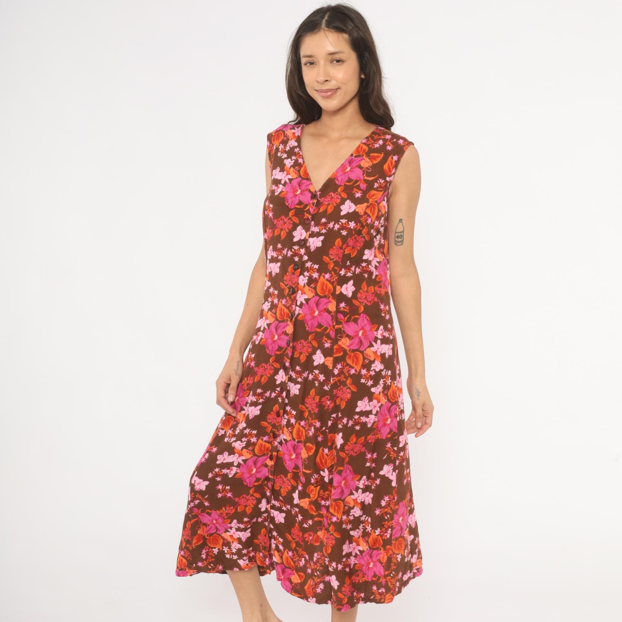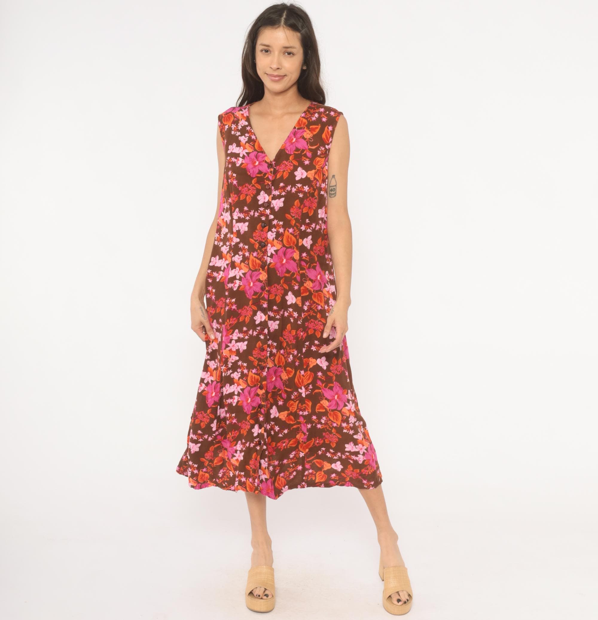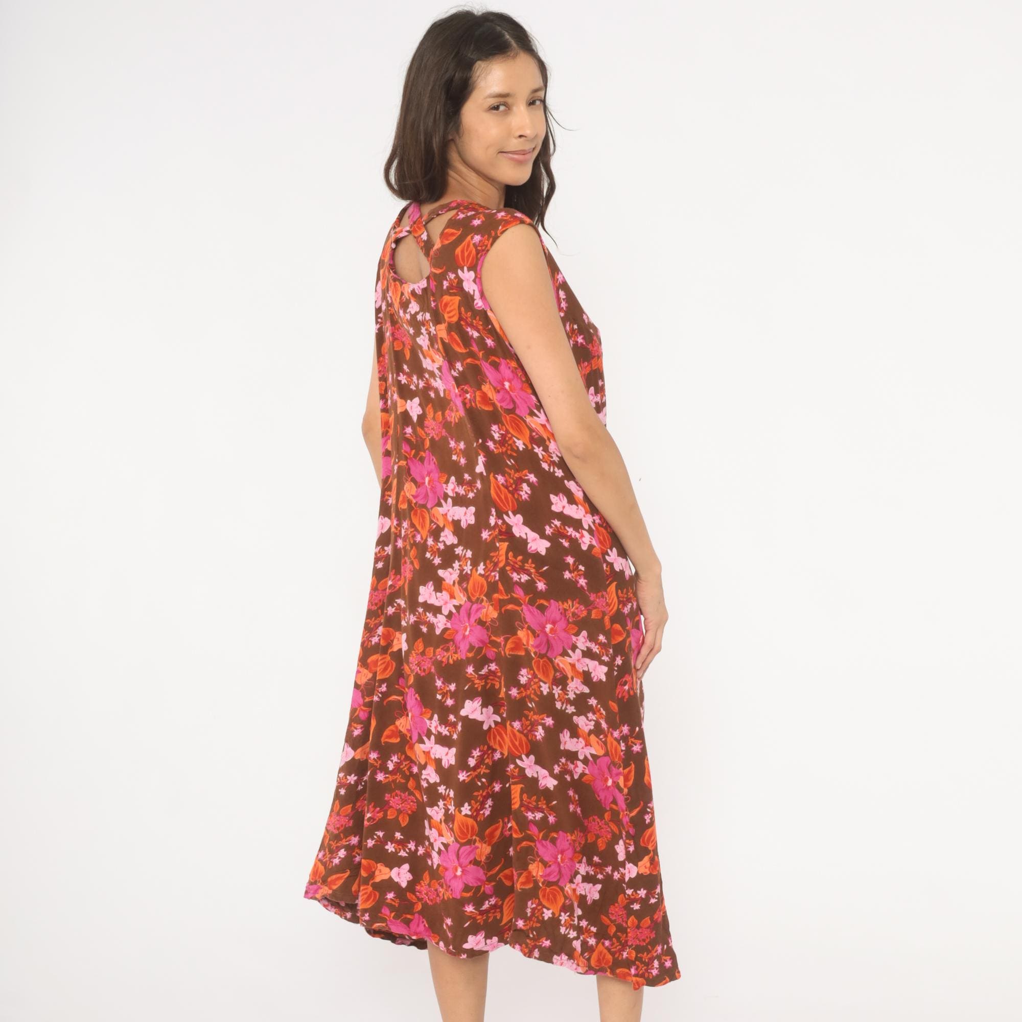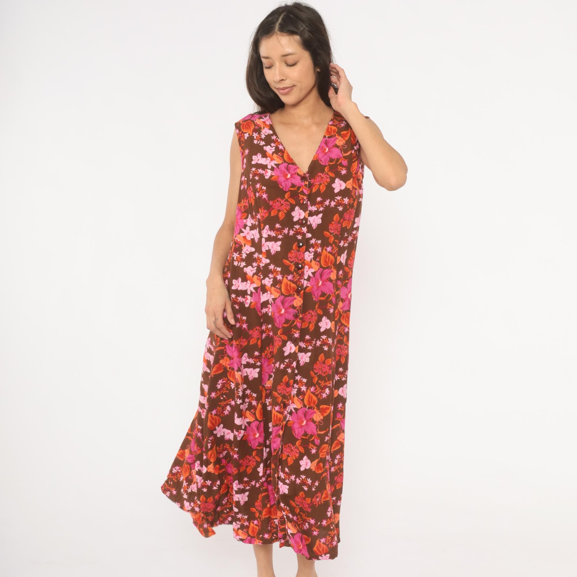 2000s brown midi dress from Roaman's with a dense tropical floral print in magenta, pink, coral, and burnt orange tones. V-neckline with button front closure running the full length, sleeveless cut with criss-cross strap detail at the upper back. Loose, straight silhouette with a relaxed shift shape through the body.