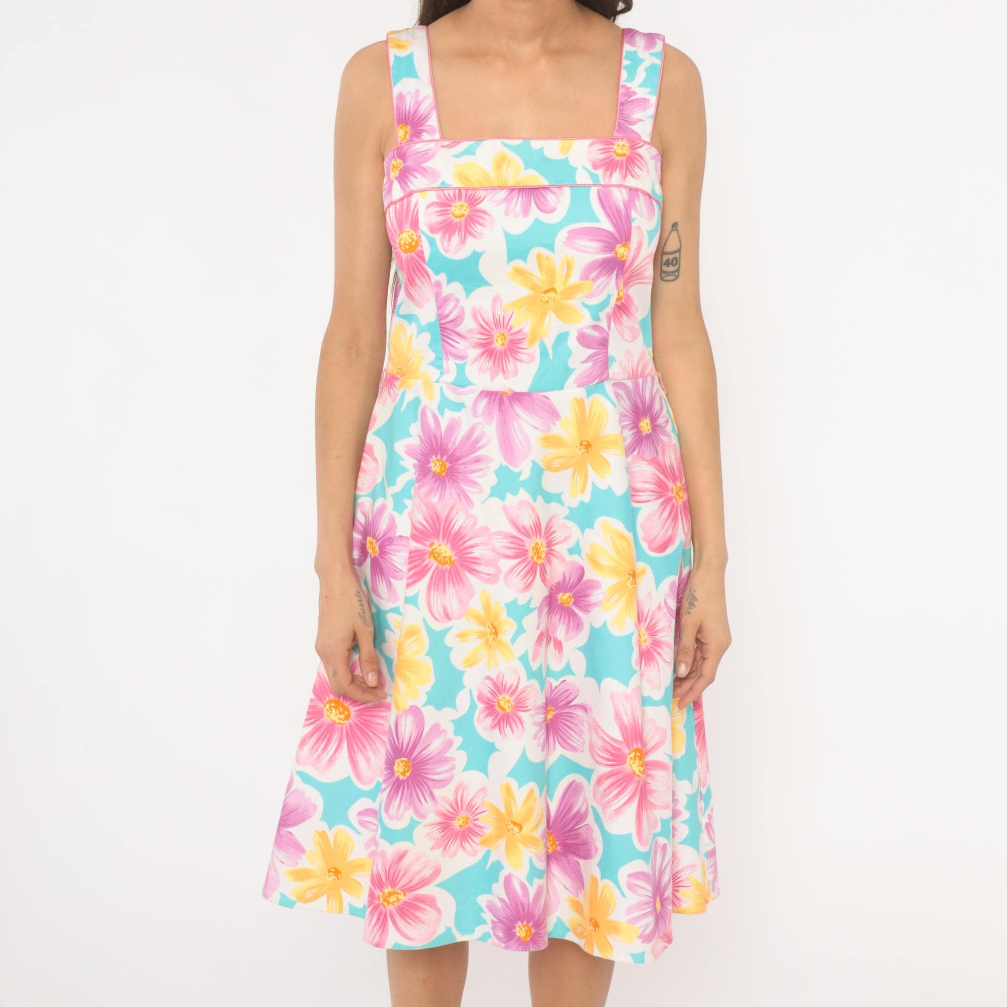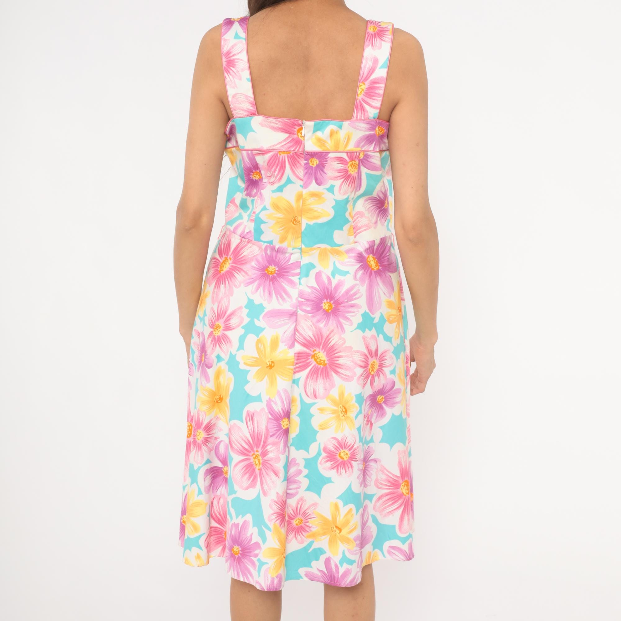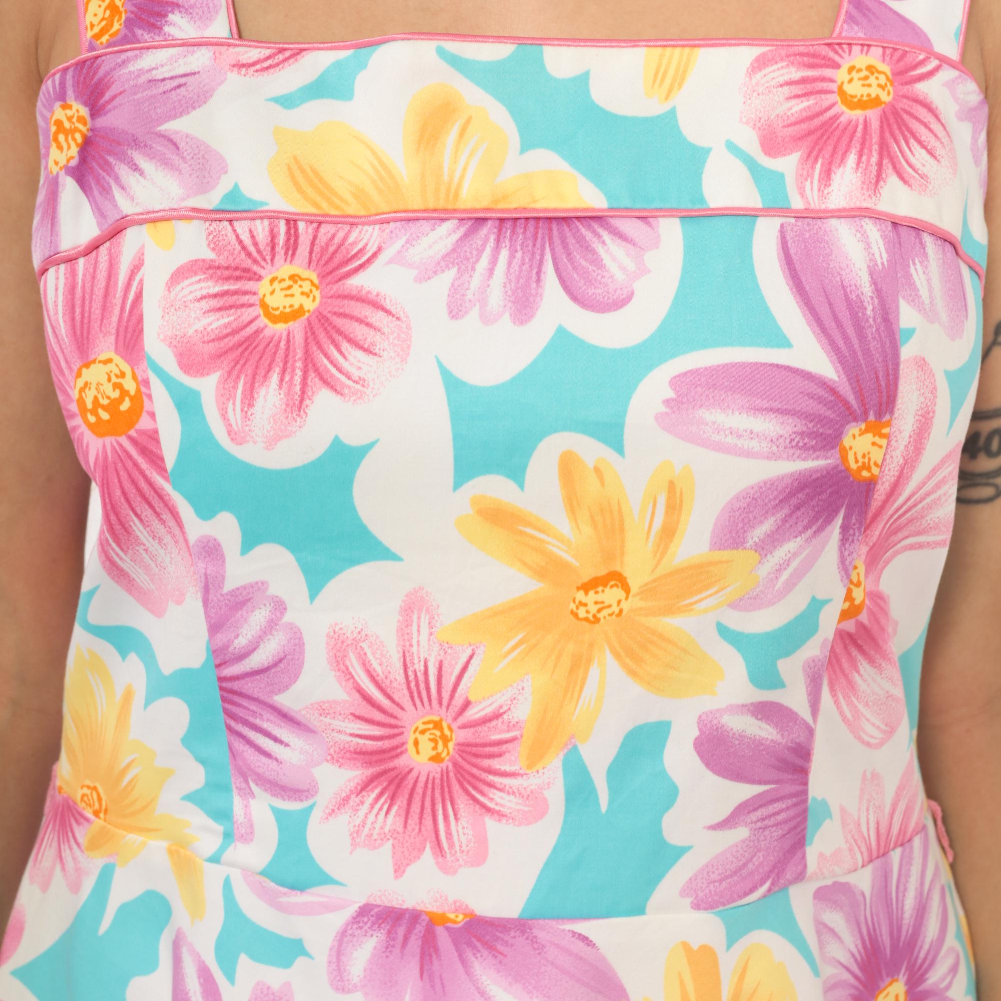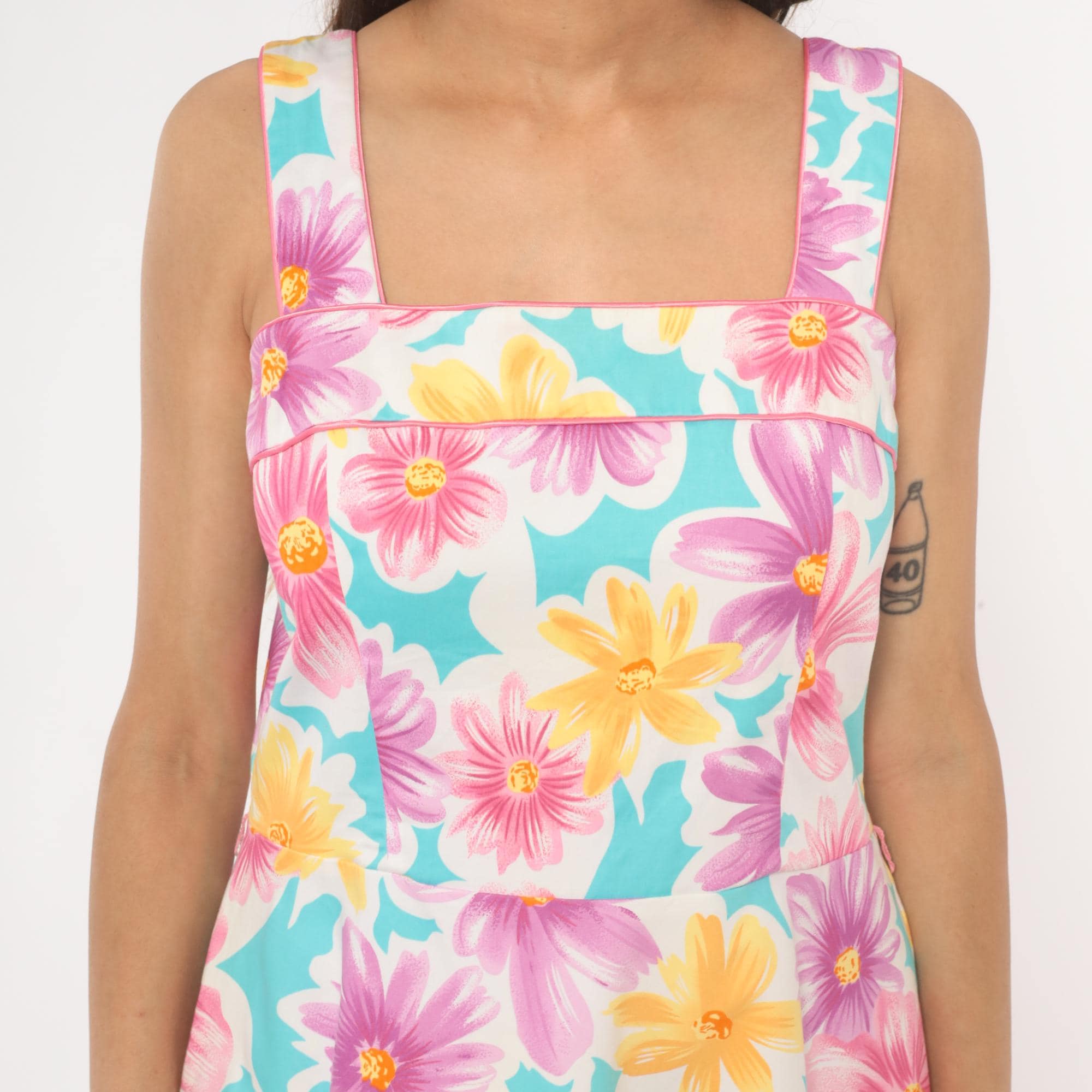 90s floral sundress from Scarlett with a square neckline, wide shoulder straps, and back zipper closure. Pink, magenta, lilac, and yellow daisy print against a sky blue background with white accents. Fitted bodice with horizontal seam detail at the bust, A-line skirt falling to knee length. Contrast pink piping along the neckline and straps.