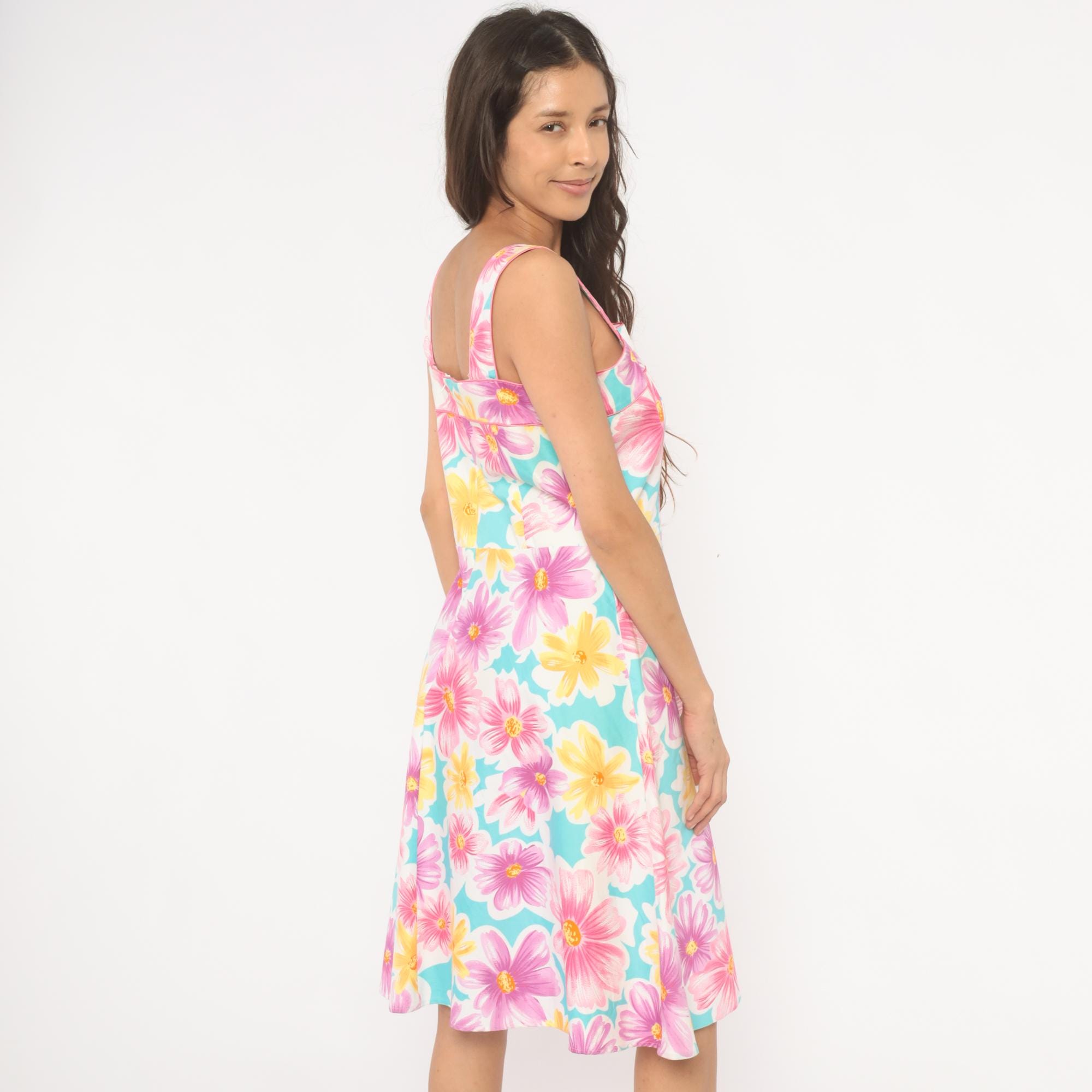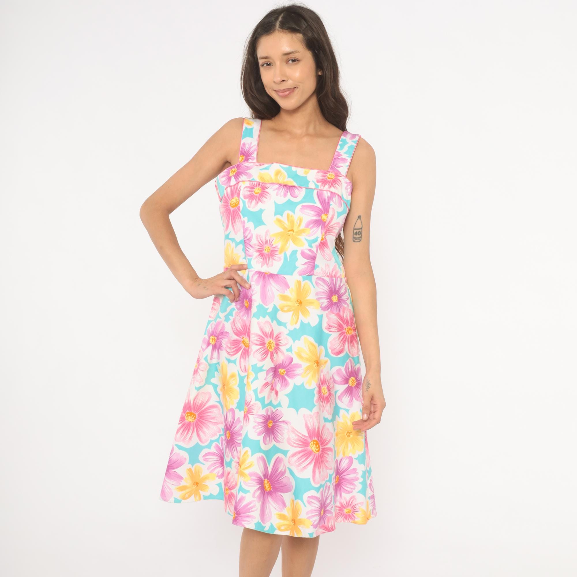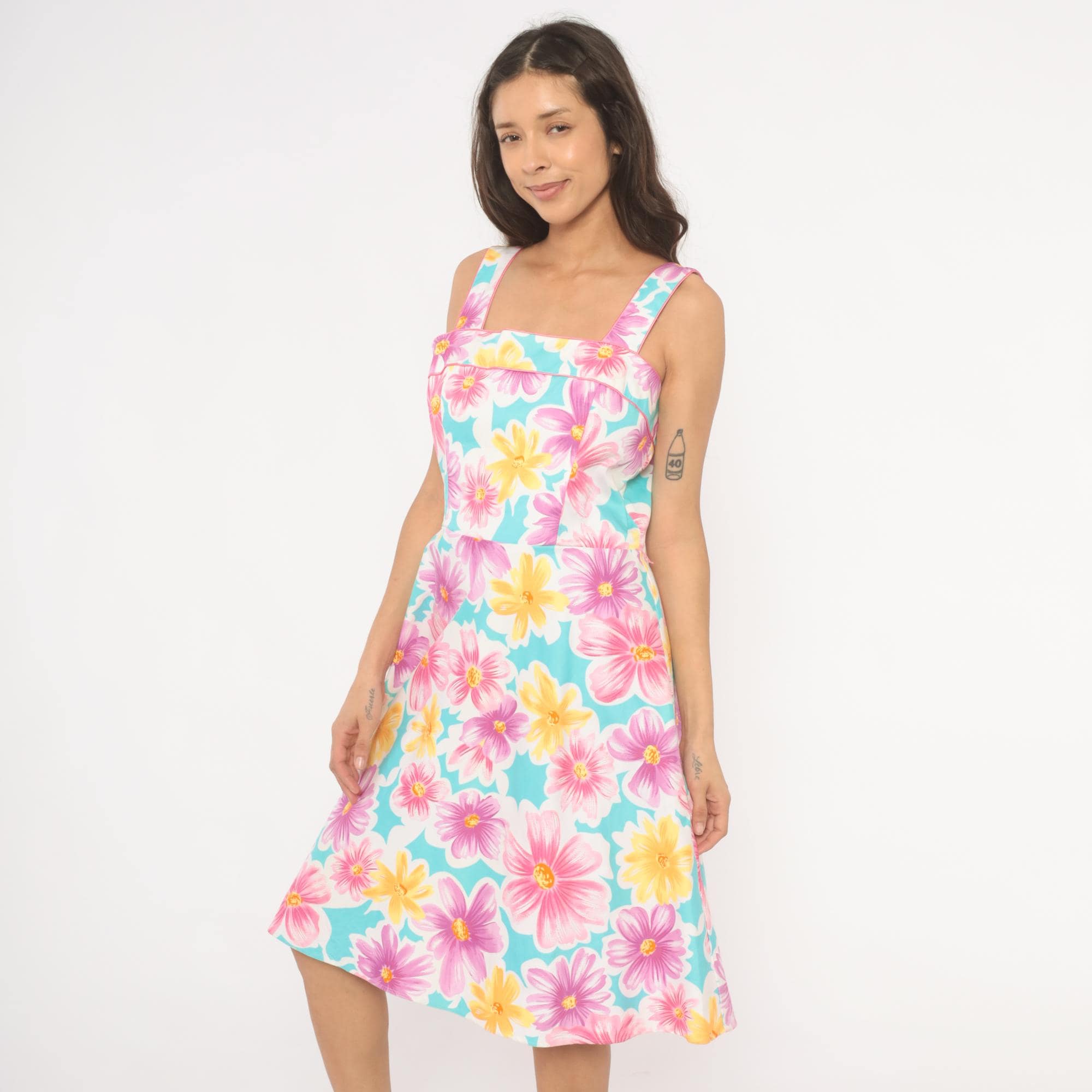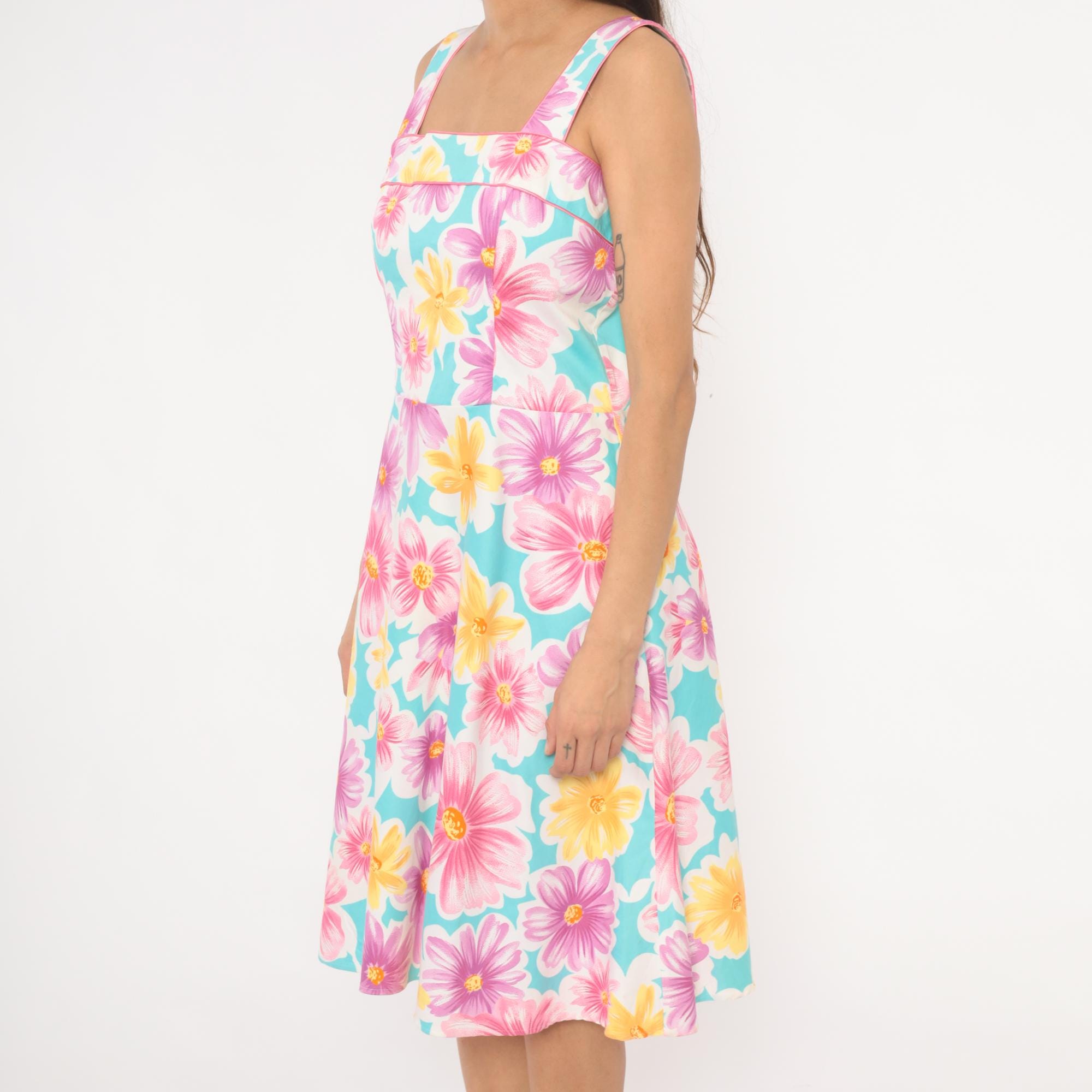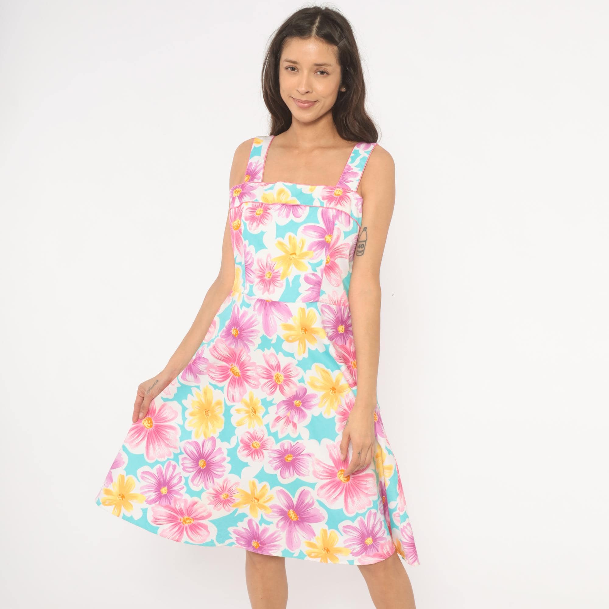 90s floral sundress from Scarlett with a square neckline, wide shoulder straps, and back zipper closure. Pink, magenta, lilac, and yellow daisy print against a sky blue background with white accents. Fitted bodice with horizontal seam detail at the bust, A-line skirt falling to knee length. Contrast pink piping along the neckline and straps.