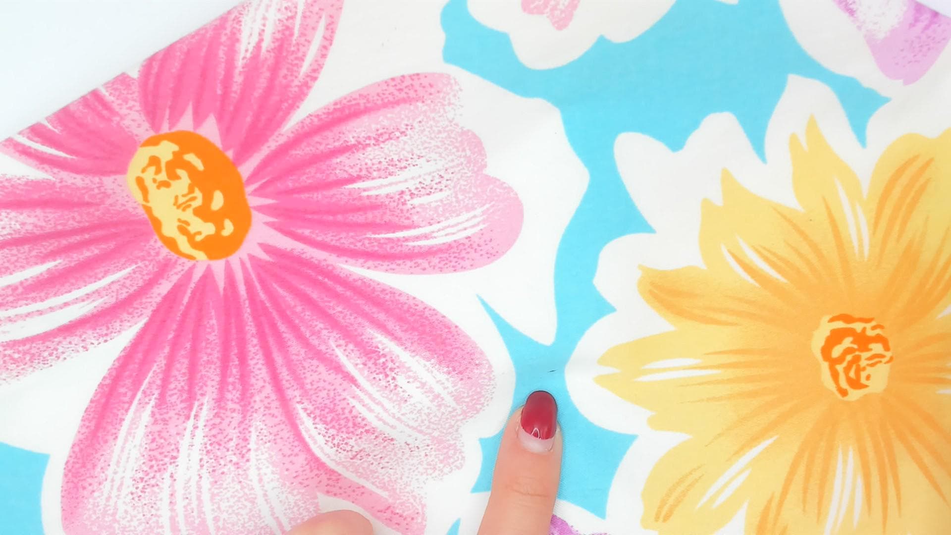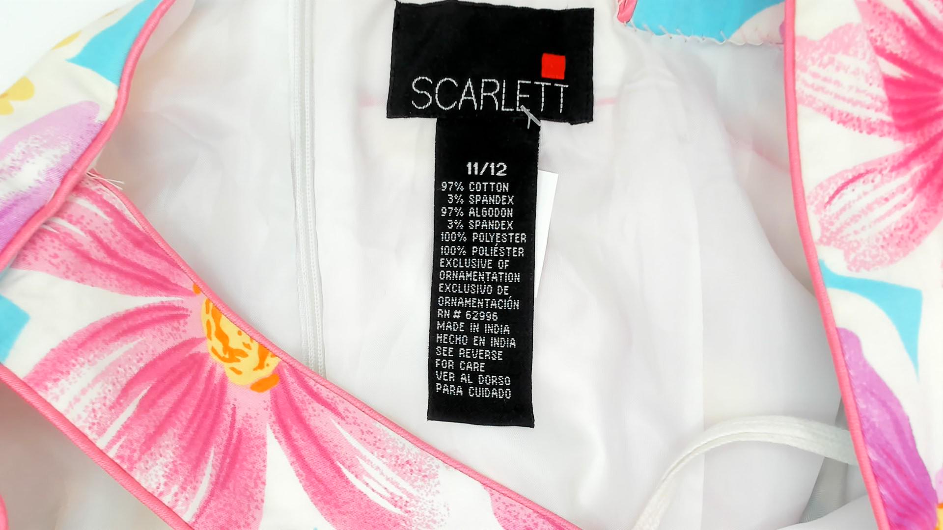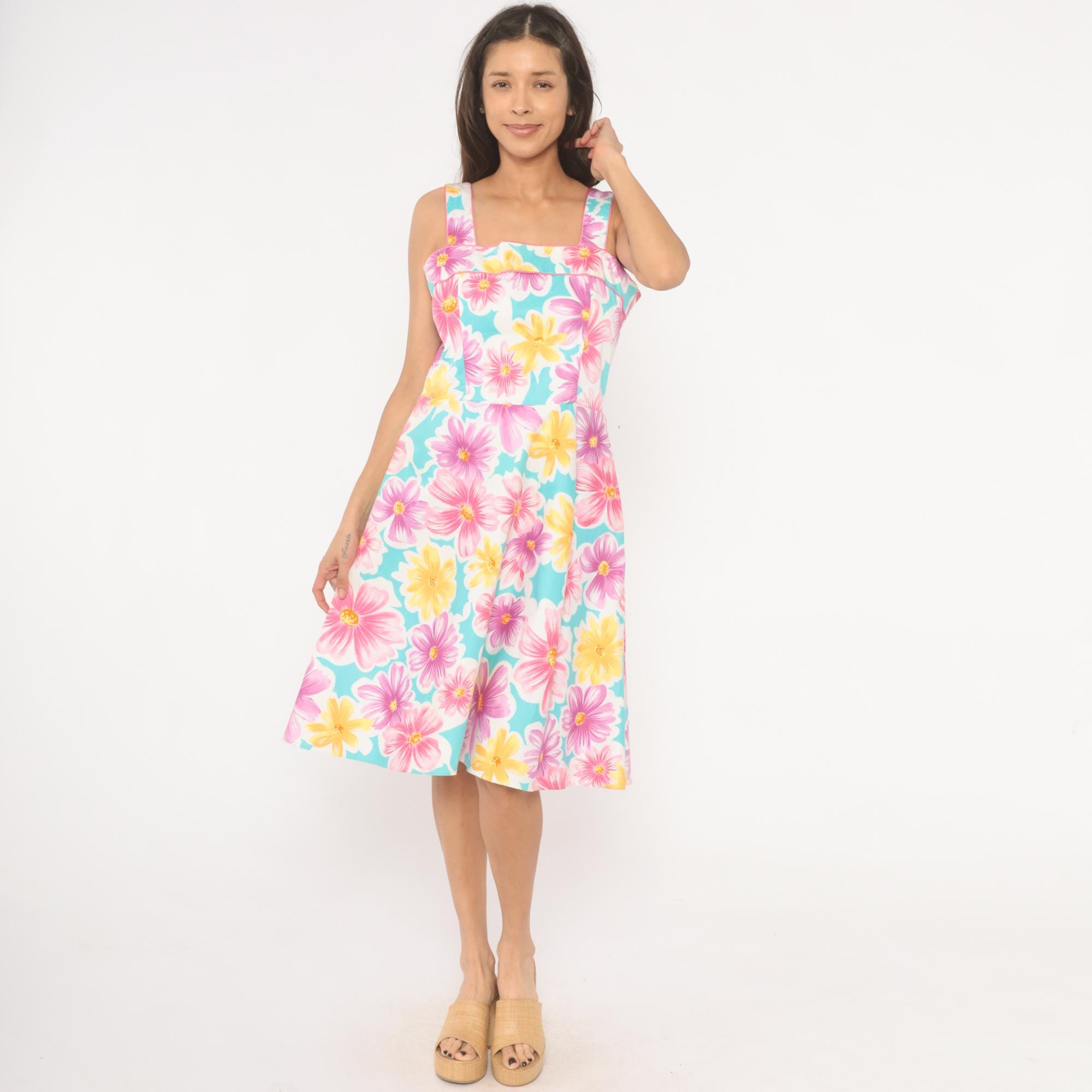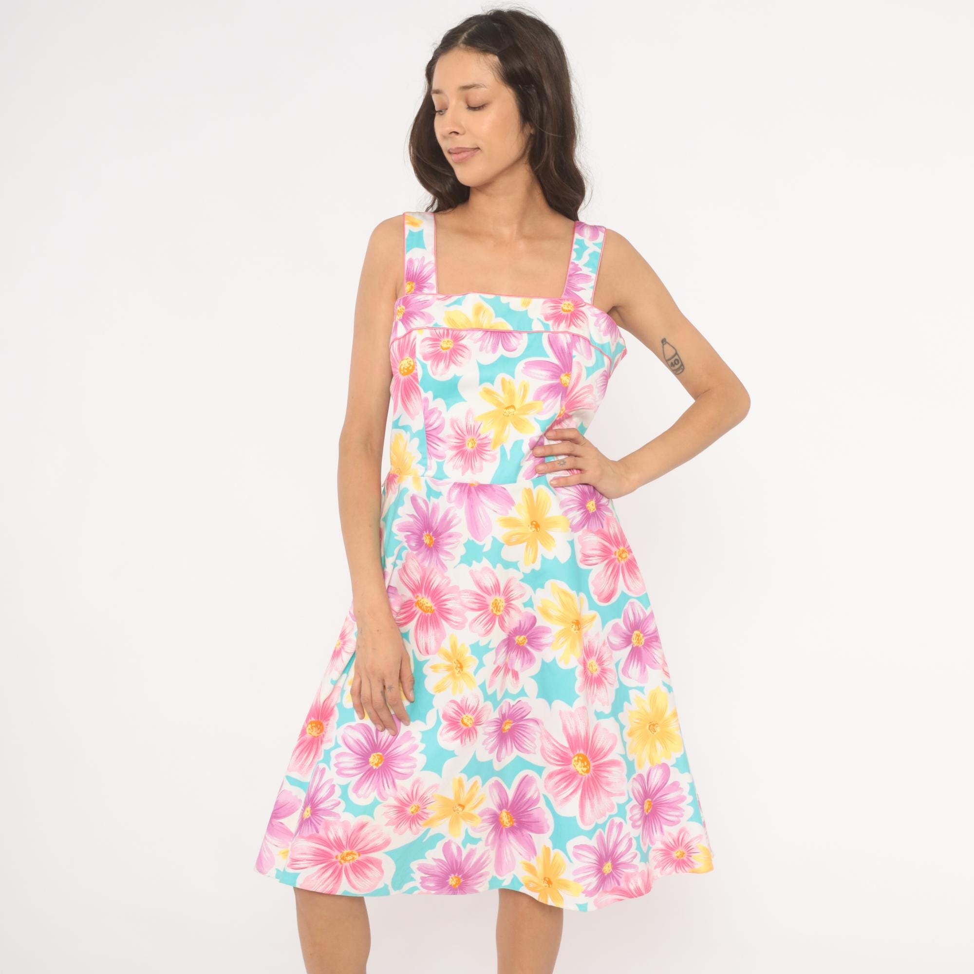 90s floral sundress from Scarlett with a square neckline, wide shoulder straps, and back zipper closure. Pink, magenta, lilac, and yellow daisy print against a sky blue background with white accents. Fitted bodice with horizontal seam detail at the bust, A-line skirt falling to knee length. Contrast pink piping along the neckline and straps.