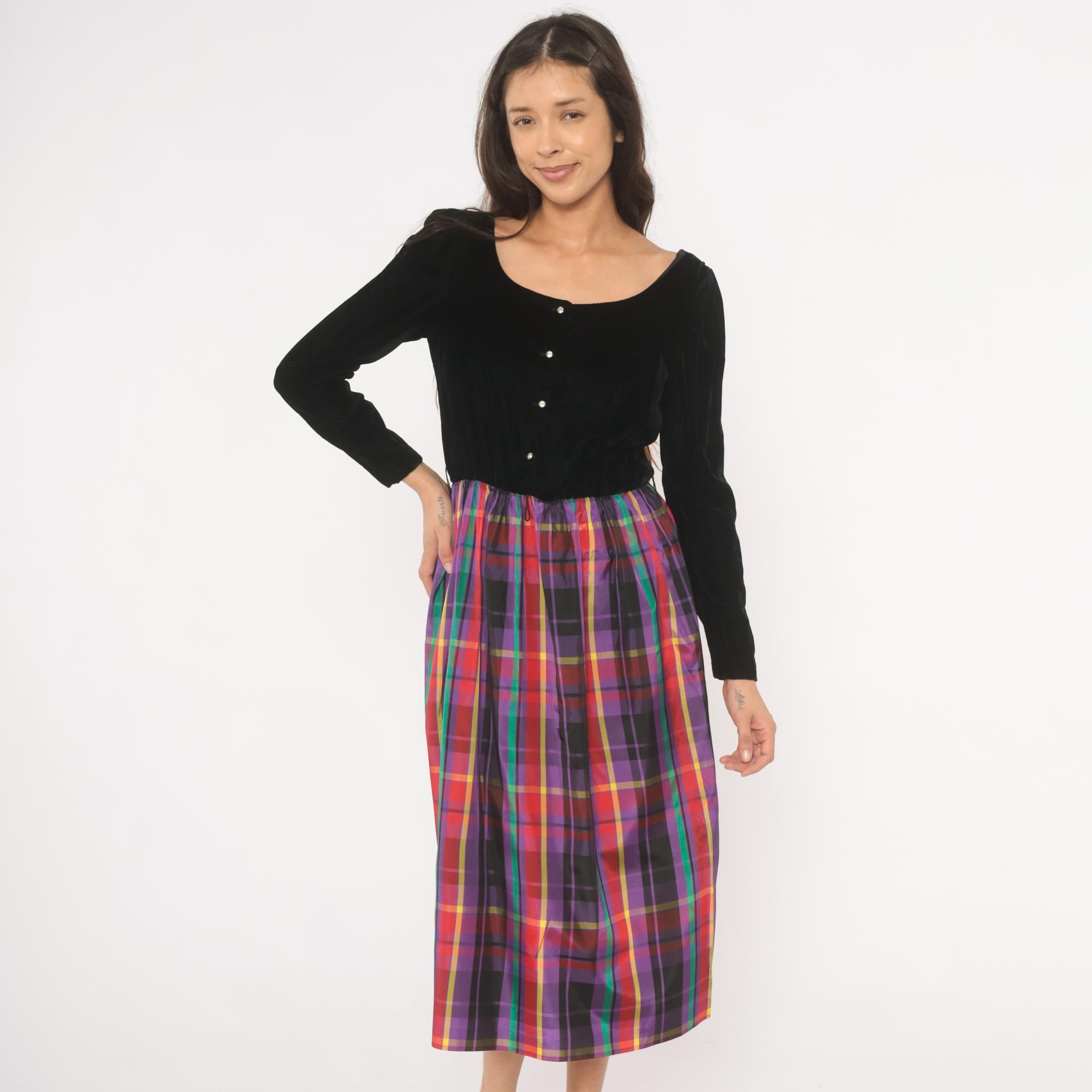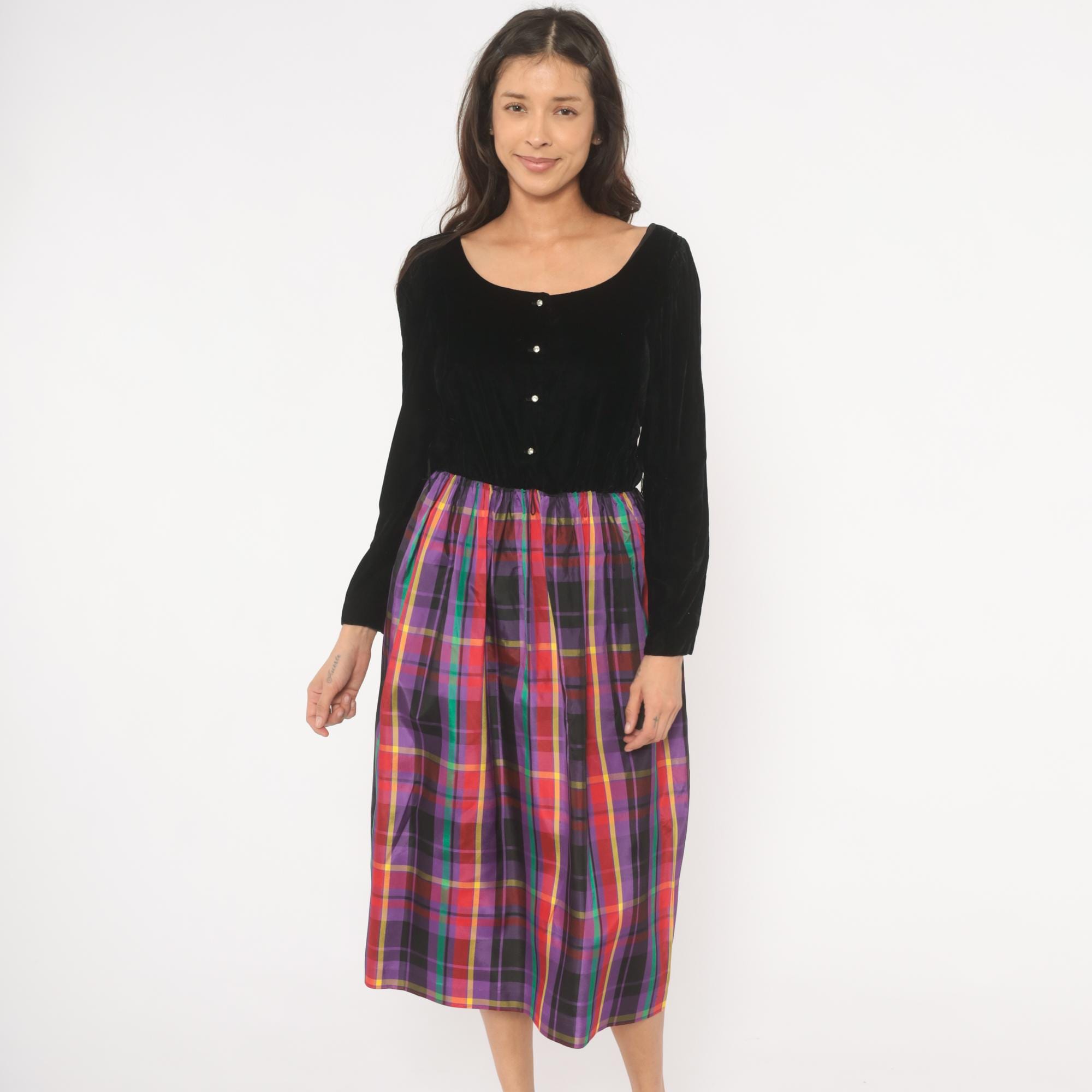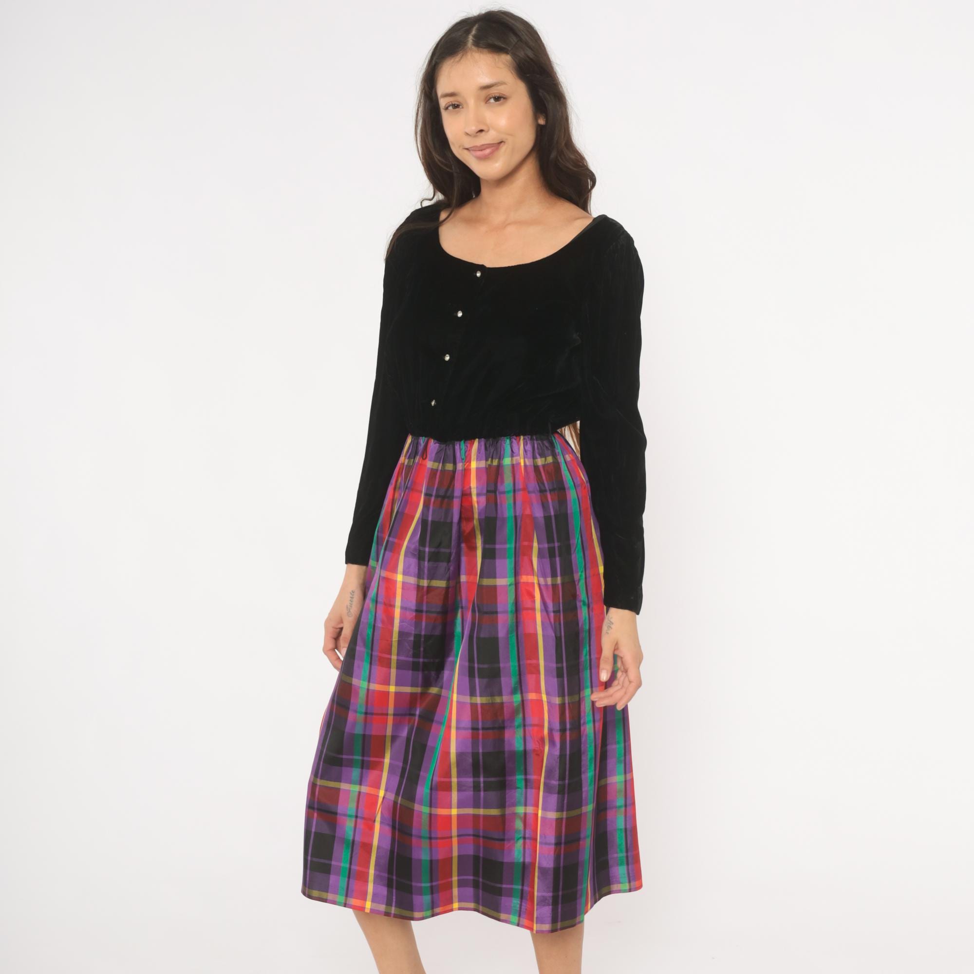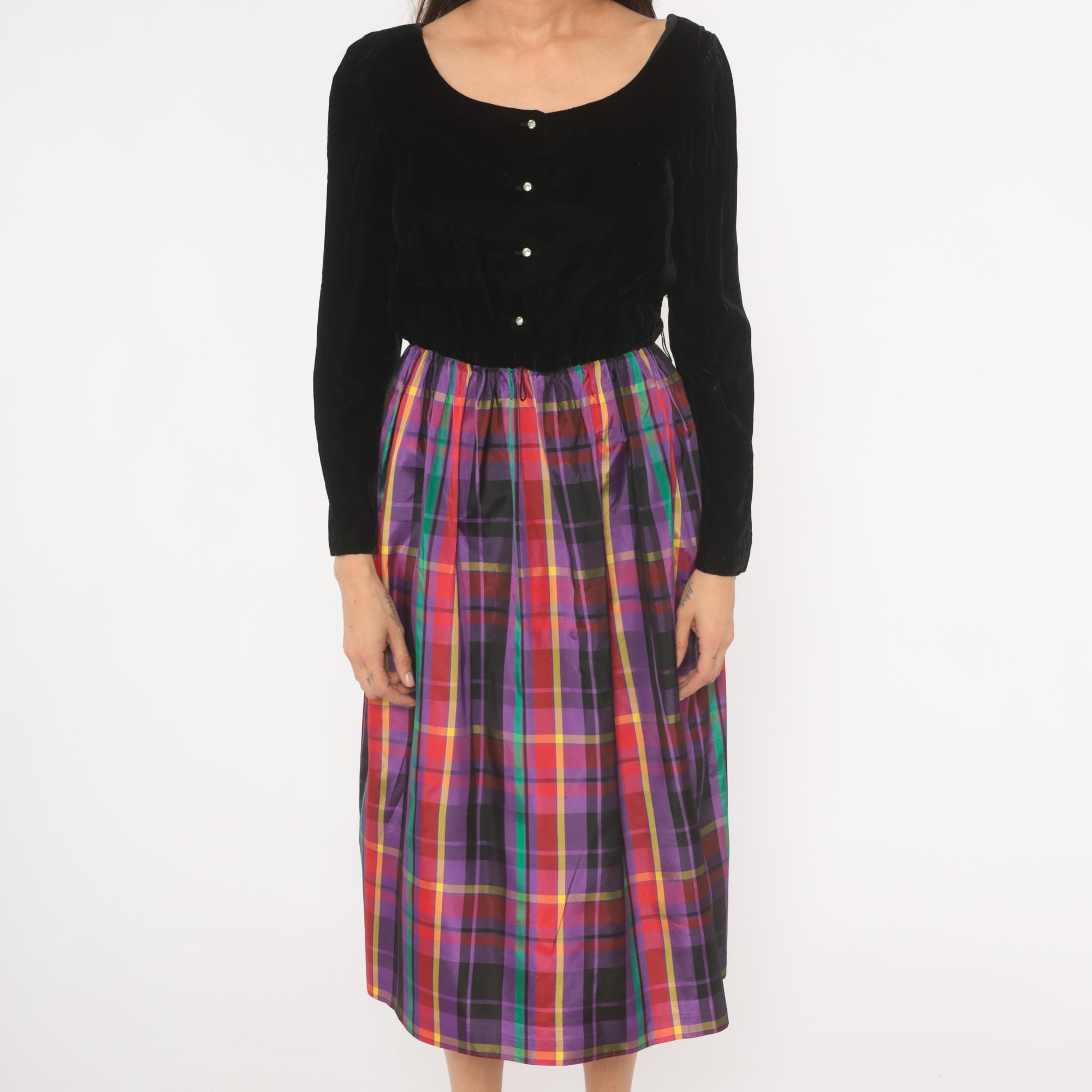 90s dress from DW3 with a black velvet fitted bodice and multicolor plaid gathered skirt in purple, red, green, yellow, and black. Scoop neckline front and back, long sleeves, and rhinestone-look button front closure down the bodice. Mid-calf length skirt with a taffeta-like sheen to the plaid fabric.