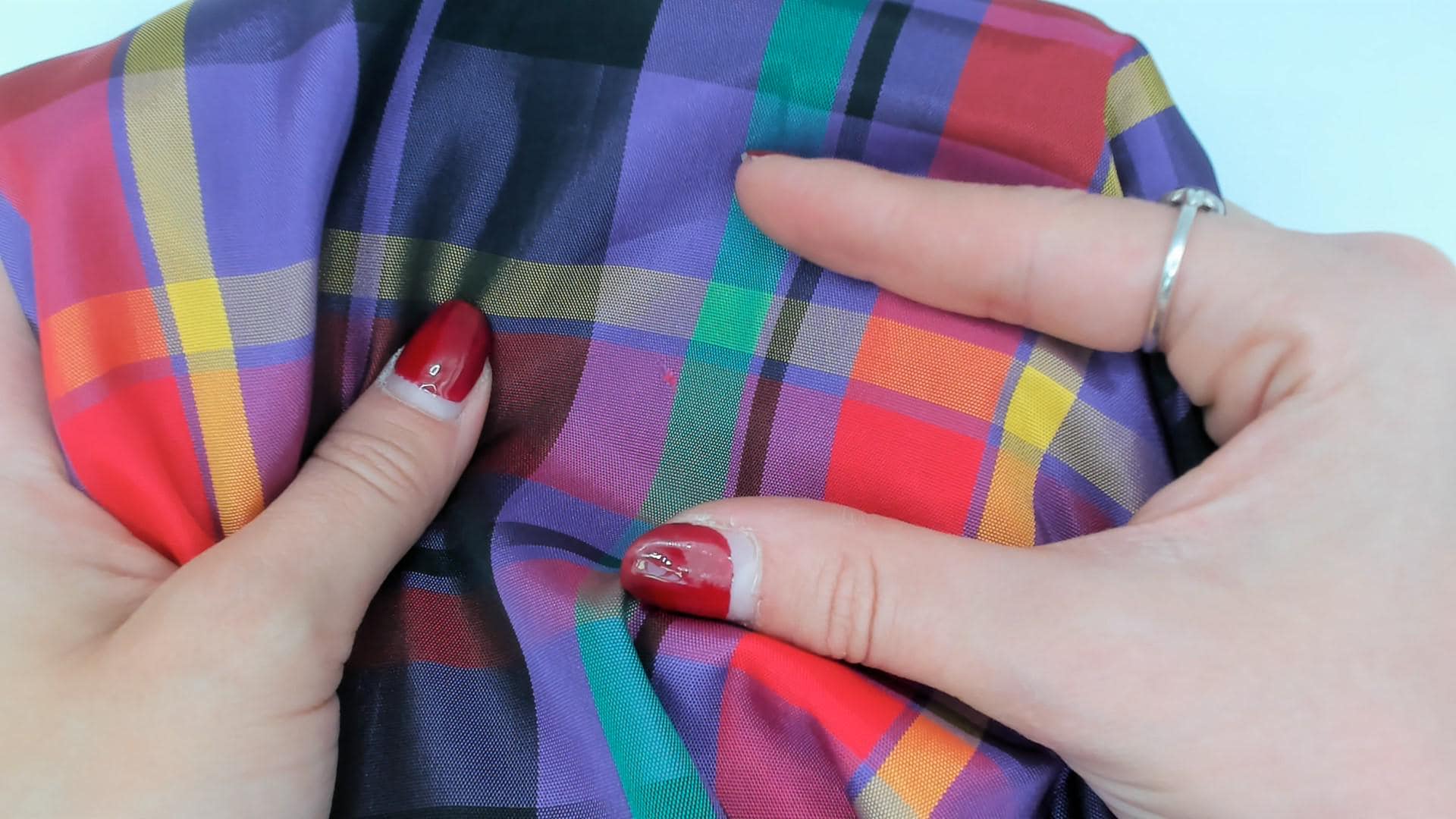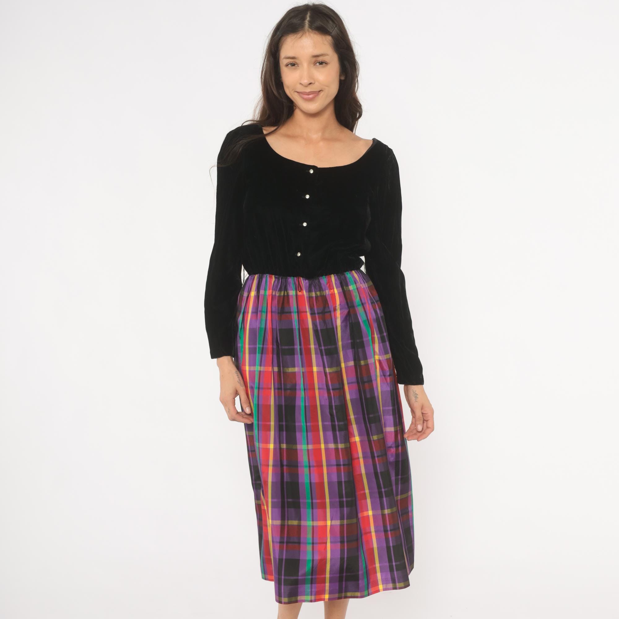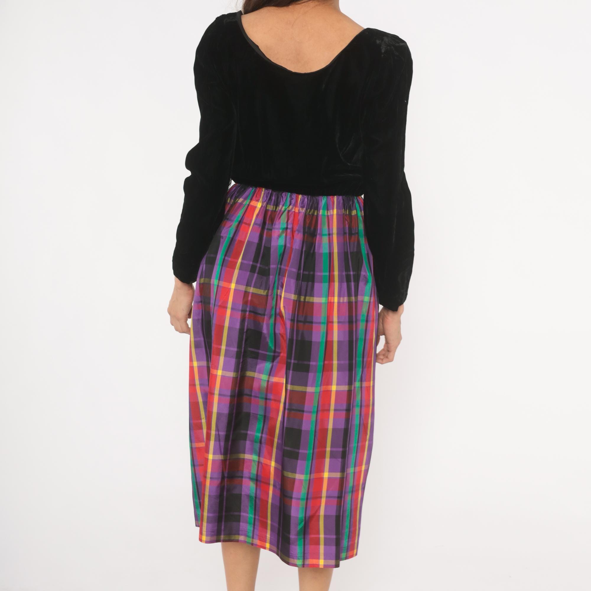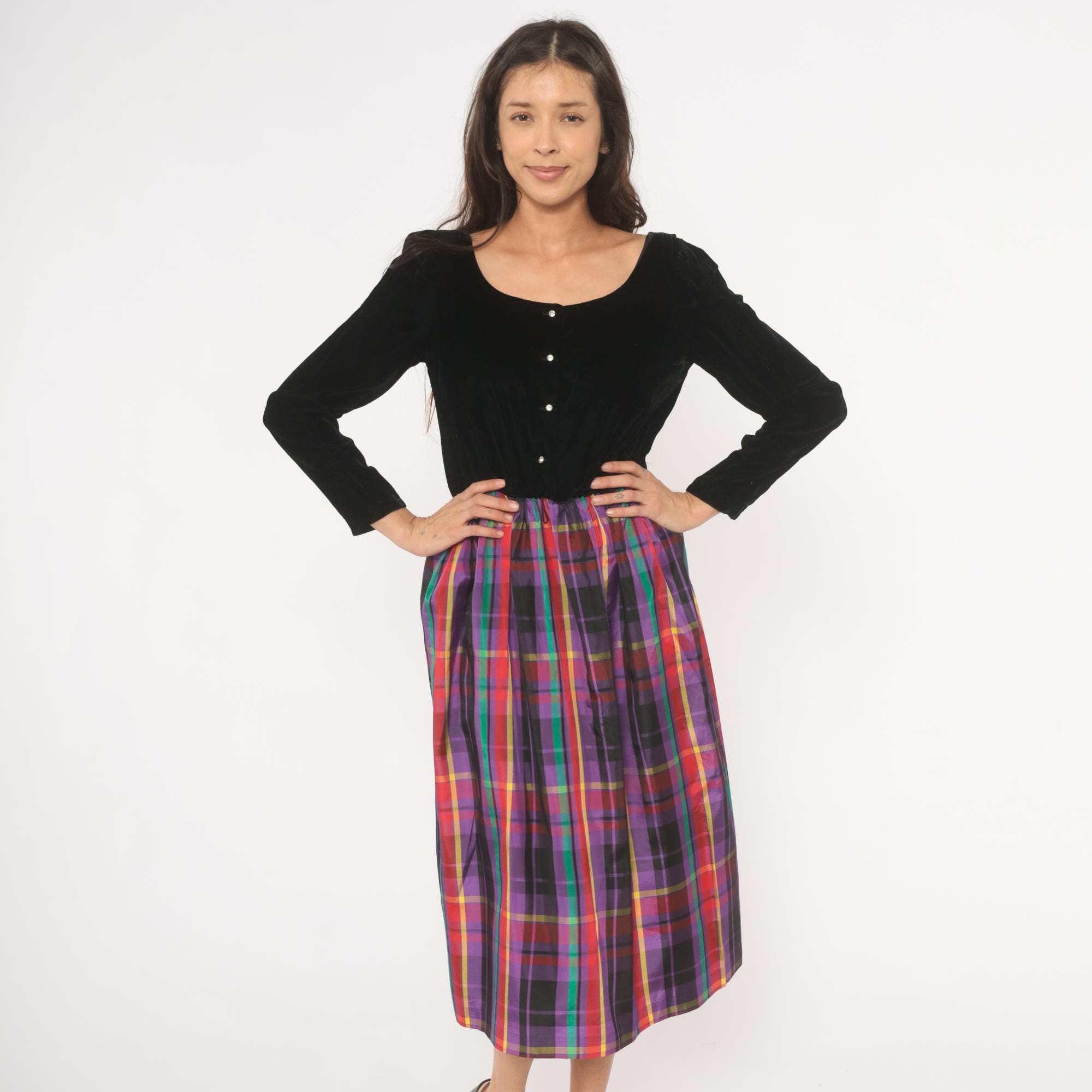 90s dress from DW3 with a black velvet fitted bodice and multicolor plaid gathered skirt in purple, red, green, yellow, and black. Scoop neckline front and back, long sleeves, and rhinestone-look button front closure down the bodice. Mid-calf length skirt with a taffeta-like sheen to the plaid fabric.