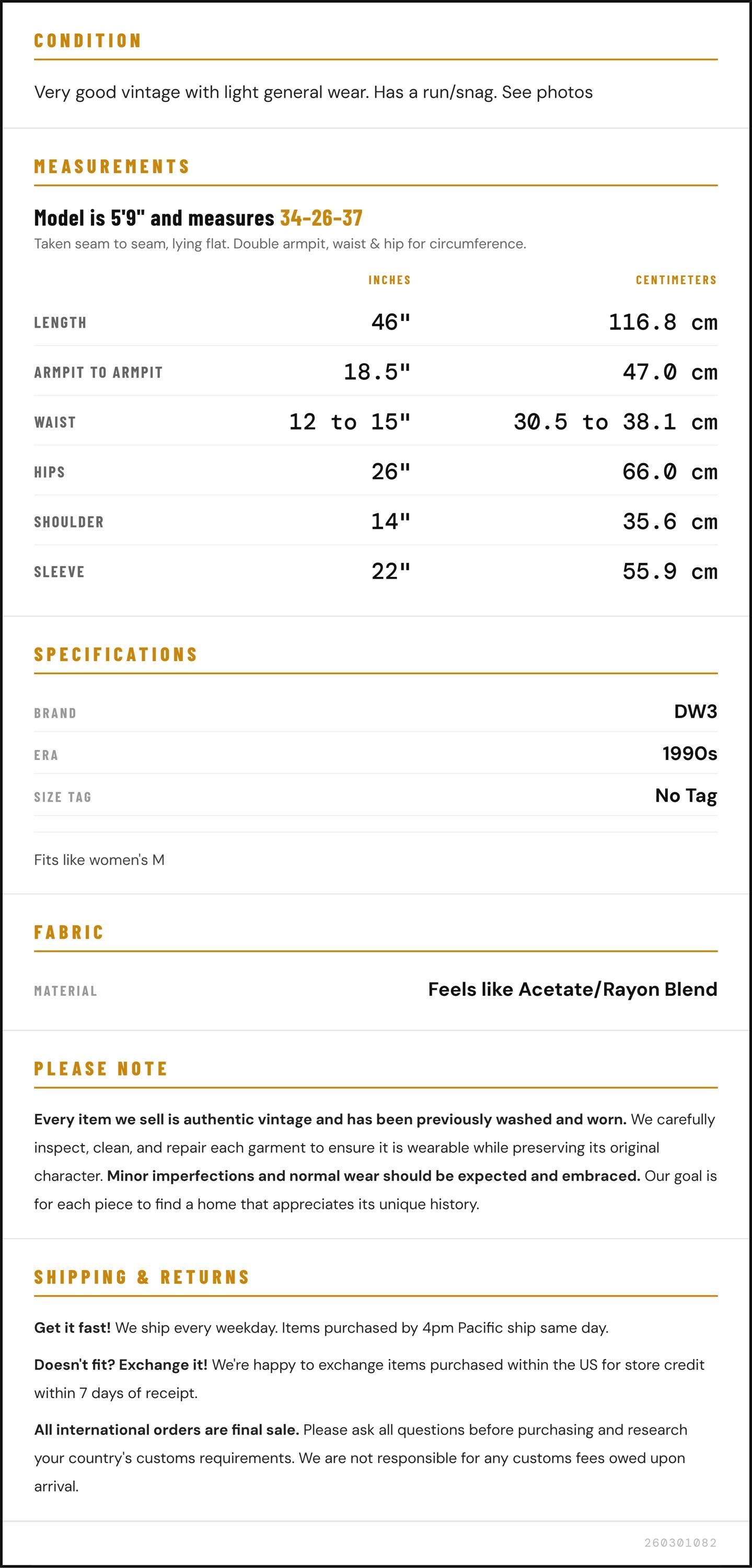 Condition: Very good vintage with light general wear. Has a run/snag. See photos