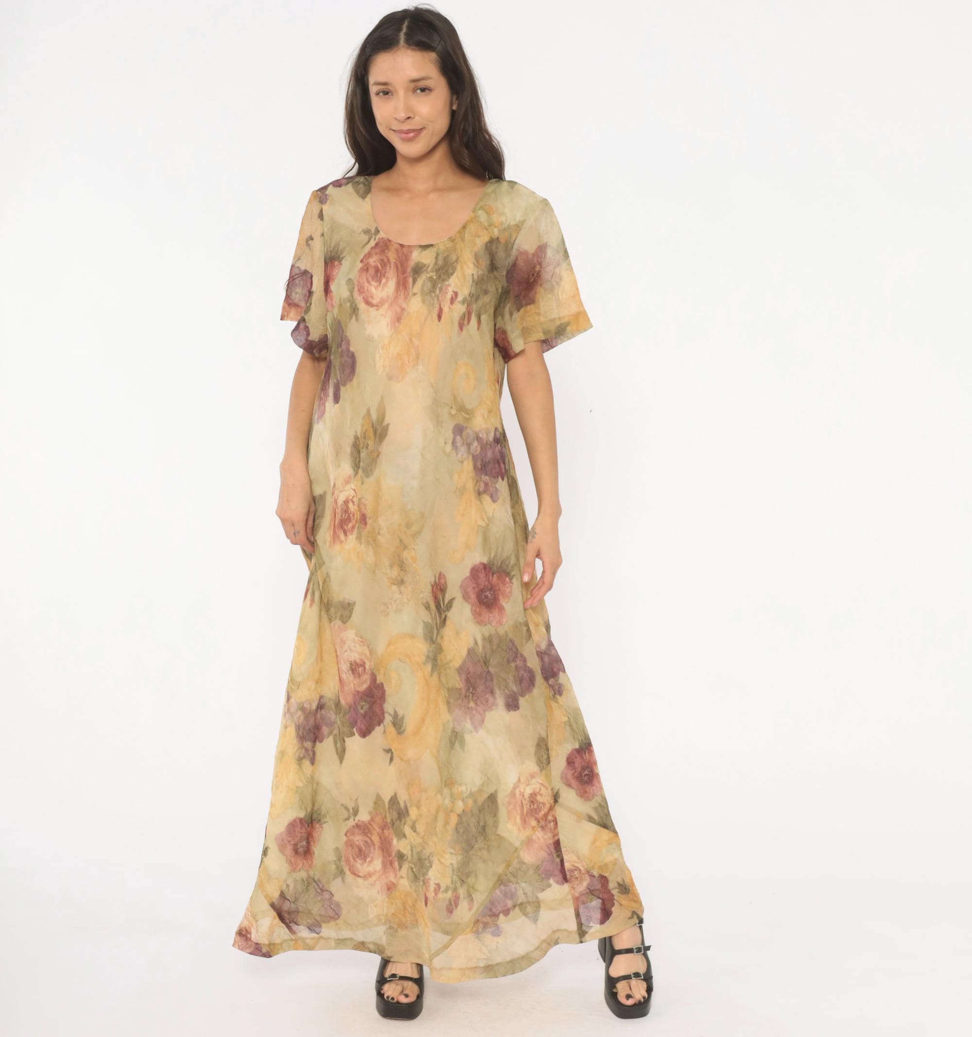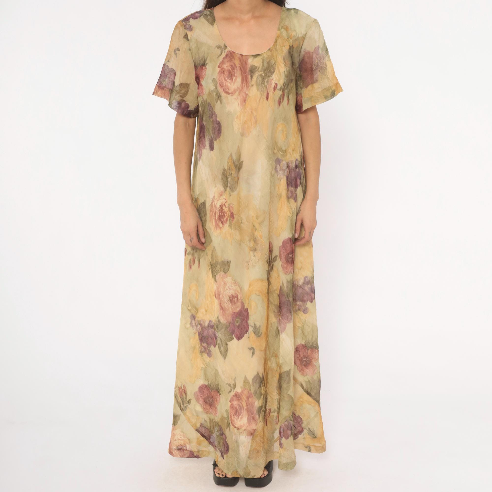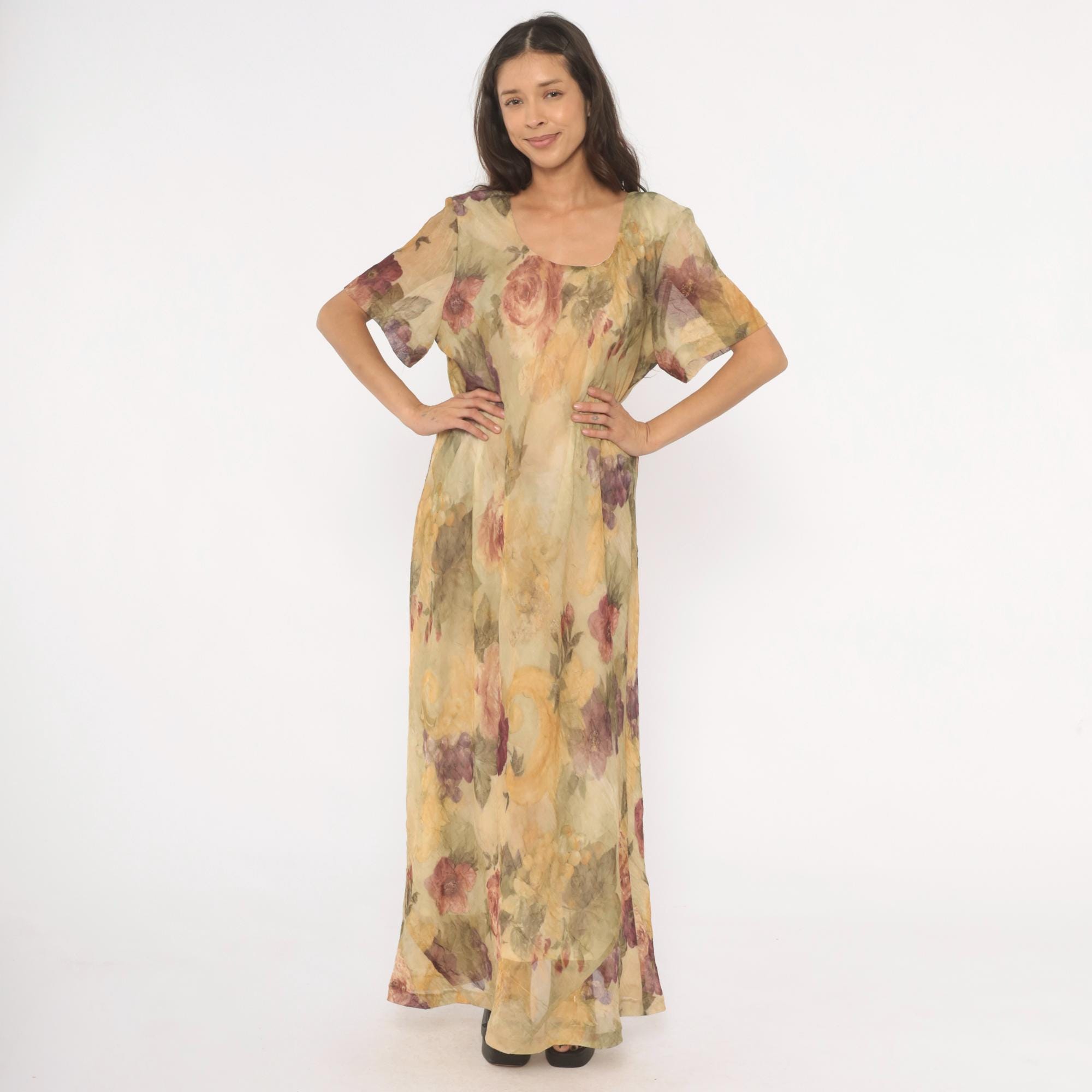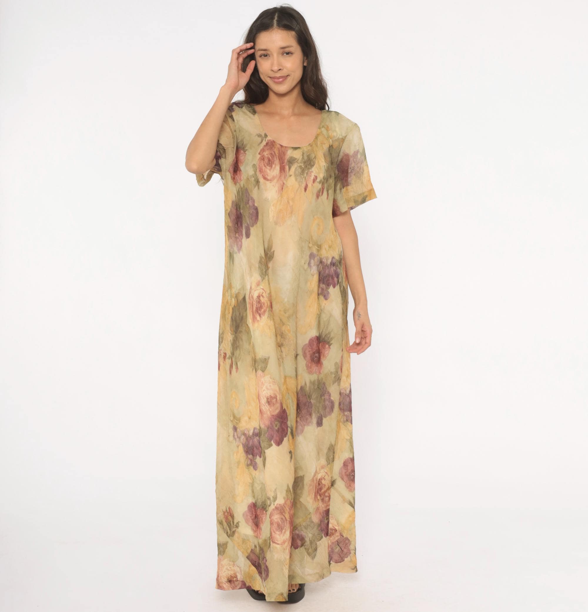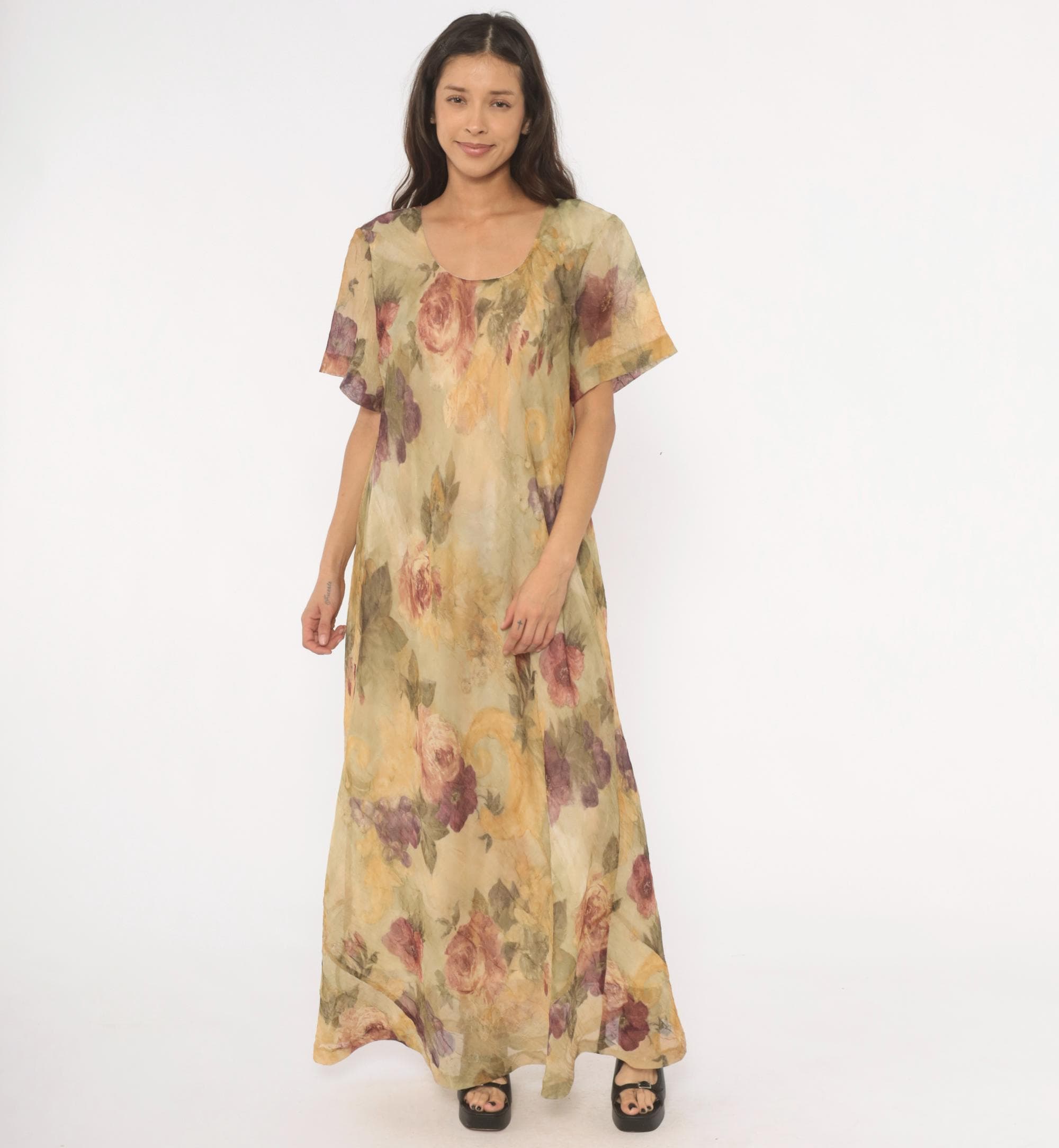 90s floral maxi dress from DE Frantoria with a watercolor rose print in dusty pink, plum, sage green, and golden yellow across a cream base. Scoop neckline, short flutter sleeves, and a relaxed A-line silhouette that falls to the floor. Pullover construction with no closures or pockets, and a semi-sheer layered body with visible lining beneath.