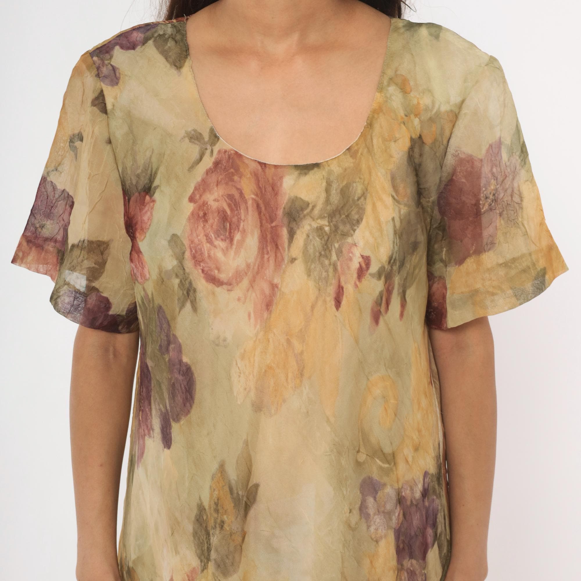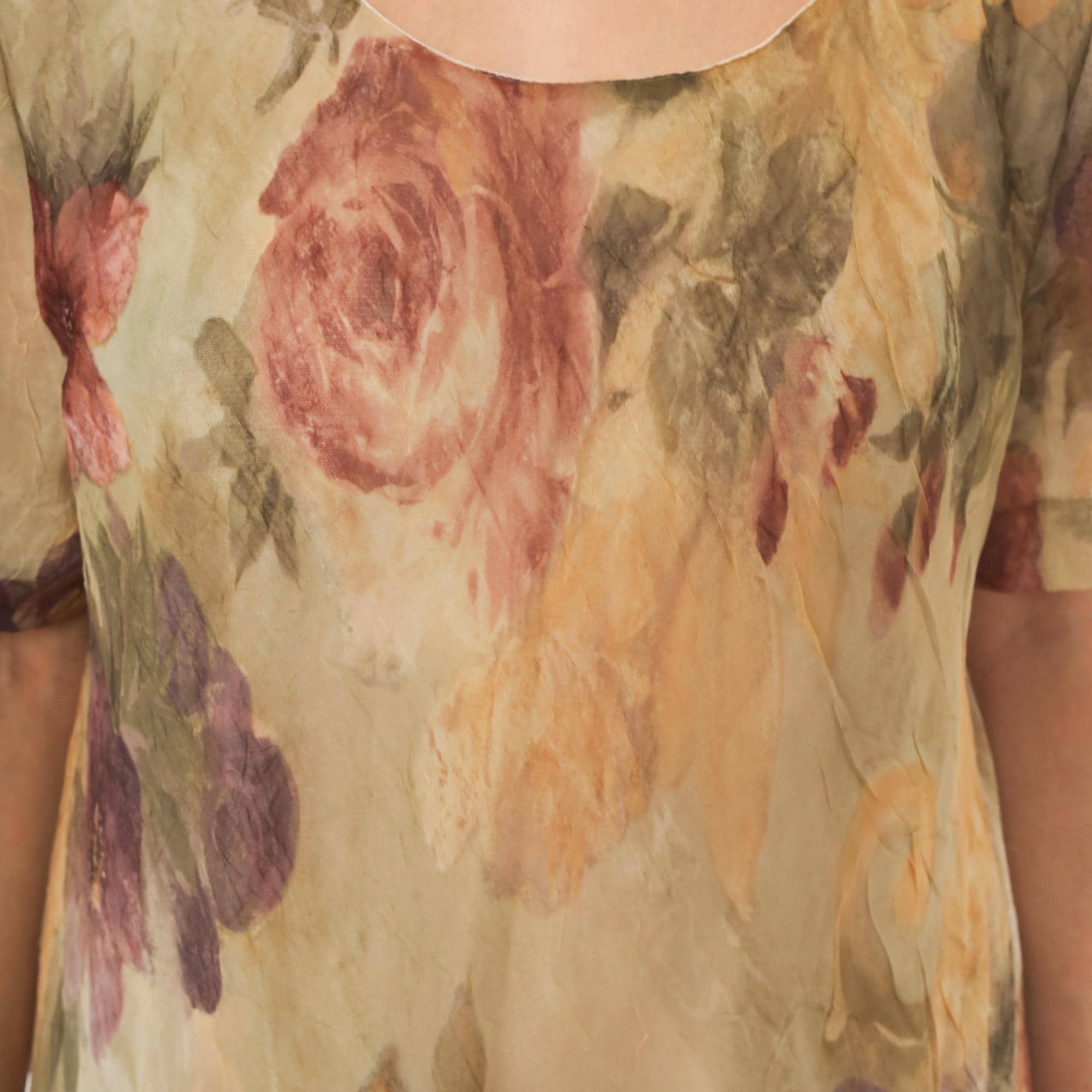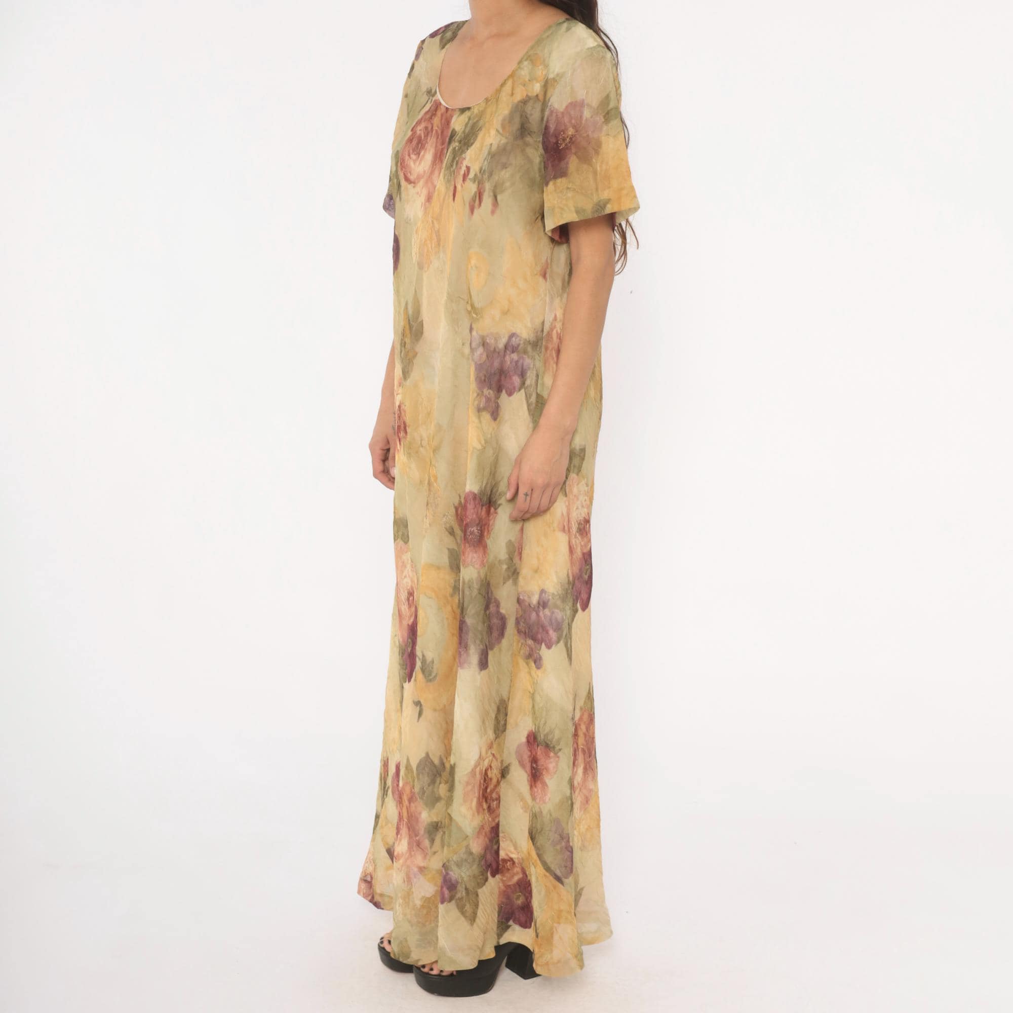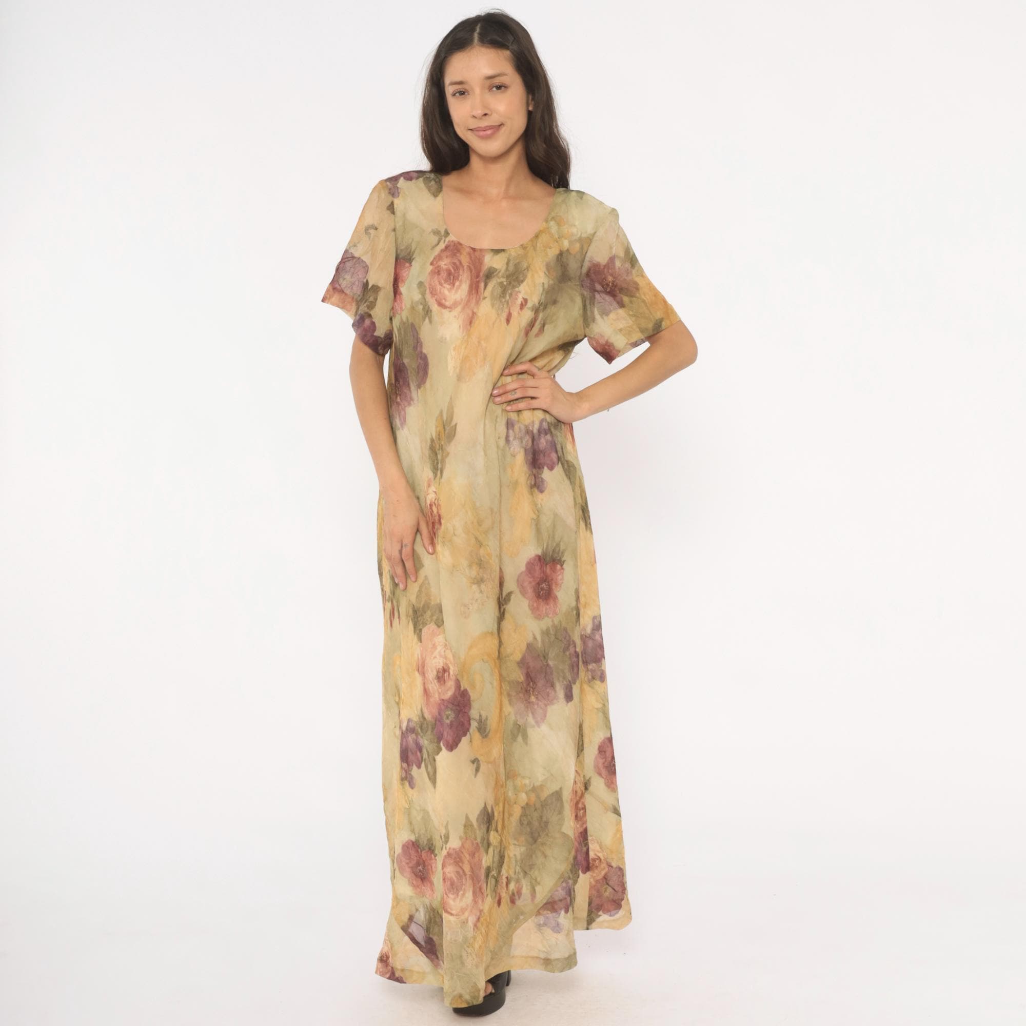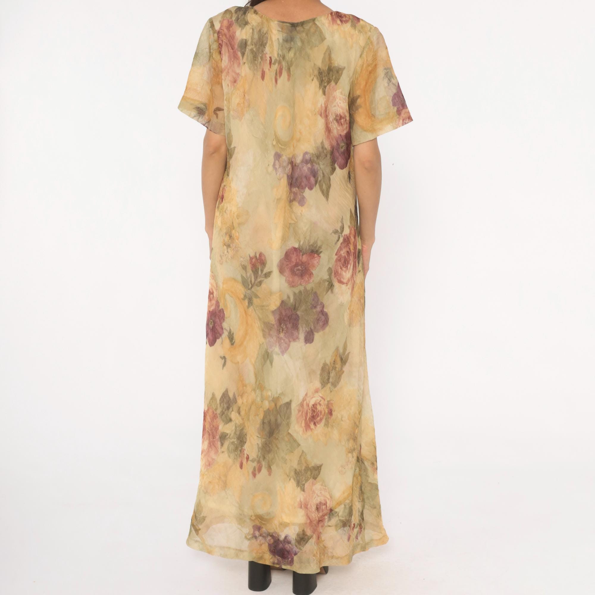 90s floral maxi dress from DE Frantoria with a watercolor rose print in dusty pink, plum, sage green, and golden yellow across a cream base. Scoop neckline, short flutter sleeves, and a relaxed A-line silhouette that falls to the floor. Pullover construction with no closures or pockets, and a semi-sheer layered body with visible lining beneath.