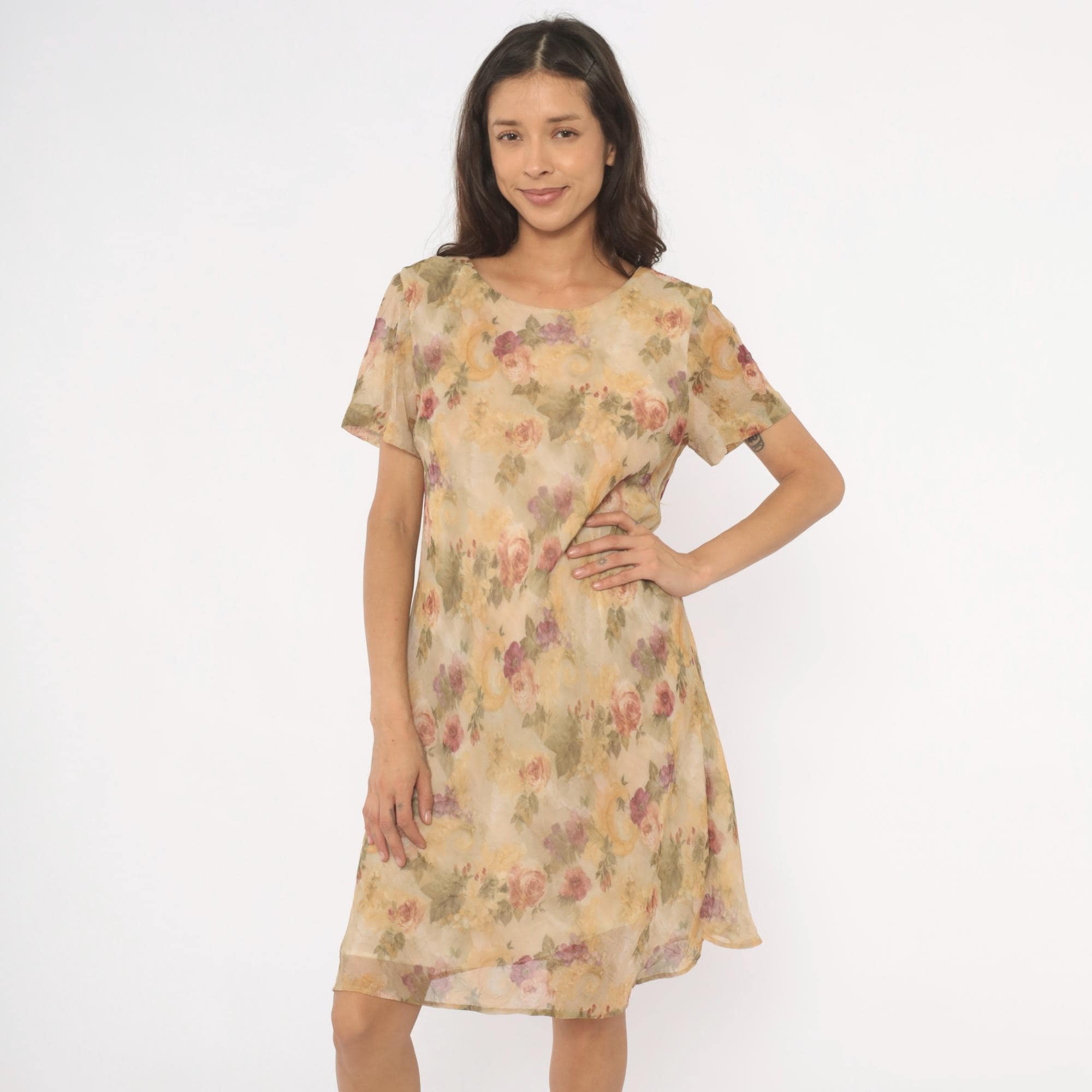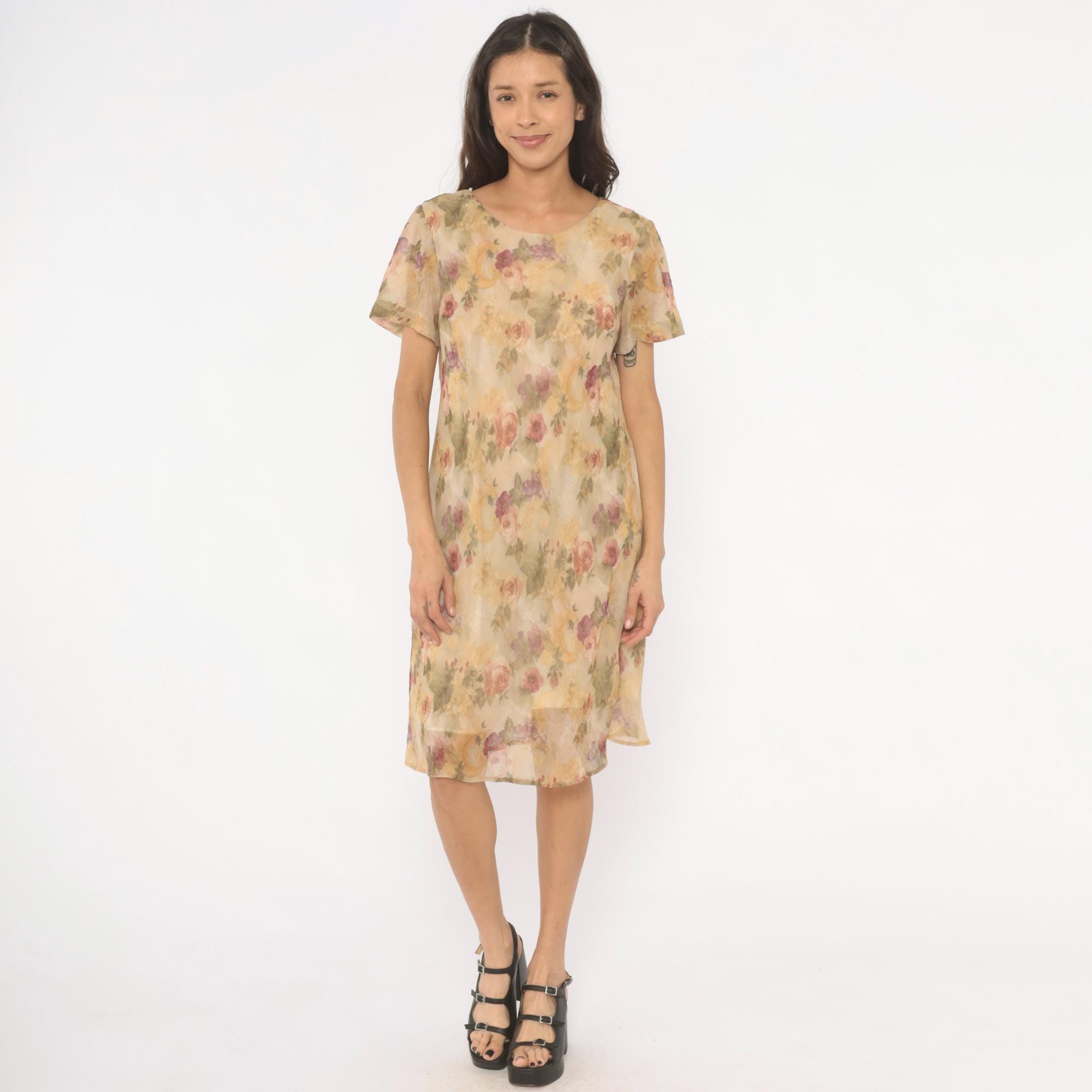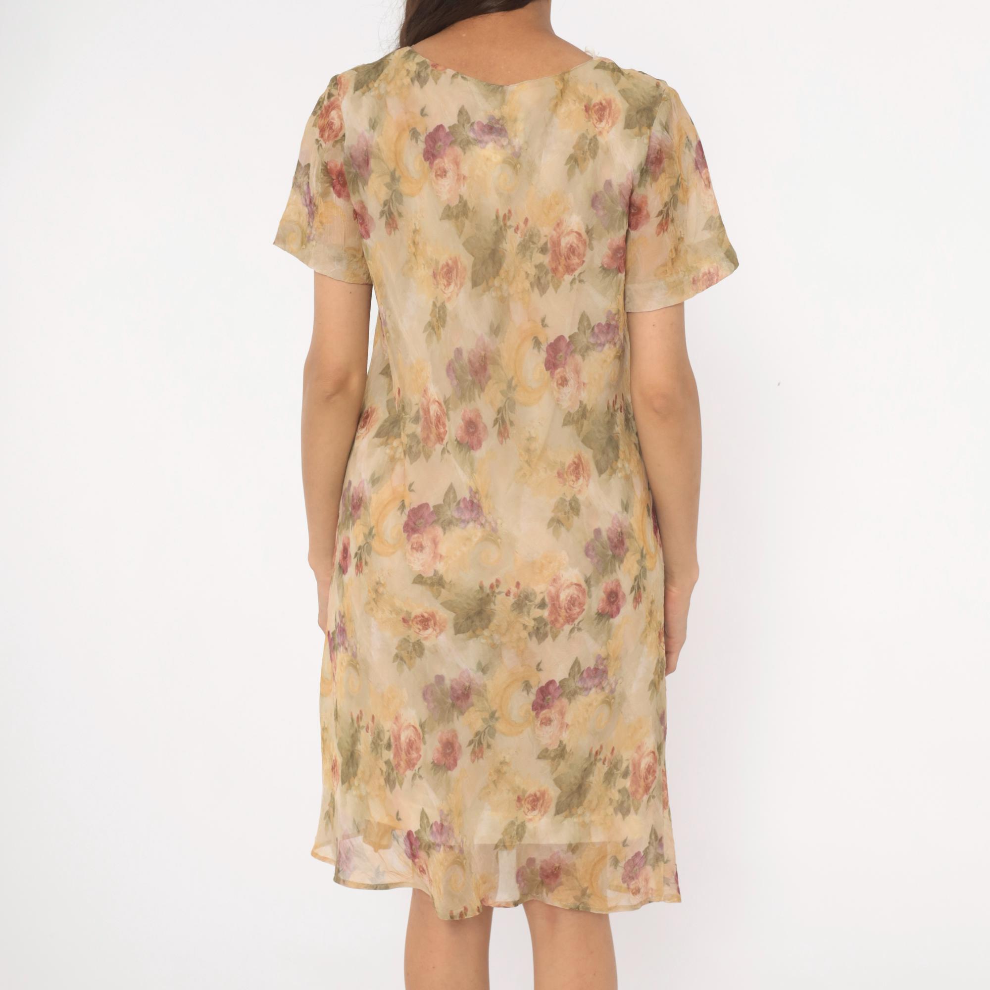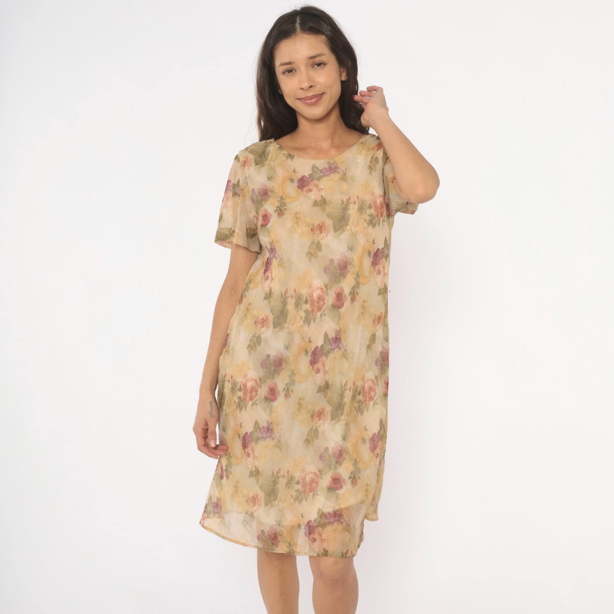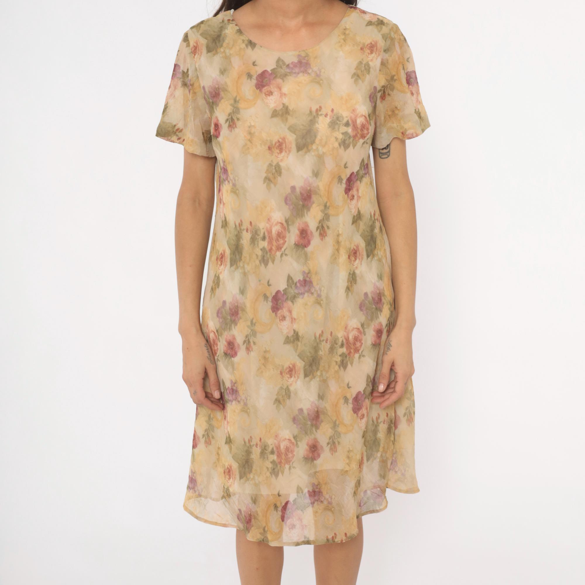 90s floral shift dress from DJ Summers with an allover watercolor rose print in pink, mauve, sage green, and gold tones on a tan base. Scoop neckline, short flutter sleeves, and a straight A-line silhouette falling to knee length. Pullover style with no closure, sheer chiffon outer layer over a lined body.