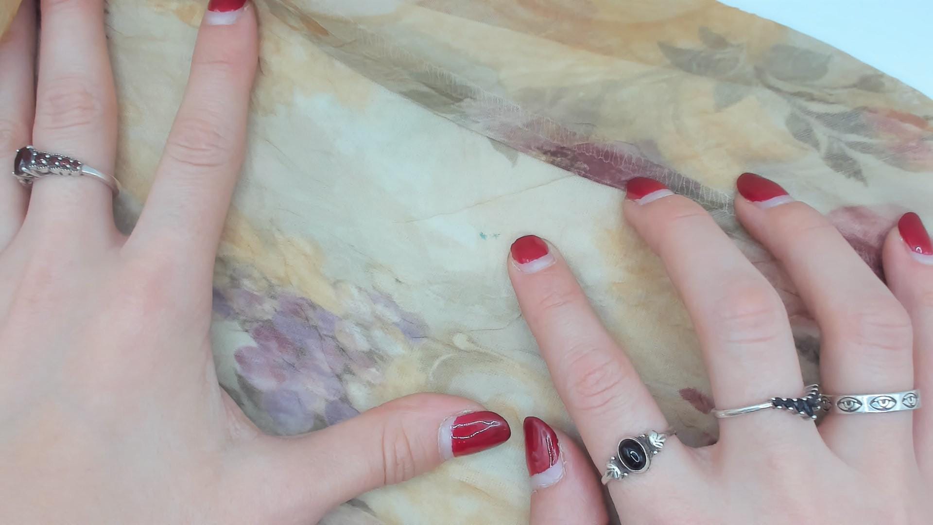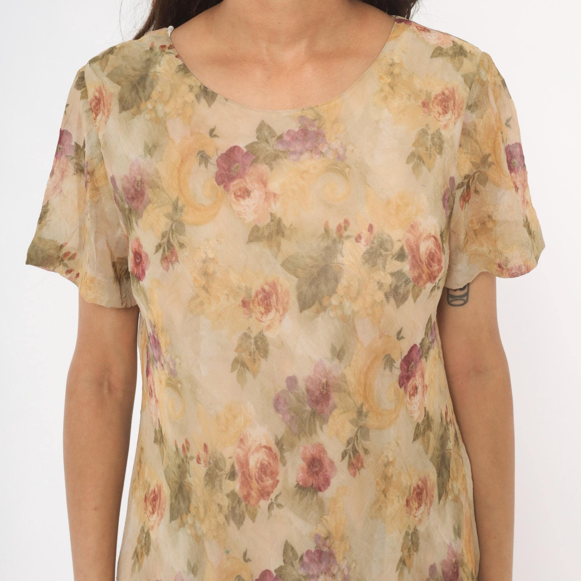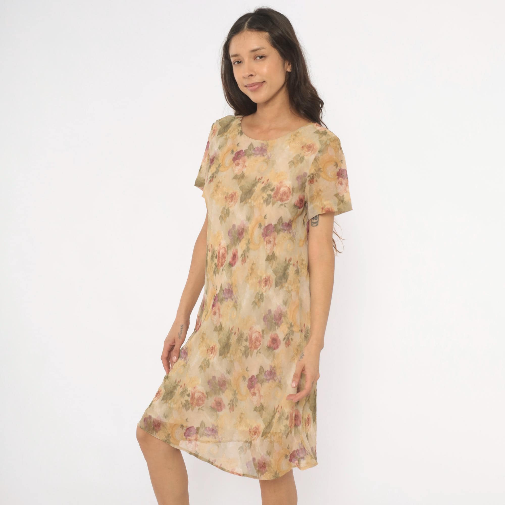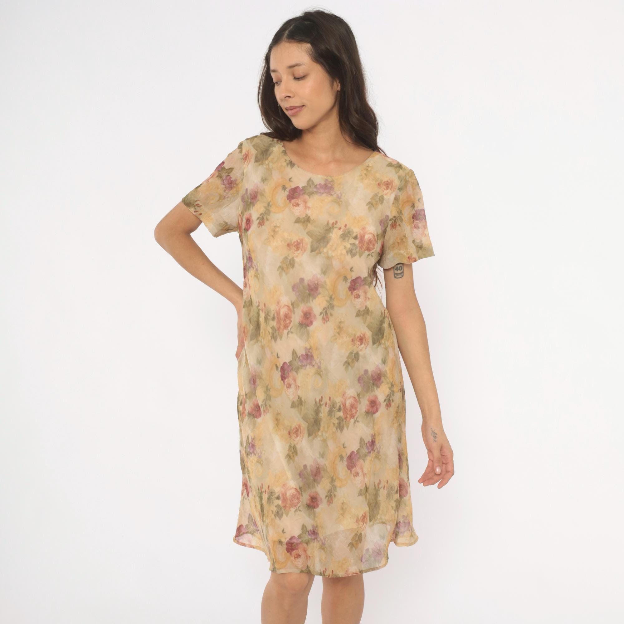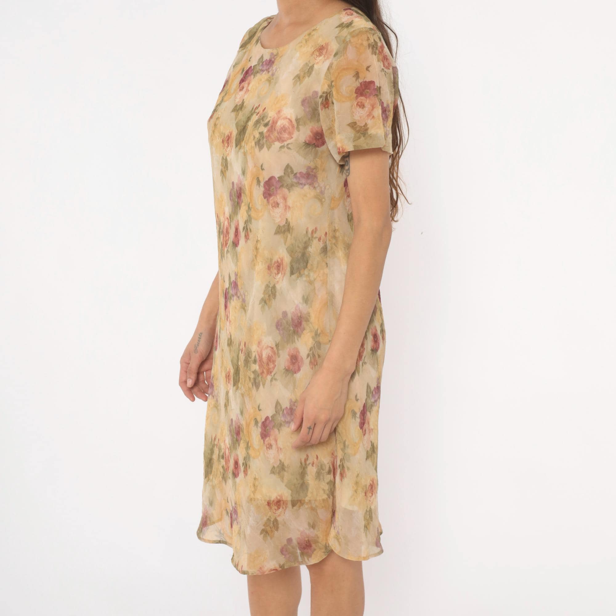 90s floral shift dress from DJ Summers with an allover watercolor rose print in pink, mauve, sage green, and gold tones on a tan base. Scoop neckline, short flutter sleeves, and a straight A-line silhouette falling to knee length. Pullover style with no closure, sheer chiffon outer layer over a lined body.