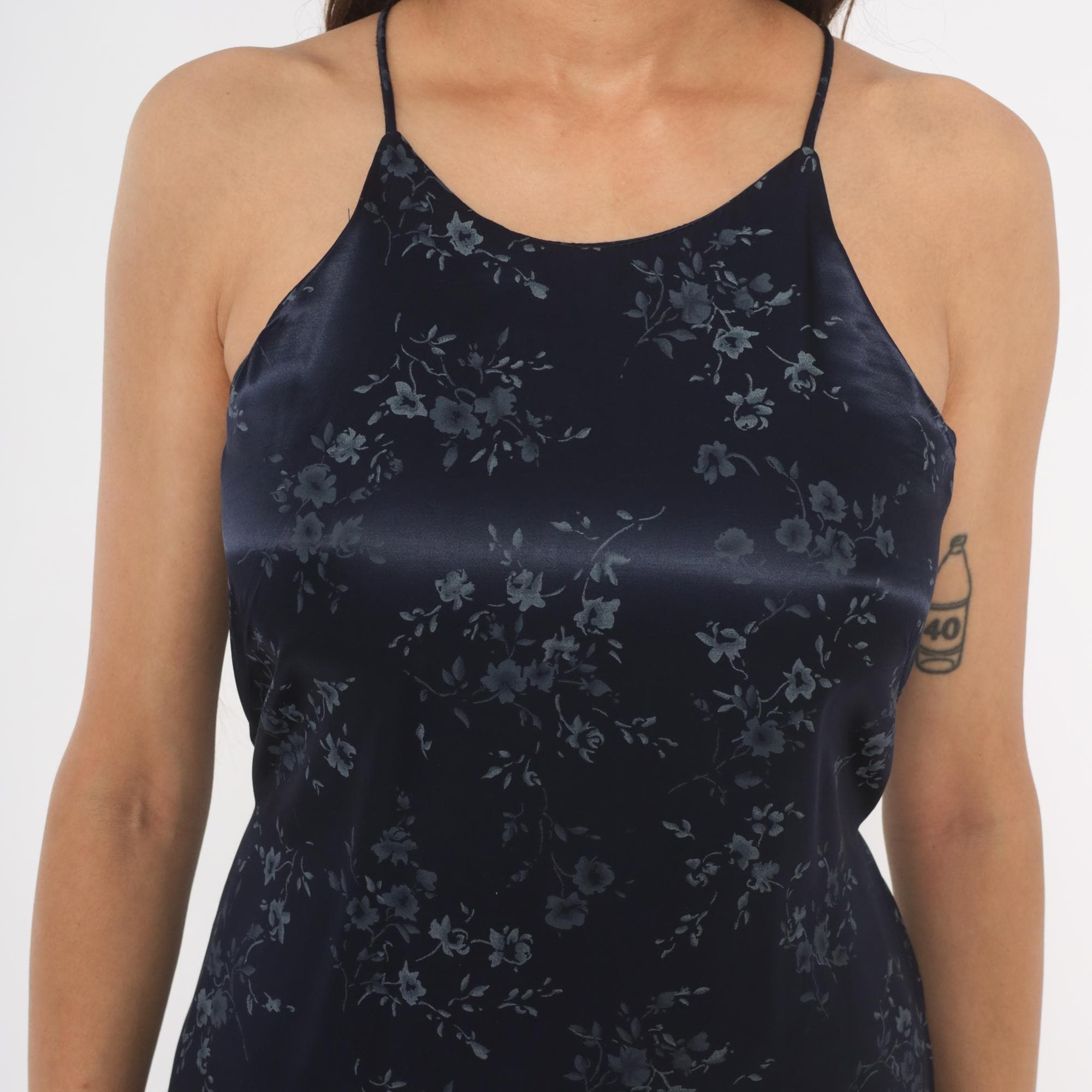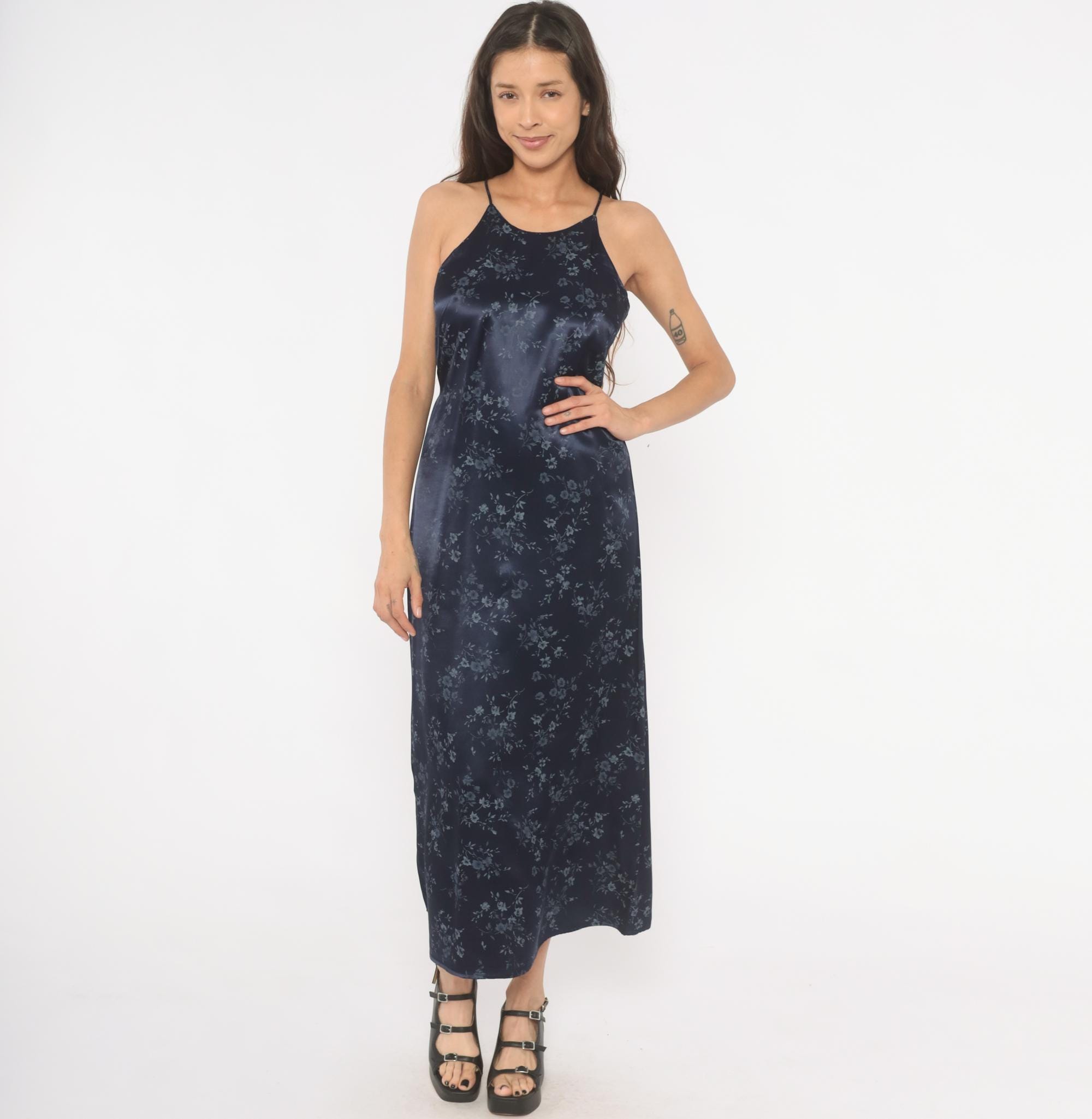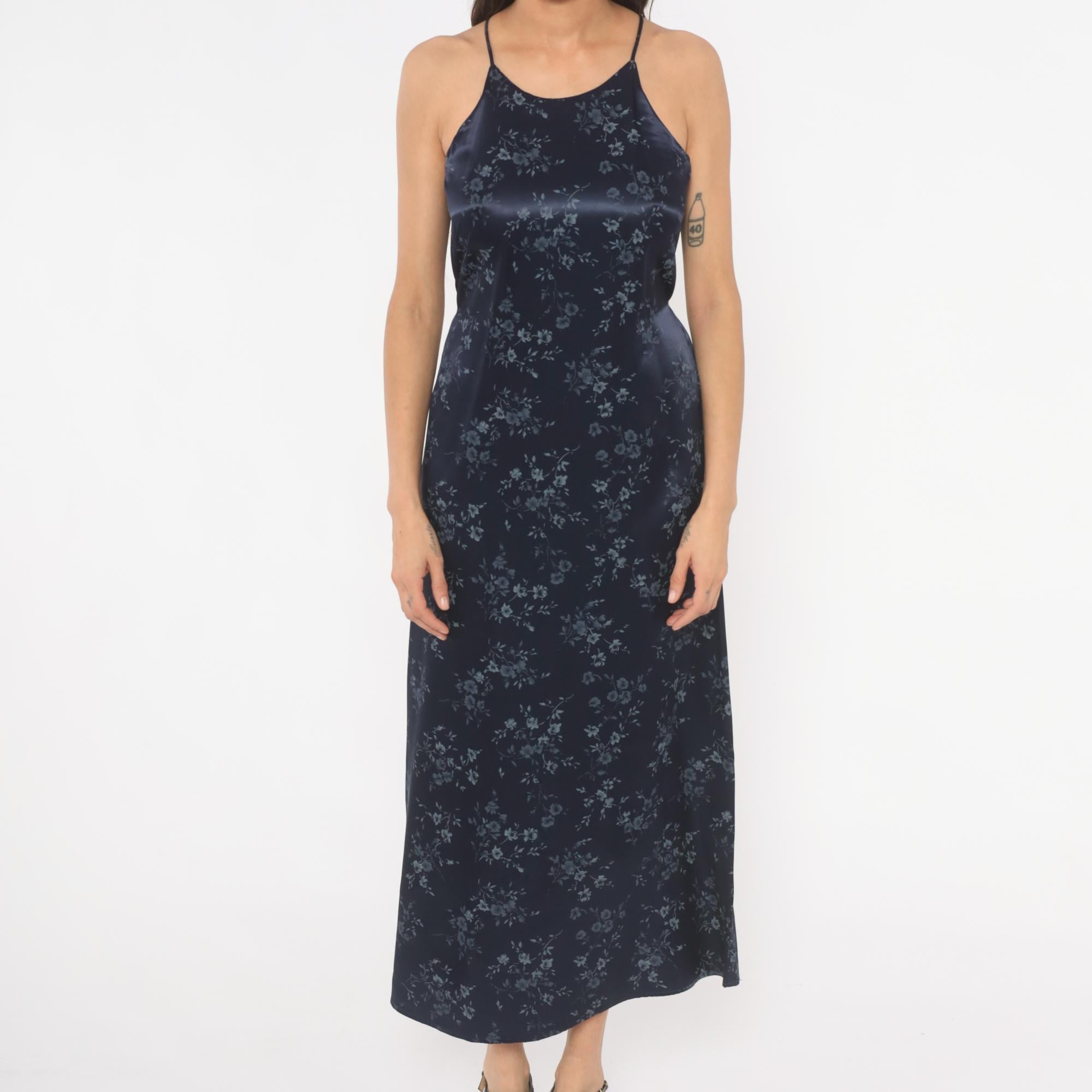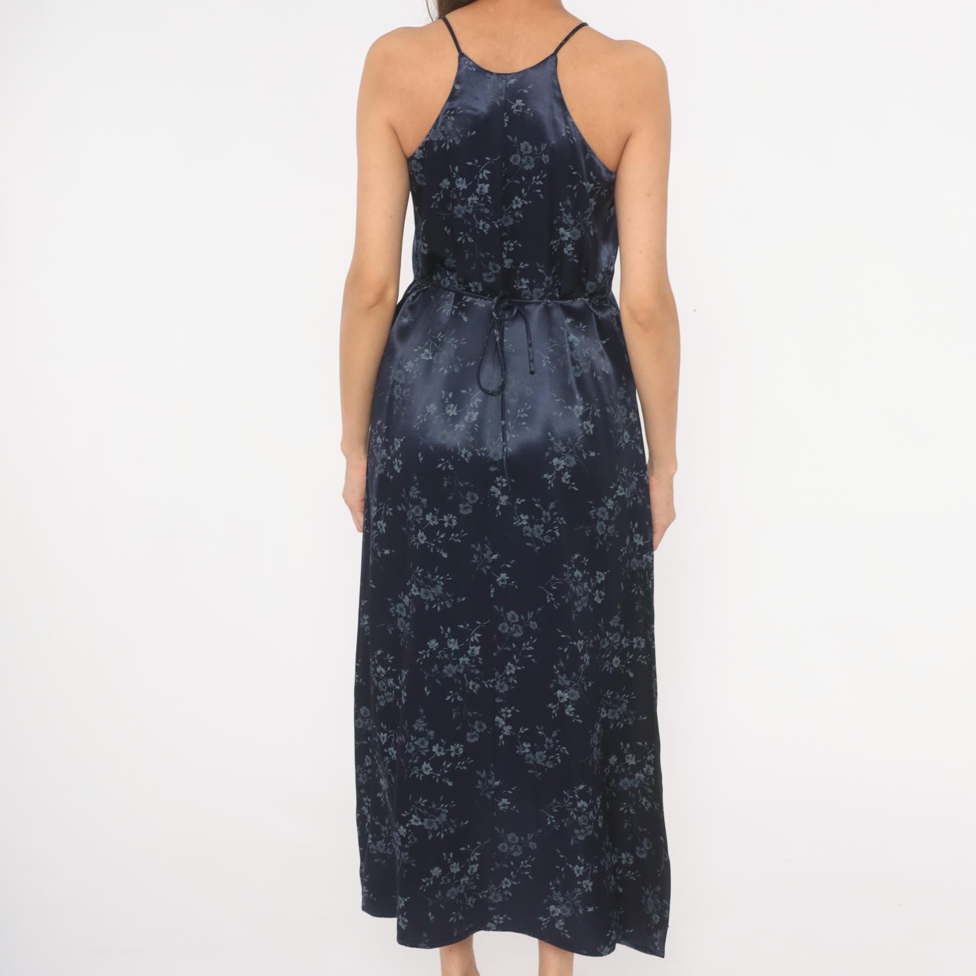 Navy satin halter neck maxi dress from the 90s with a tonal blue floral print across the entire garment. High neckline with thin spaghetti straps and a tie closure at the center back waist. Straight column silhouette with an ankle-length hem, fitted through the bodice and waist with a relaxed skirt.