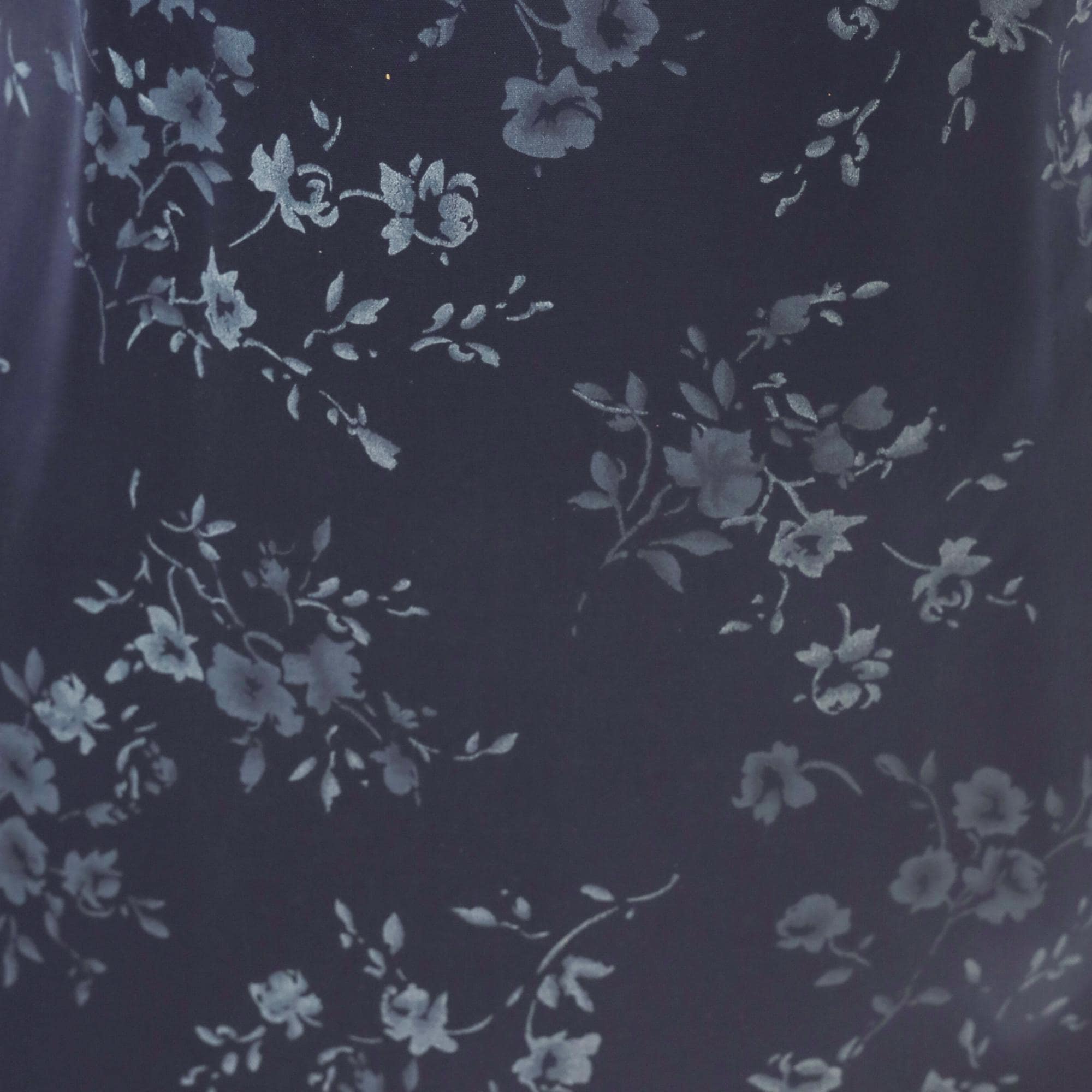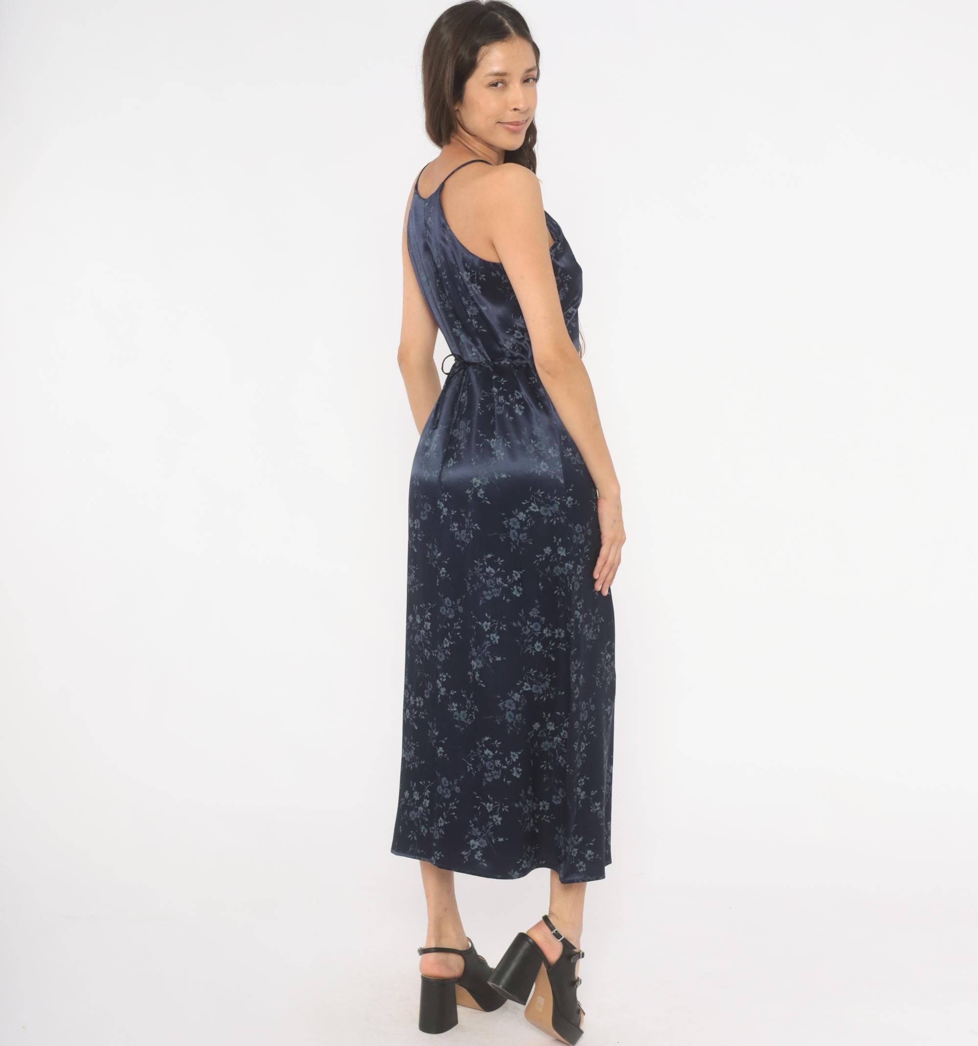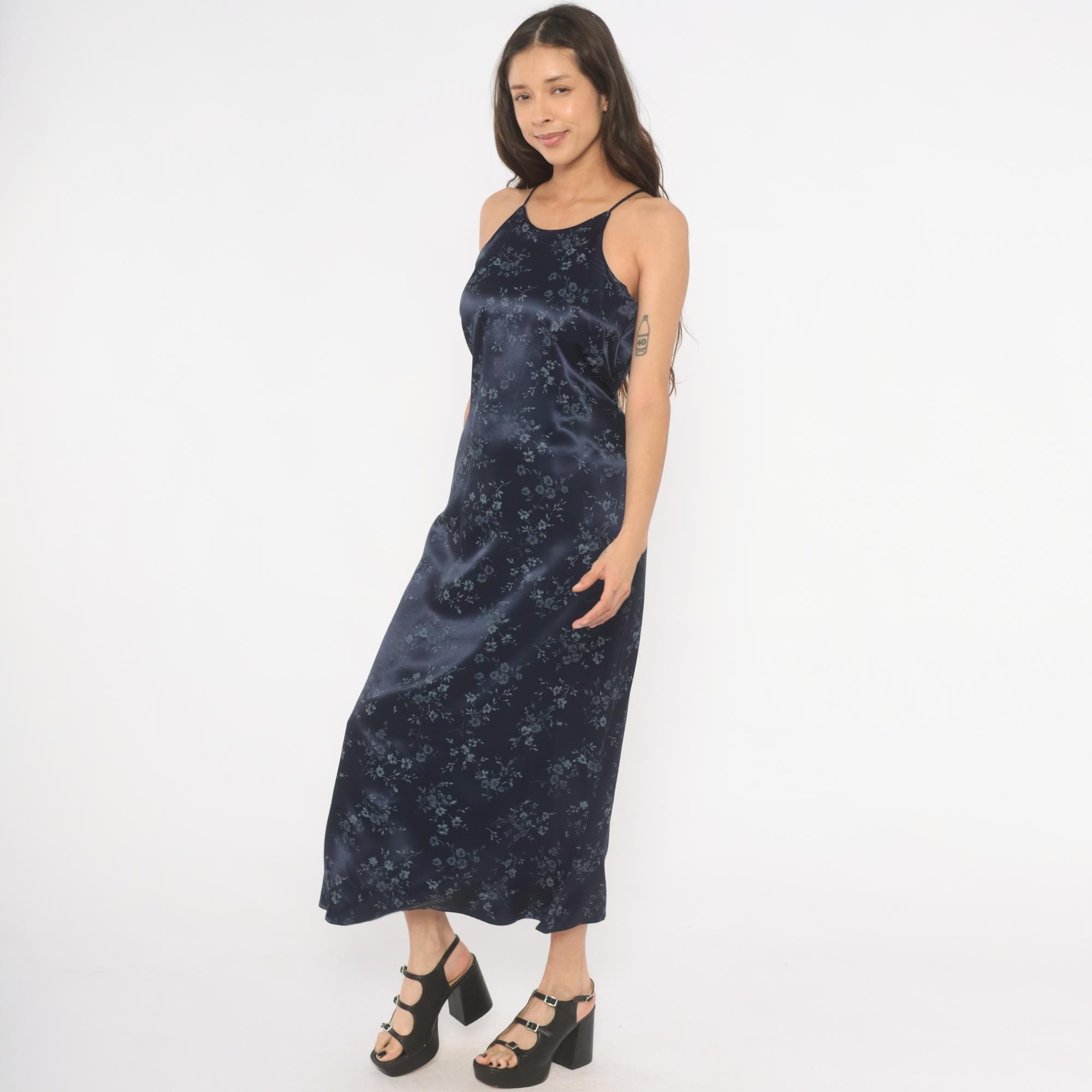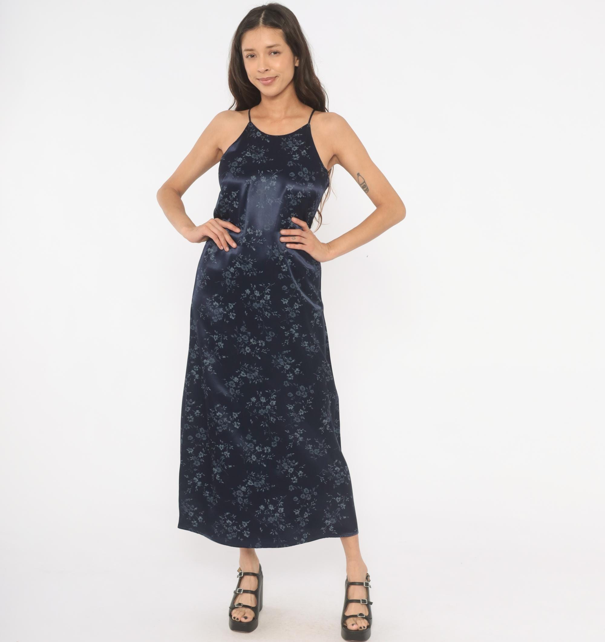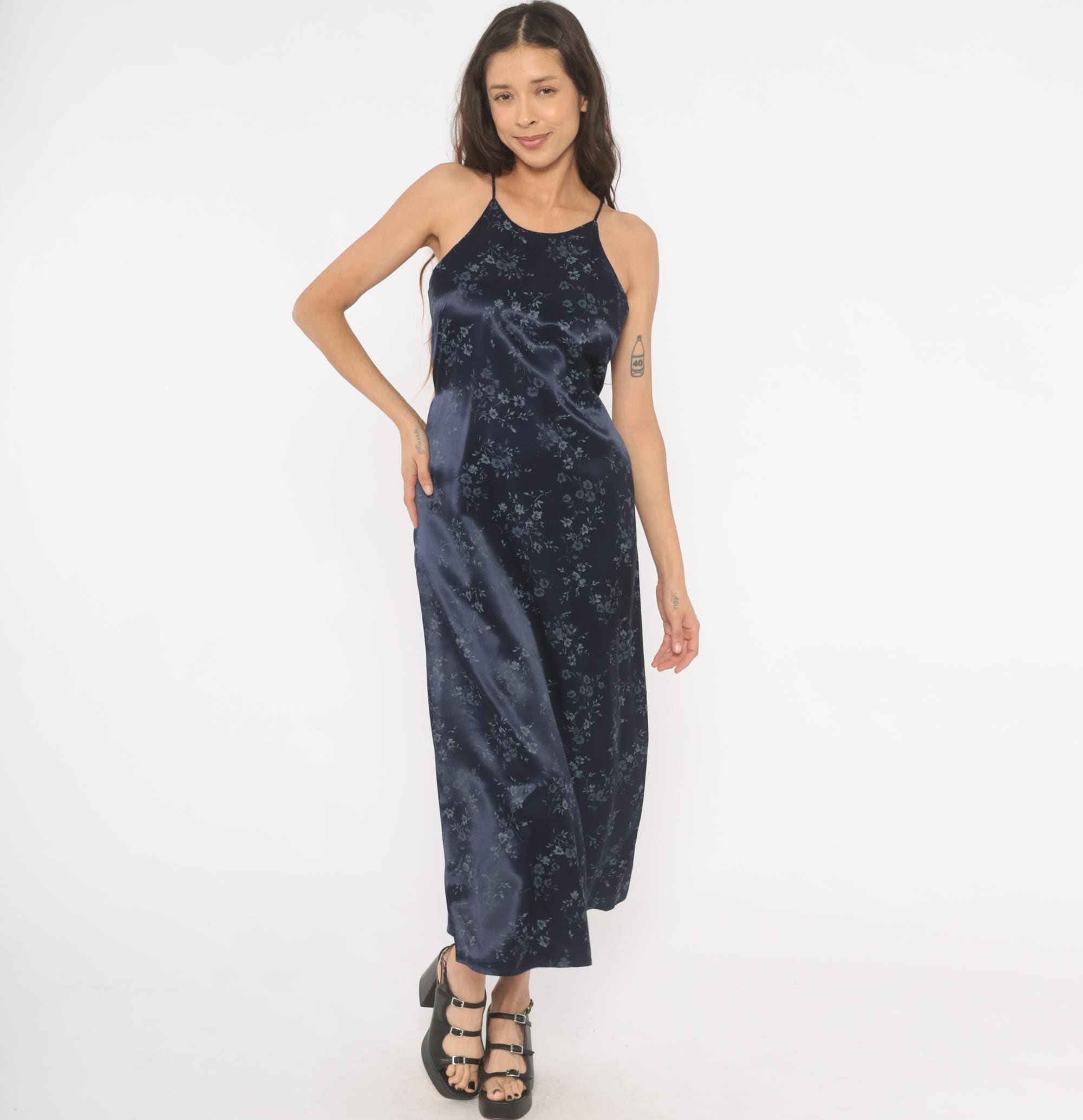 Navy satin halter neck maxi dress from the 90s with a tonal blue floral print across the entire garment. High neckline with thin spaghetti straps and a tie closure at the center back waist. Straight column silhouette with an ankle-length hem, fitted through the bodice and waist with a relaxed skirt.