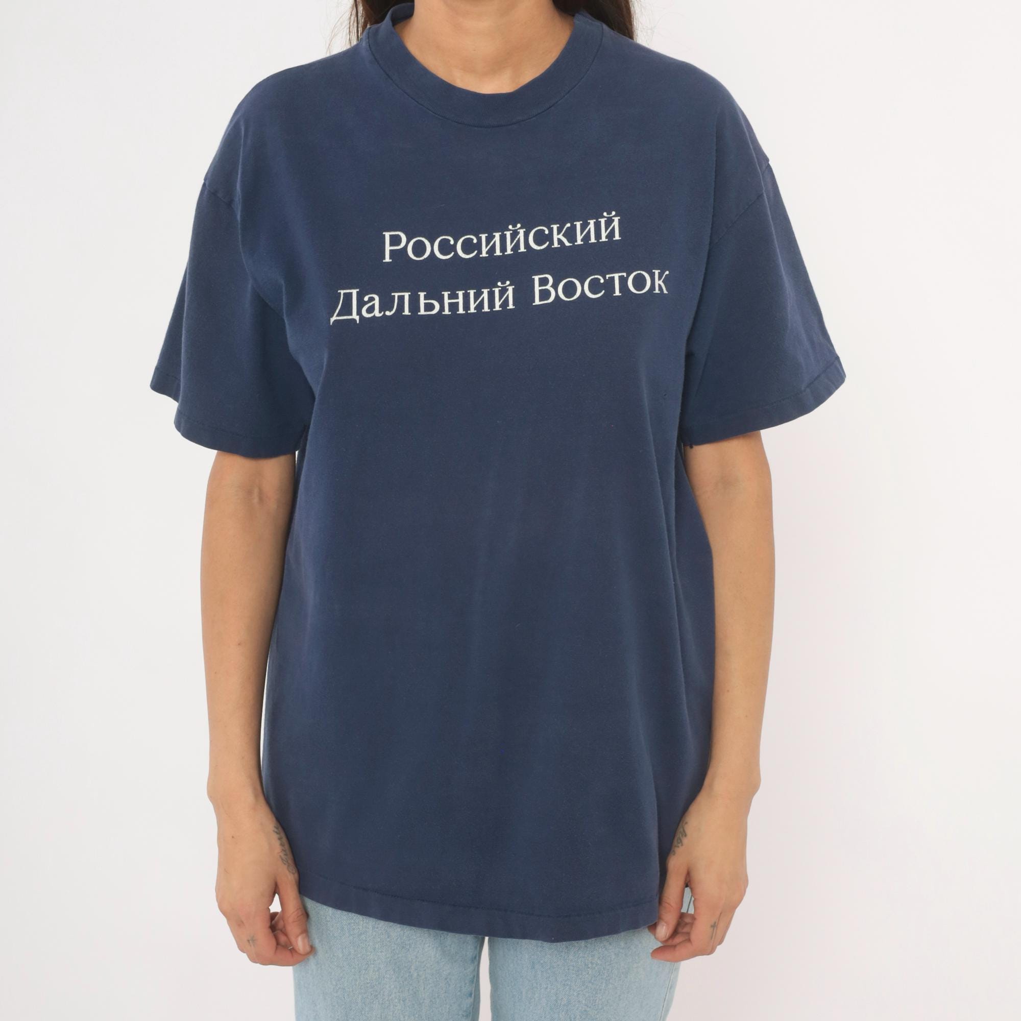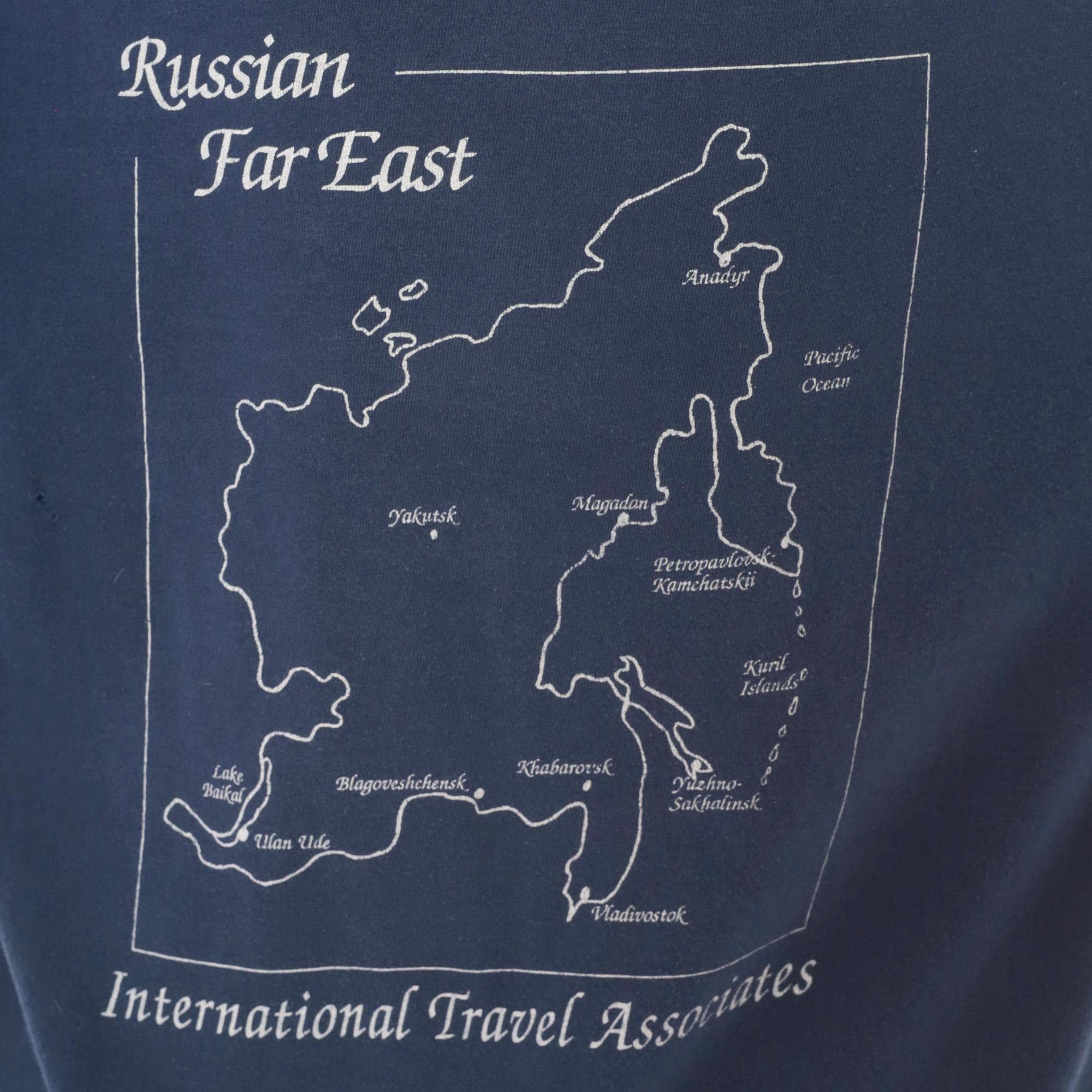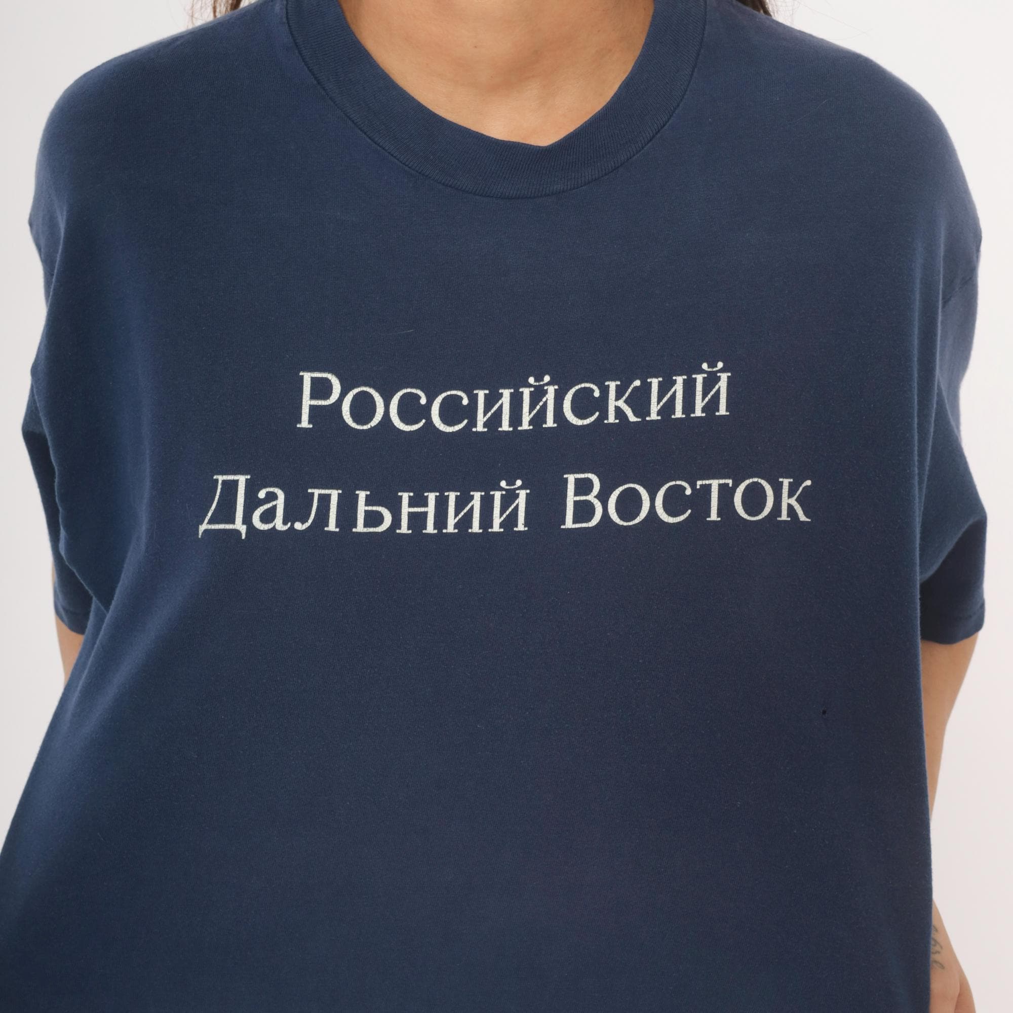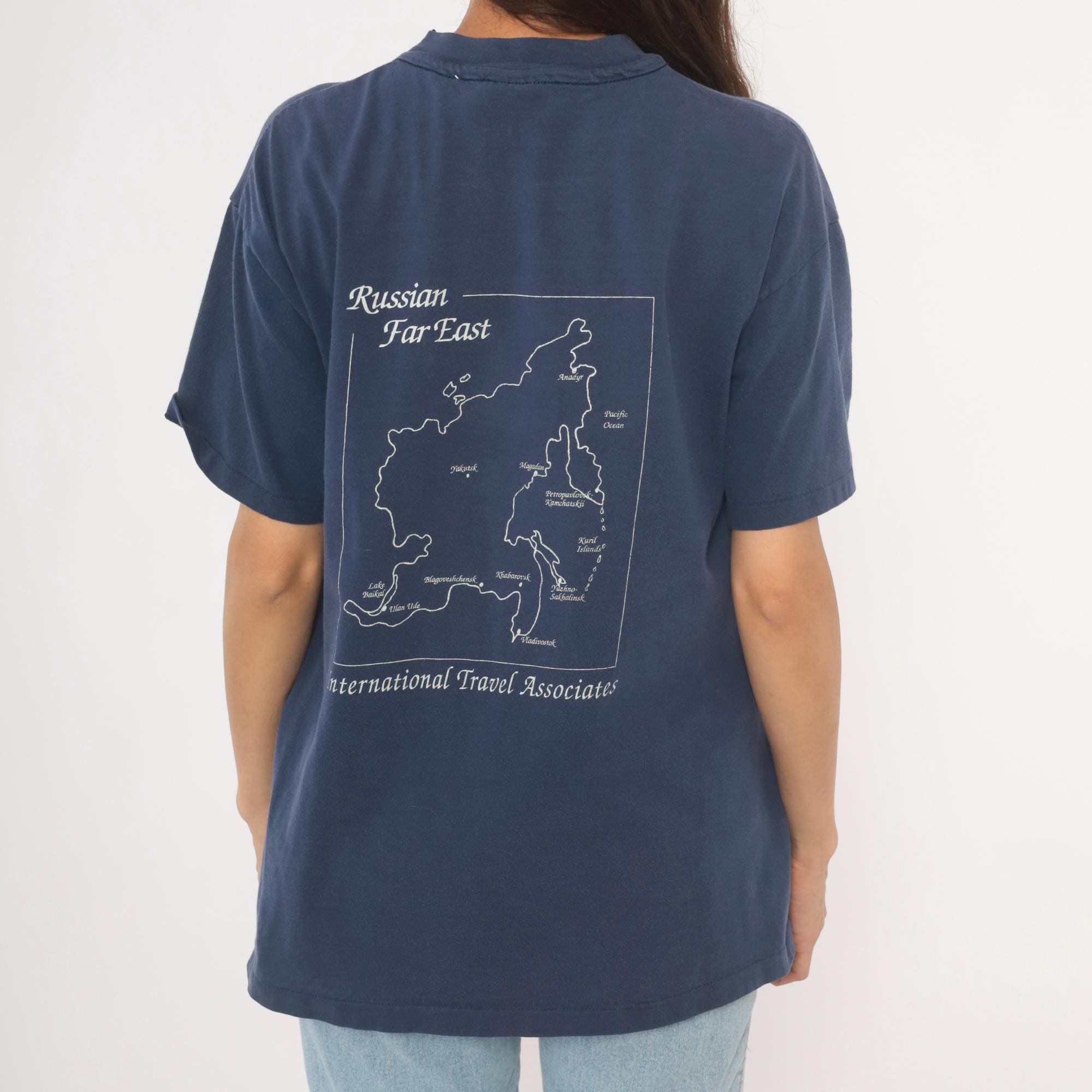90s navy crew neck tee from Hanes with white embroidered Cyrillic text reading "Российский Дальний Восток" (Russian Far East) across the chest. White printed map on the back outlines the Russian Far East region with labeled cities including Vladivostok, Magadan, Yakutsk, Petropavlovsk-Kamchatskii, and Khabarovsk, alongside the text "International Travel Associates."