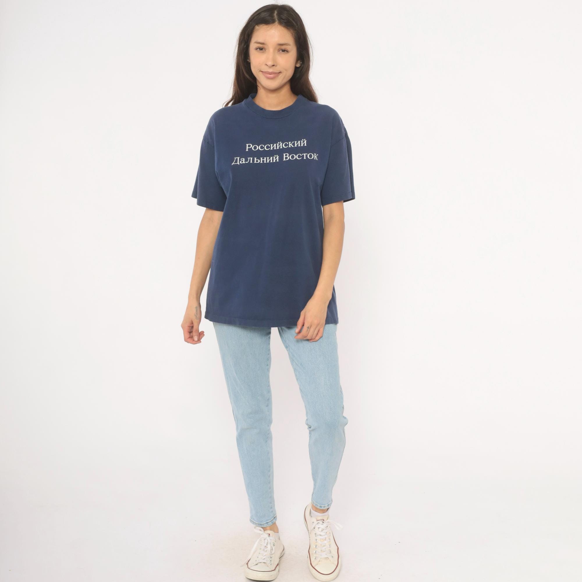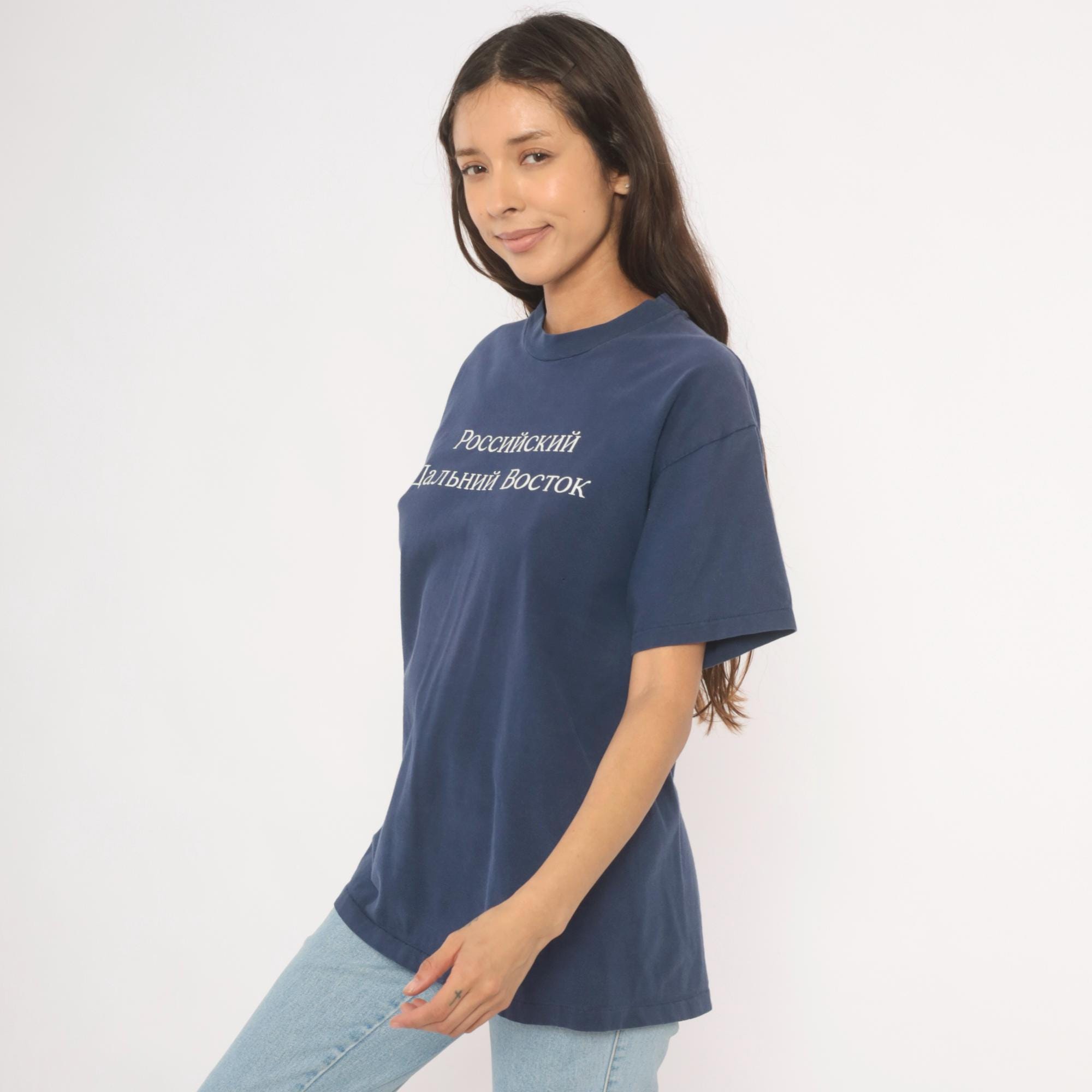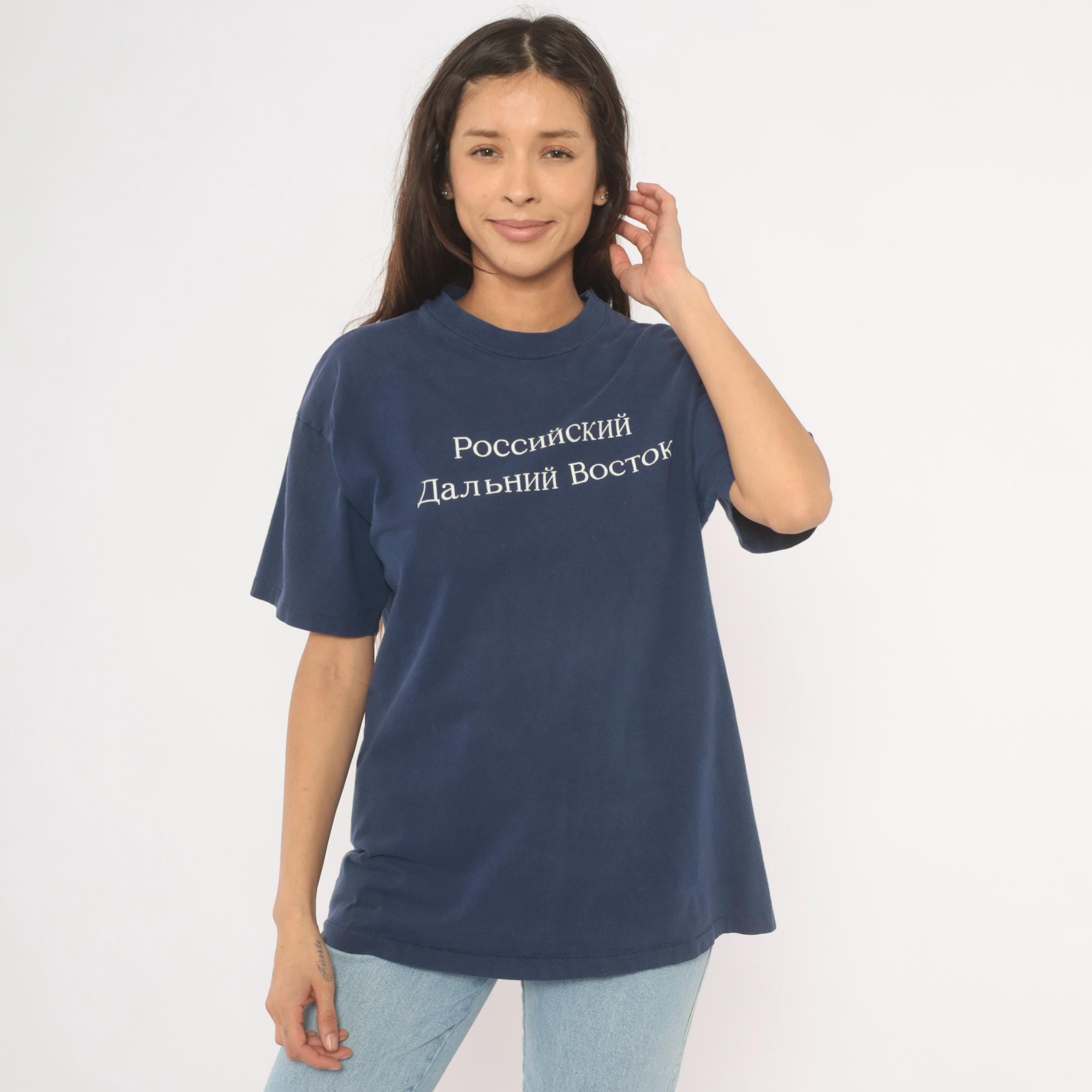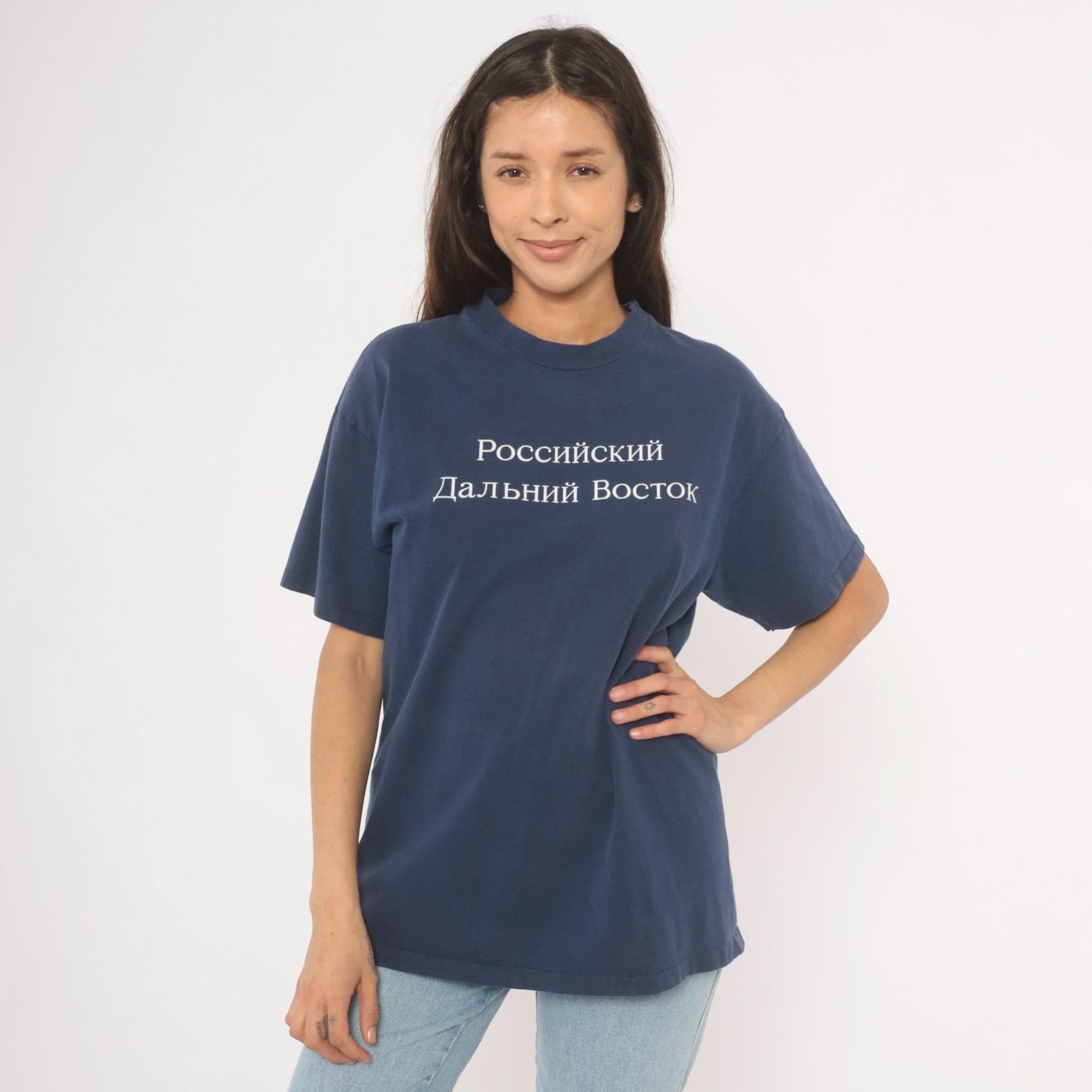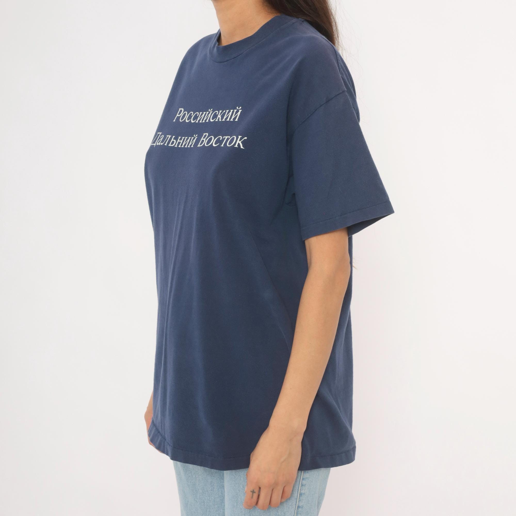 90s navy crew neck tee from Hanes with white embroidered Cyrillic text reading "Российский Дальний Восток" (Russian Far East) across the chest. White printed map on the back outlines the Russian Far East region with labeled cities including Vladivostok, Magadan, Yakutsk, Petropavlovsk-Kamchatskii, and Khabarovsk, alongside the text "International Travel Associates."