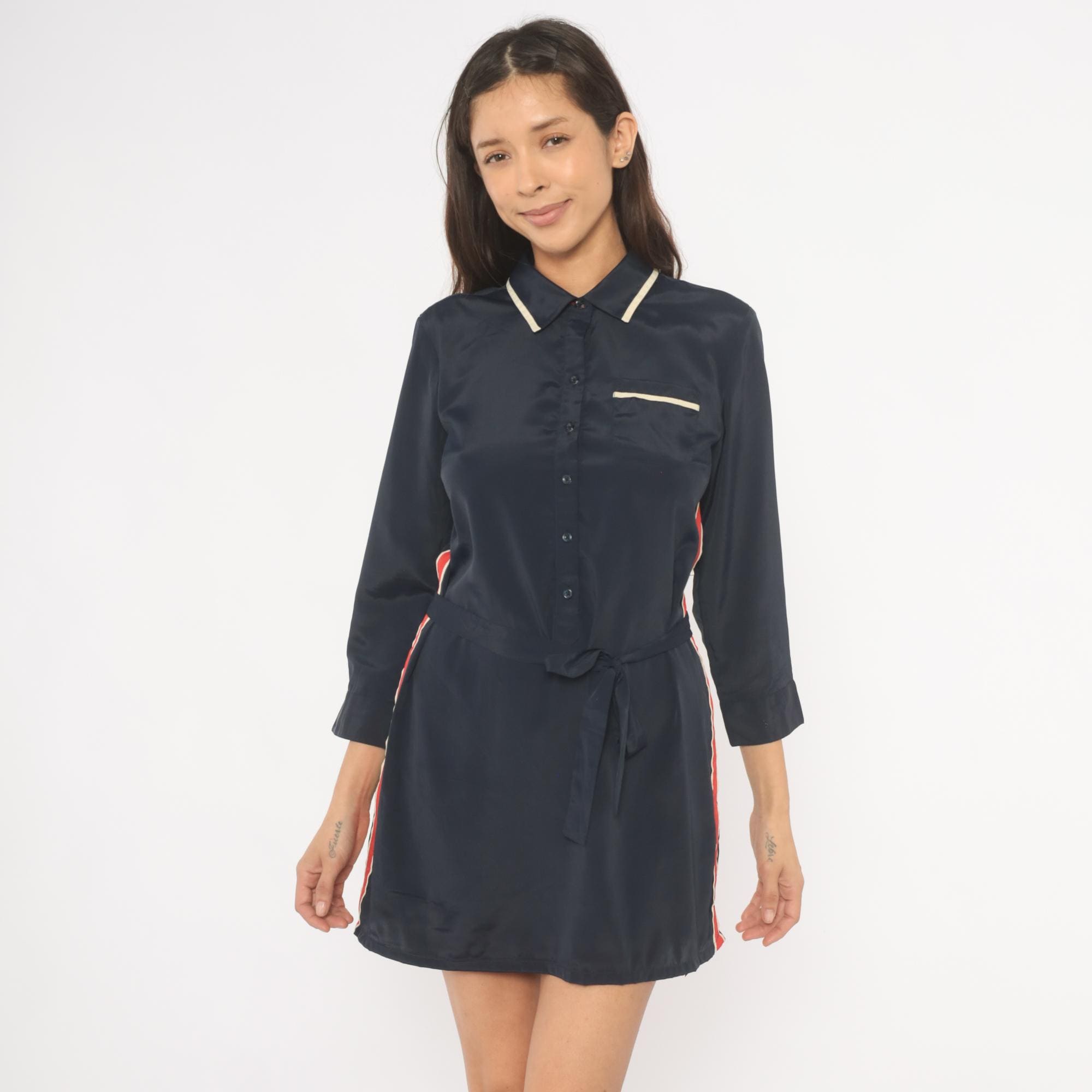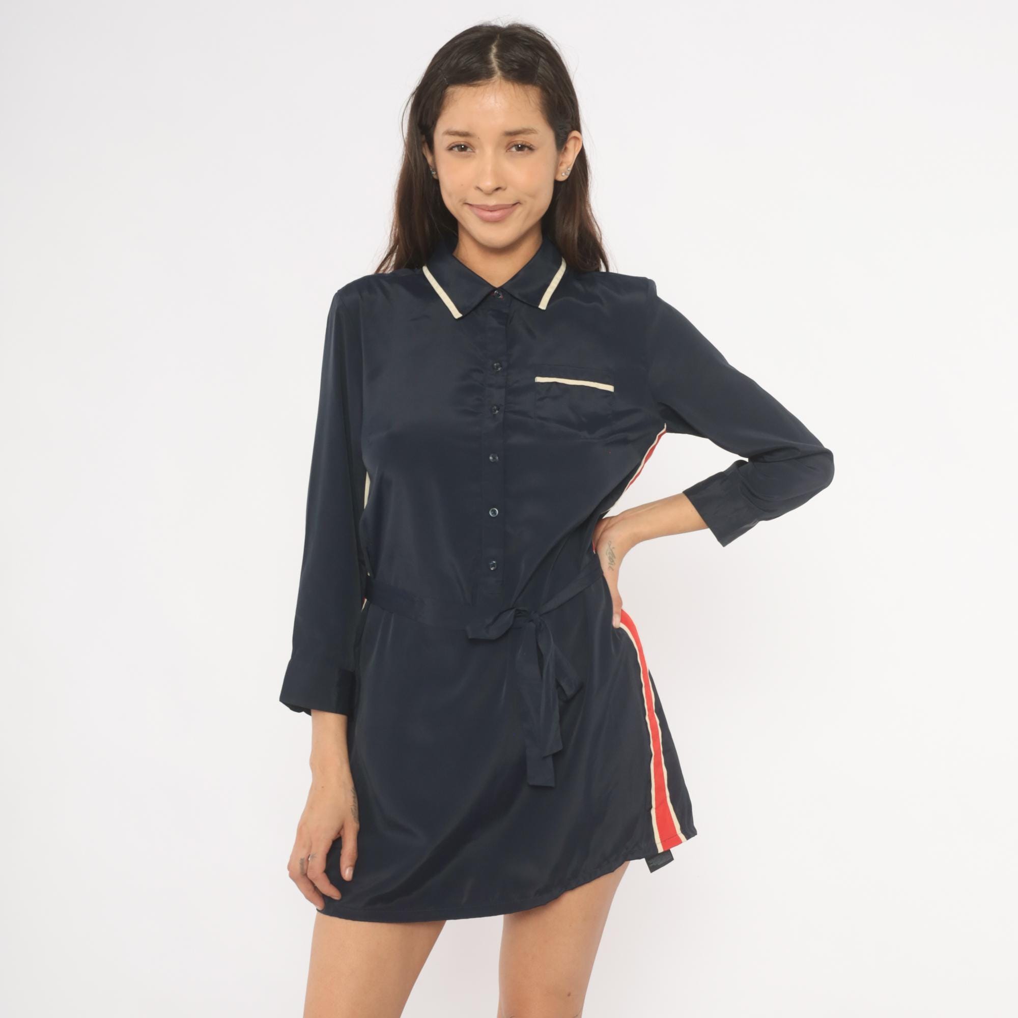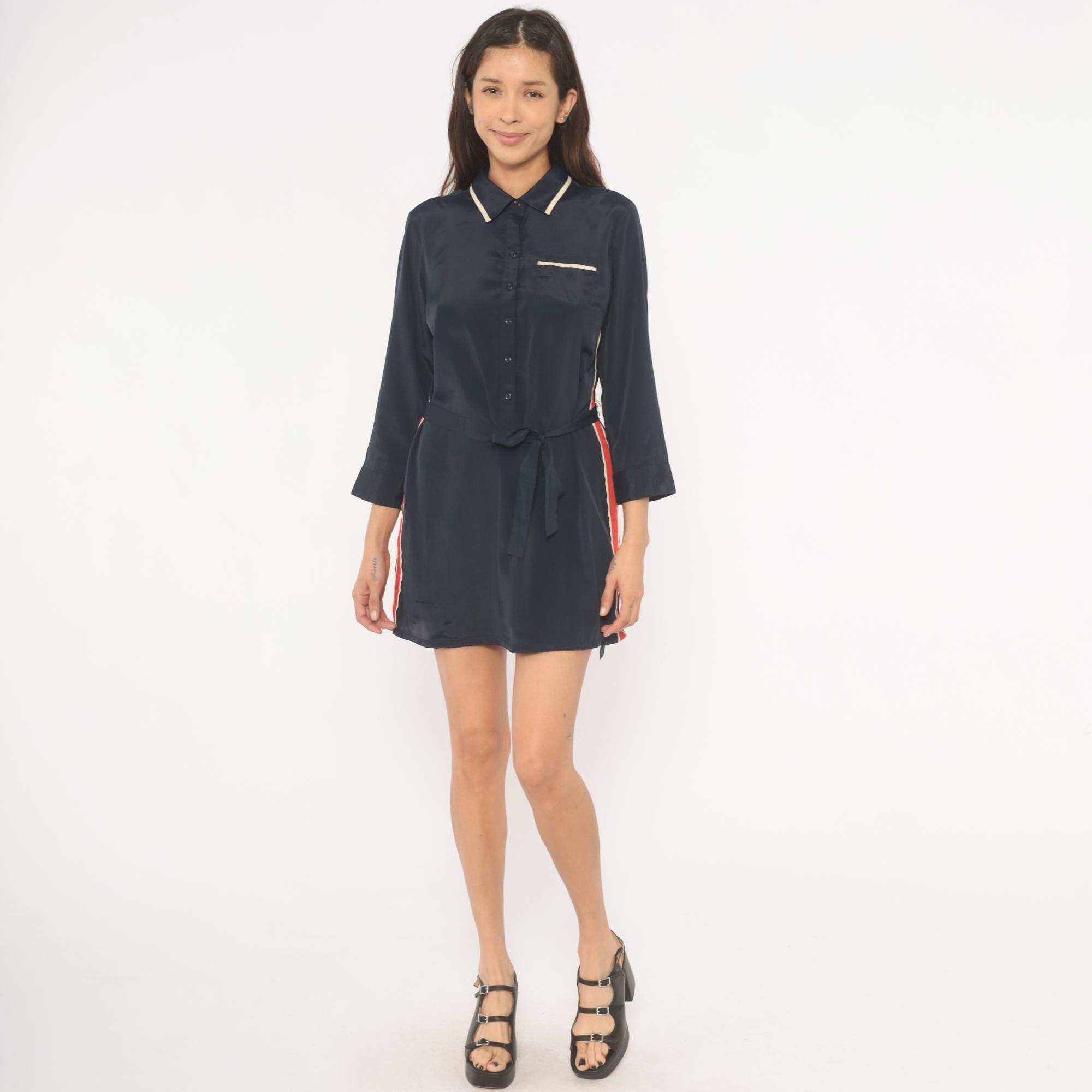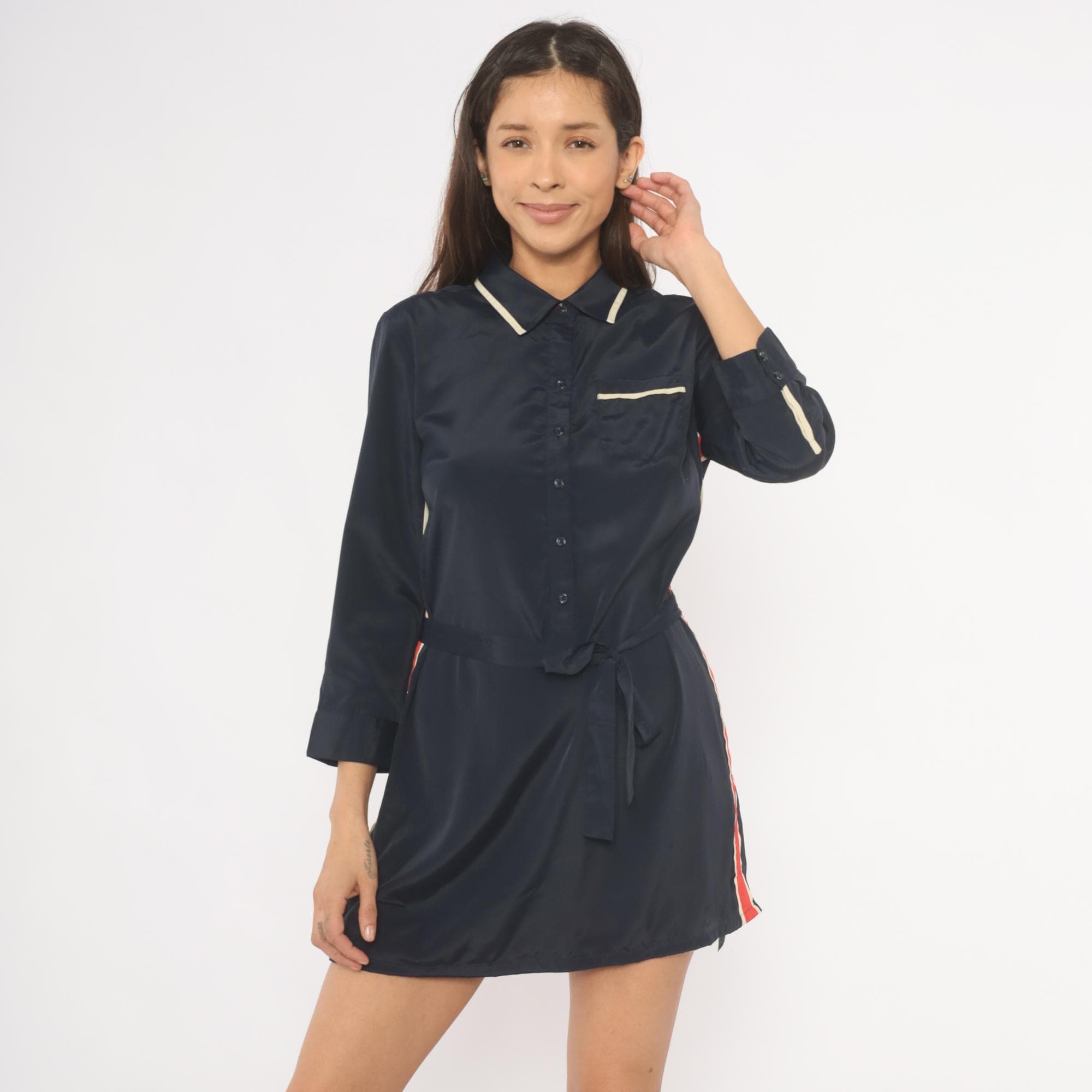 2000s navy mini shirt dress from Tommy Hilfiger with a point collar trimmed in cream, front button closure, and a self-tie waist sash. Red and cream vertical side stripes run along both side seams from waist to hem. Chest patch pocket with cream trim, 3/4 length sleeves with buttoned cuffs in cream contrast trim, and coin pockets at the sides.