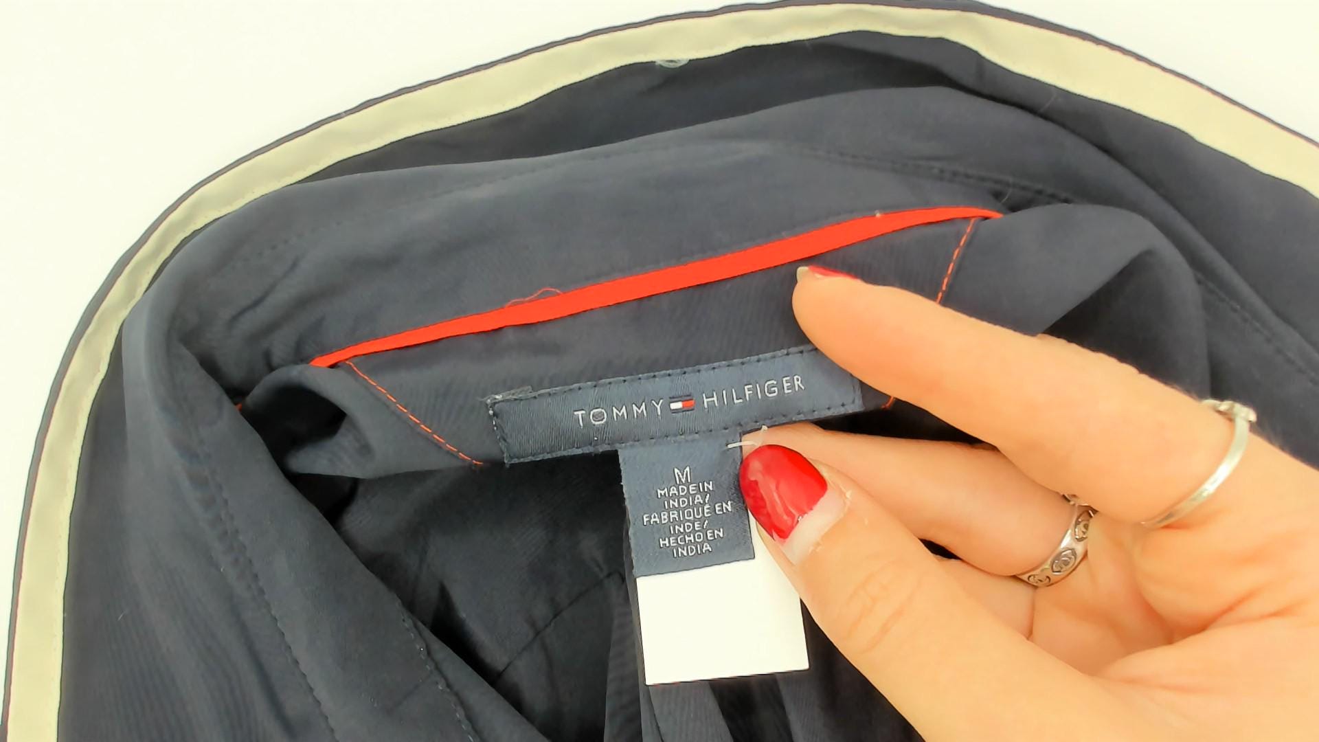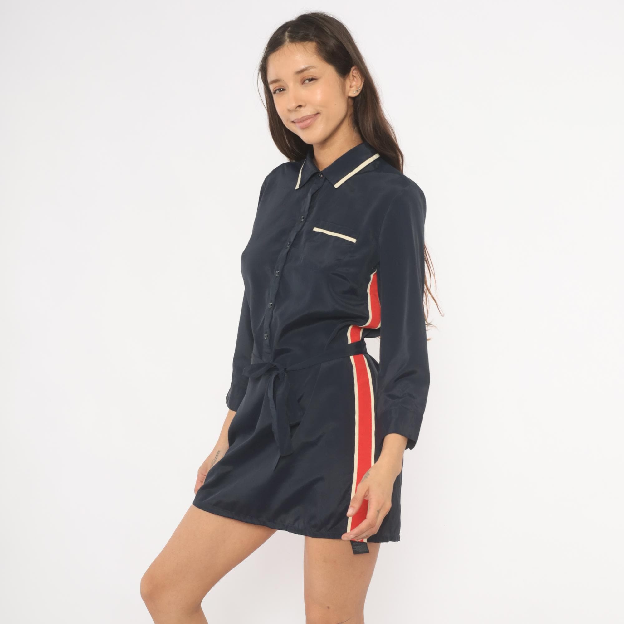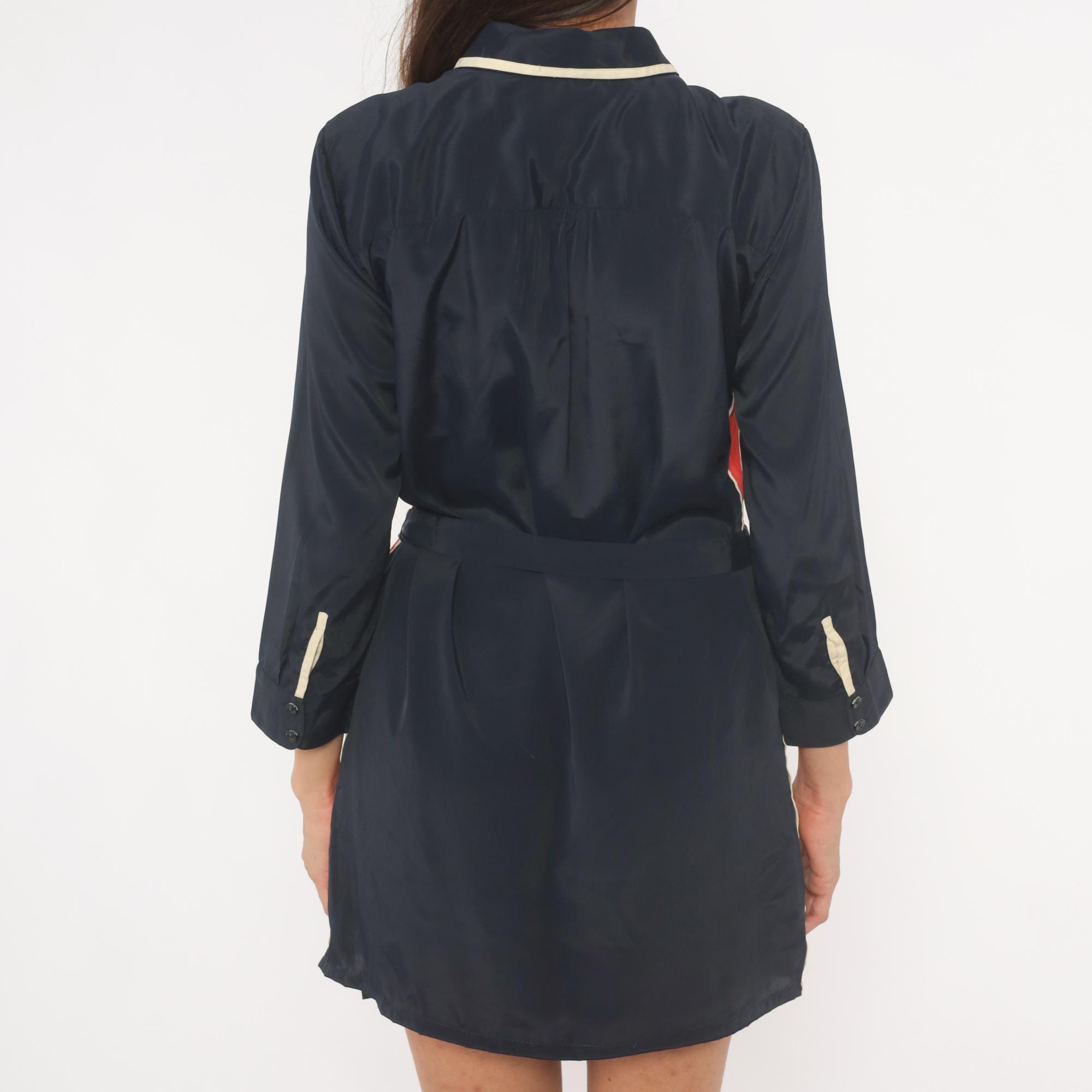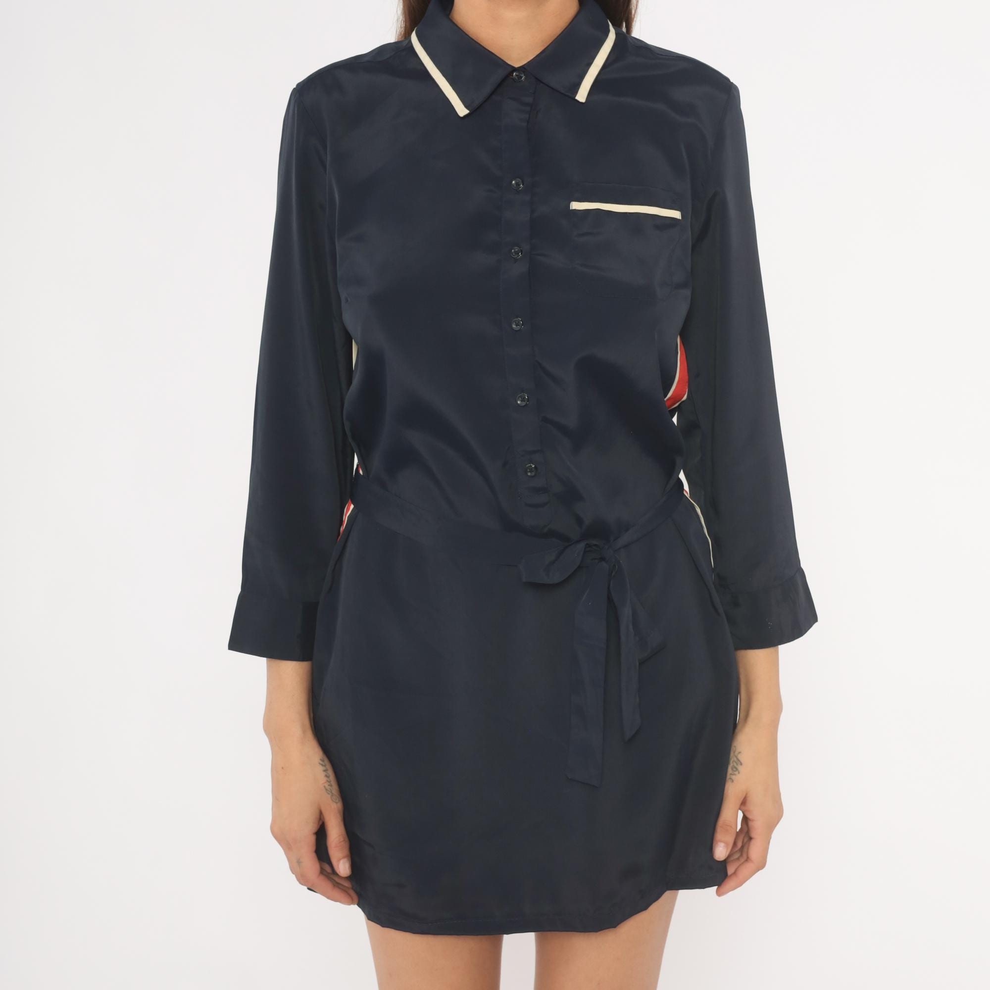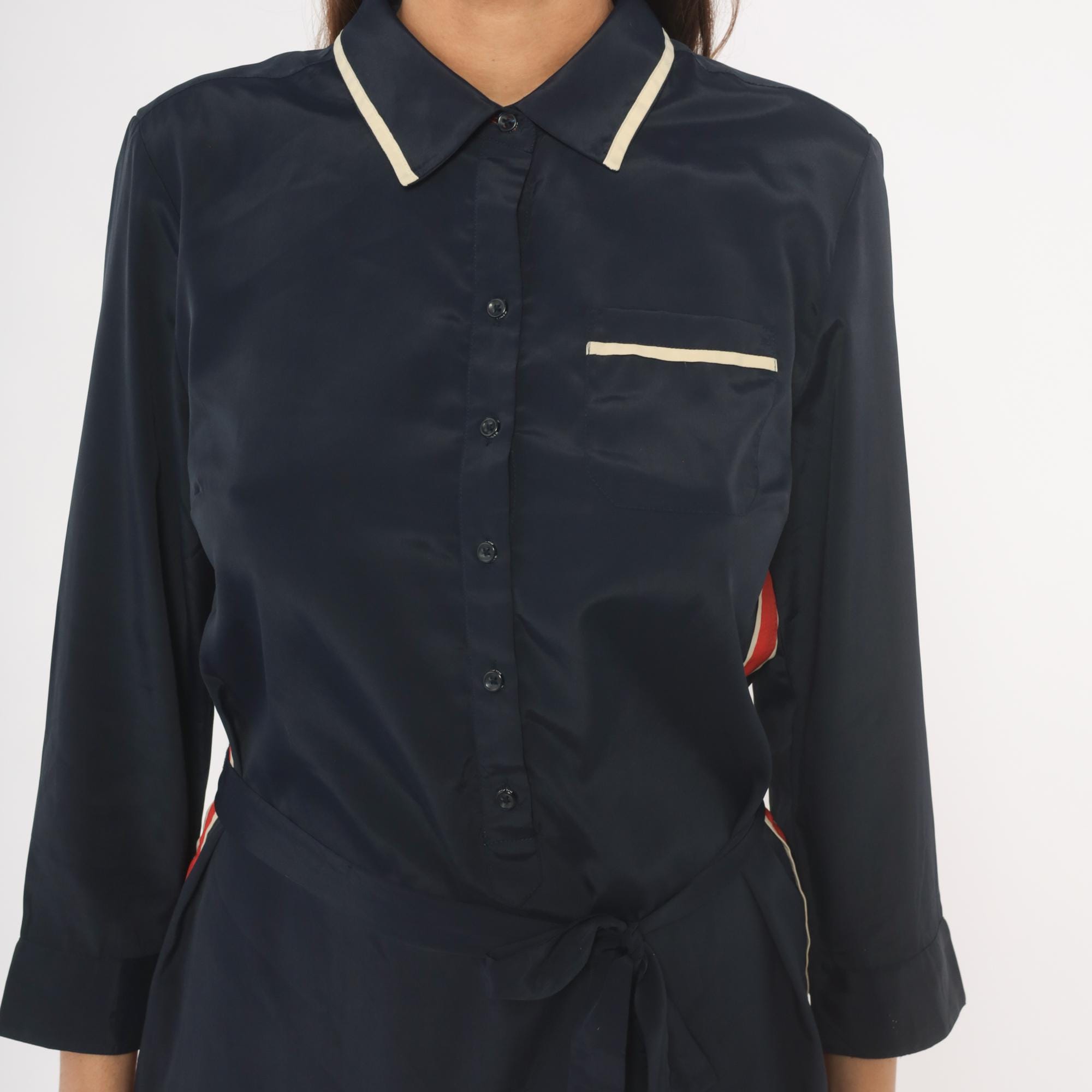 2000s navy mini shirt dress from Tommy Hilfiger with a point collar trimmed in cream, front button closure, and a self-tie waist sash. Red and cream vertical side stripes run along both side seams from waist to hem. Chest patch pocket with cream trim, 3/4 length sleeves with buttoned cuffs in cream contrast trim, and coin pockets at the sides.