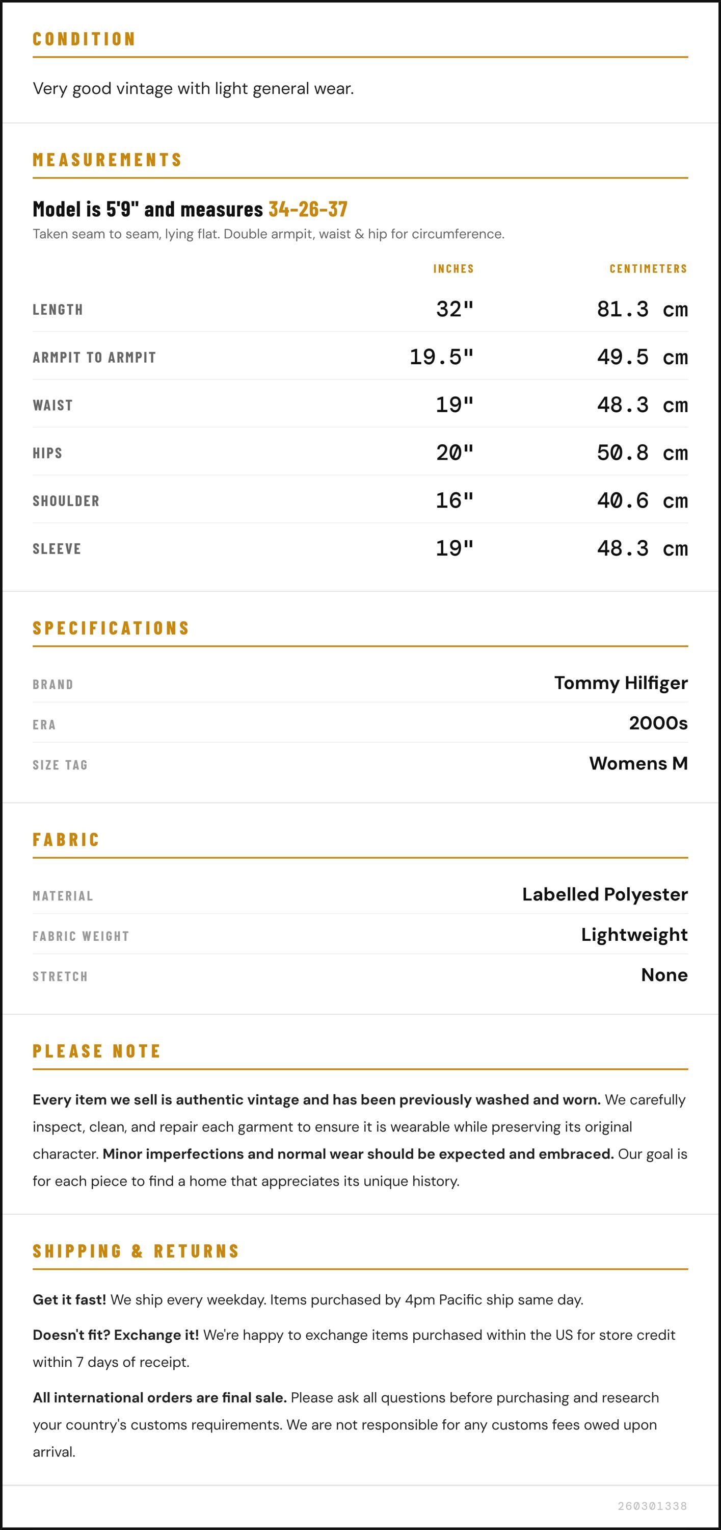 Vintage denim was usually made without any stretch, unlike modern jeans. Check the measurements to ensure proper fit, and remember to give yourself a little wiggle room in the waist and hips, depending on your preferred fit.