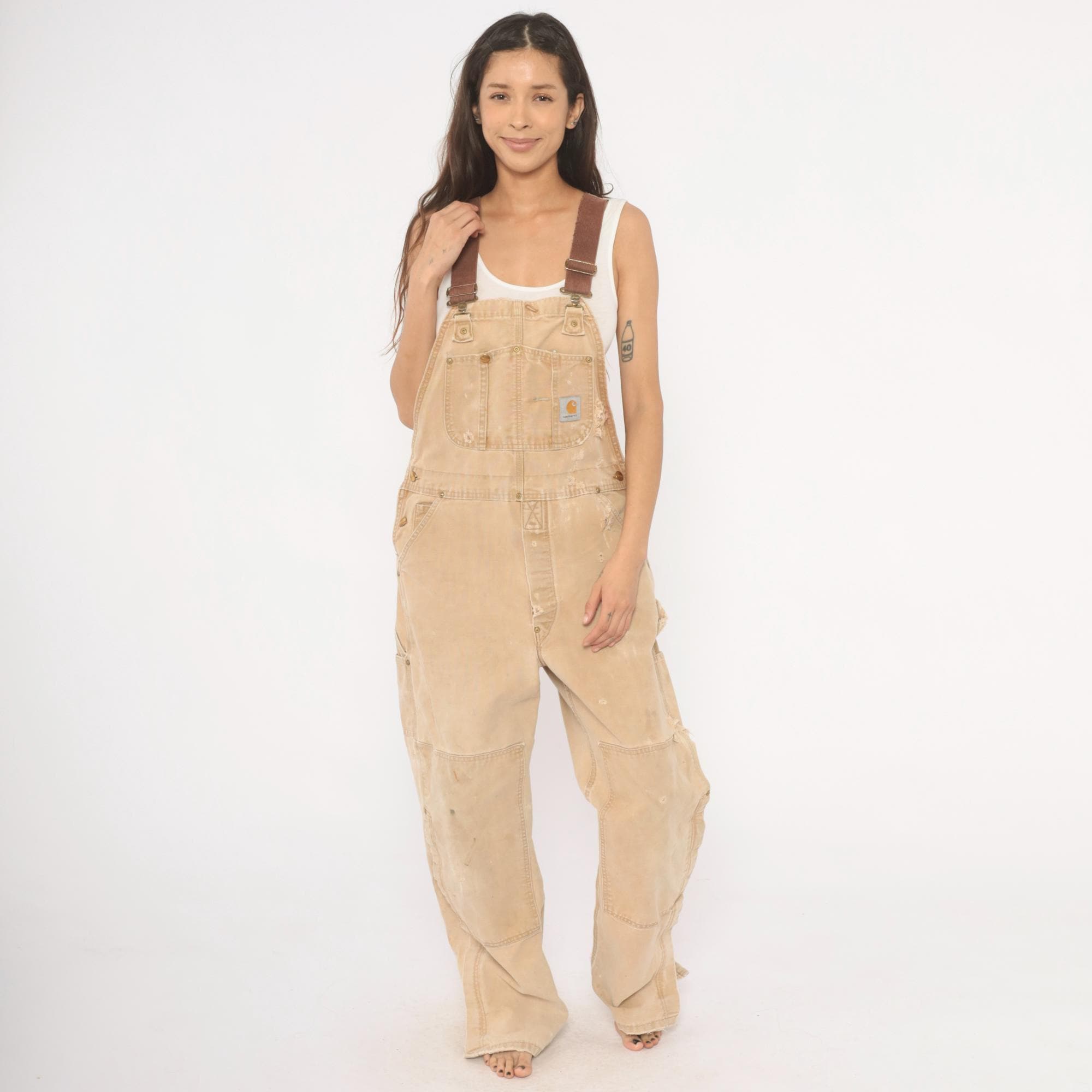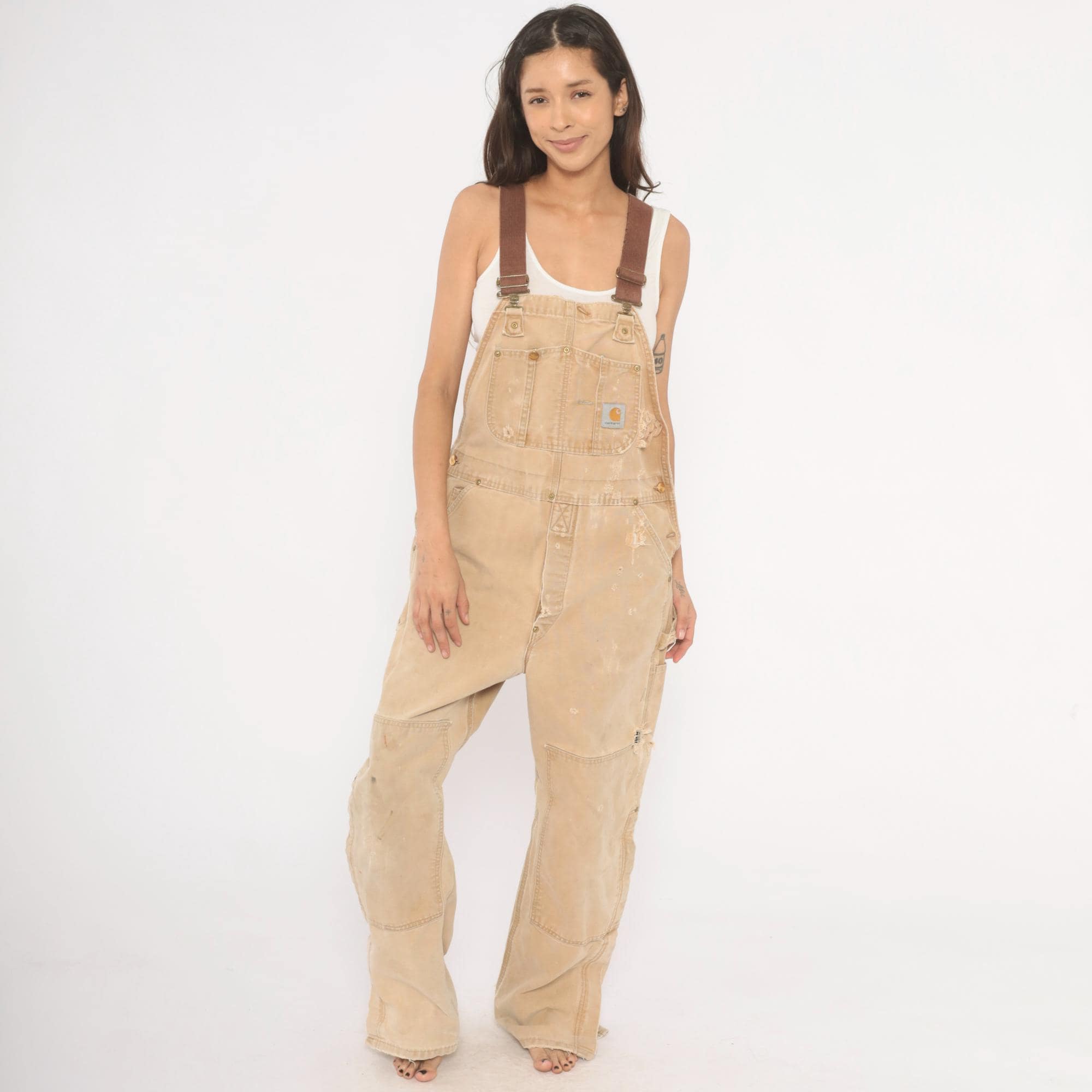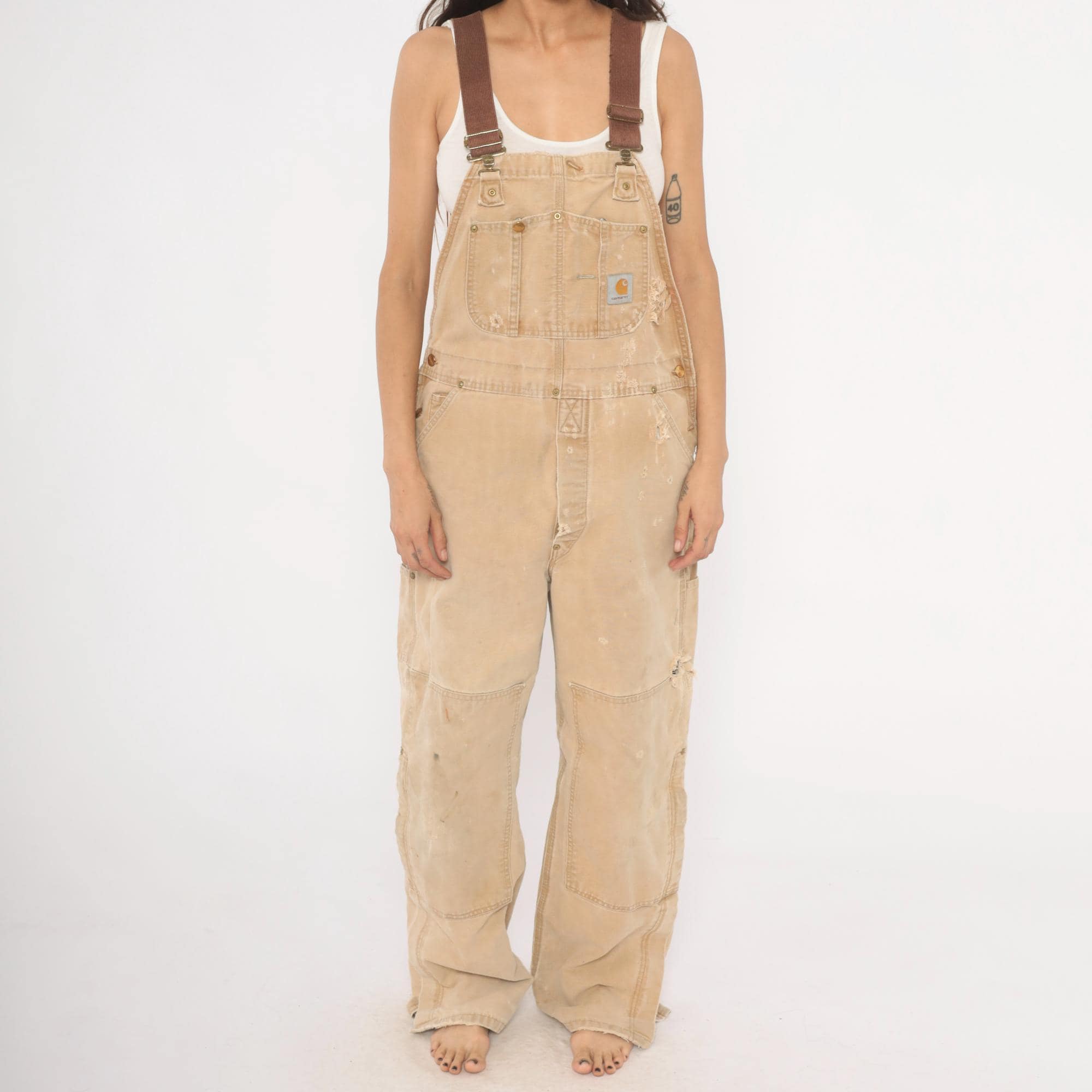 2000s Carhartt bib overalls in tan canvas with paint splatter and heavy distressing throughout. Adjustable brown webbing shoulder straps with brass hook closures, a bib chest pocket with Carhartt logo patch, and side snap buttons along the hip. Wide leg fit with reinforced double-knee panels, large cargo-style back pockets, and side seam pockets. Frayed hem at ankles from wear.