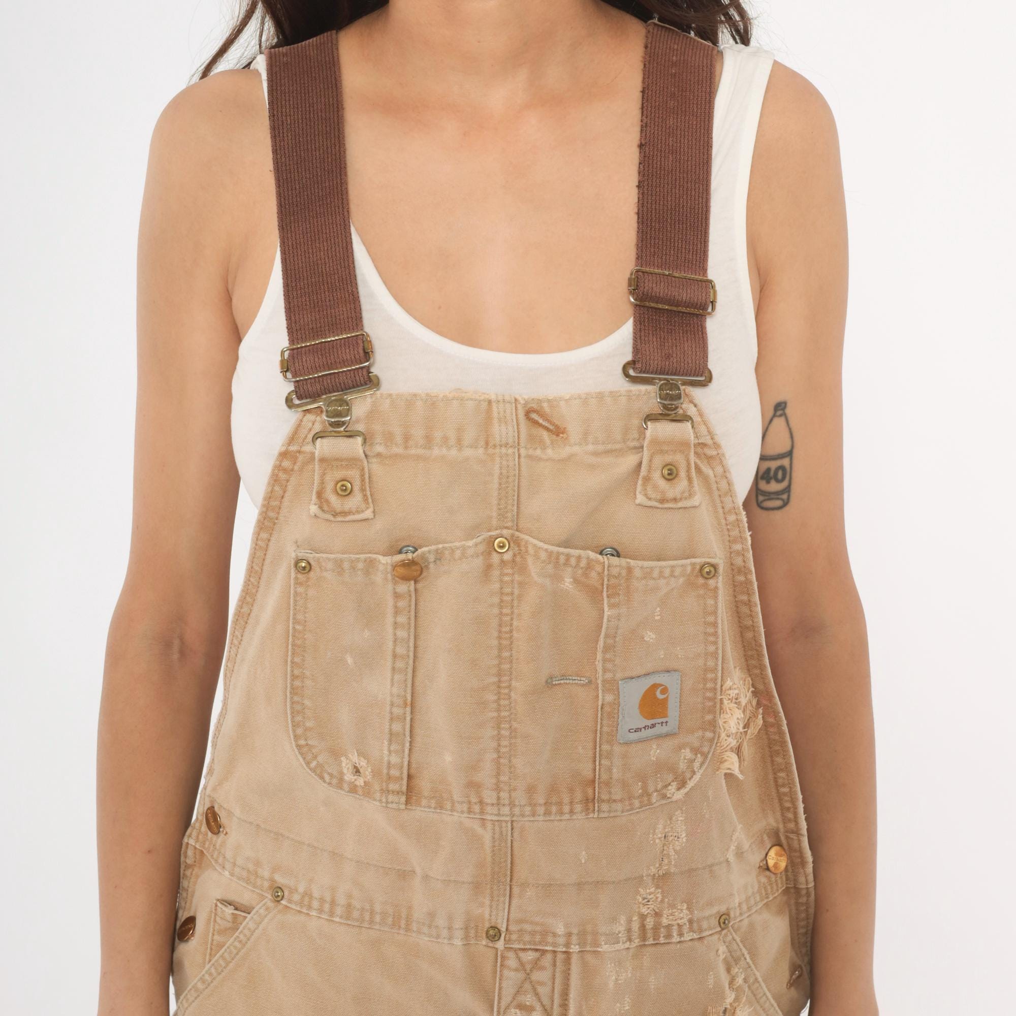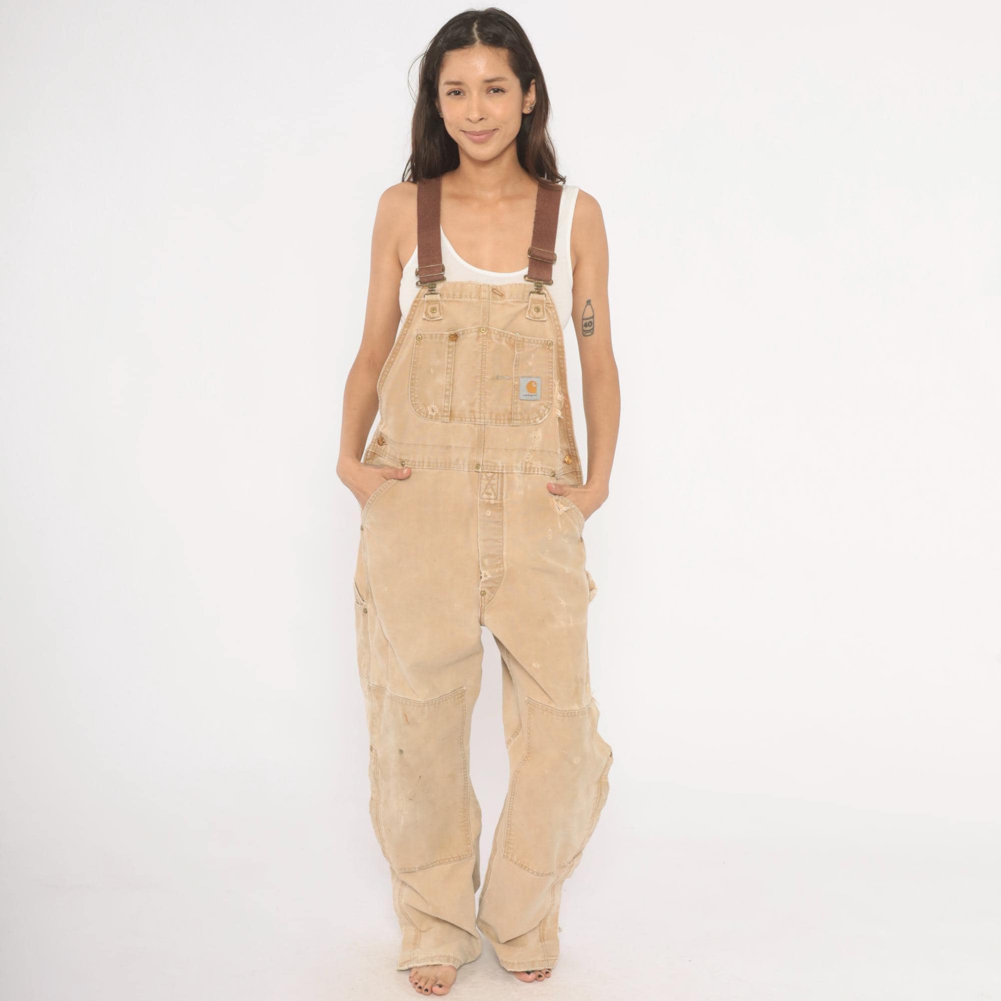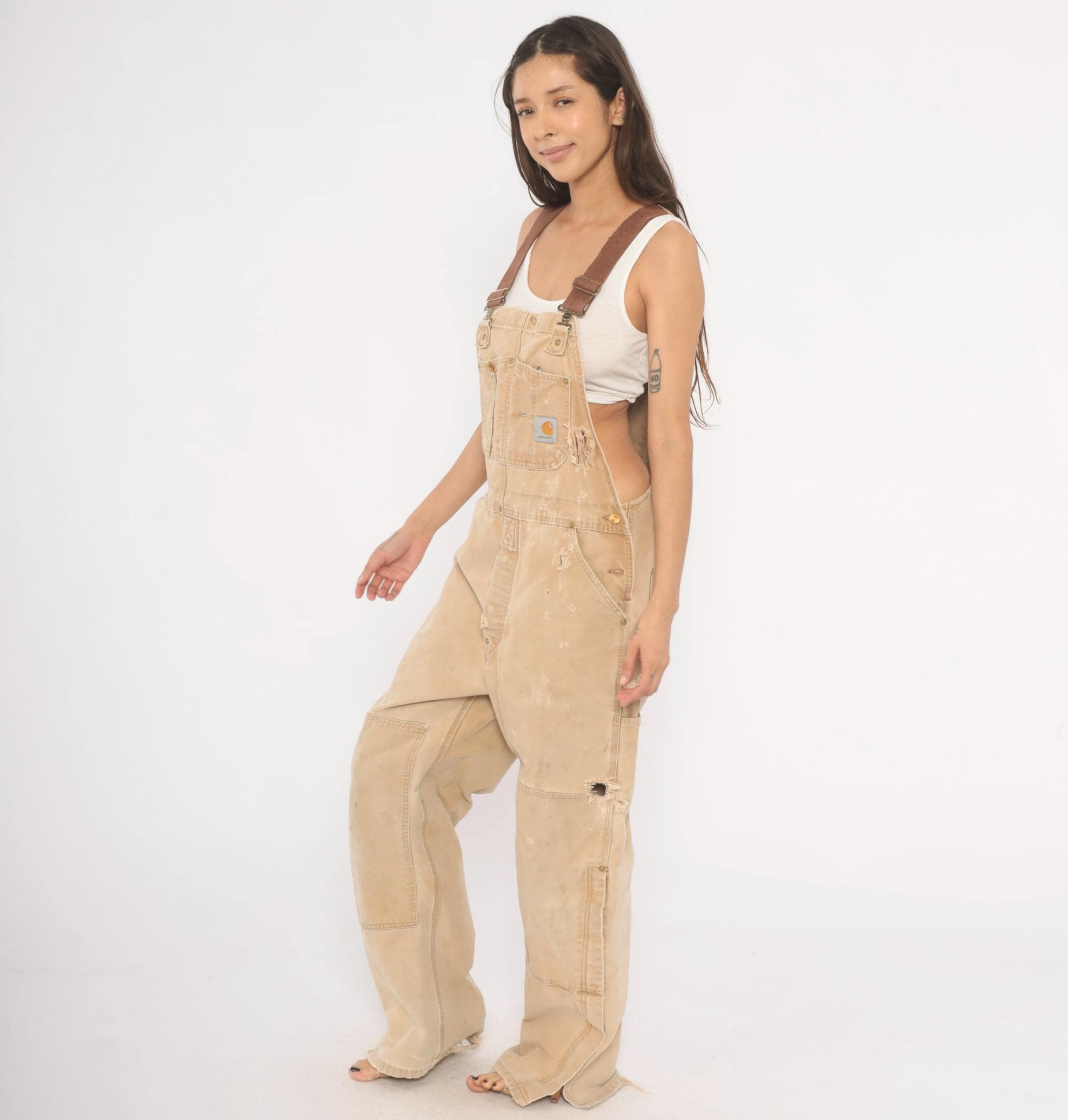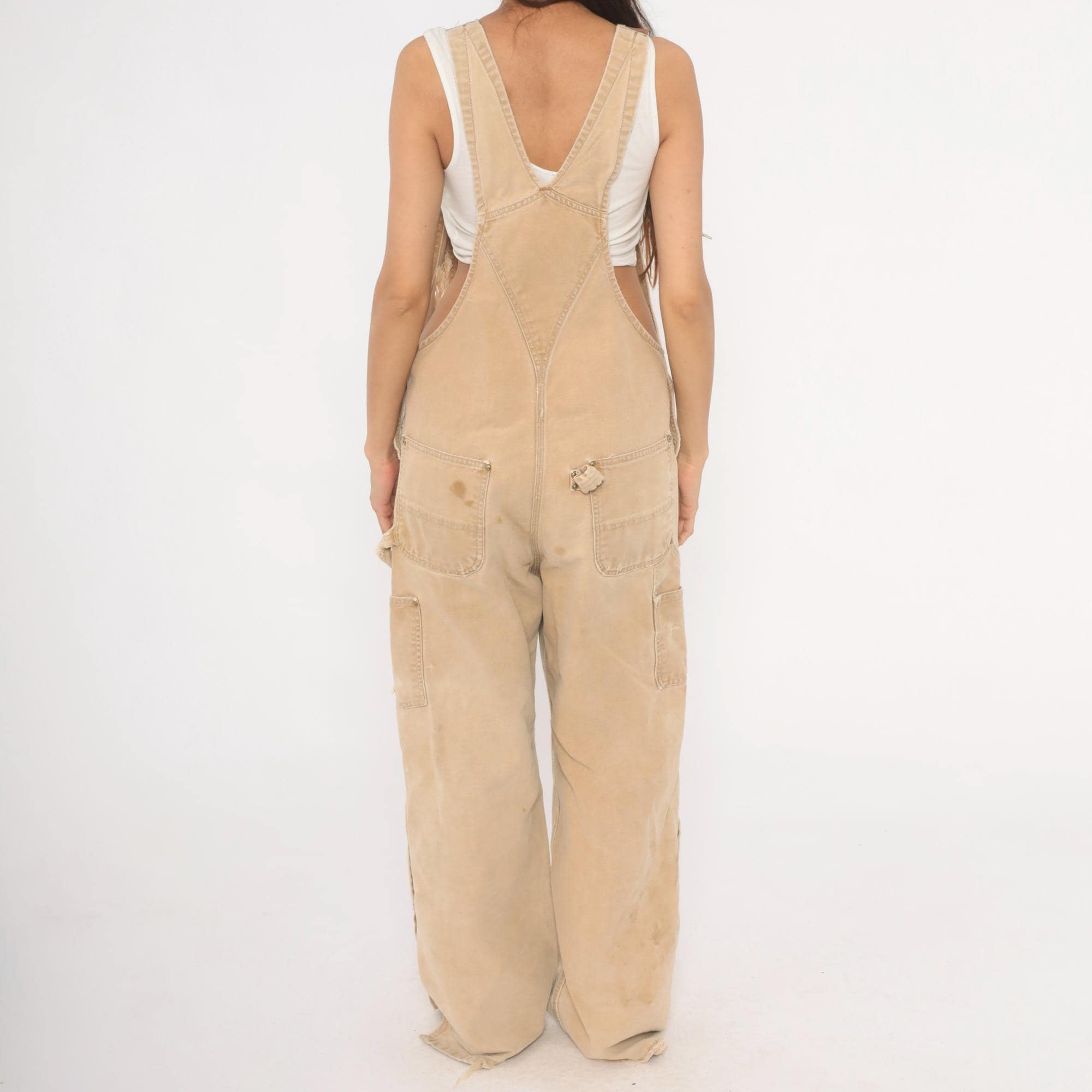 2000s Carhartt bib overalls in tan canvas with paint splatter and heavy distressing throughout. Adjustable brown webbing shoulder straps with brass hook closures, a bib chest pocket with Carhartt logo patch, and side snap buttons along the hip. Wide leg fit with reinforced double-knee panels, large cargo-style back pockets, and side seam pockets. Frayed hem at ankles from wear.