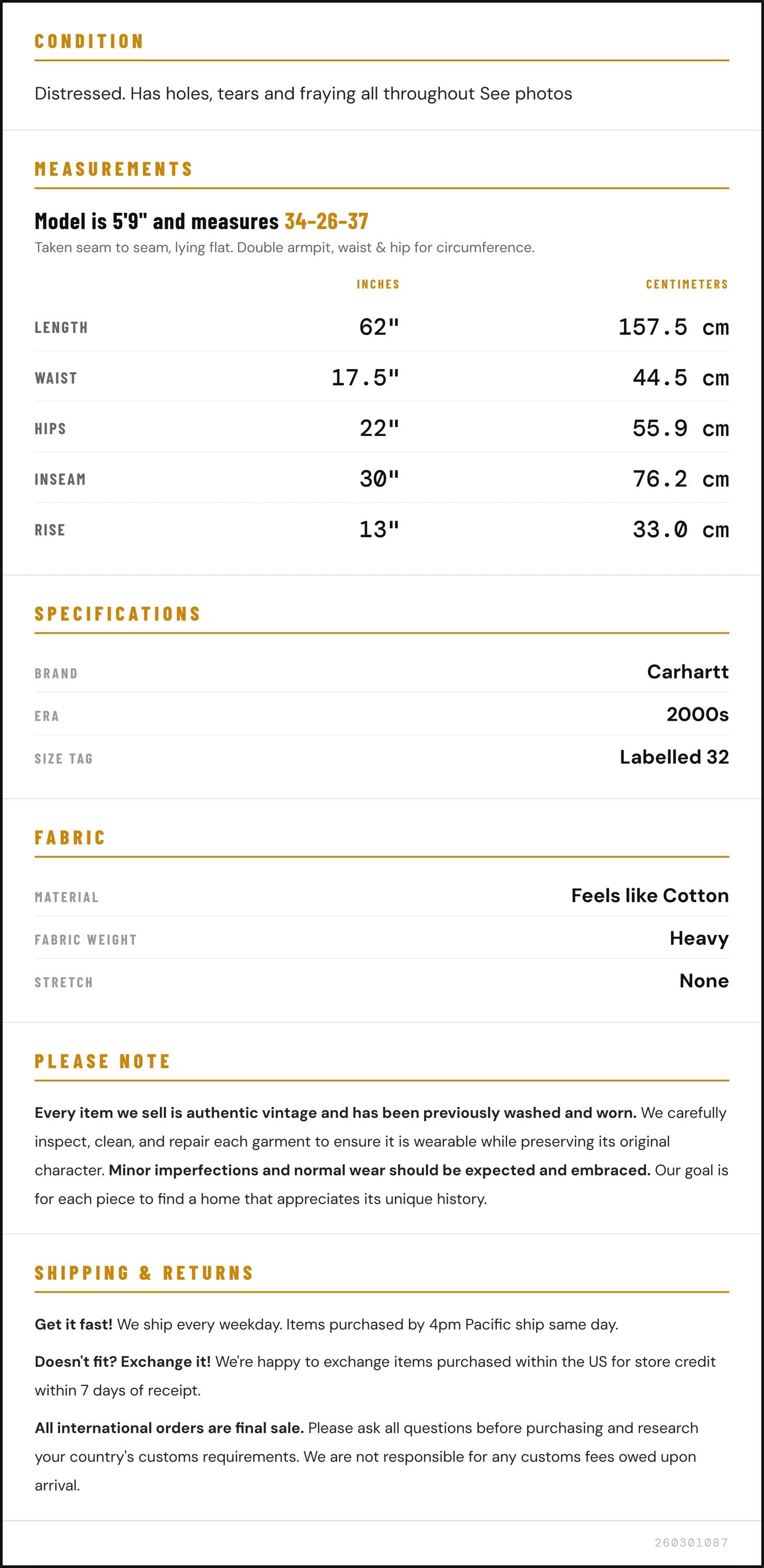 Vintage denim was usually made without any stretch, unlike modern jeans. Check the measurements to ensure proper fit, and remember to give yourself a little wiggle room in the waist and hips, depending on your preferred fit.
