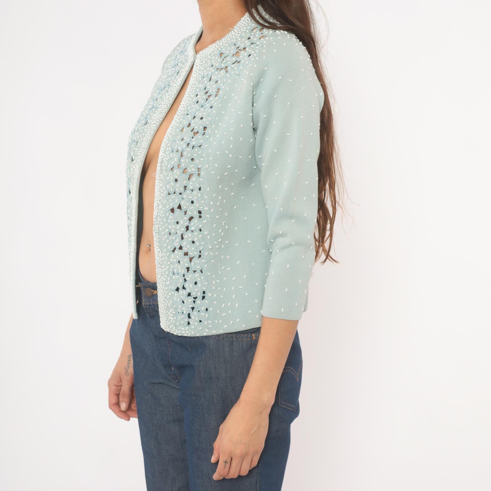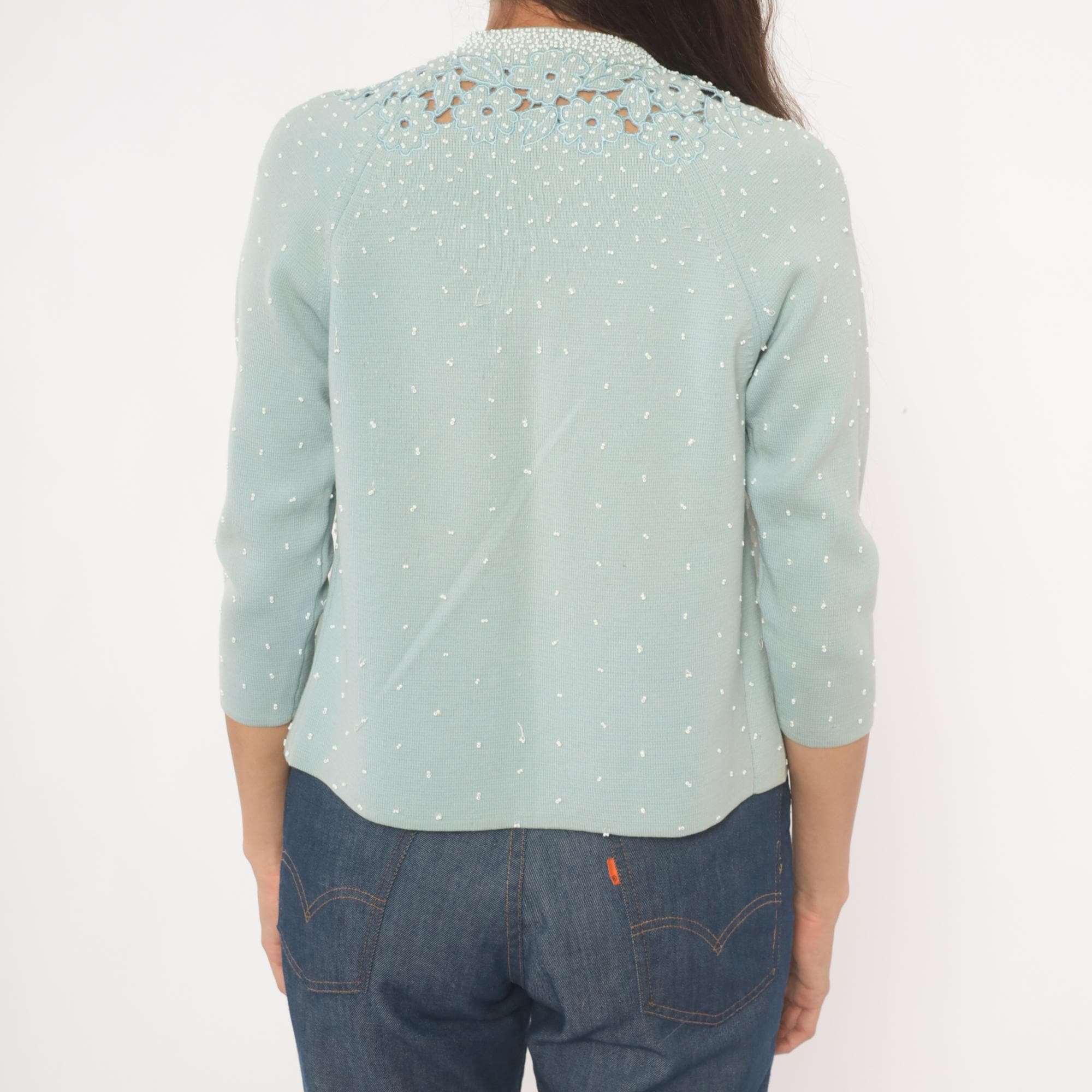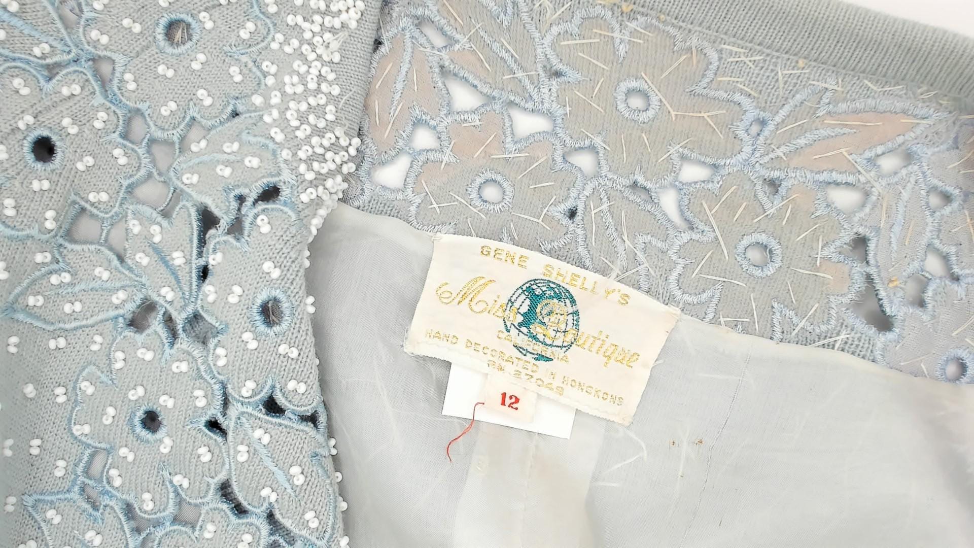 80s baby blue open-front cardigan from Miss Boutique with dense white seed bead embellishment across the front panels and scattered beading across the back and sleeves. Cutwork floral appliqué borders both front edges and wraps across the upper back yoke, with flower and leaf shapes in relief against the knit ground. Round neckline, three-quarter sleeves, and a fitted silhouette with hook and eye closure at the top.