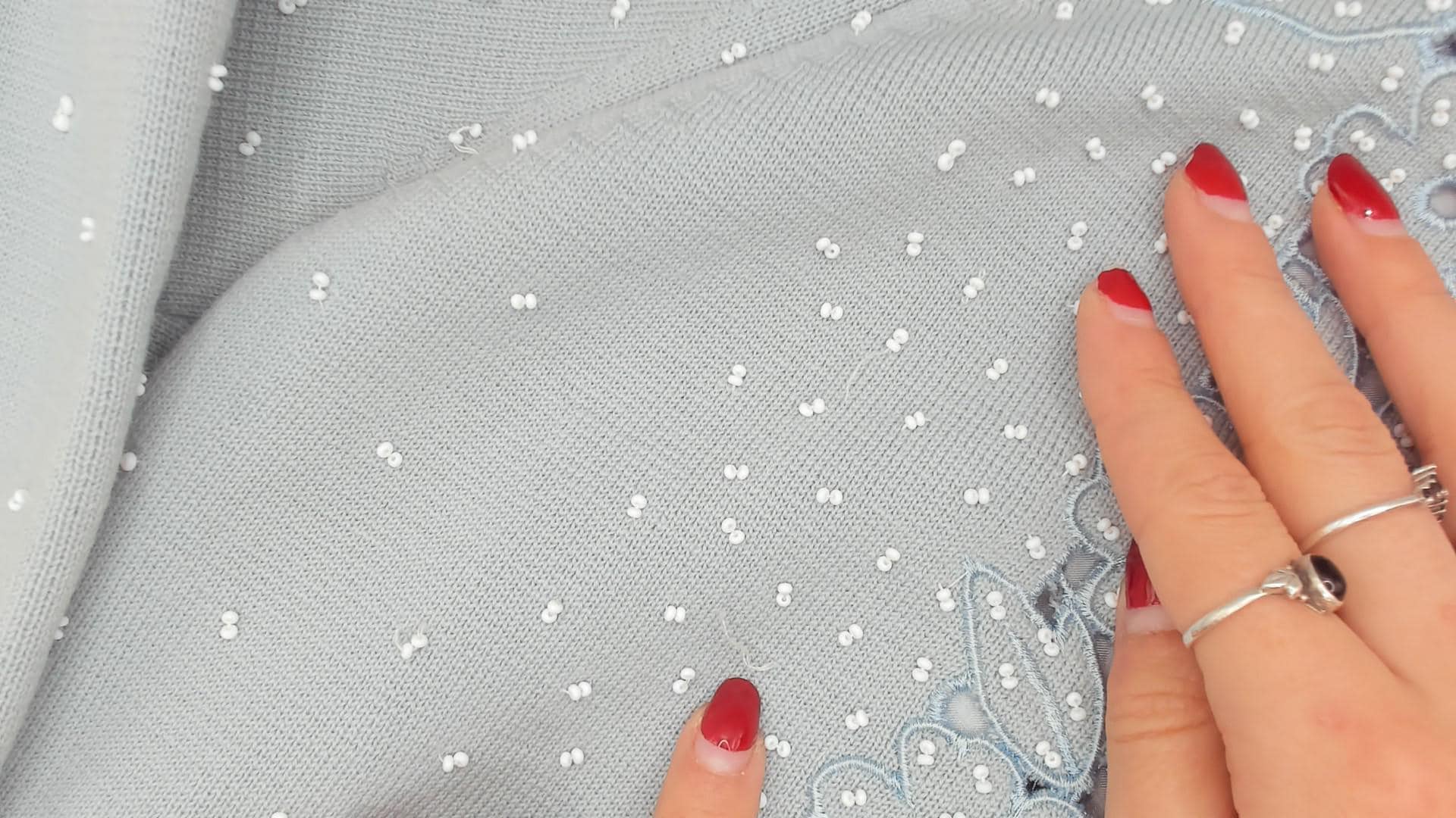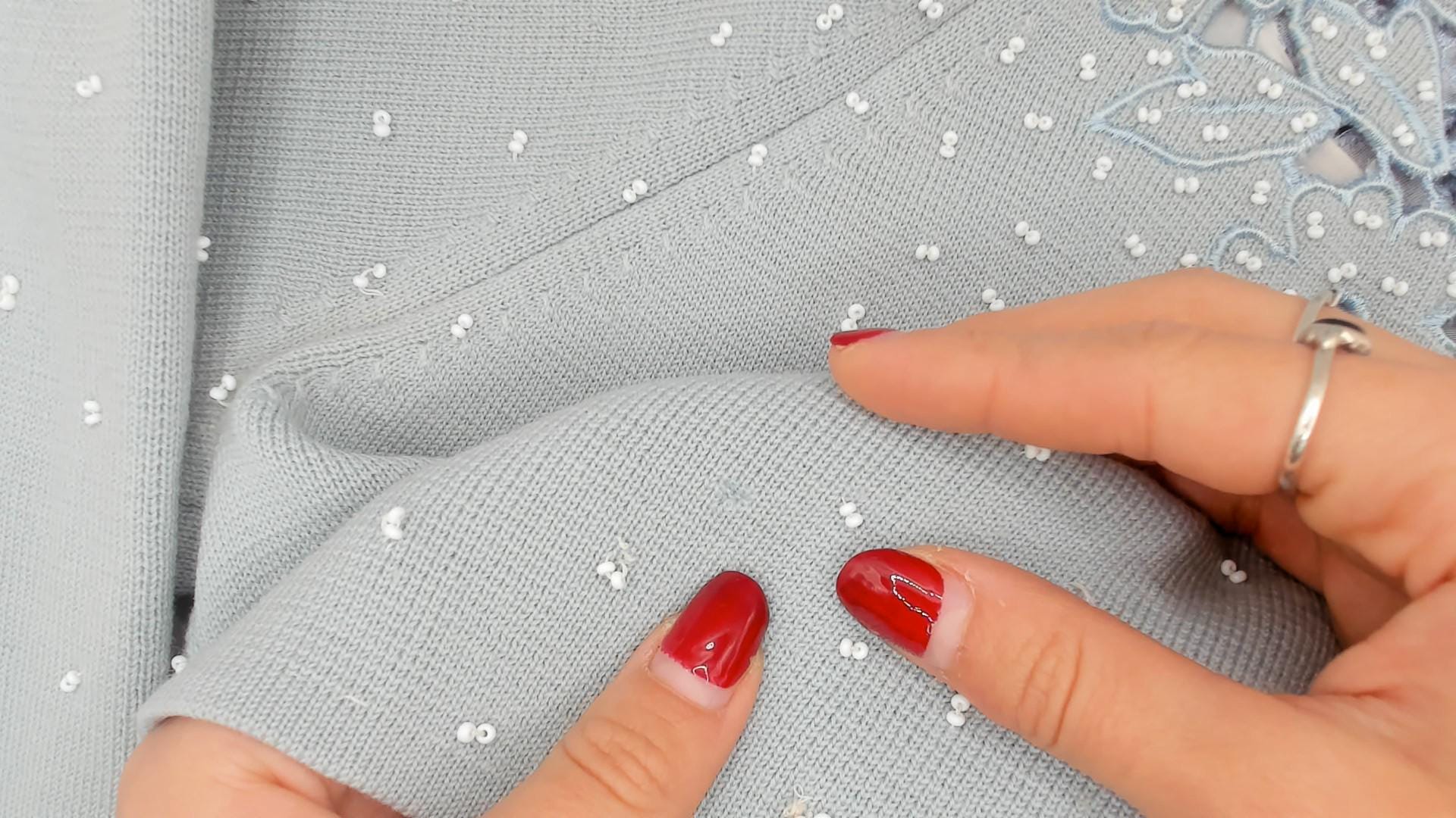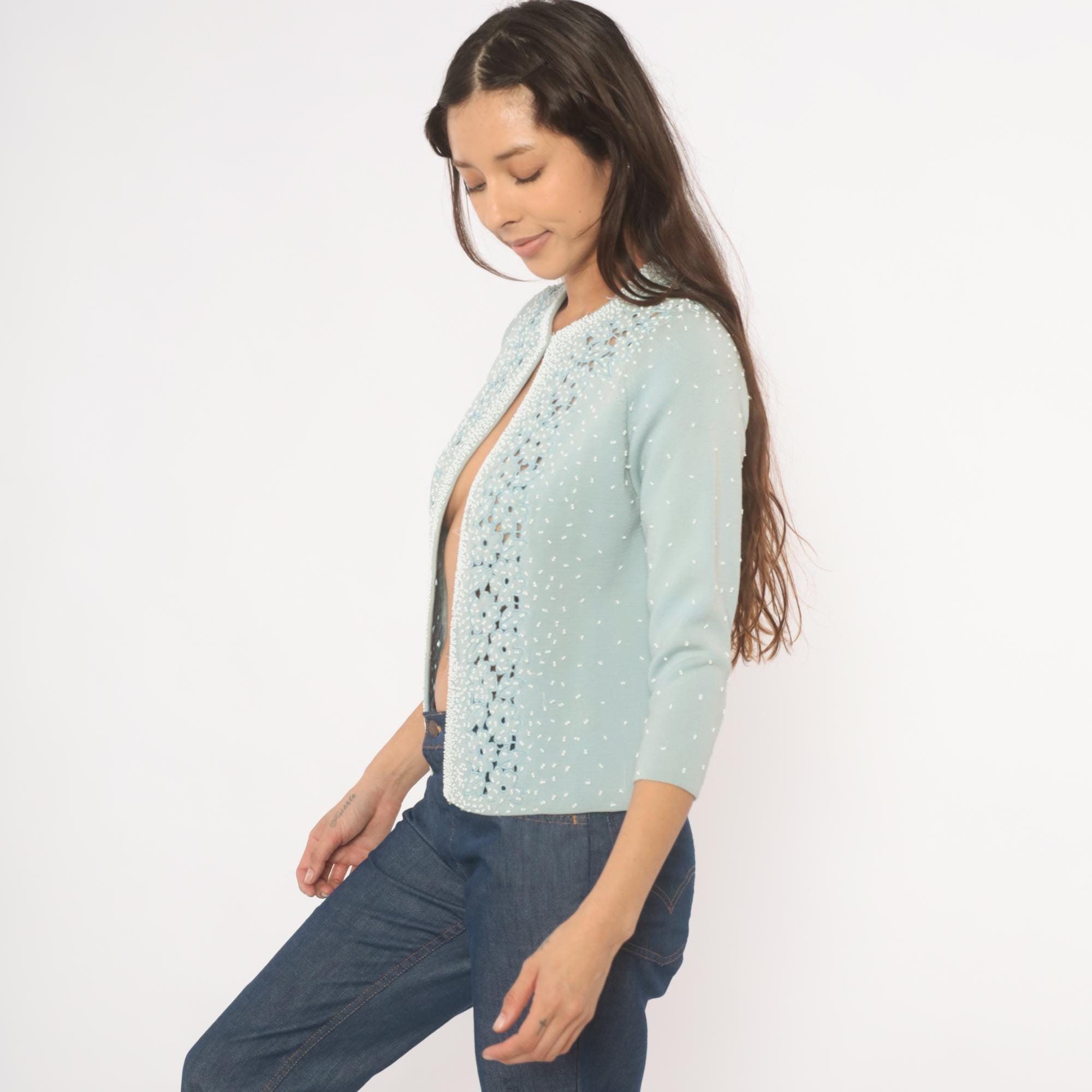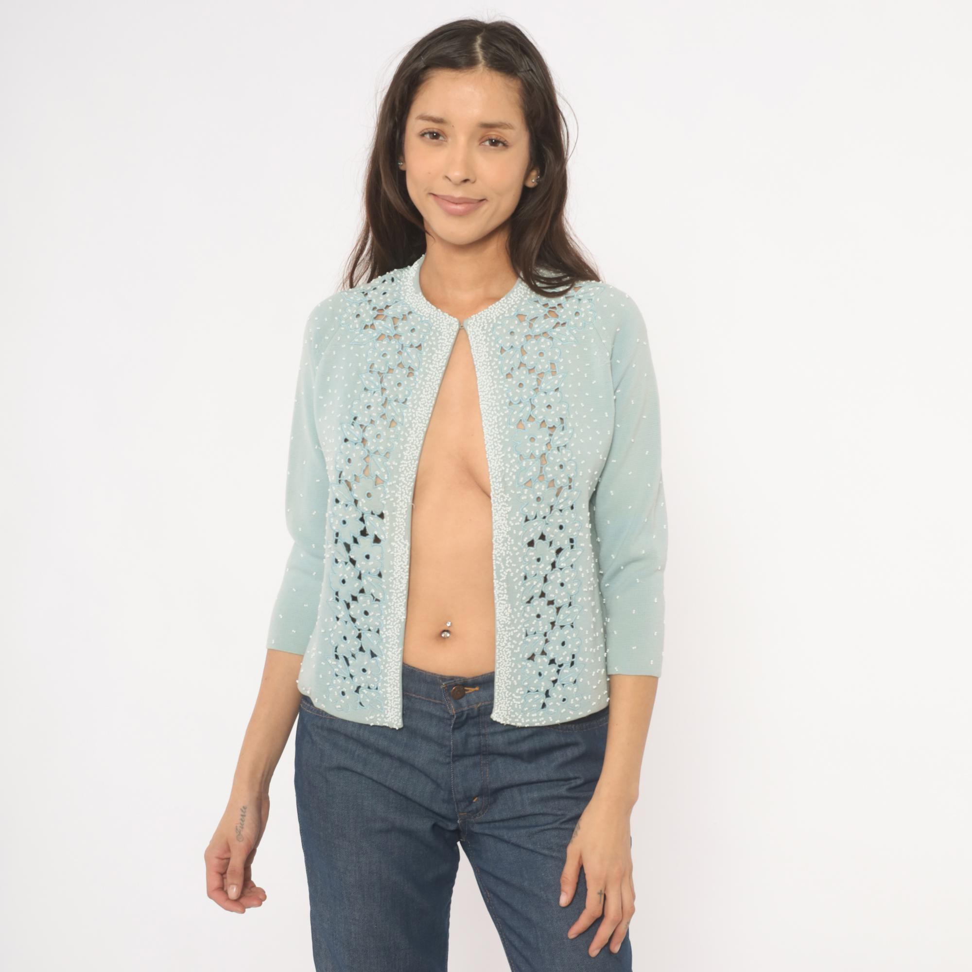 80s baby blue open-front cardigan from Miss Boutique with dense white seed bead embellishment across the front panels and scattered beading across the back and sleeves. Cutwork floral appliqué borders both front edges and wraps across the upper back yoke, with flower and leaf shapes in relief against the knit ground. Round neckline, three-quarter sleeves, and a fitted silhouette with hook and eye closure at the top.