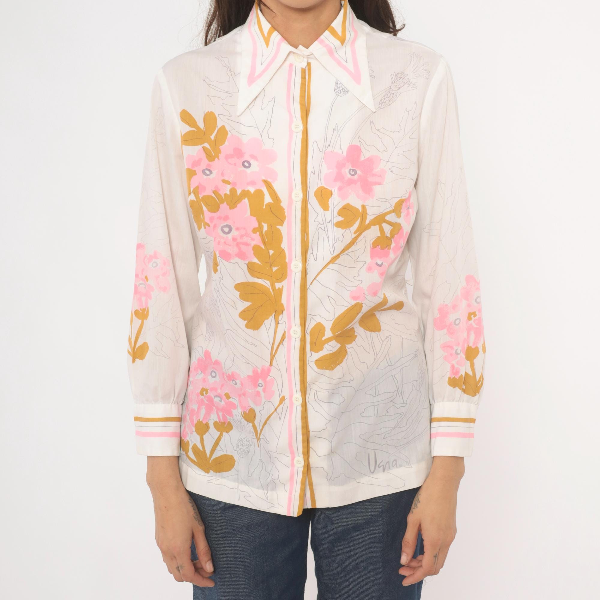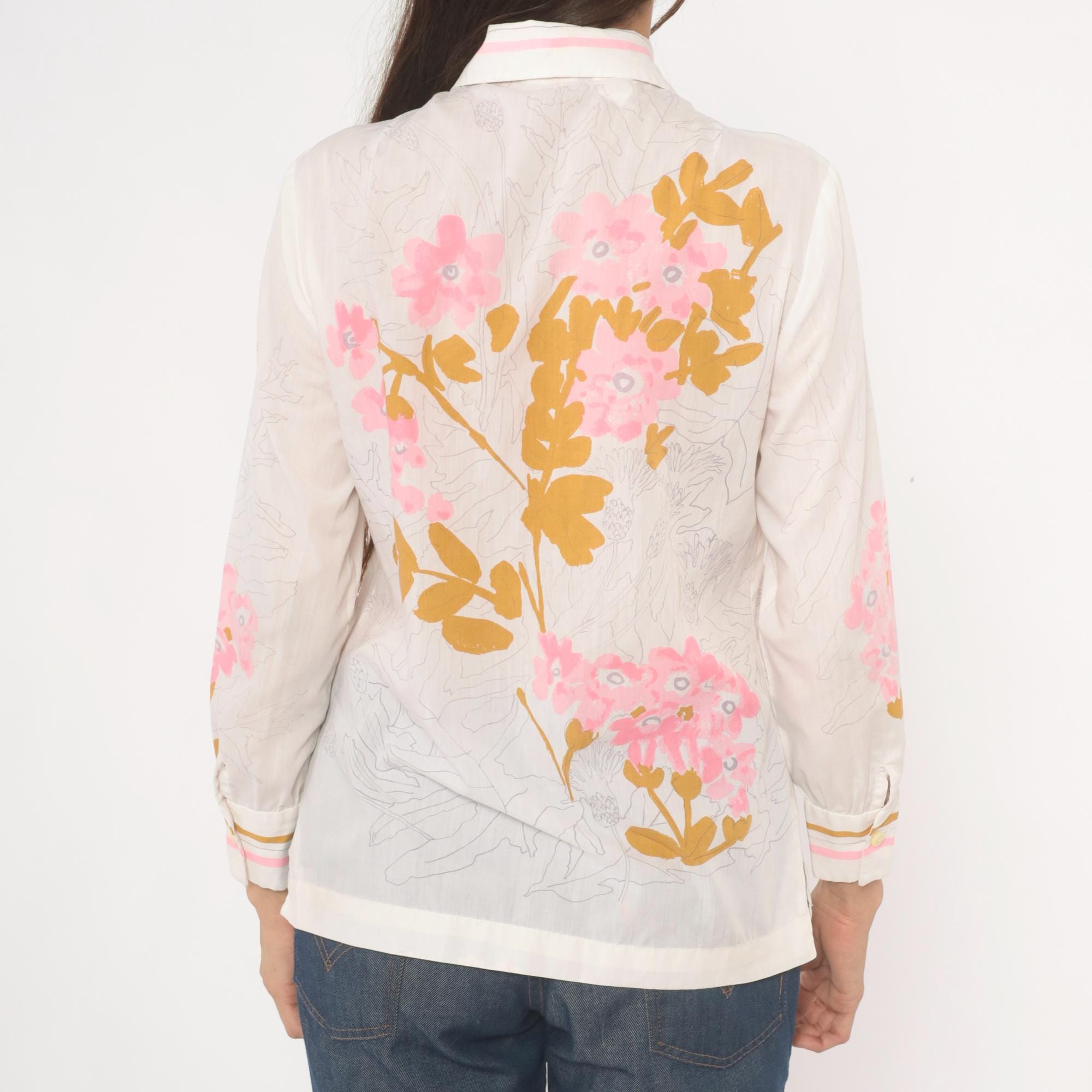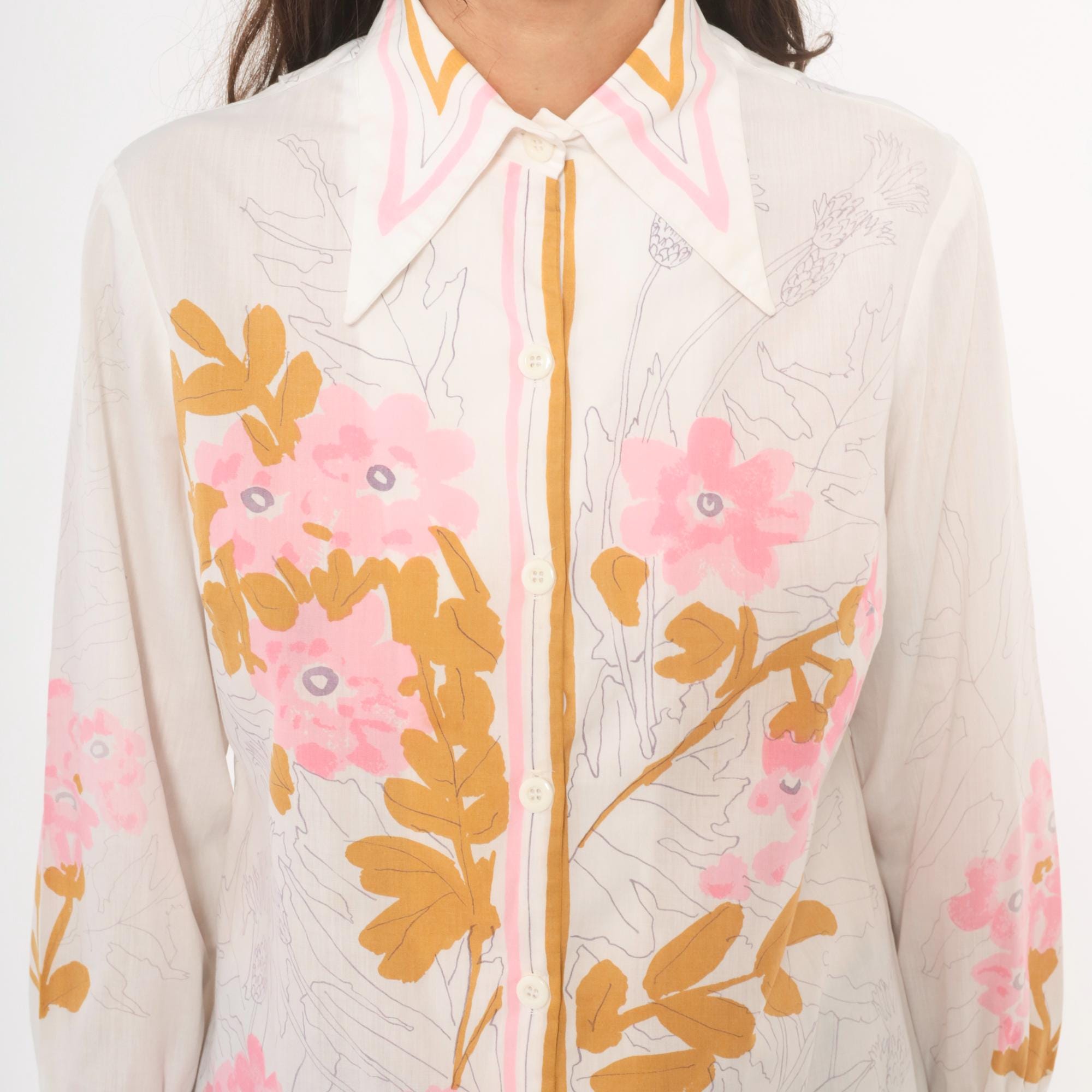 70s button-front blouse from Vera with a wide pointed collar trimmed in pink and gold stripe accents. Pink floral botanical print across the front, back, and sleeves, with golden brown leaf shapes and pencil-sketch botanical line drawings throughout the fabric. Long sleeves with striped cuffs in white, pink, and gold, and pearl-tone buttons down the center front placket.