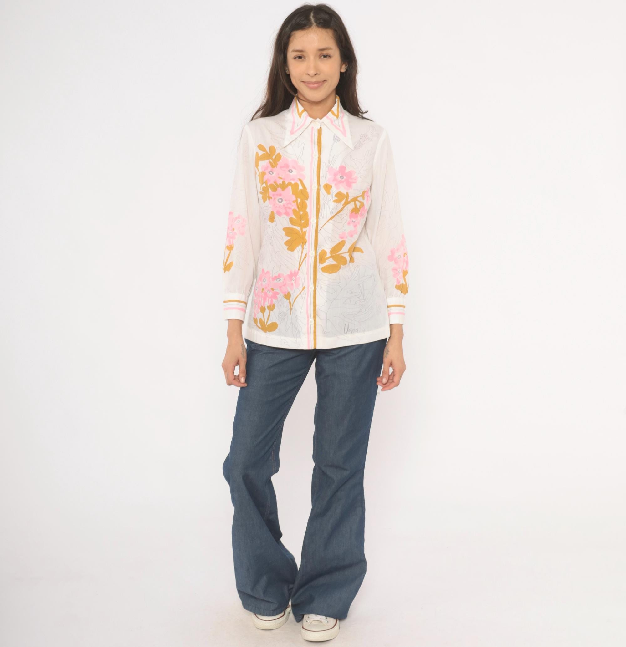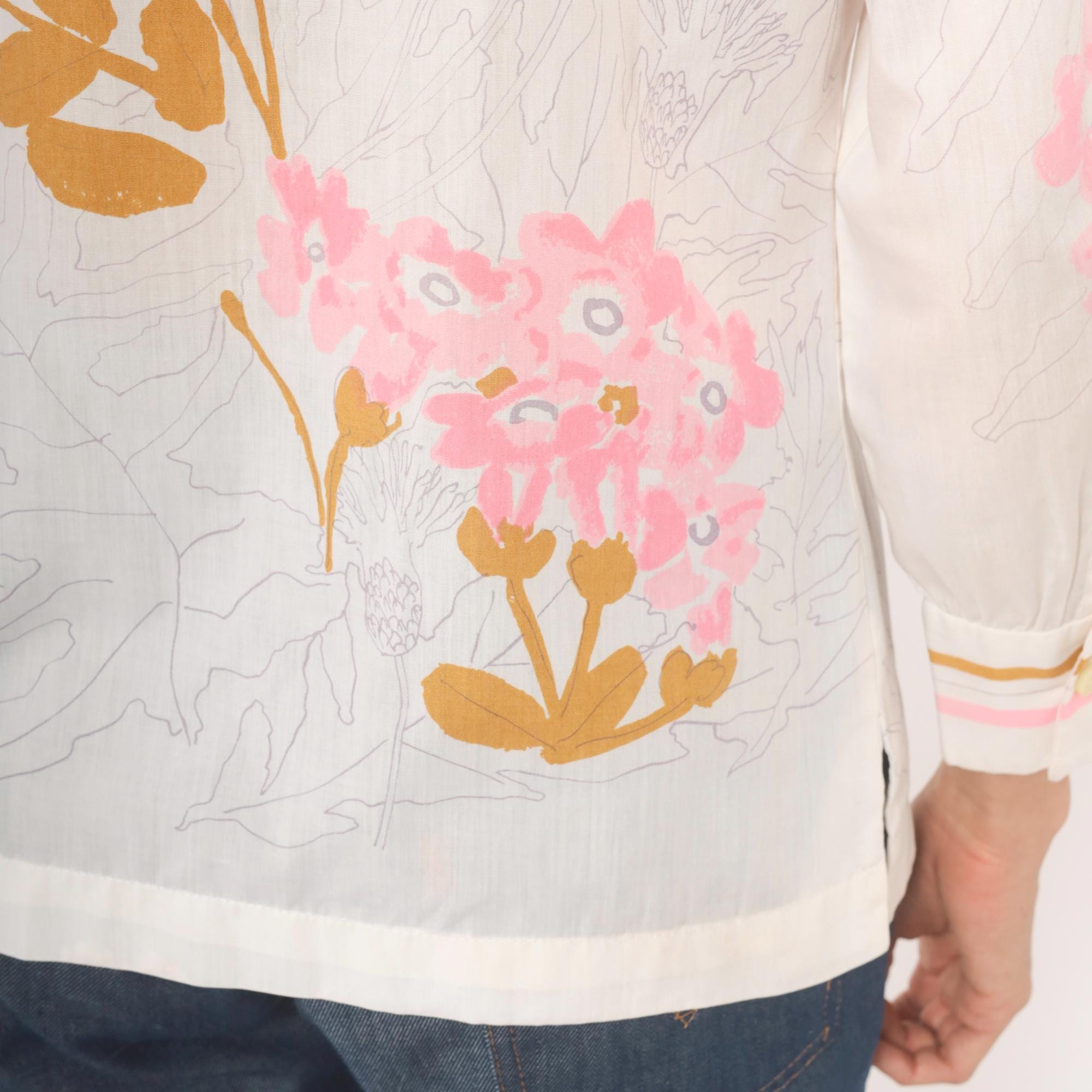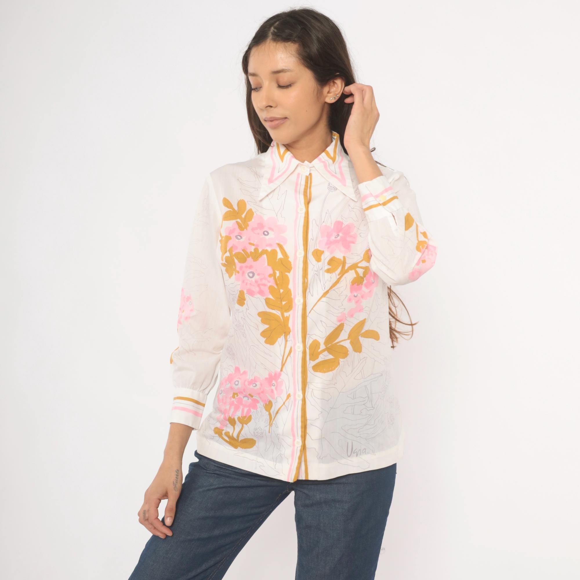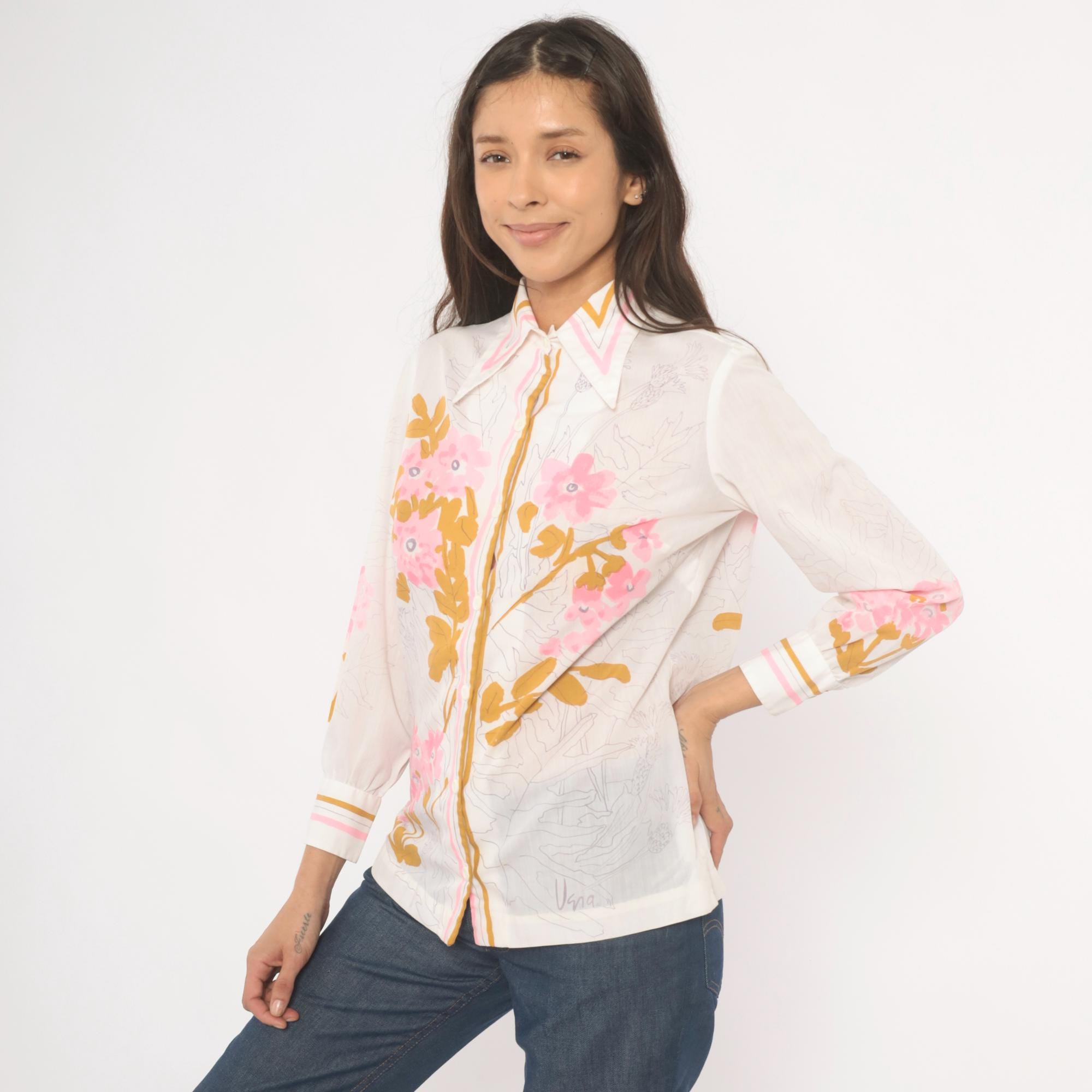 70s button-front blouse from Vera with a wide pointed collar trimmed in pink and gold stripe accents. Pink floral botanical print across the front, back, and sleeves, with golden brown leaf shapes and pencil-sketch botanical line drawings throughout the fabric. Long sleeves with striped cuffs in white, pink, and gold, and pearl-tone buttons down the center front placket.