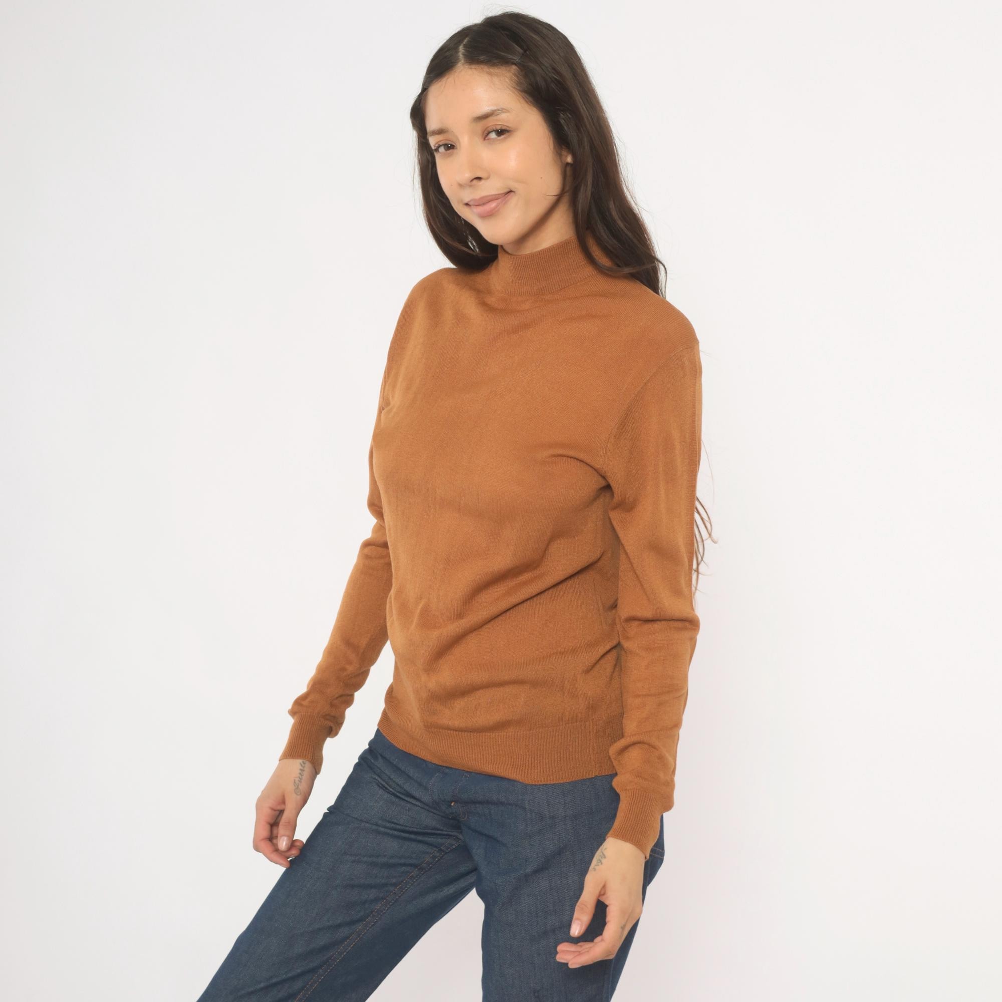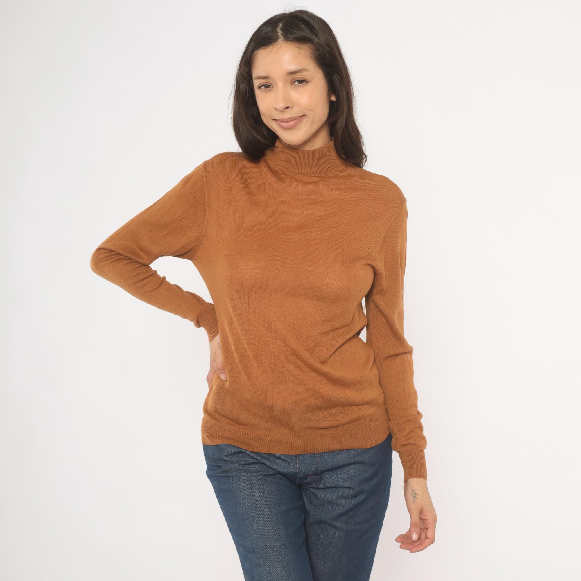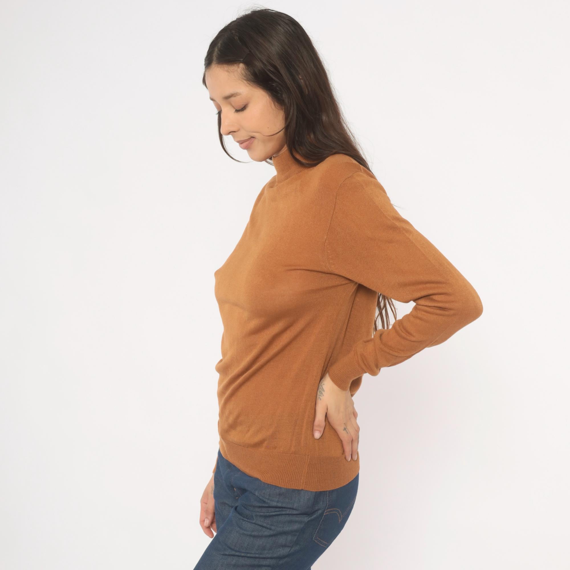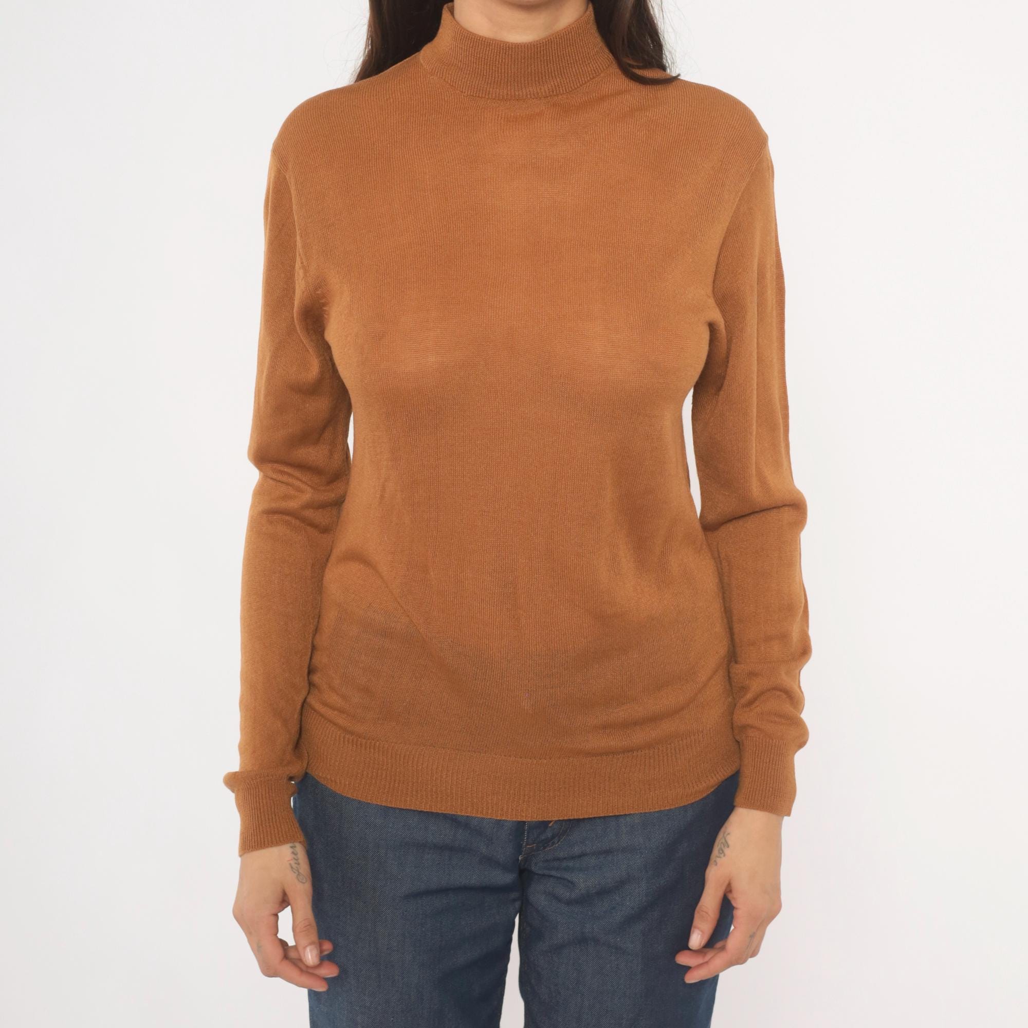Camel-toned mock neck pullover from Ving, circa 2000s, with a slim, fitted silhouette and long sleeves with ribbed cuffs. Ribbed banding at the collar hem and waistband, semi-sheer knit construction throughout. Tan and brown tones read warm oatmeal in natural light.