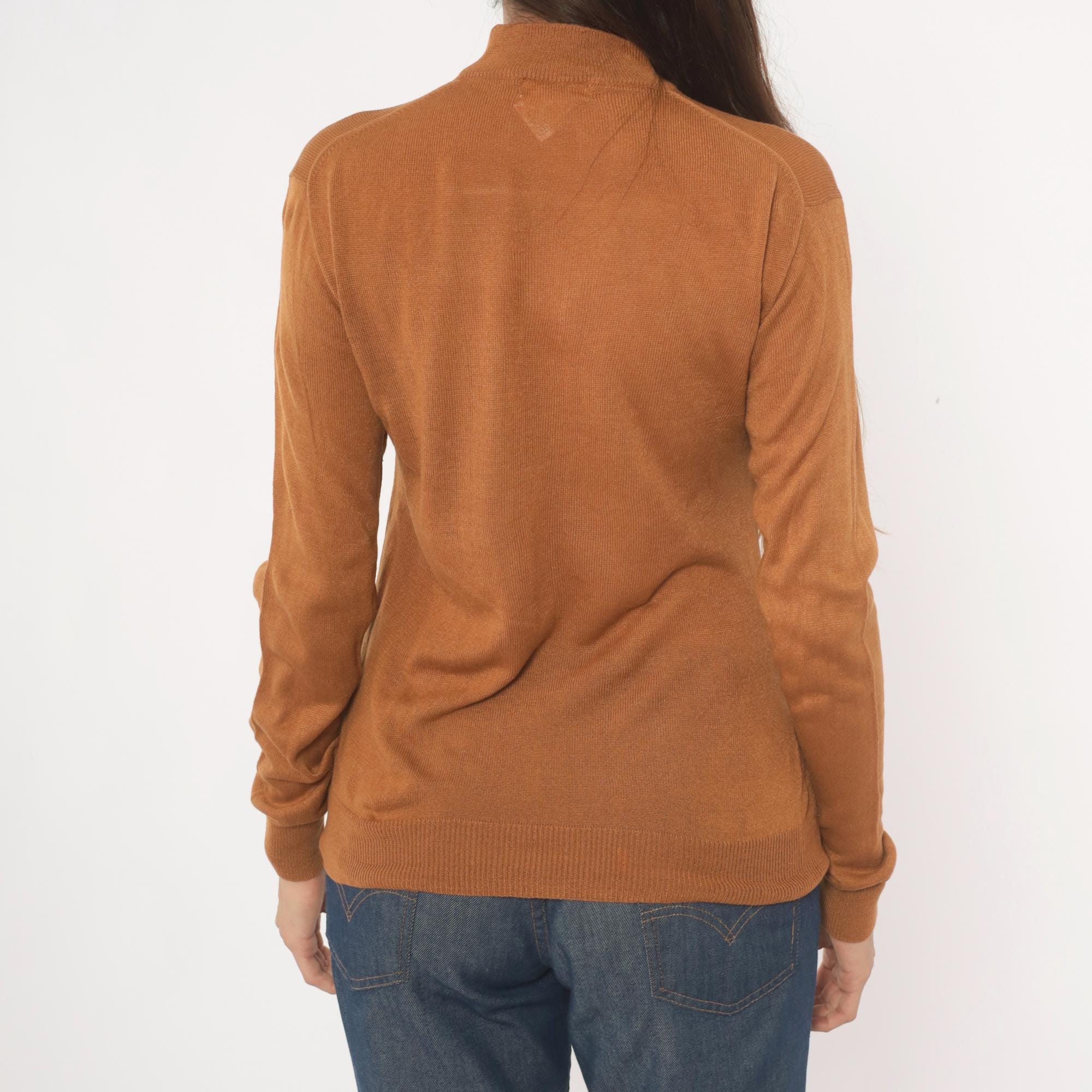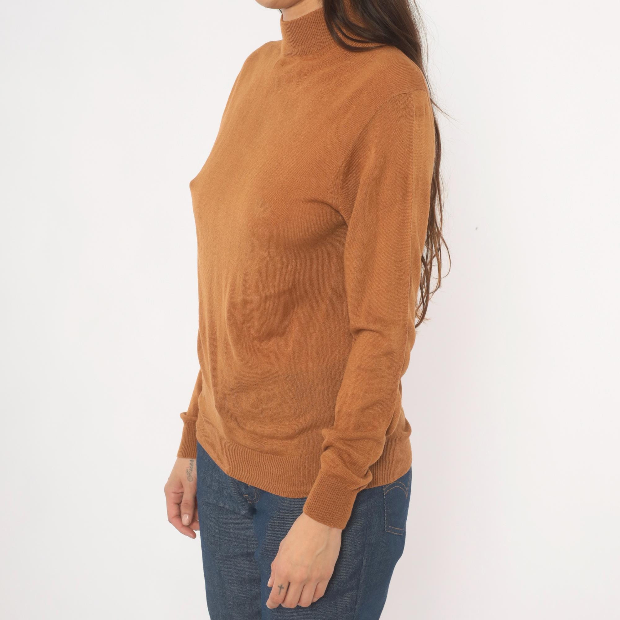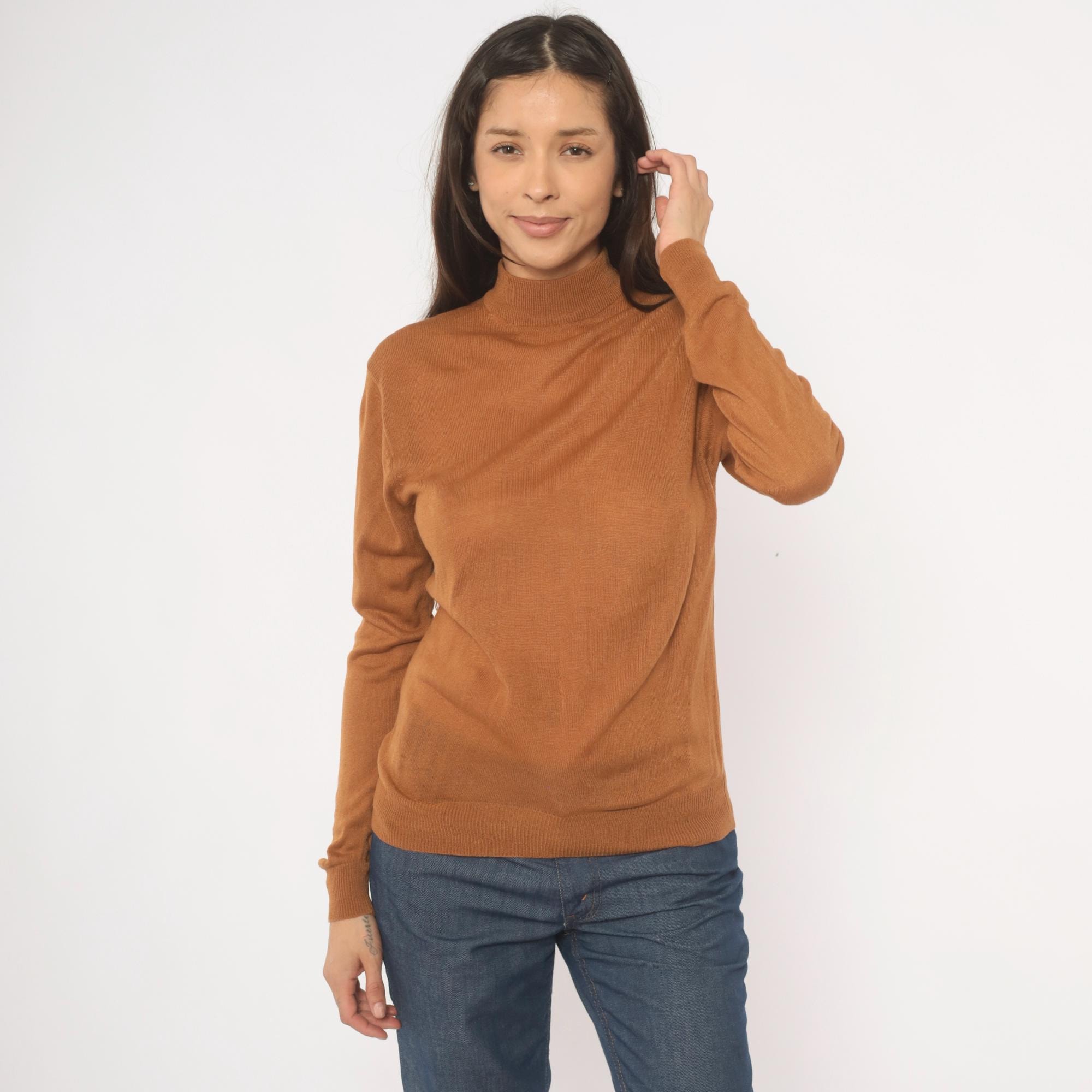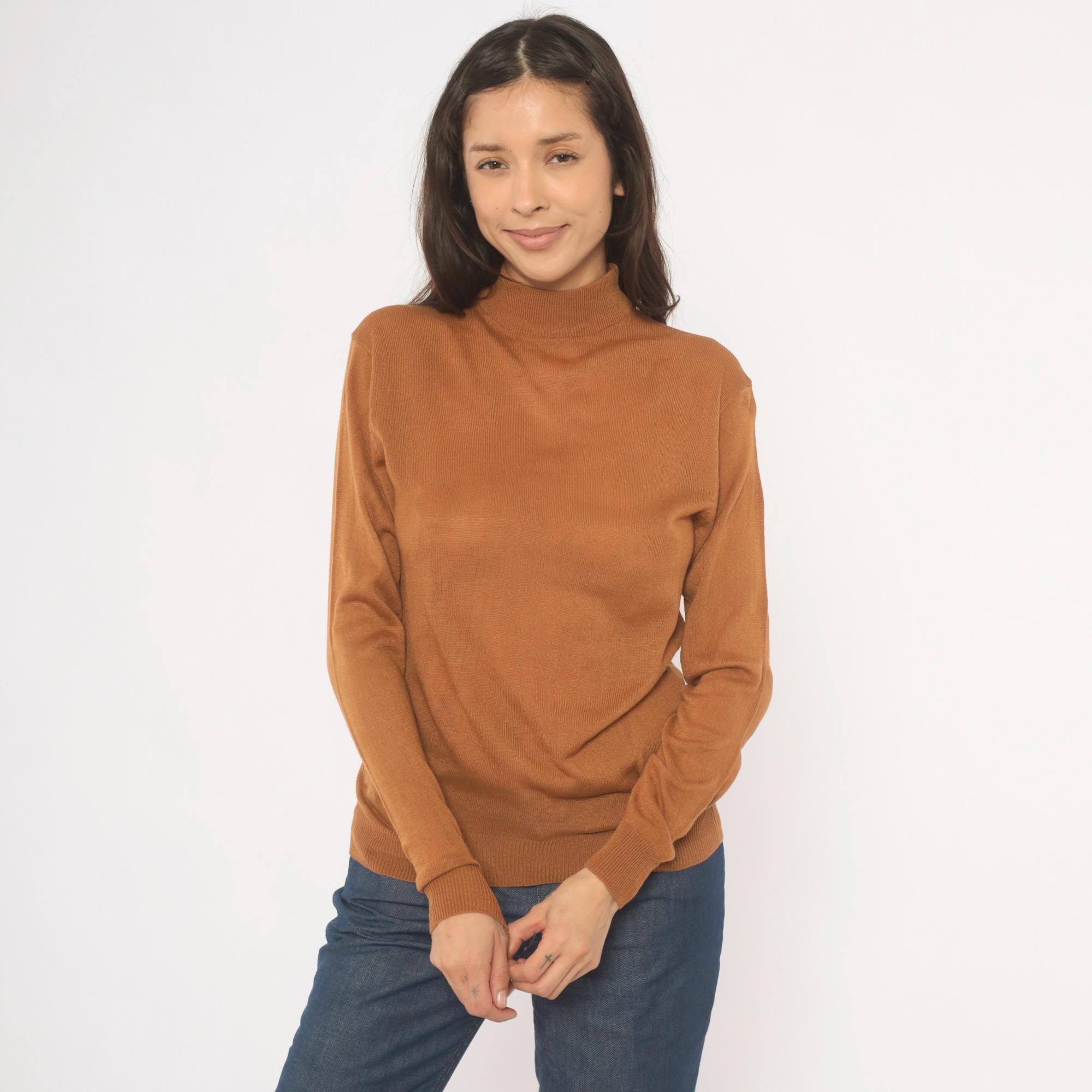 Camel-toned mock neck pullover from Ving, circa 2000s, with a slim, fitted silhouette and long sleeves with ribbed cuffs. Ribbed banding at the collar hem and waistband, semi-sheer knit construction throughout. Tan and brown tones read warm oatmeal in natural light.