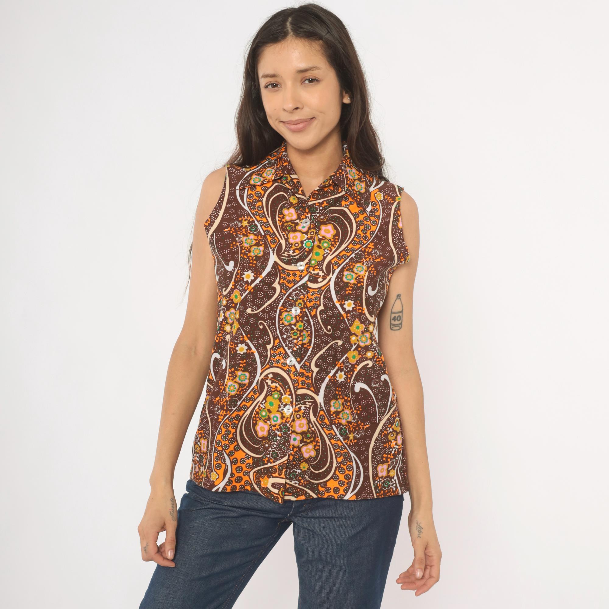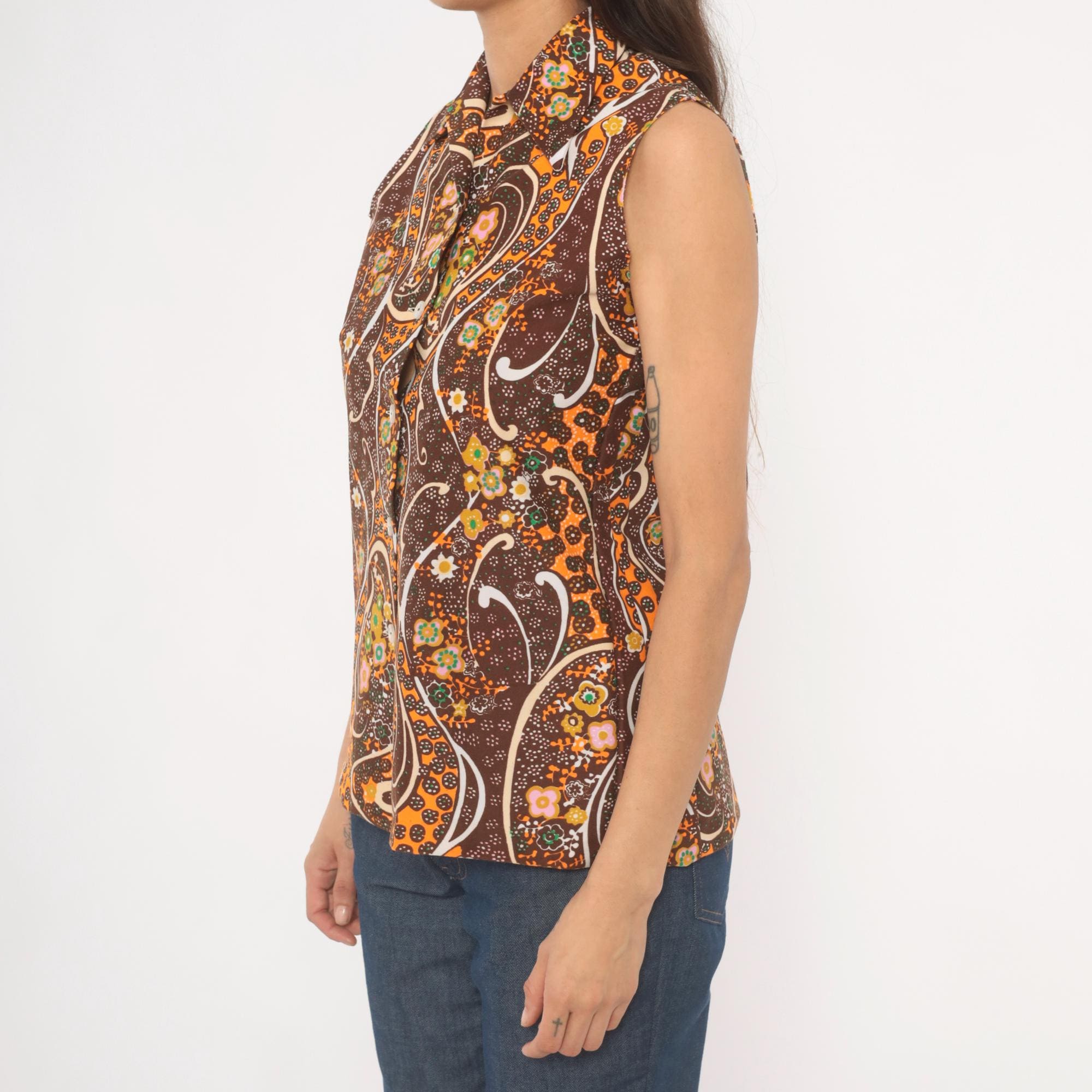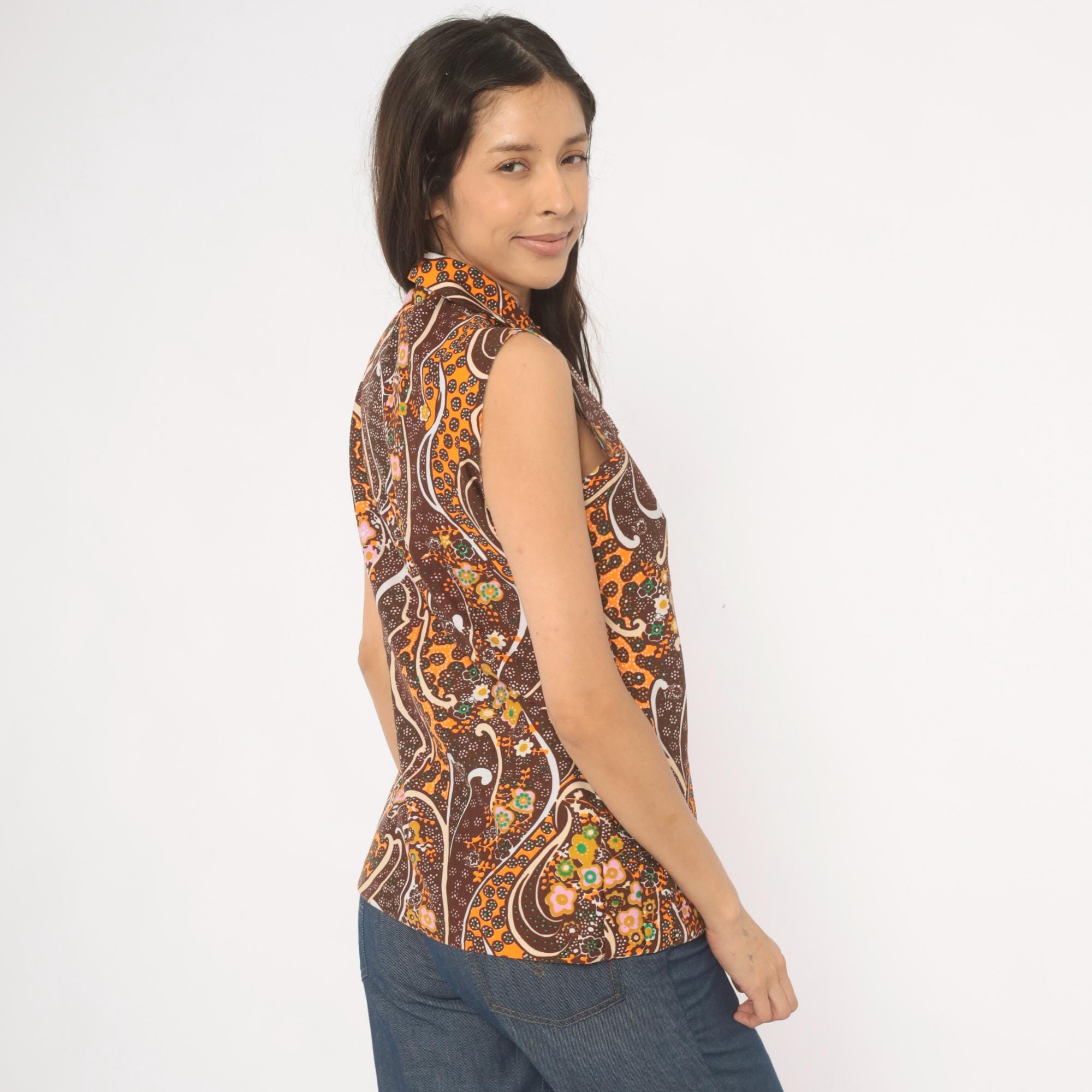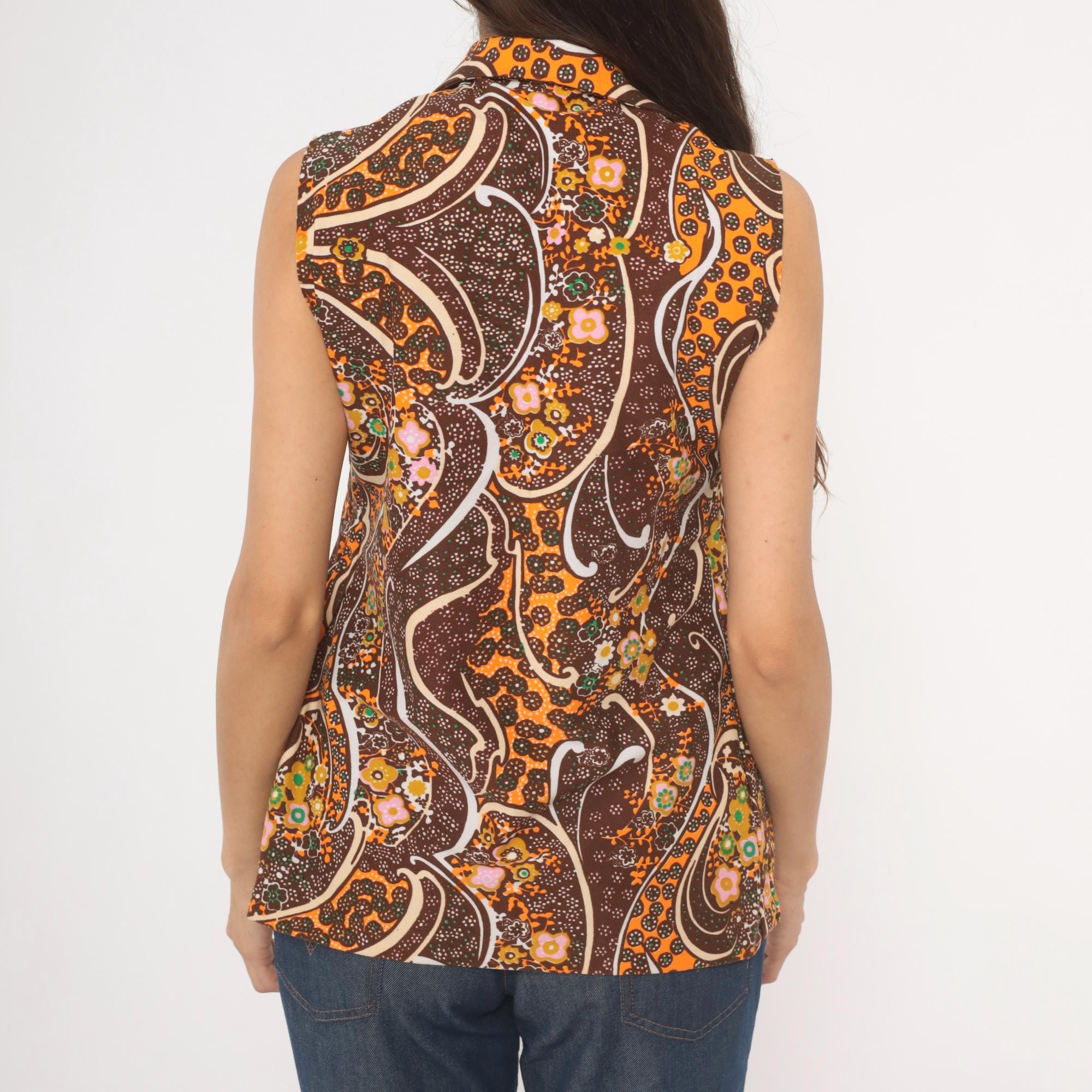 70s brown and orange psychedelic paisley print sleeveless blouse with a pointed spread collar and front button closure. Swirling abstract pattern across the fabric in chocolate, burnt orange, pink, green, gold, and cream.