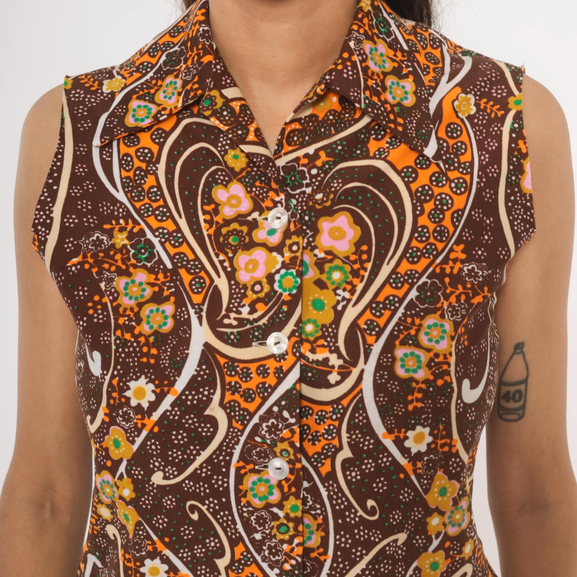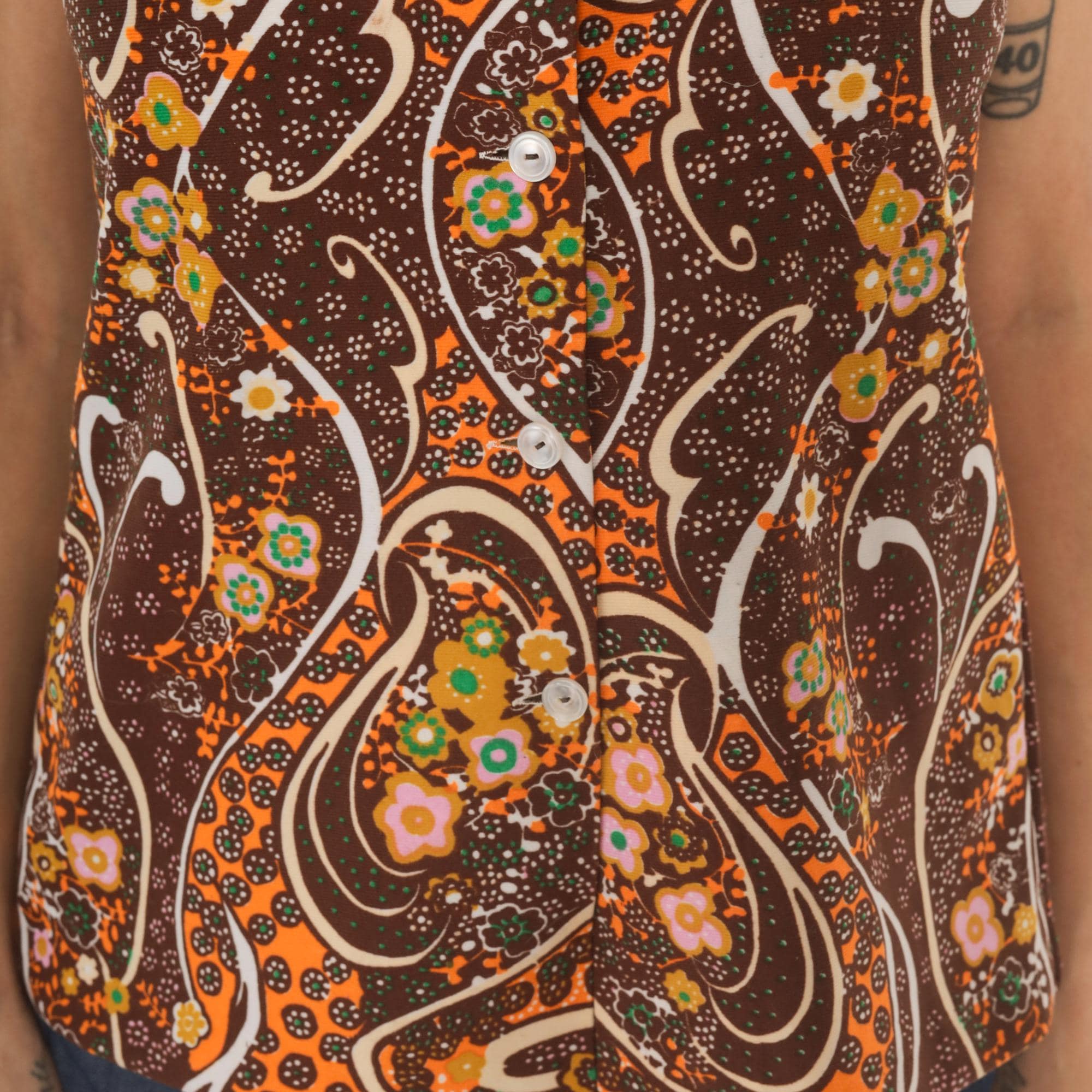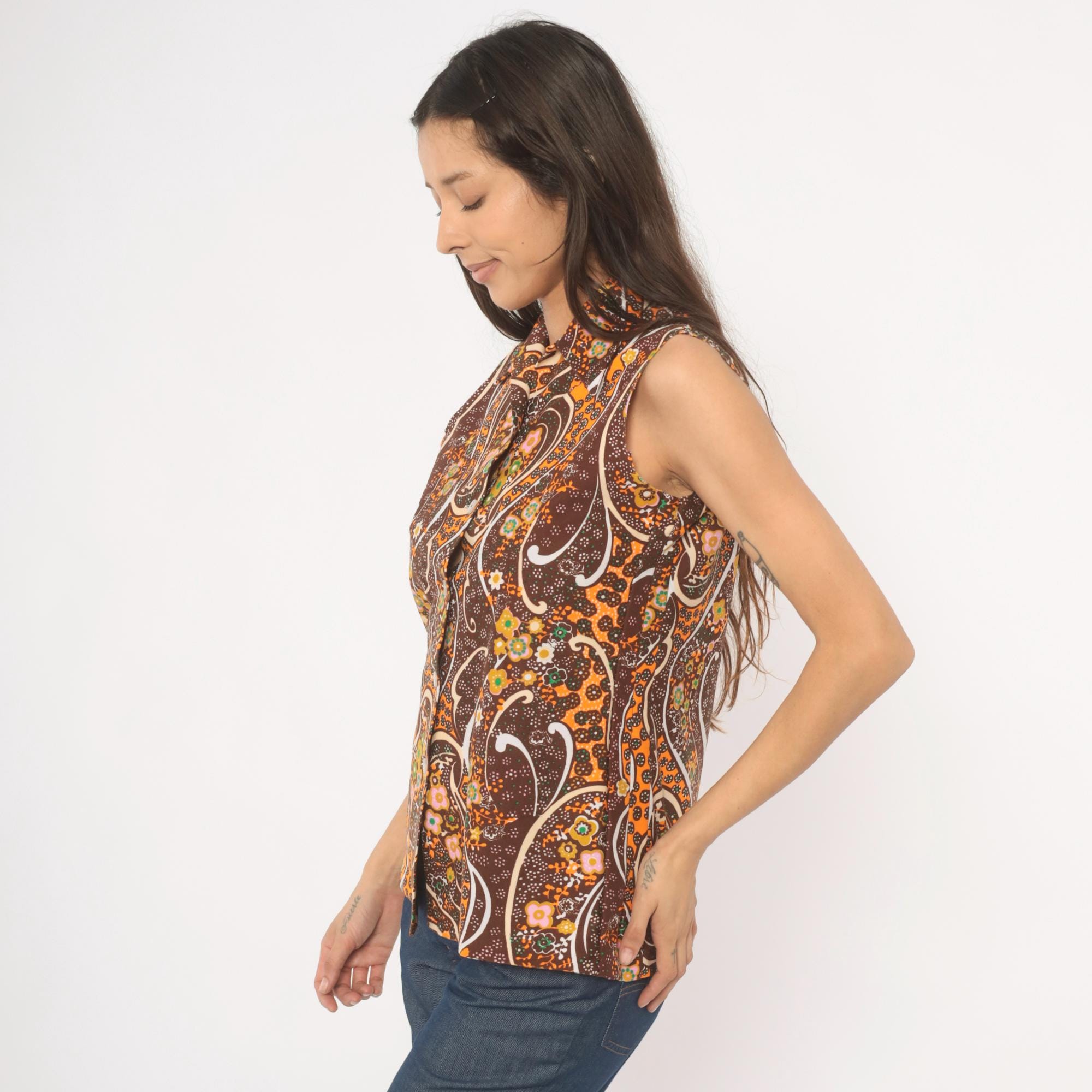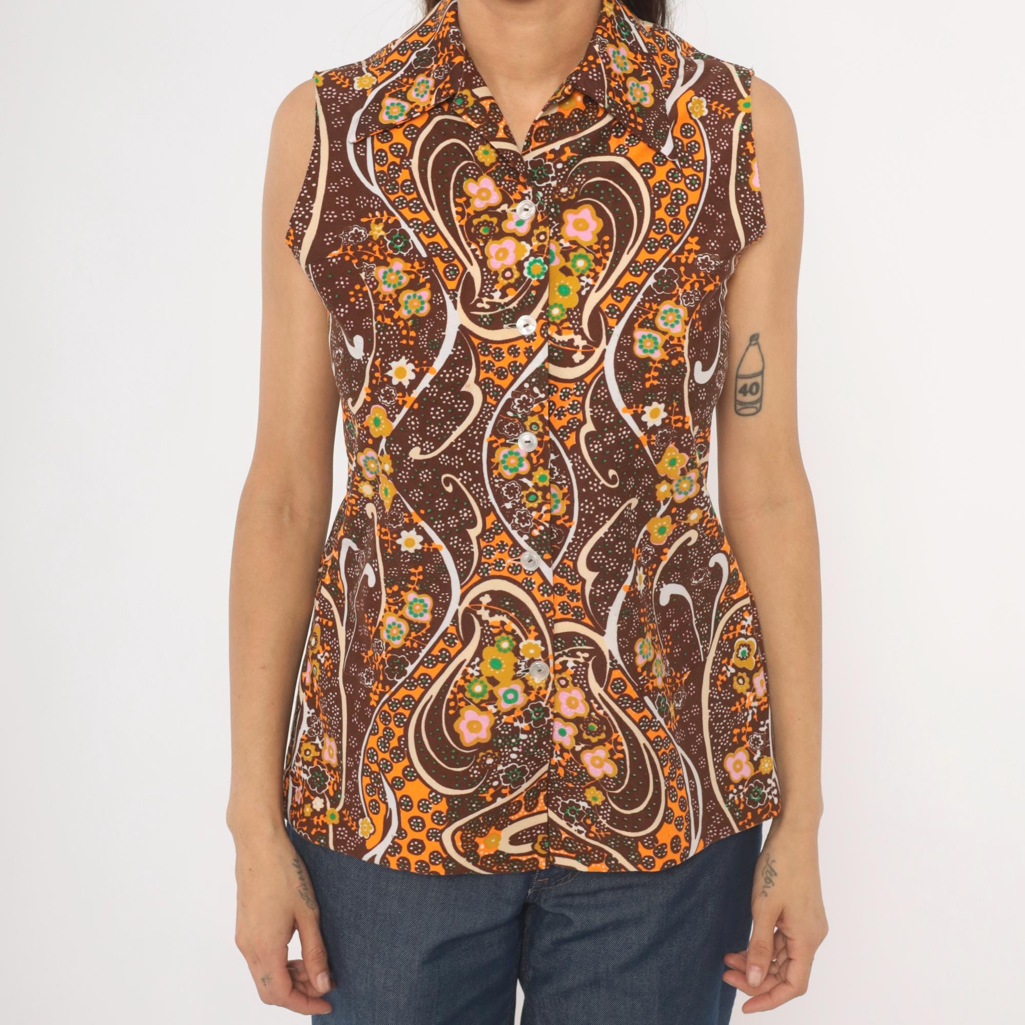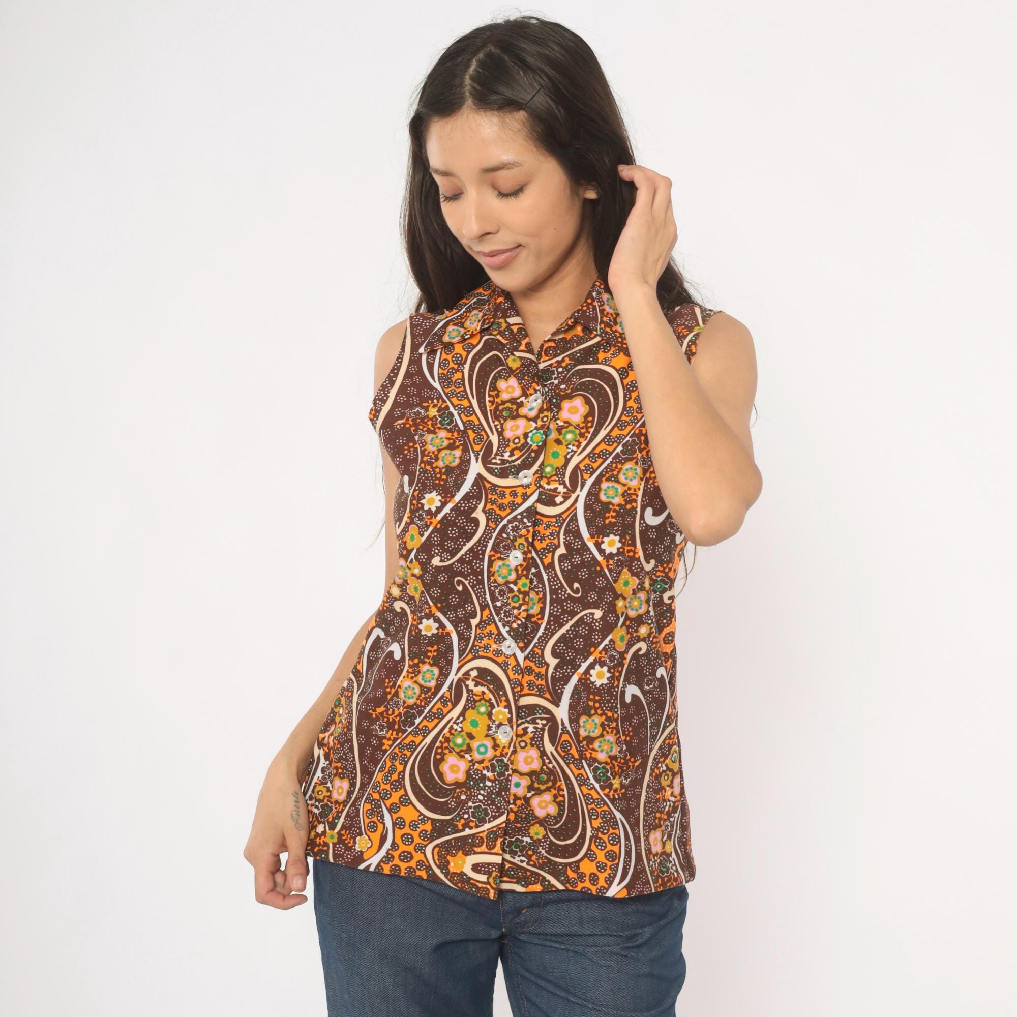 70s brown and orange psychedelic paisley print sleeveless blouse with a pointed spread collar and front button closure. Swirling abstract pattern across the fabric in chocolate, burnt orange, pink, green, gold, and cream.