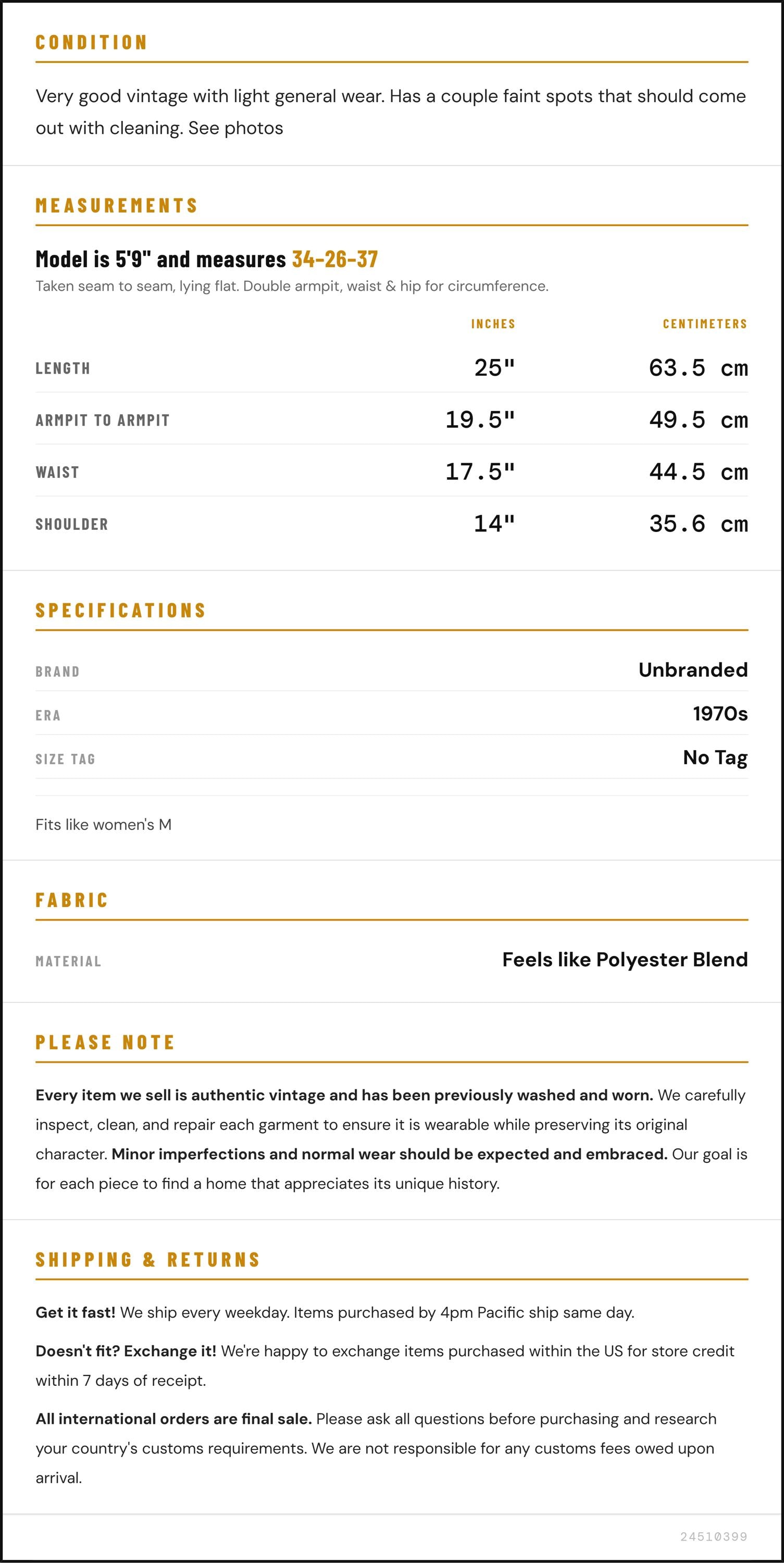 Measurements are taken laying flat and should be doubled where applicable. The "best fits" size is just an estimate, and vintage sizing can vary from modern sizing. Please use measurements to ensure proper fit. The best thing to do is measure a similar item of your own, and compare. When an item has stretch, we will list the unstretched dimensions with the stretched measurement afterwards.