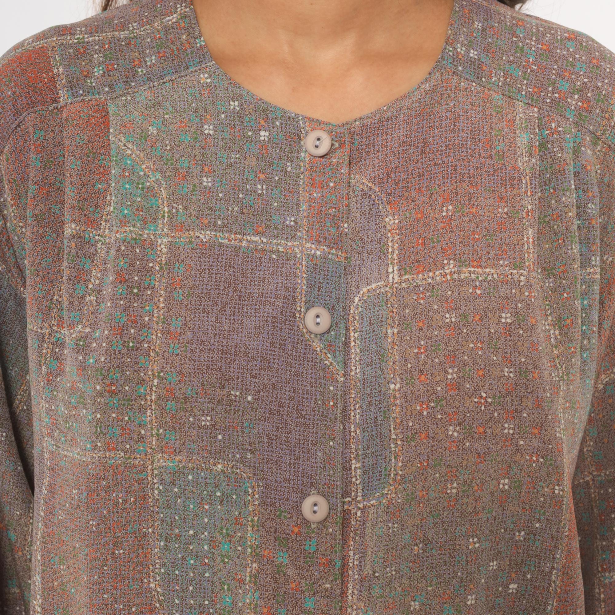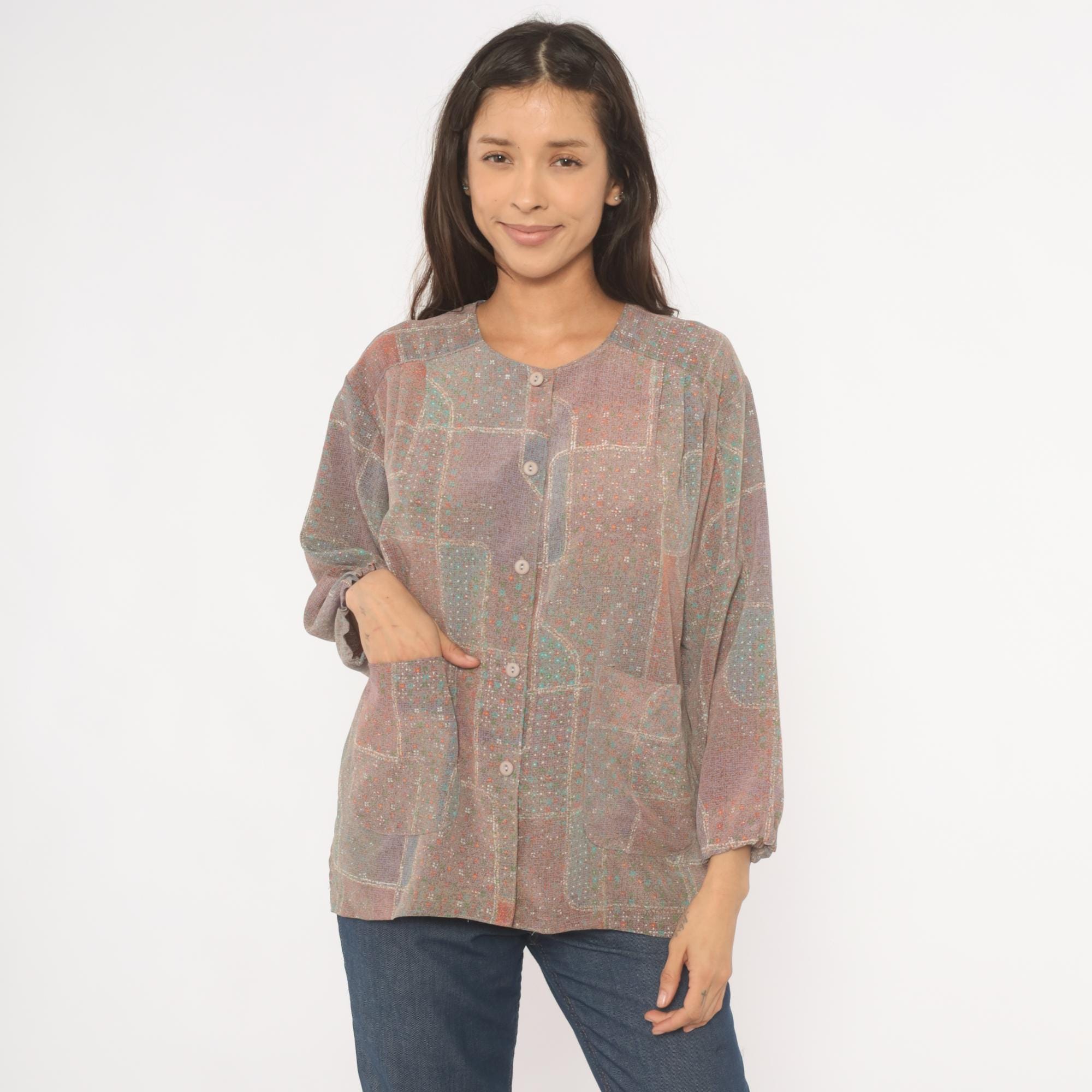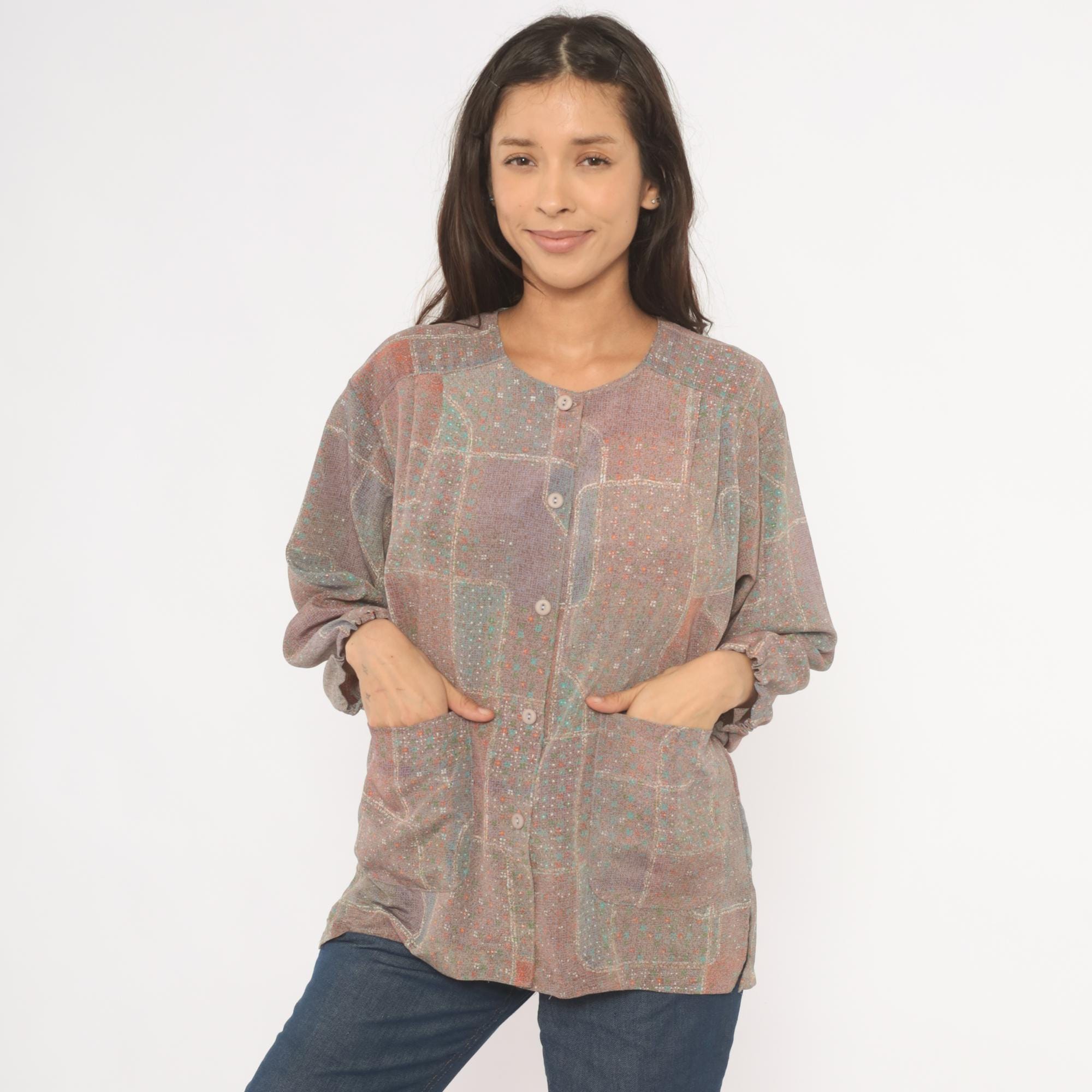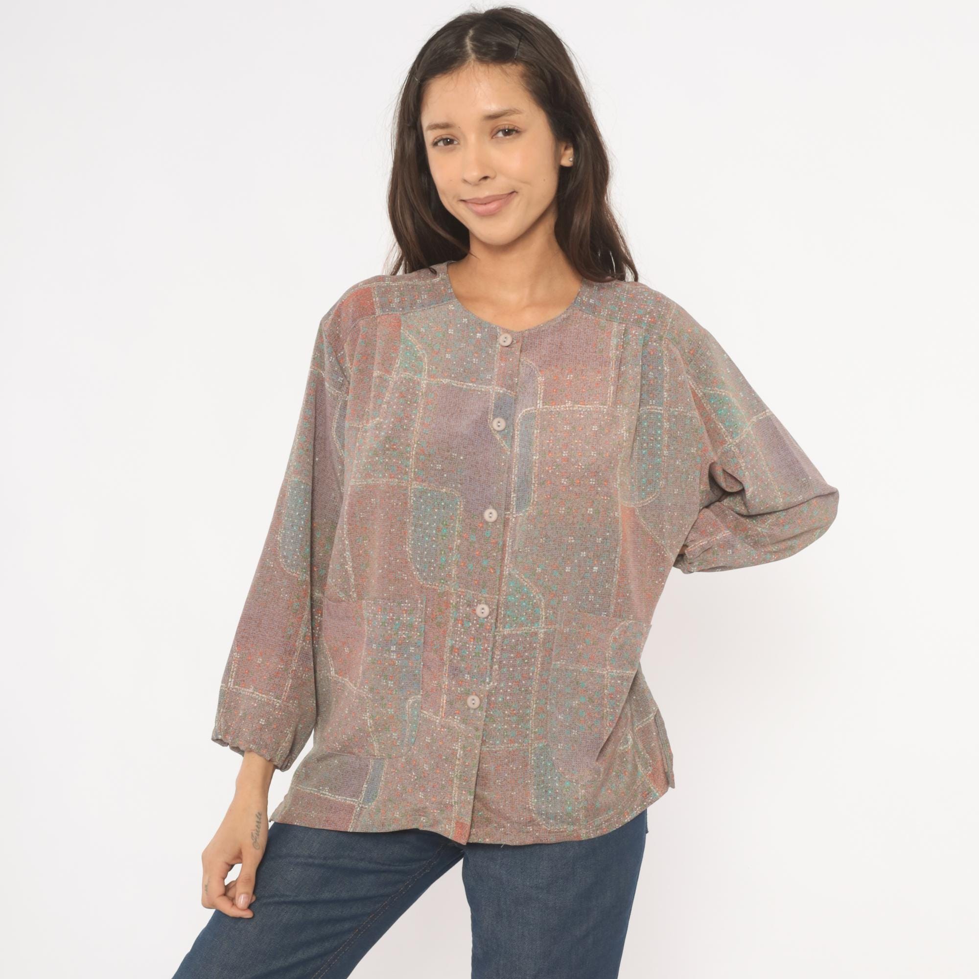 80s grey and purple patchwork print button-front blouse with a scoop neckline and long sleeves with gathered cuffs. Front button closure runs from neckline to hem, with two waist-level patch pockets on the front. Straight hem and relaxed, boxy cut through the body and shoulders.