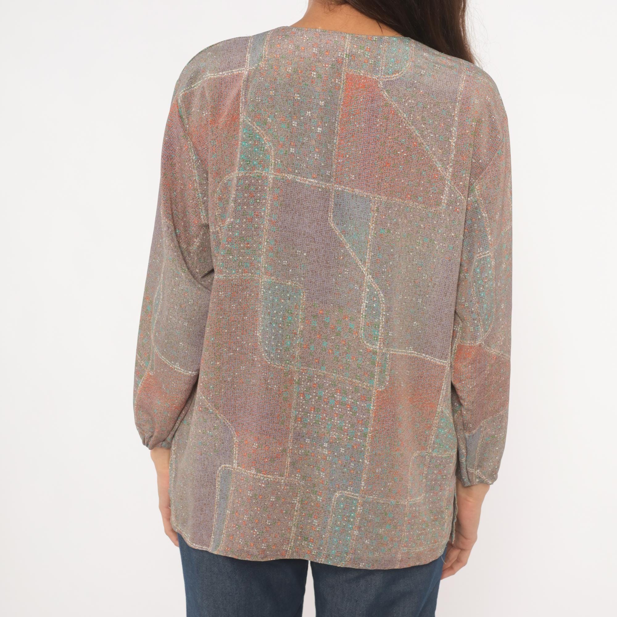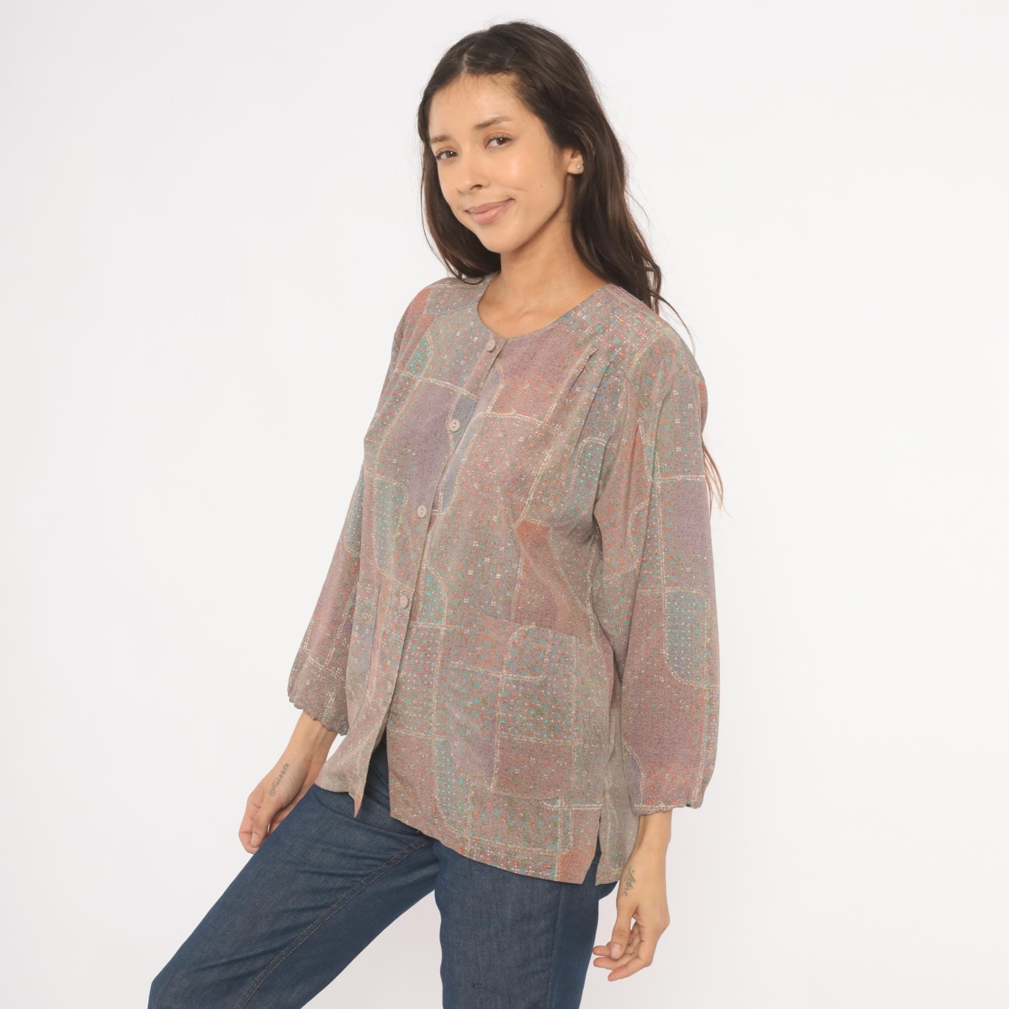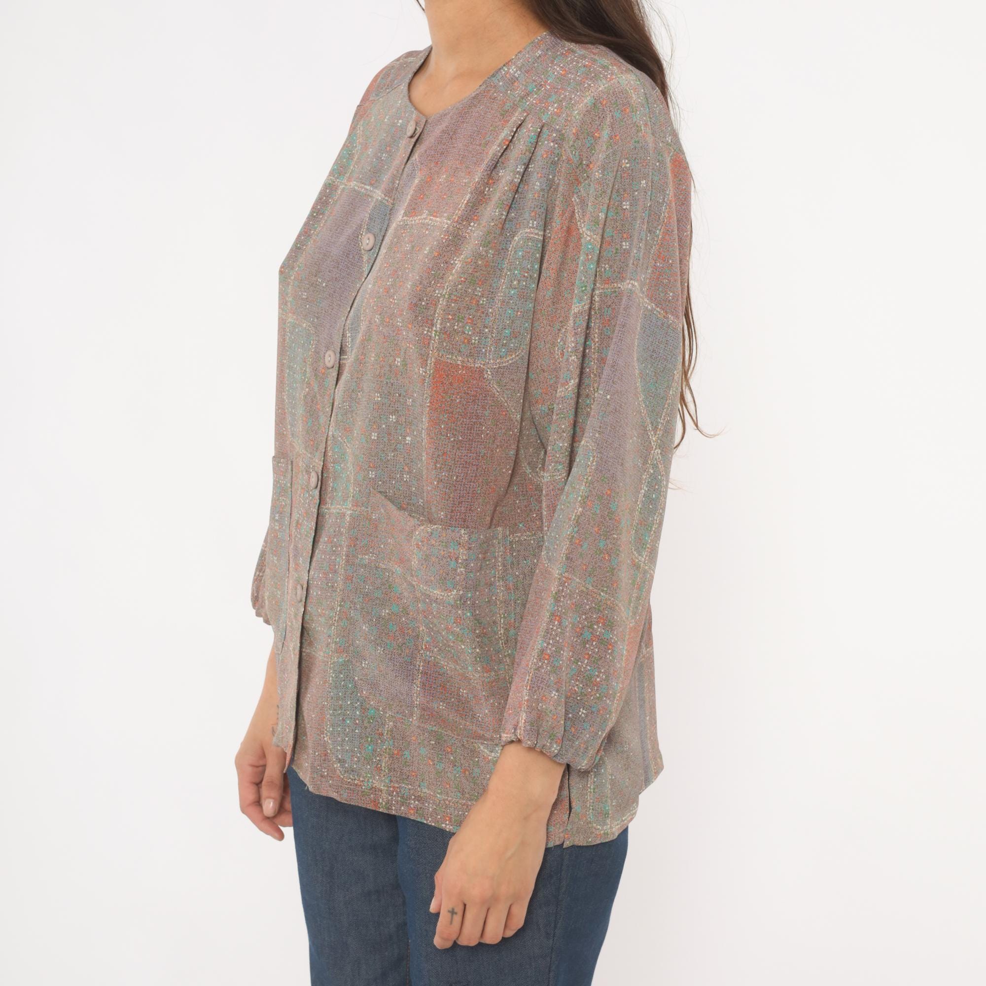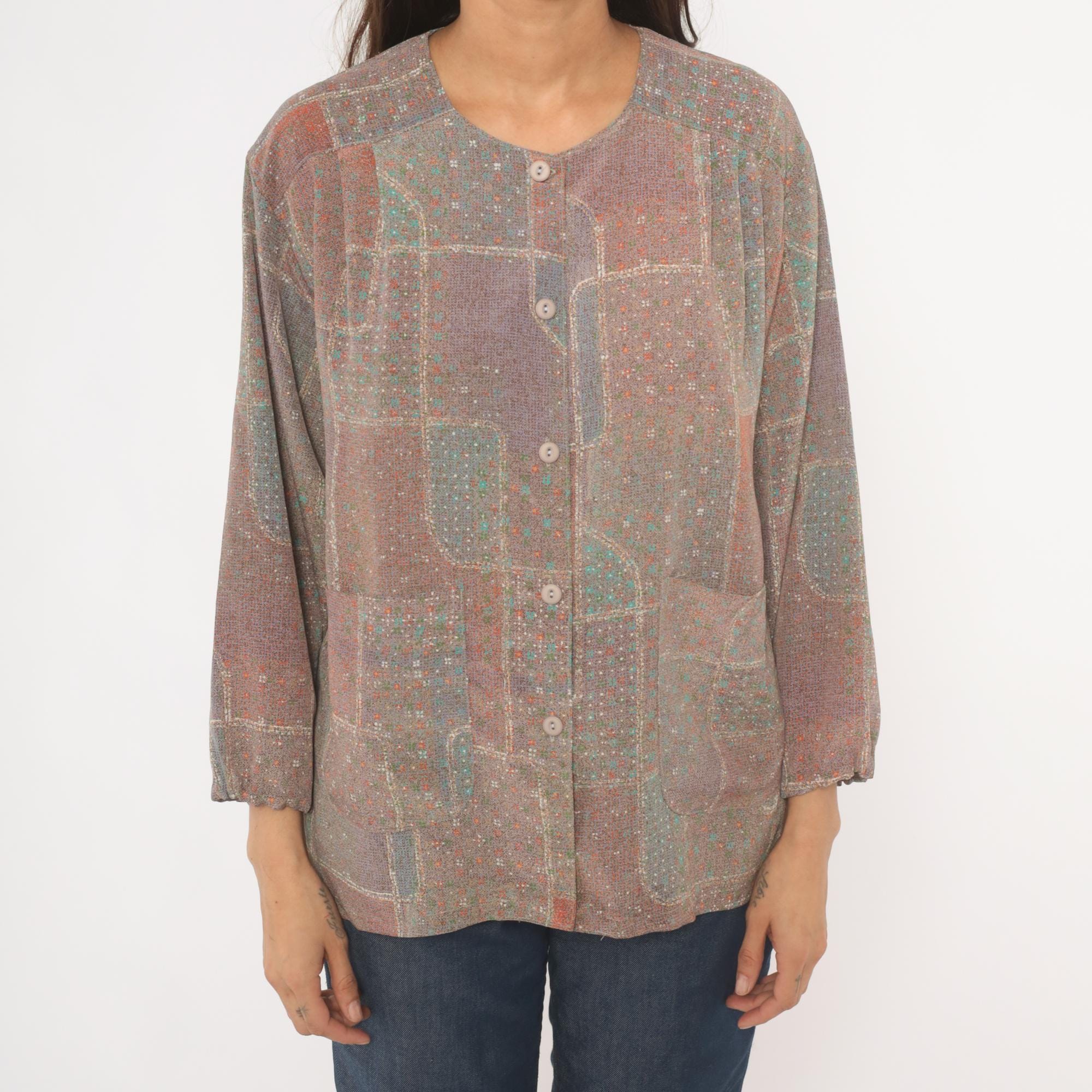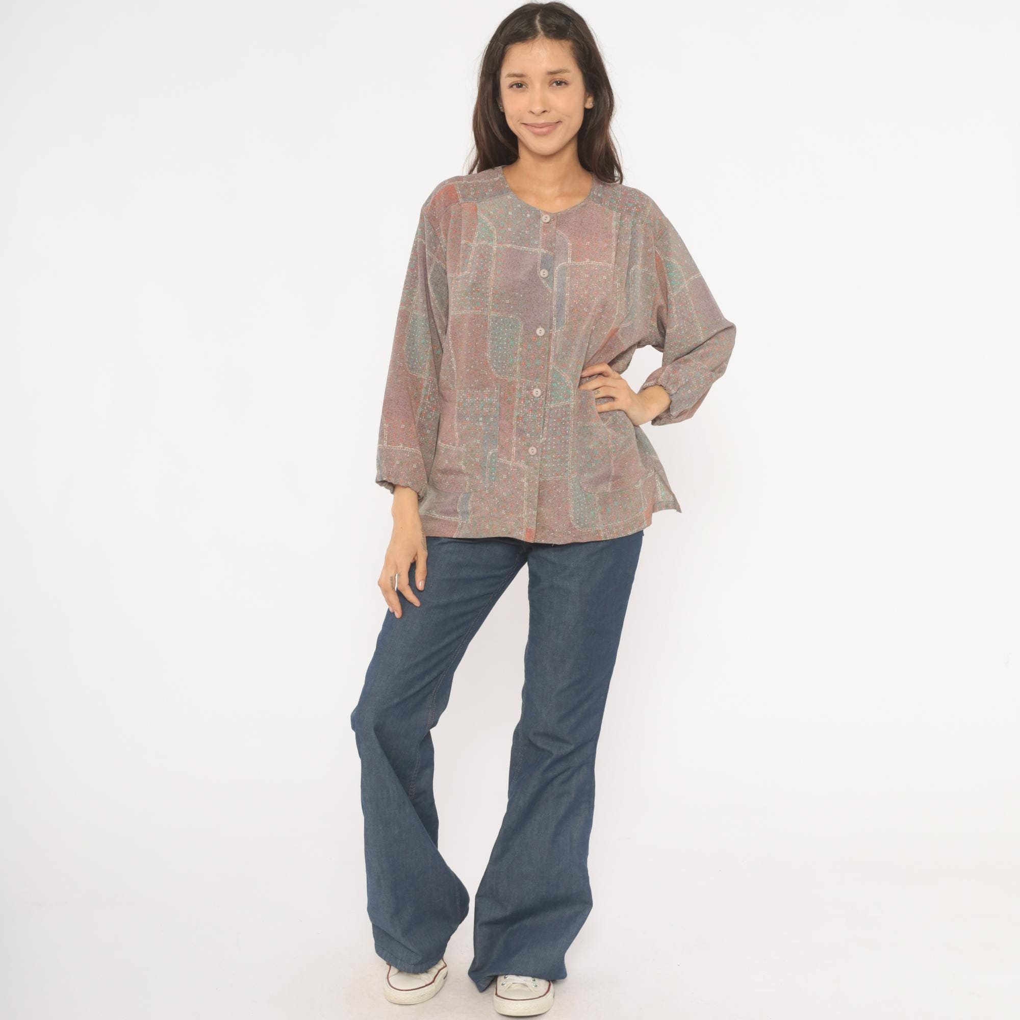 80s grey and purple patchwork print button-front blouse with a scoop neckline and long sleeves with gathered cuffs. Front button closure runs from neckline to hem, with two waist-level patch pockets on the front. Straight hem and relaxed, boxy cut through the body and shoulders.