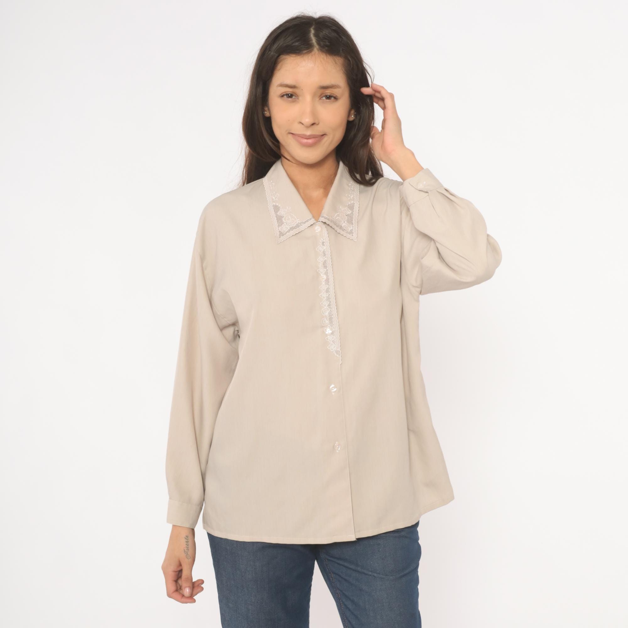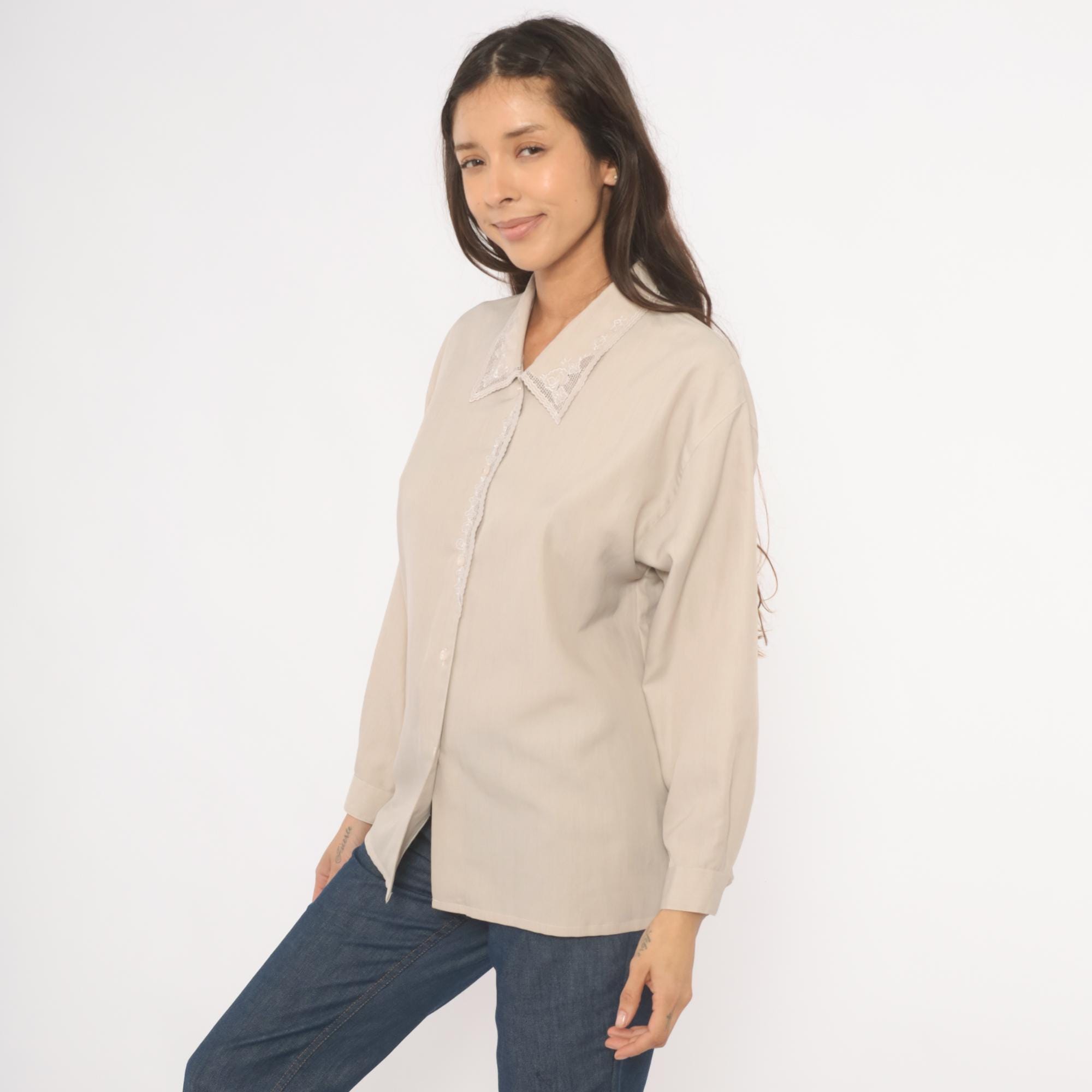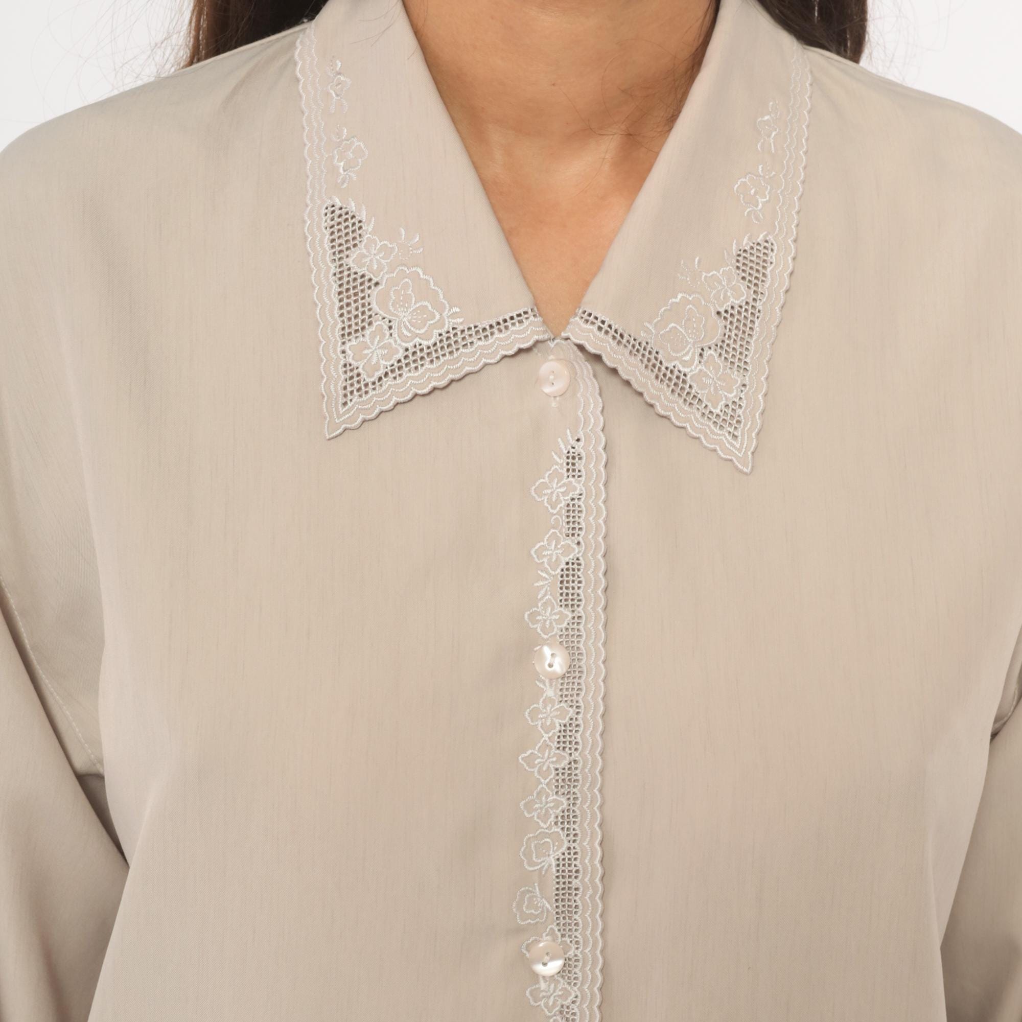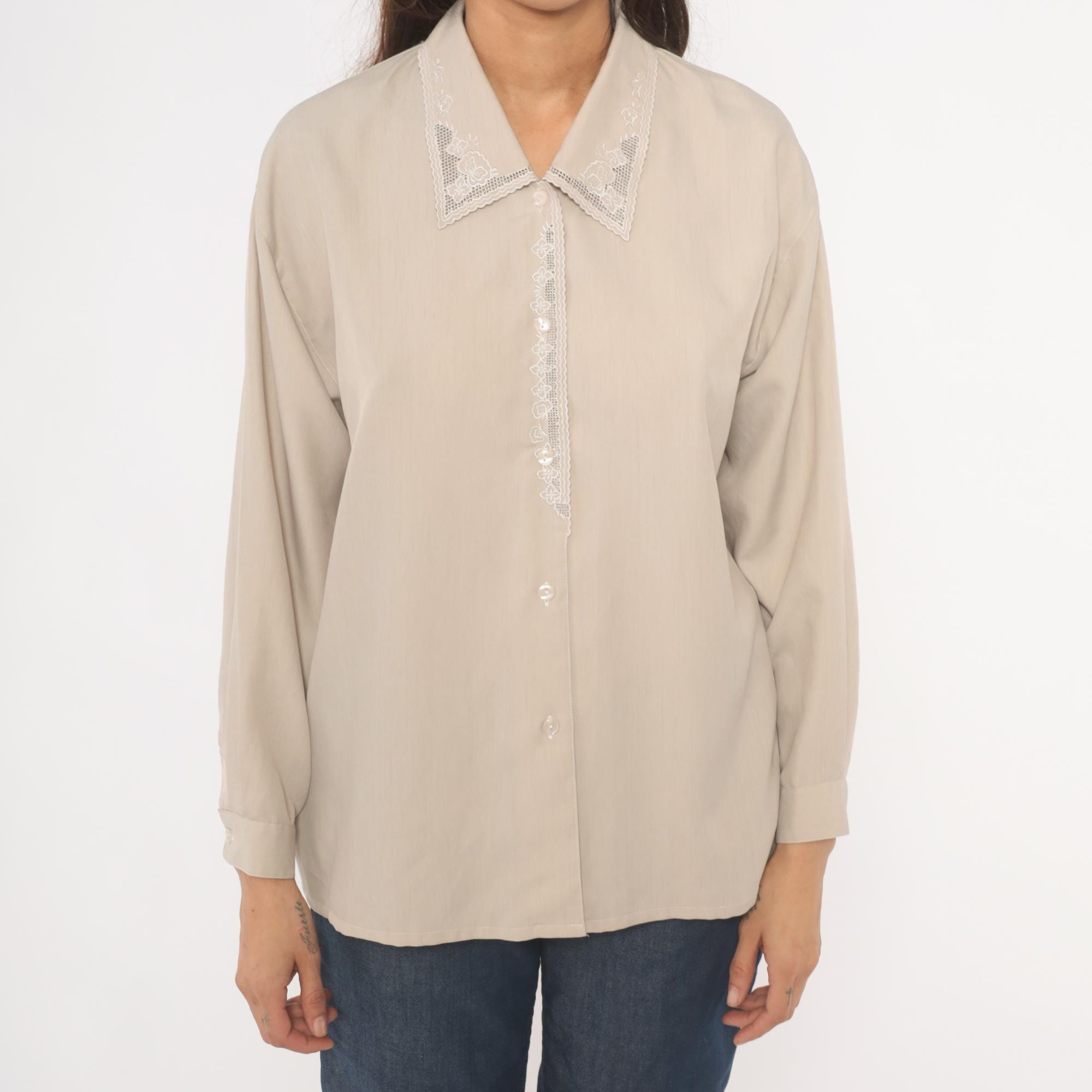 Cream button-front blouse from the 2000s with a wide pointed collar trimmed in lace cutwork and embroidered floral detailing along the collar edges and front placket. Plain back with lace trim visible along the collar neckline seam.