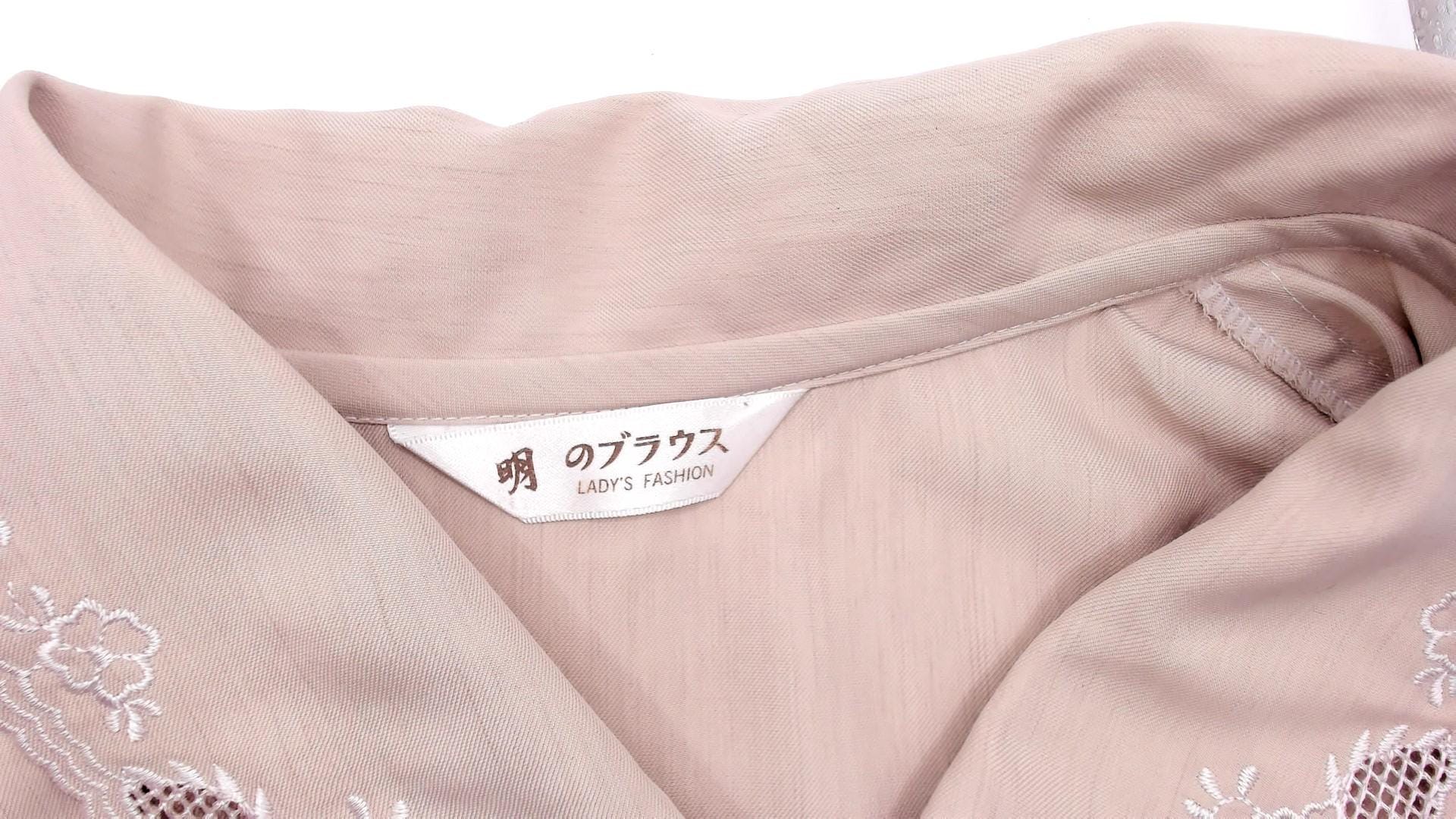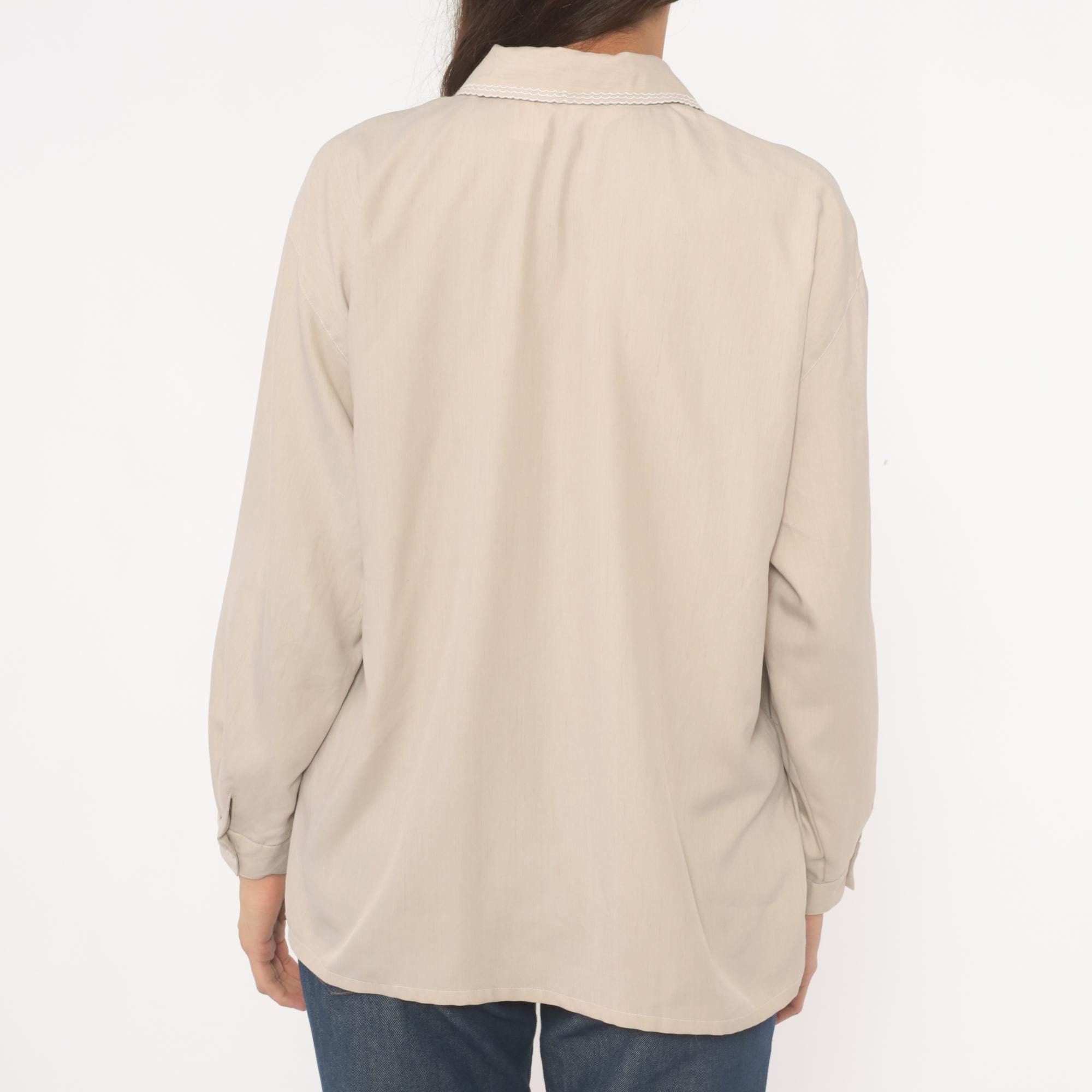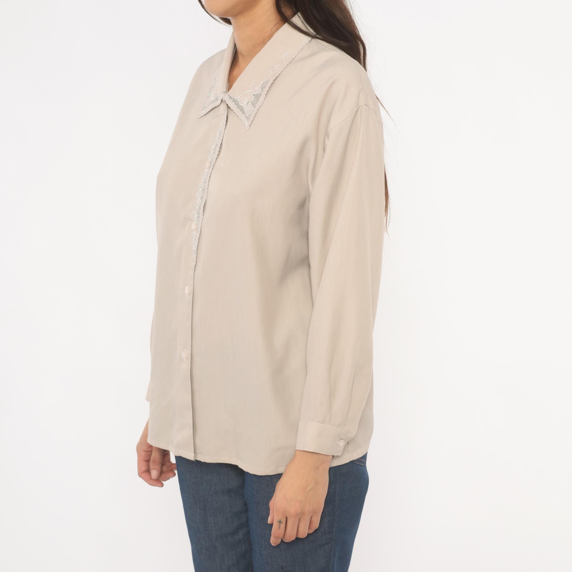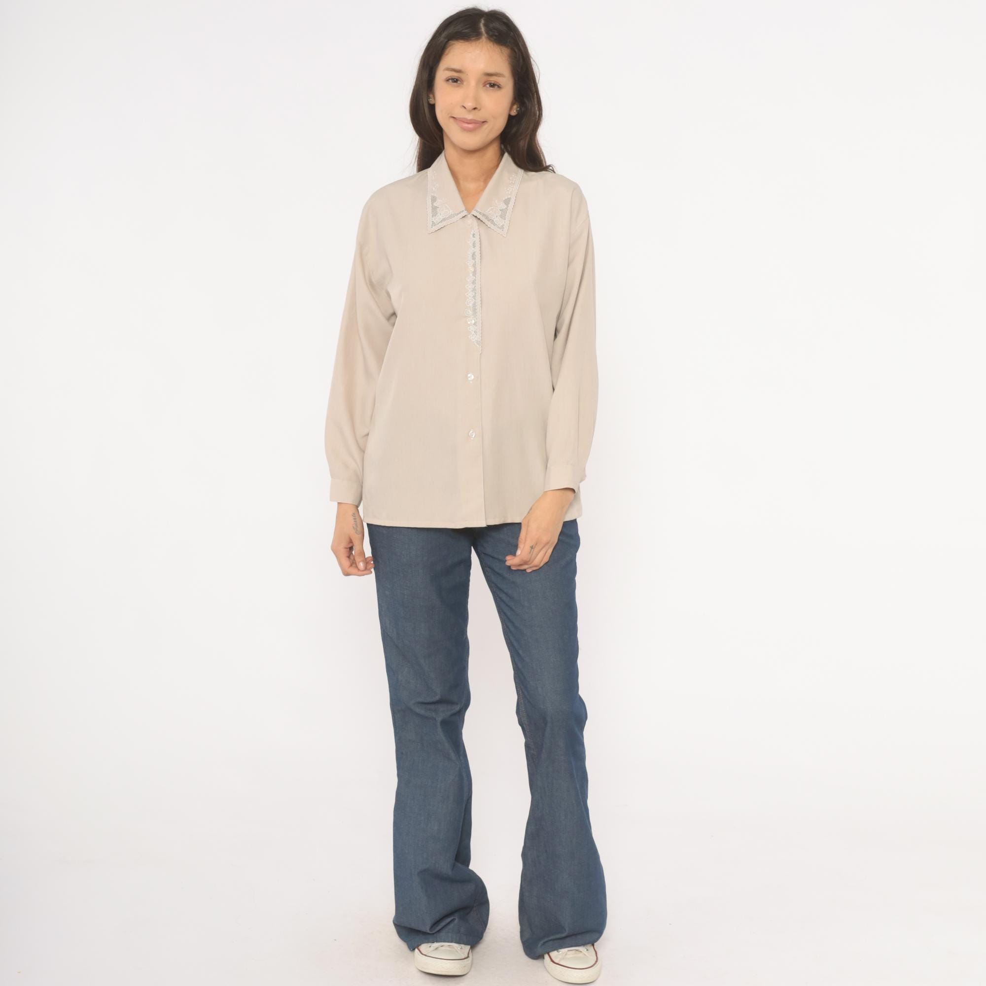 Cream button-front blouse from the 2000s with a wide pointed collar trimmed in lace cutwork and embroidered floral detailing along the collar edges and front placket. Plain back with lace trim visible along the collar neckline seam.