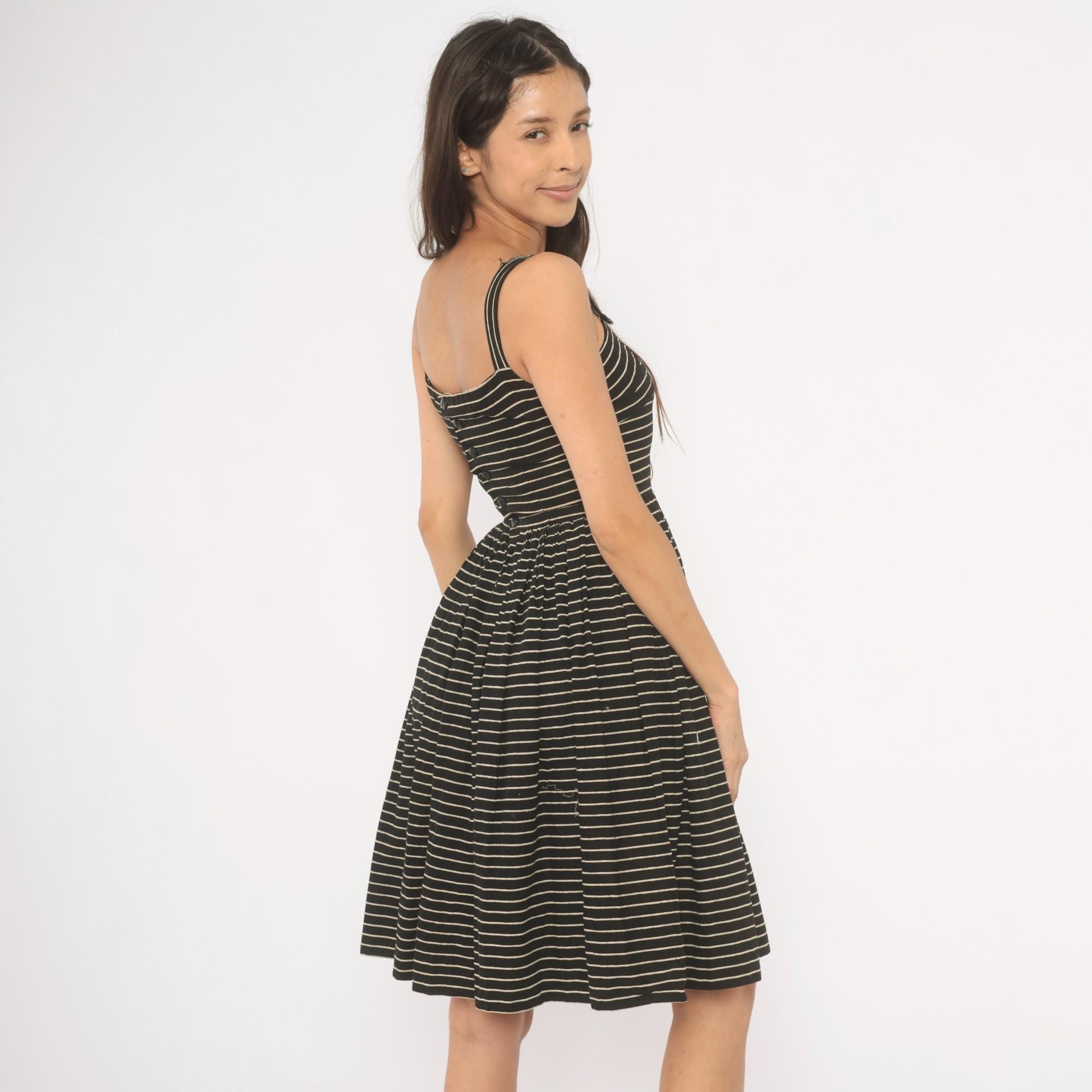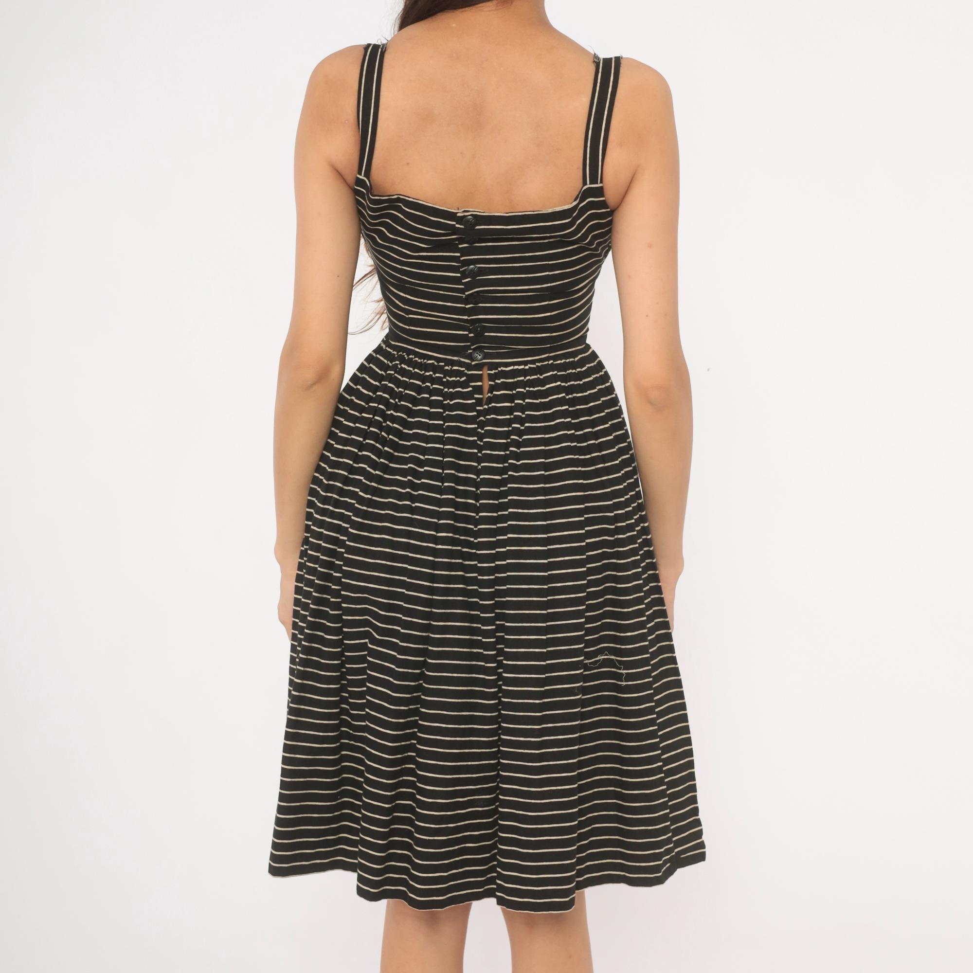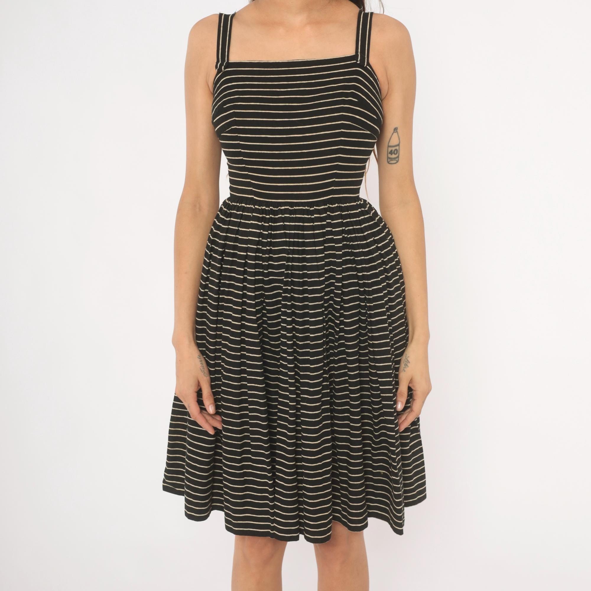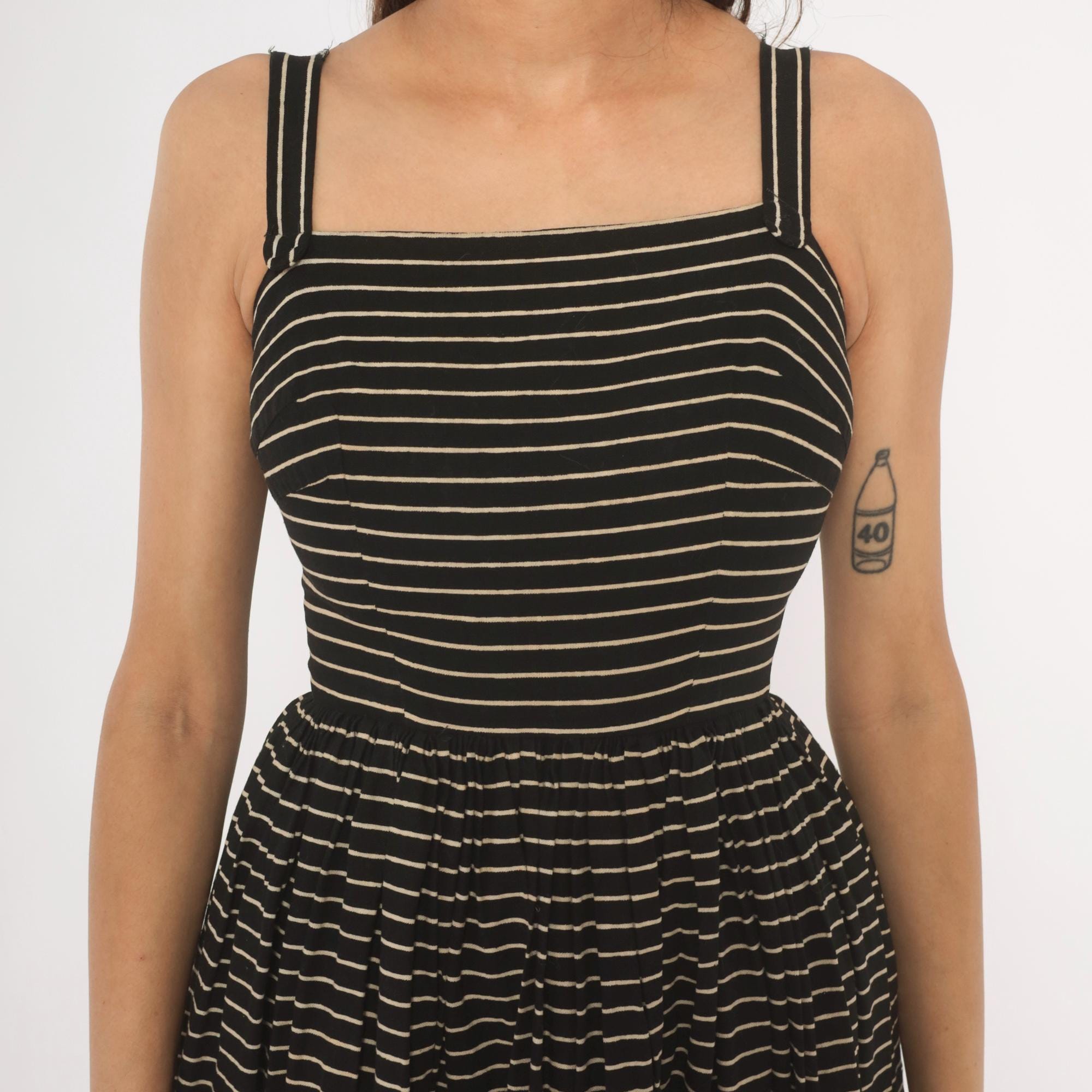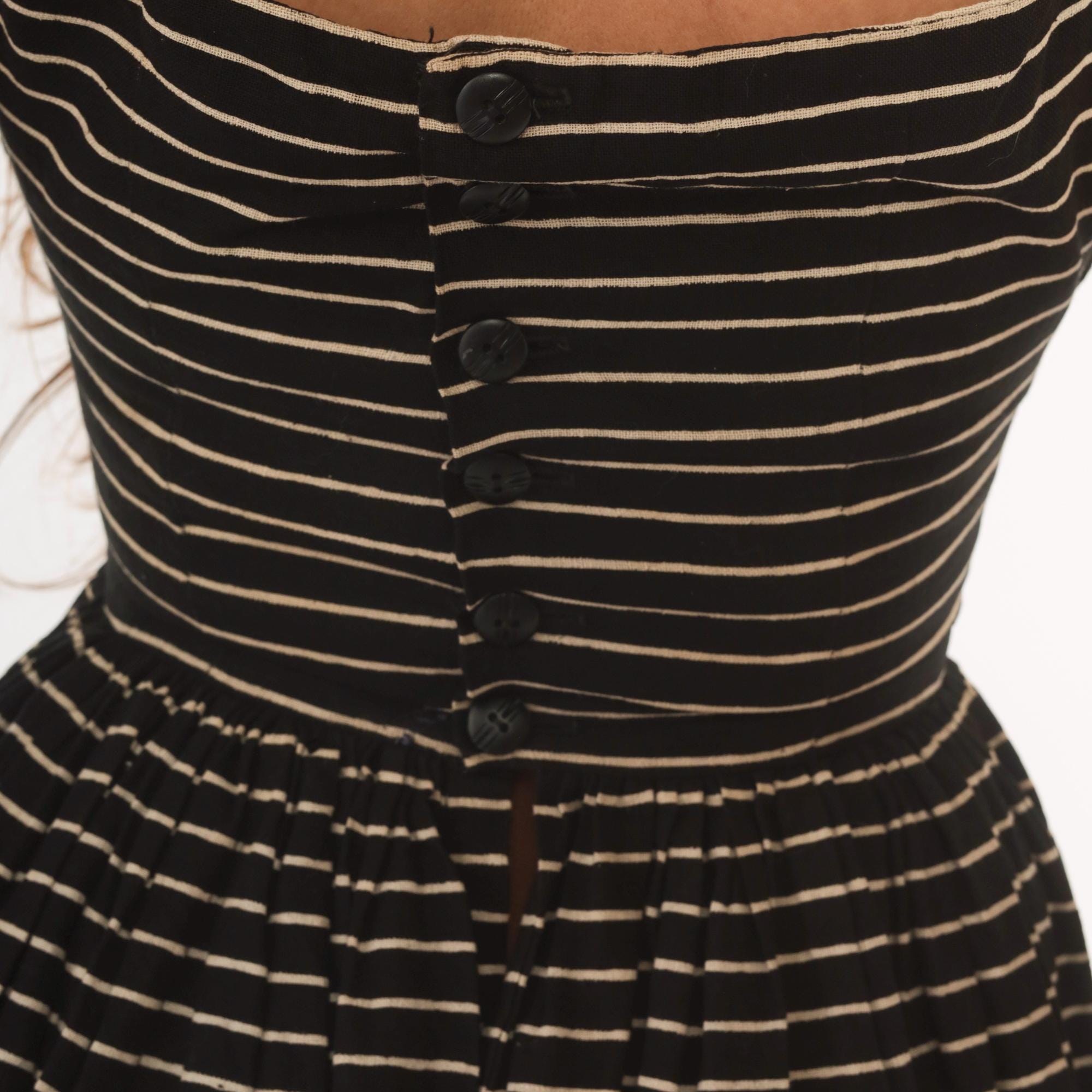 50s black and cream pinstripe sundress from Lanz Original with a square neckline, double spaghetti straps, and fitted bodice. Gathered waist releases into a full, pleated A-line skirt hitting at the knee. Back button closure runs from neckline to waist.