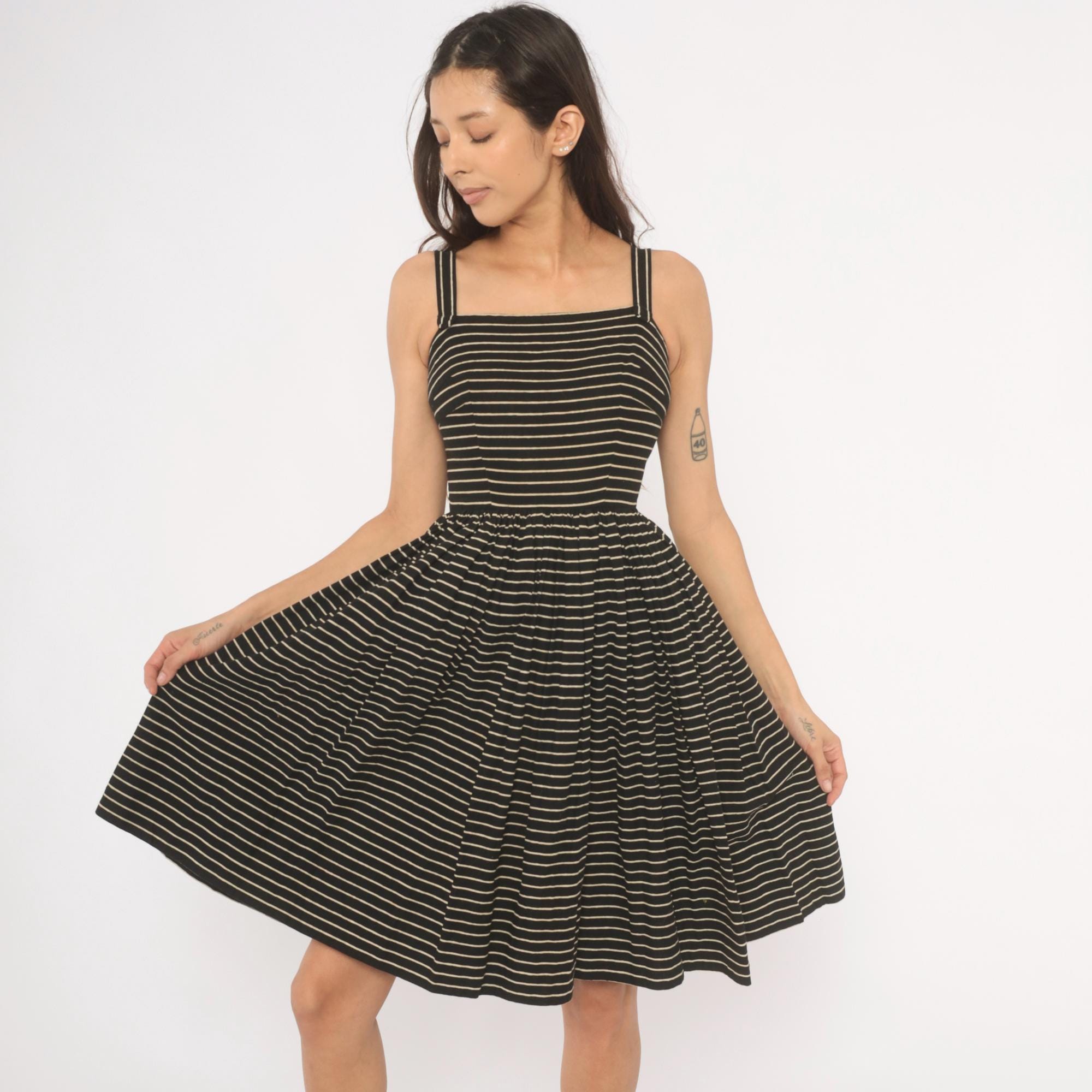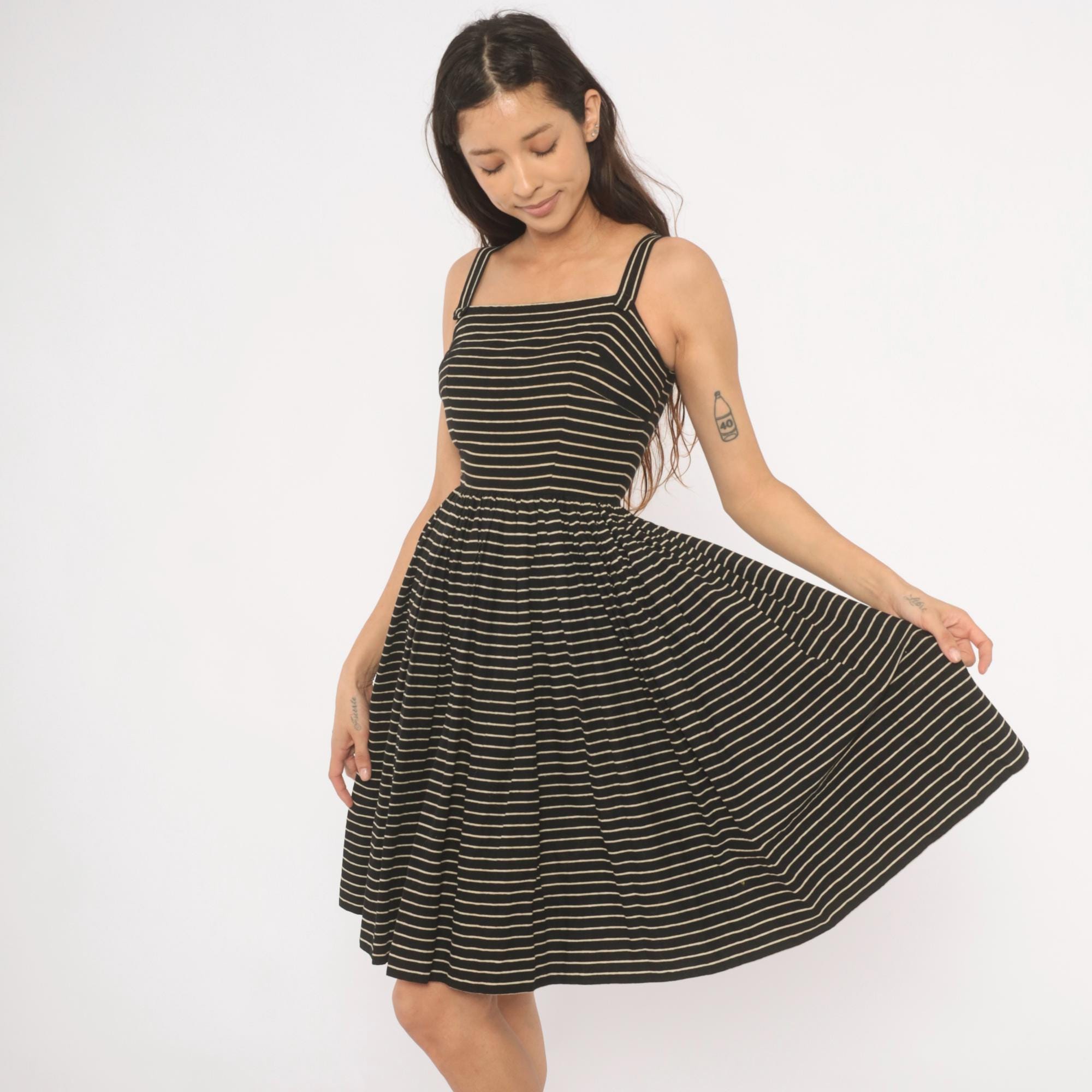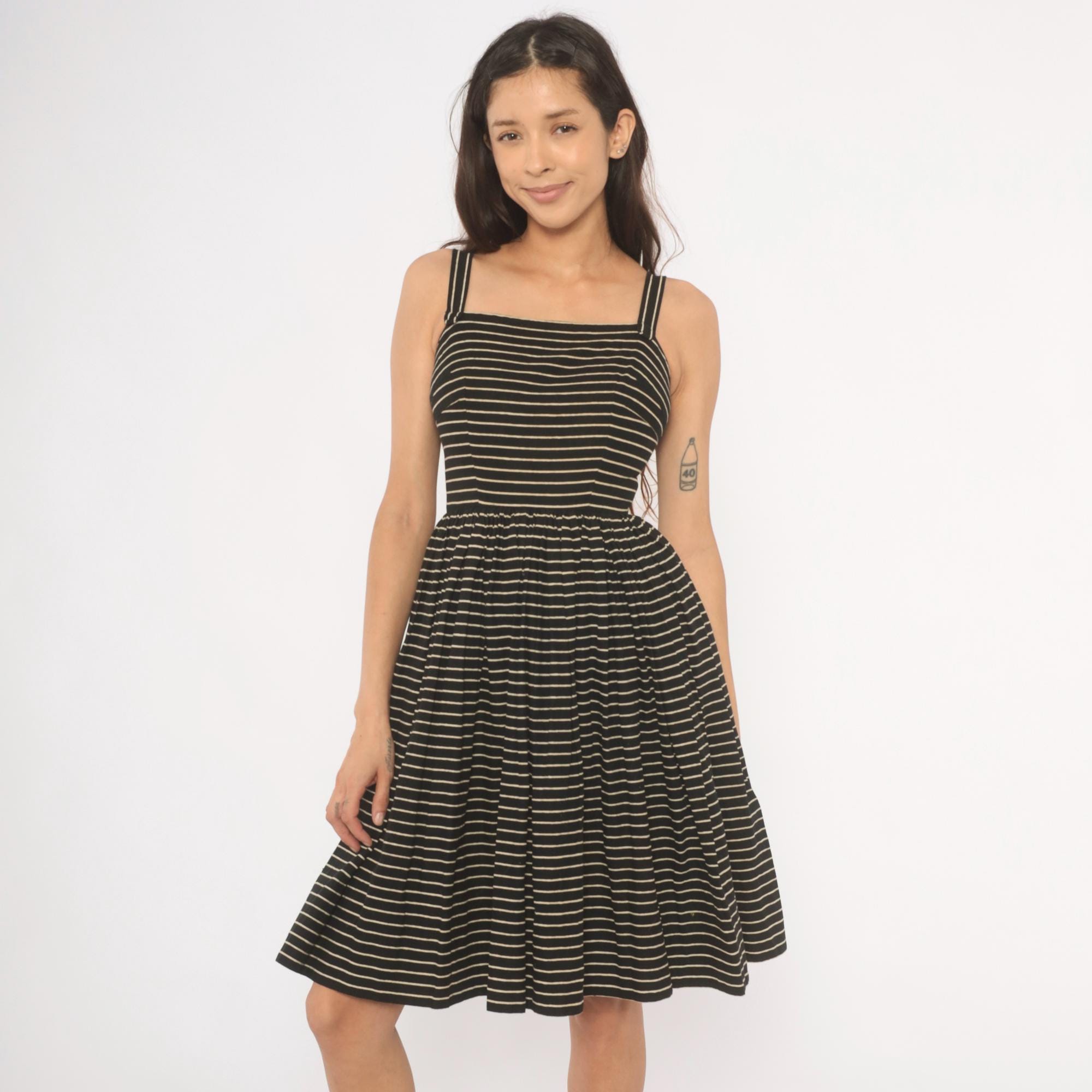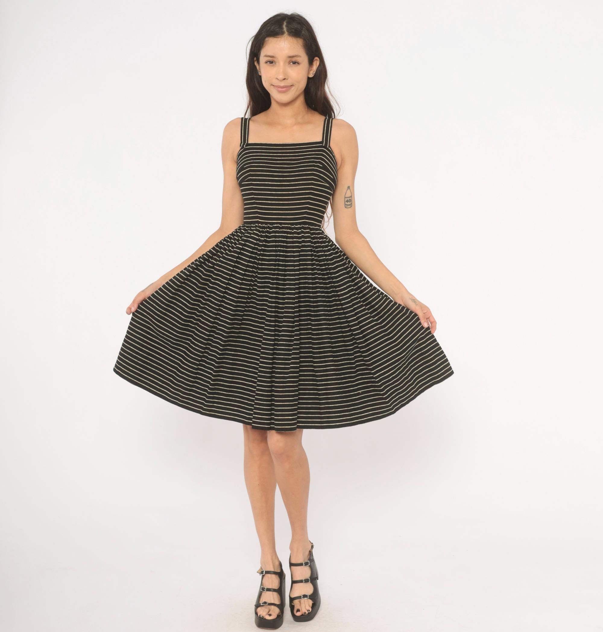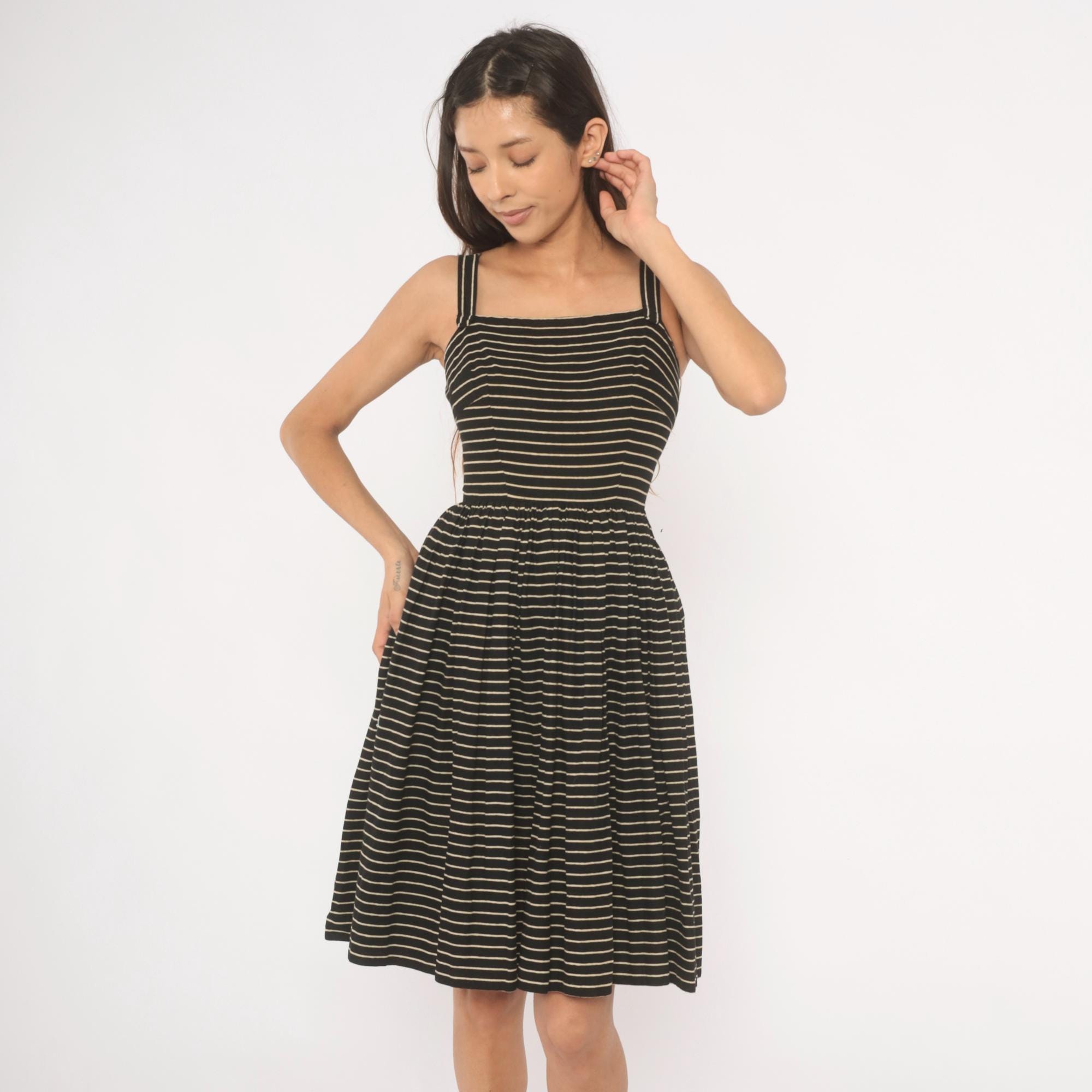 50s black and cream pinstripe sundress from Lanz Original with a square neckline, double spaghetti straps, and fitted bodice. Gathered waist releases into a full, pleated A-line skirt hitting at the knee. Back button closure runs from neckline to waist.