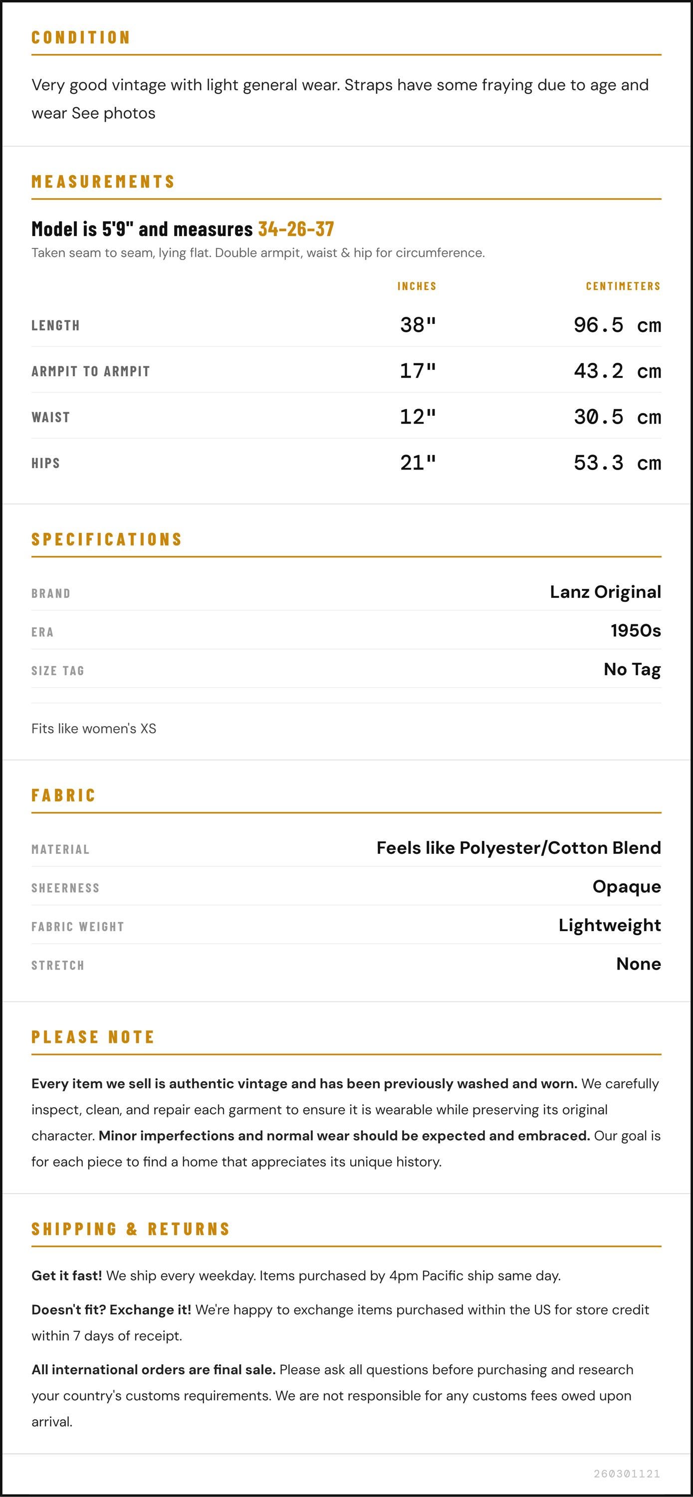 Doesn't fit? Exchange it! We're happy to exchange items purchased within the US for store credit within 7 days of receipt.