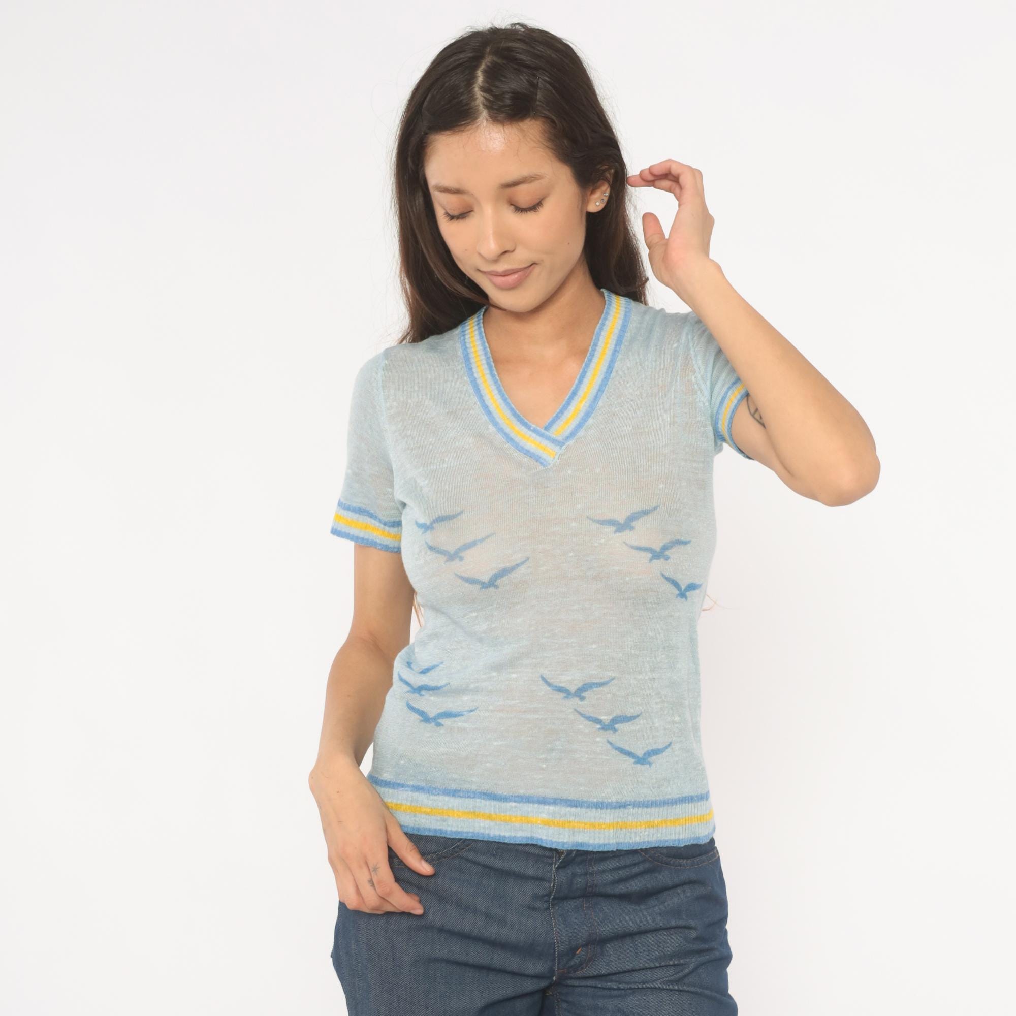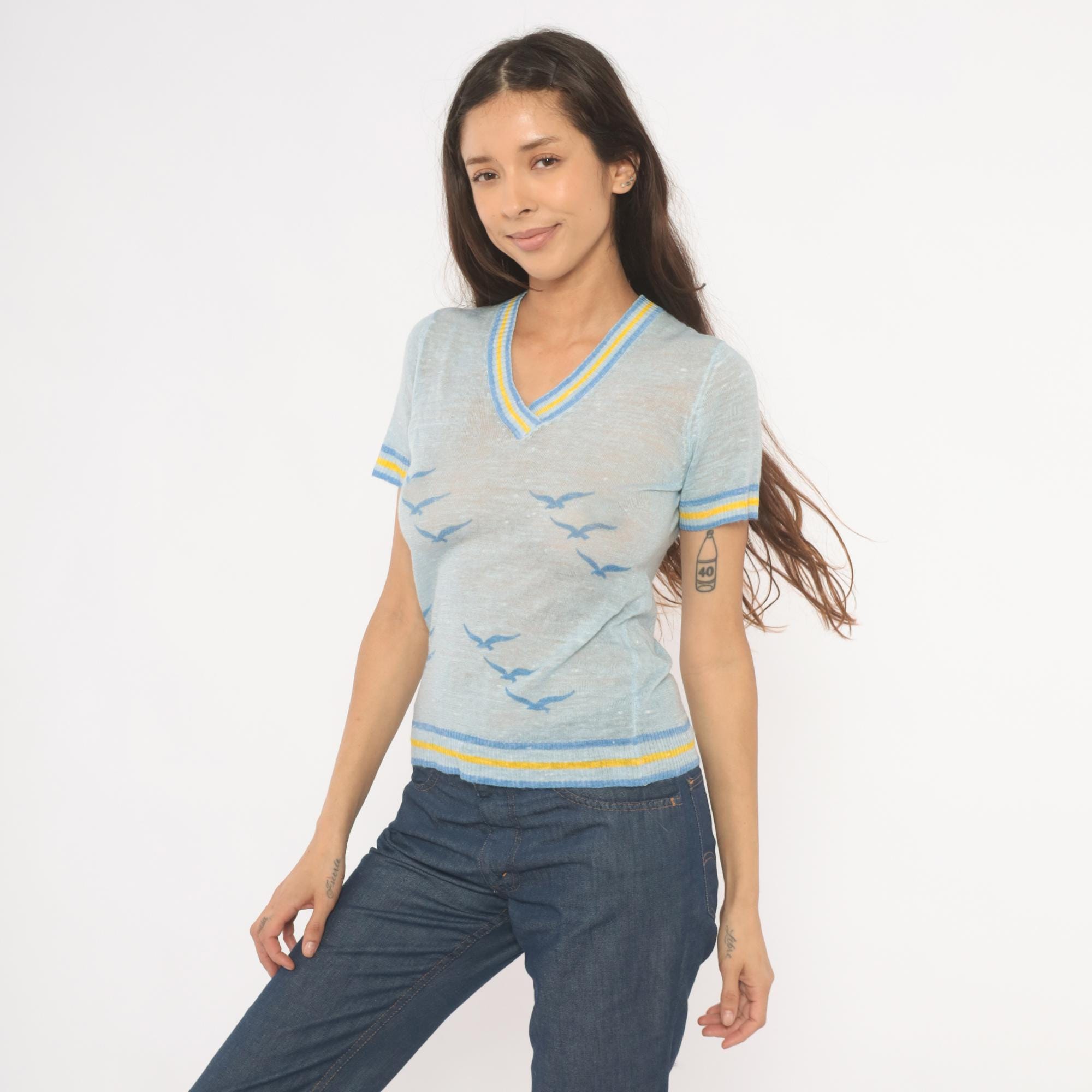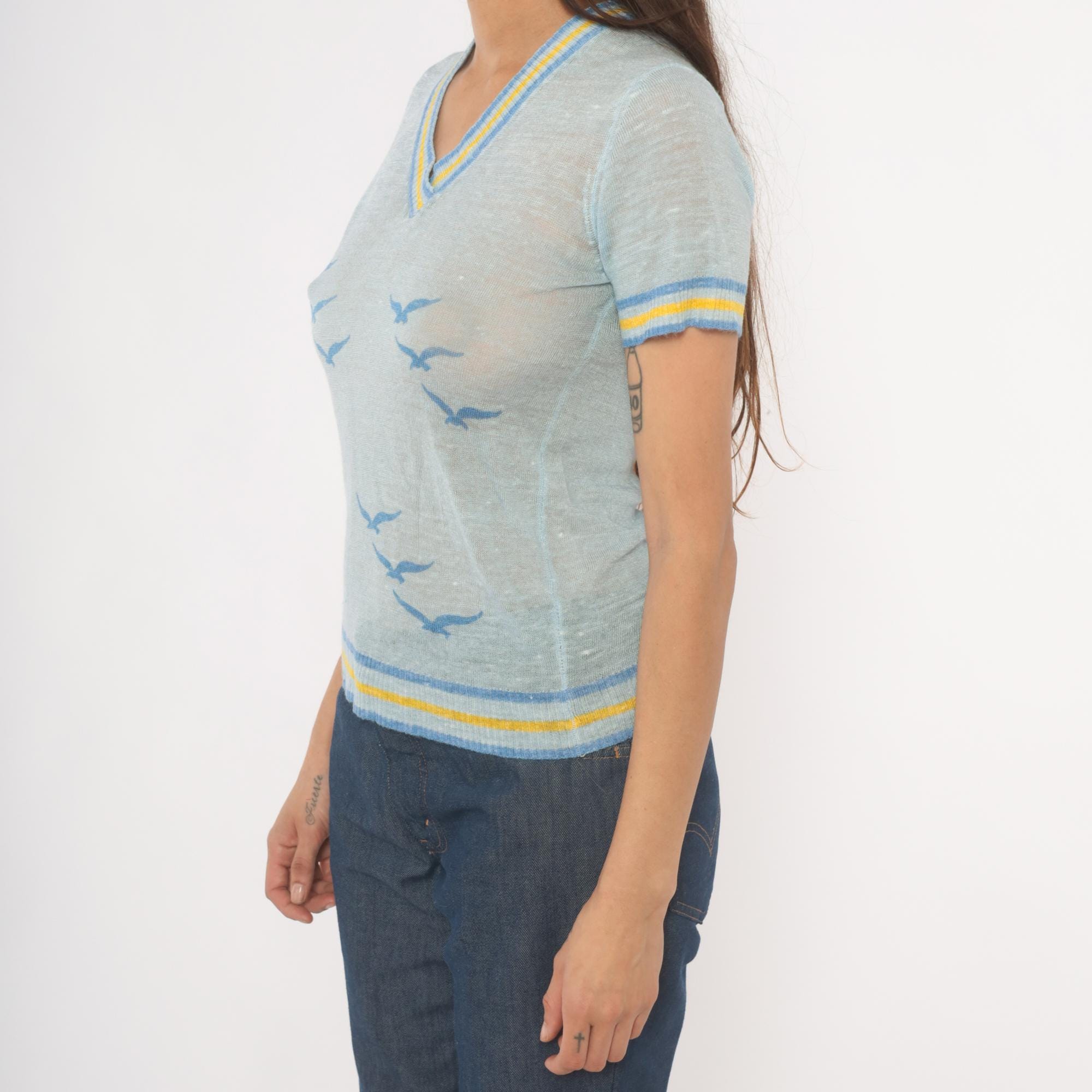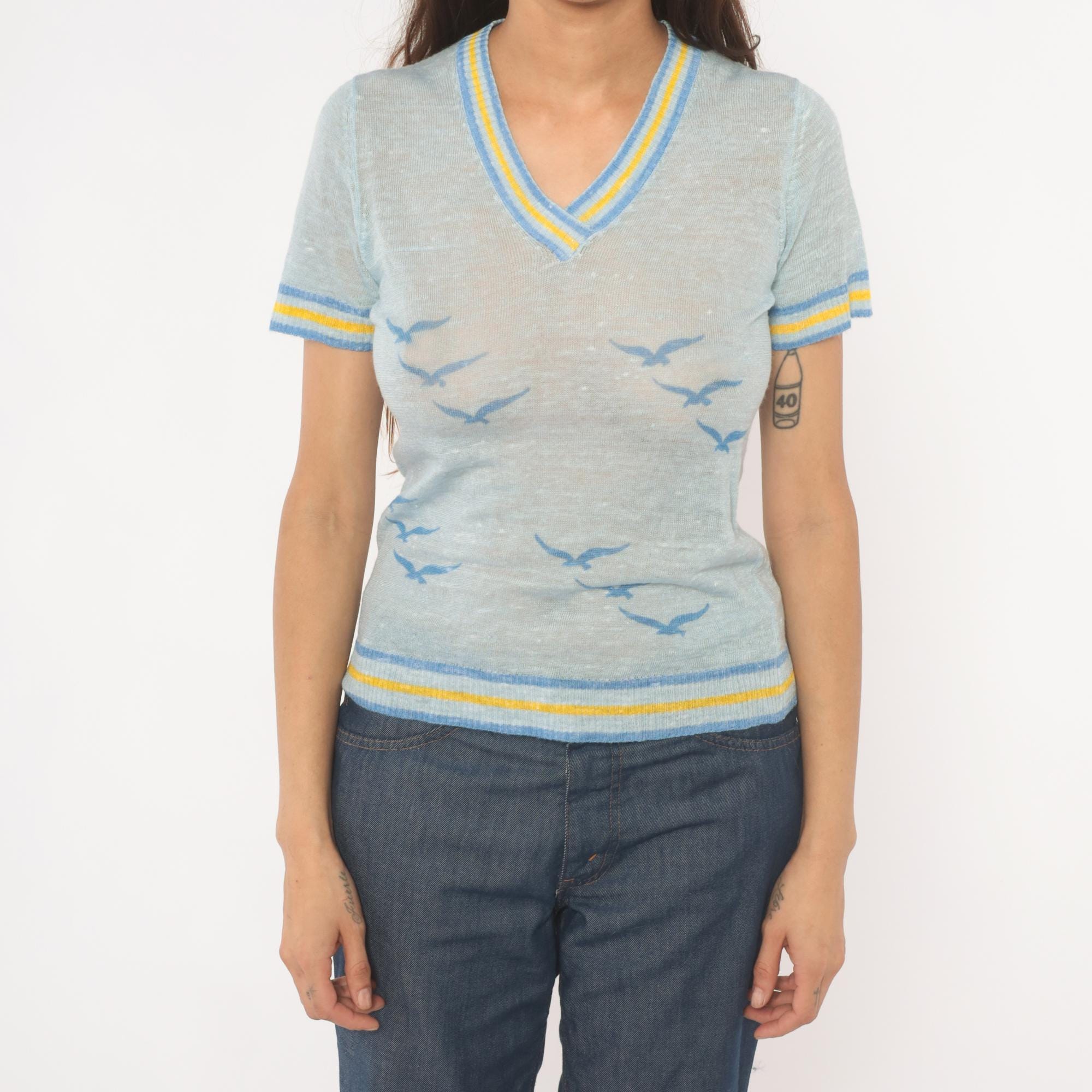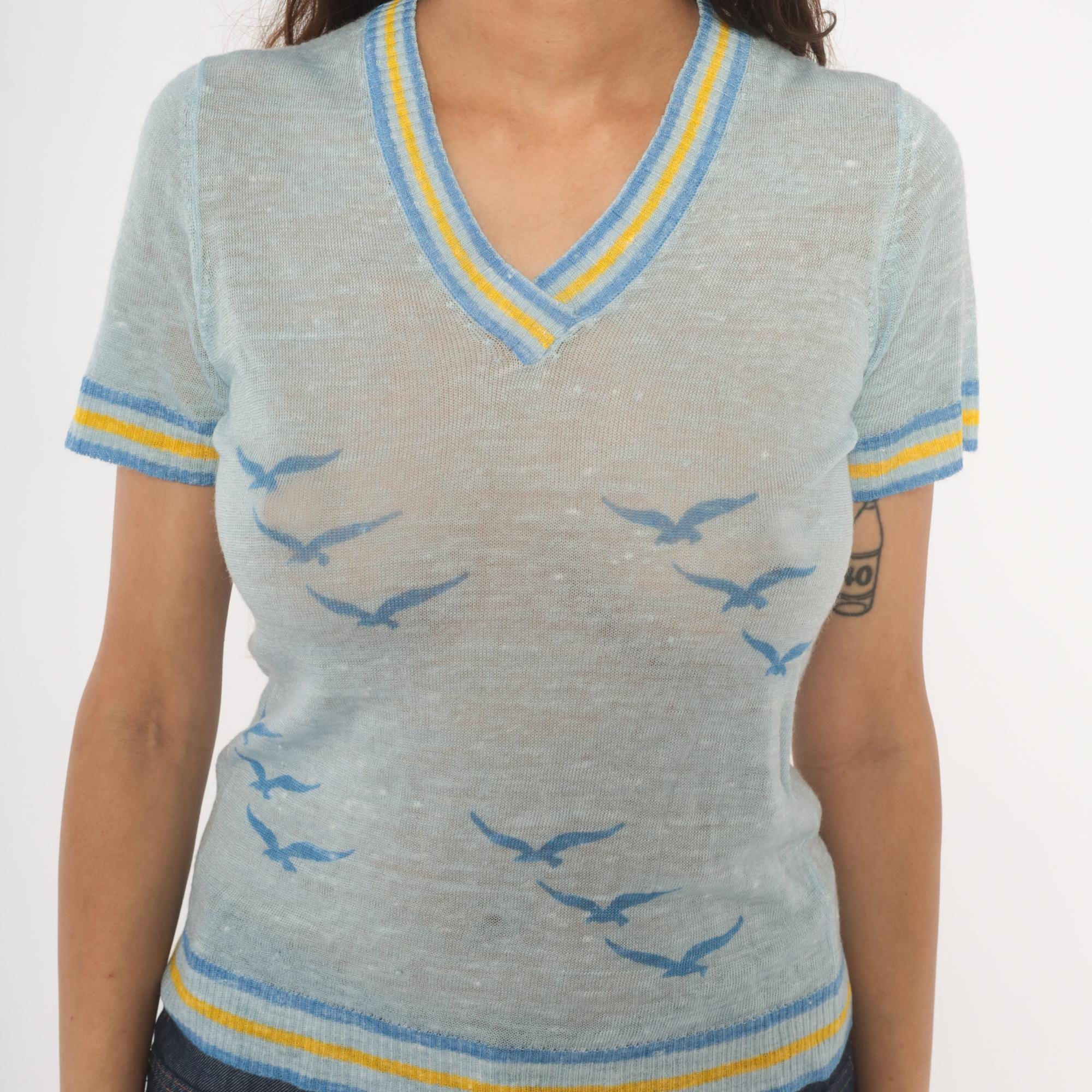 80s sky blue semi-sheer knit pullover from Robin Lee with a V-neckline trimmed in blue and yellow contrast varsity stripes, matching striped cuffs, and a ribbed hem. Flying seagull silhouettes printed across the front in a deeper blue. Fitted through the waist with short sleeves and a ribbed hem band in matching blue and golden yellow stripes.