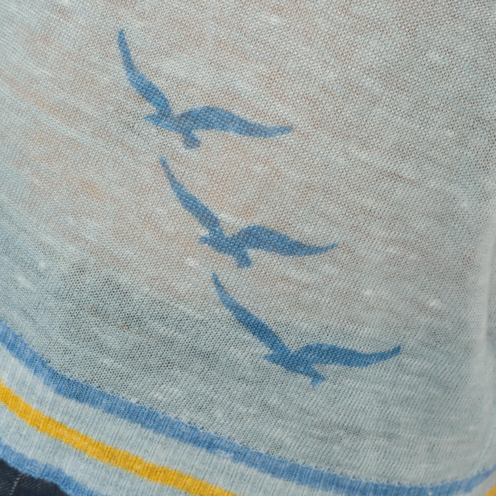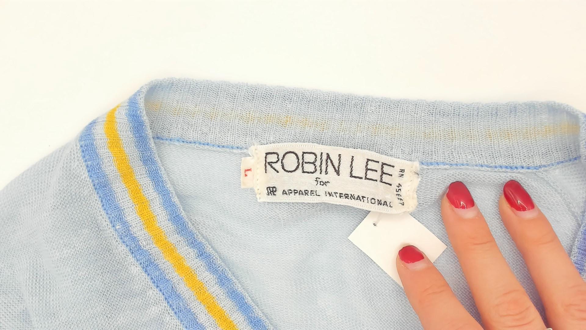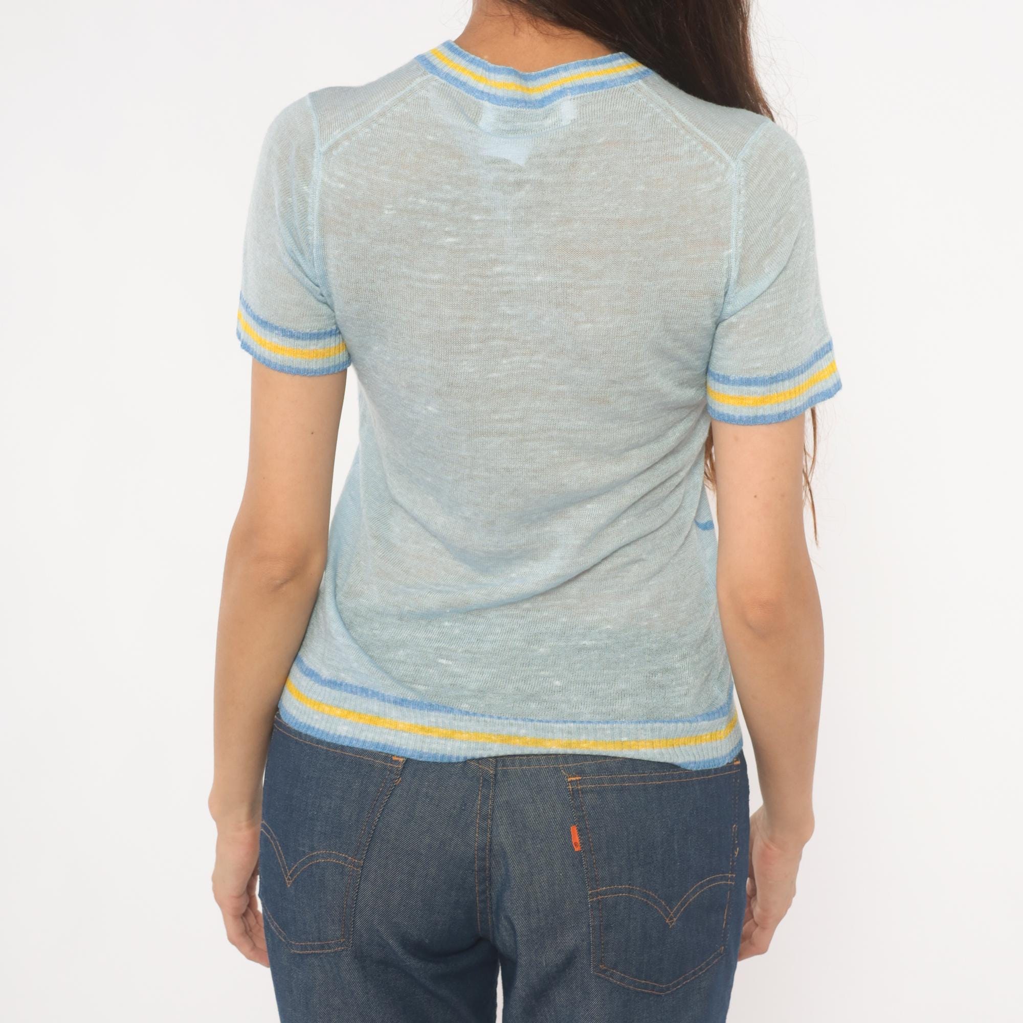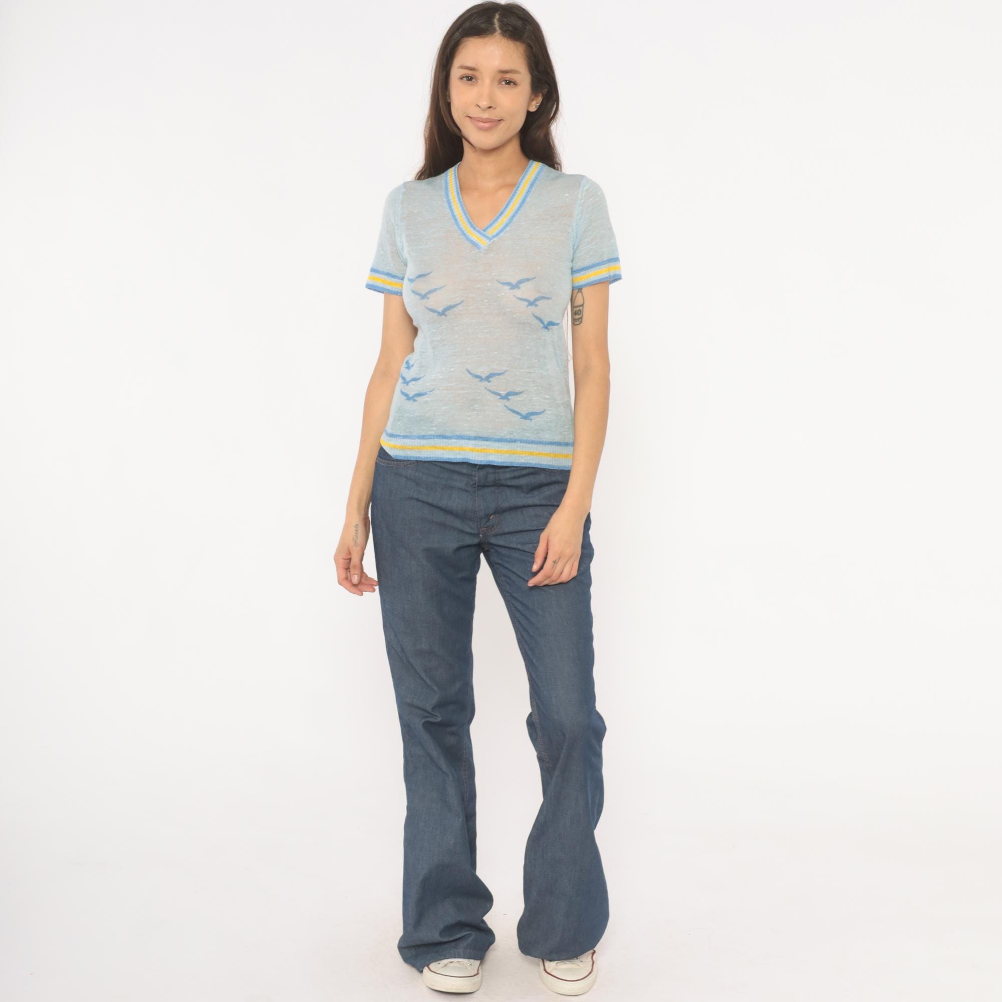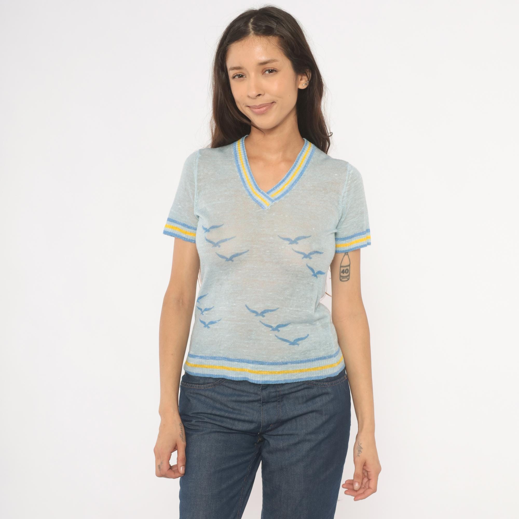 80s sky blue semi-sheer knit pullover from Robin Lee with a V-neckline trimmed in blue and yellow contrast varsity stripes, matching striped cuffs, and a ribbed hem. Flying seagull silhouettes printed across the front in a deeper blue. Fitted through the waist with short sleeves and a ribbed hem band in matching blue and golden yellow stripes.