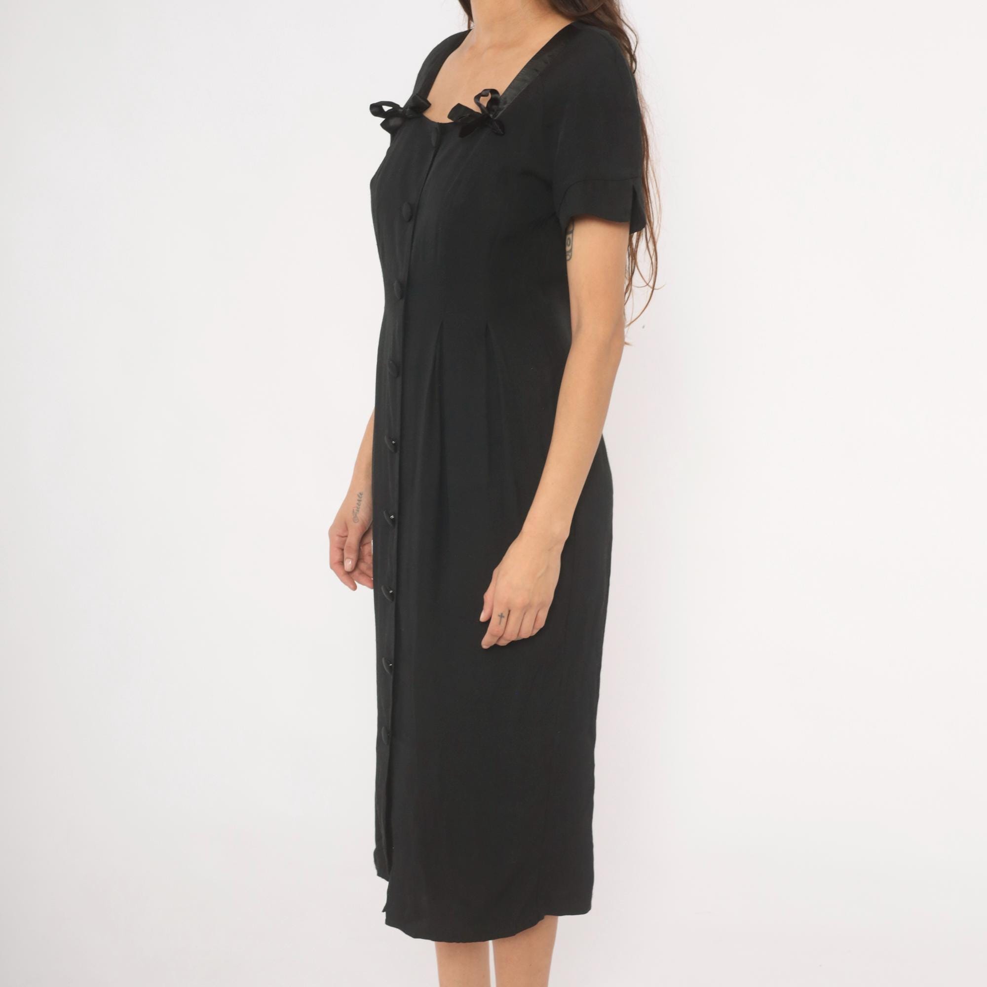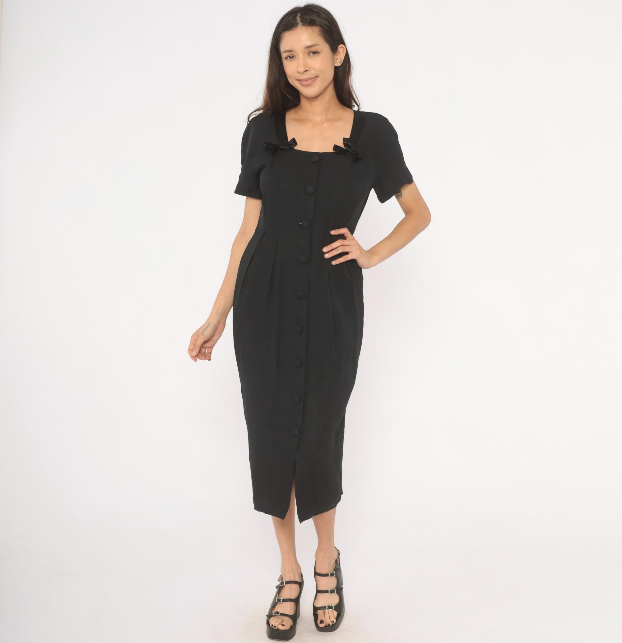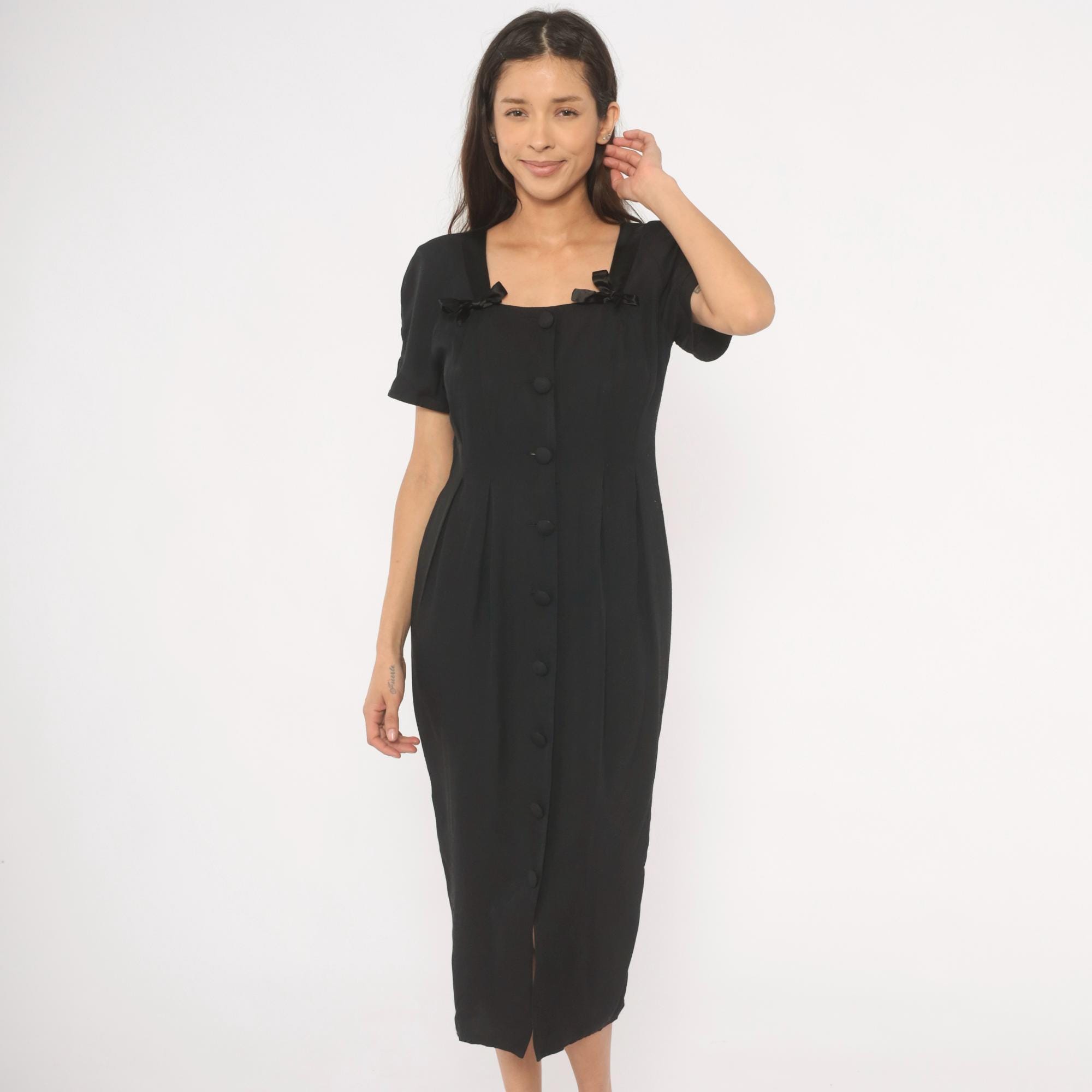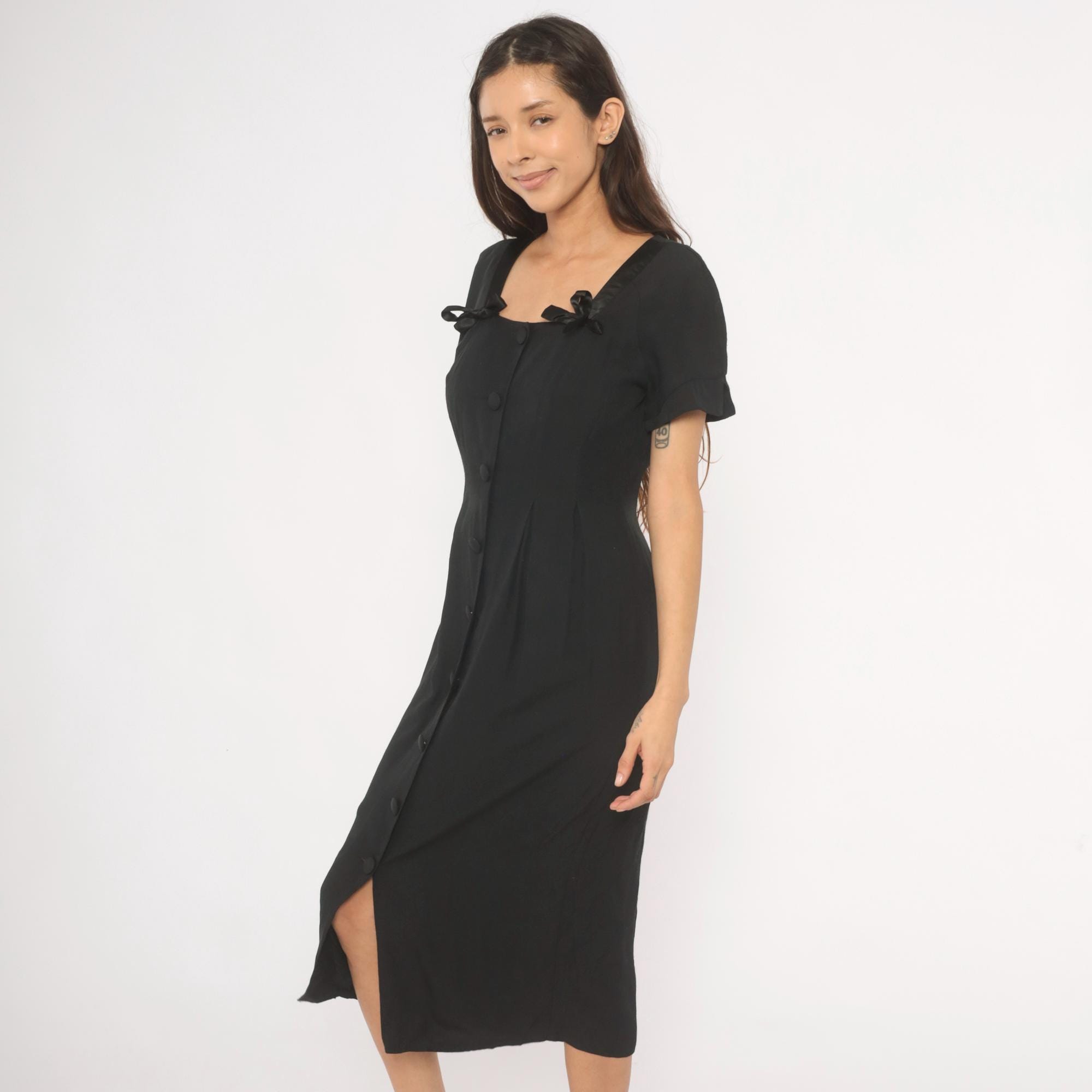 90s black midi dress from Atina by Karon Crosby with a square neckline edged by two small satin ribbon bows at each corner. Button front closure runs the full length of the center, with a fitted bodice, defined waist, and straight skirt with a center front kick vent at the hem. Short puff sleeves with a structured cap shape, and pleating at the skirt front below the waist.