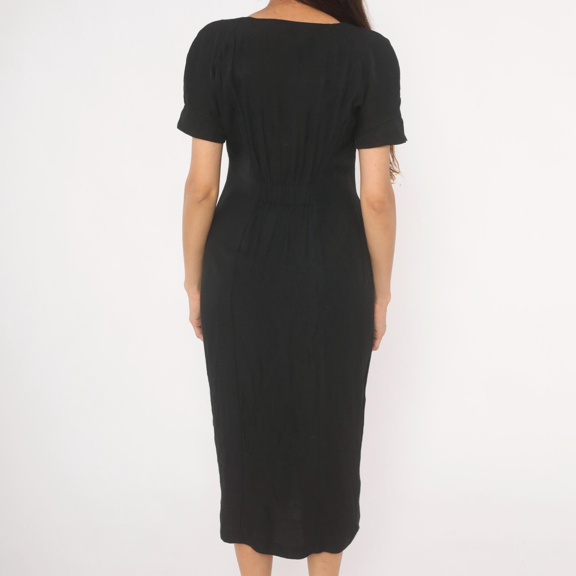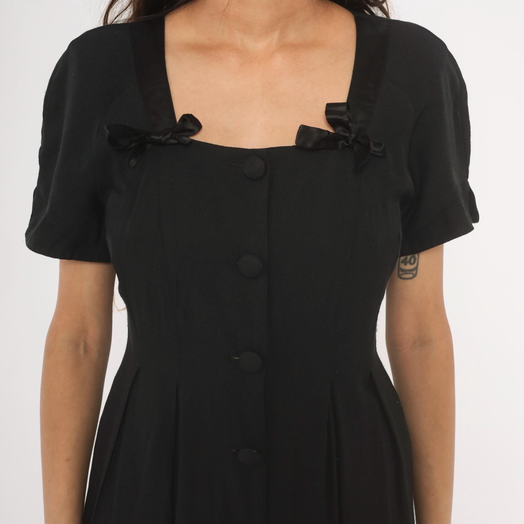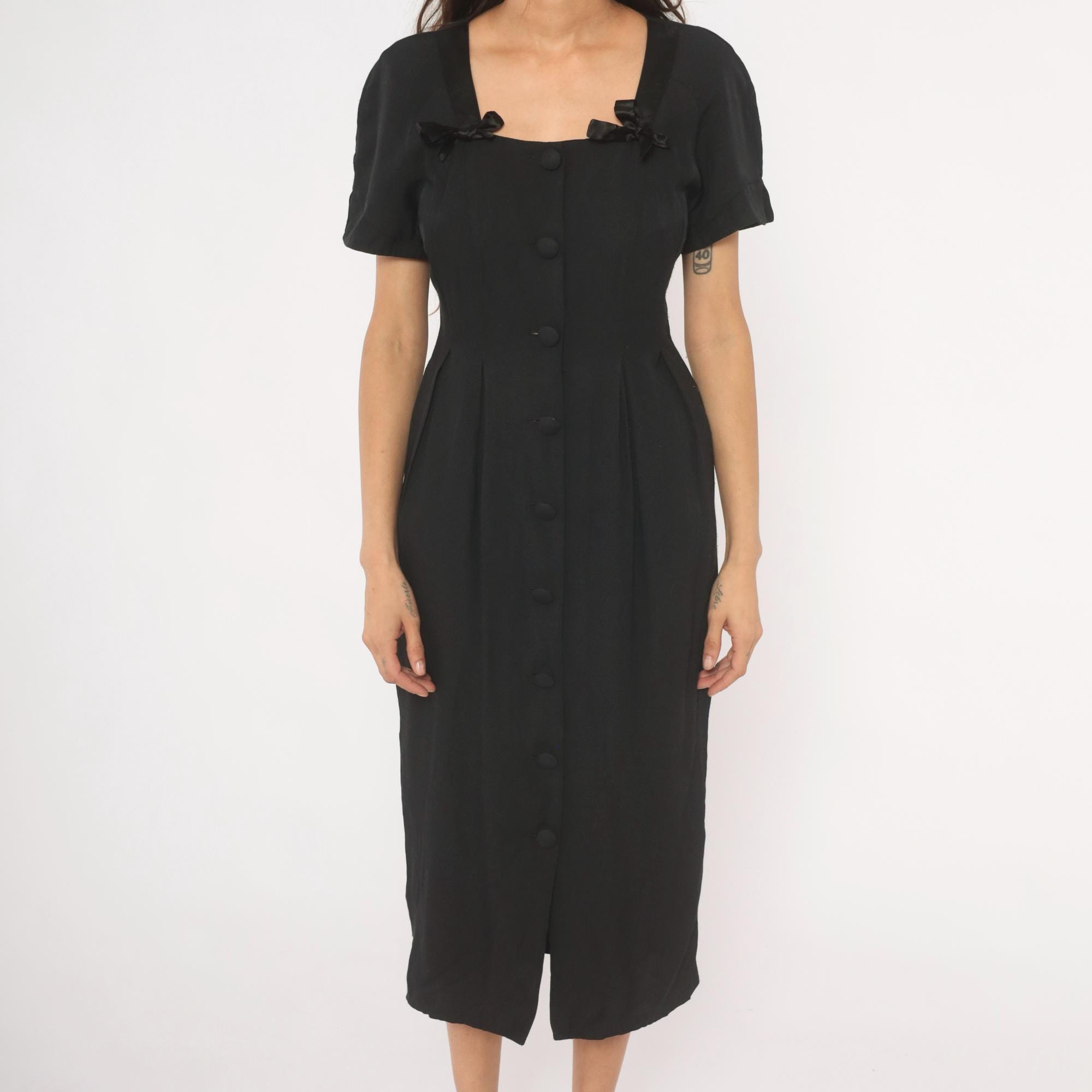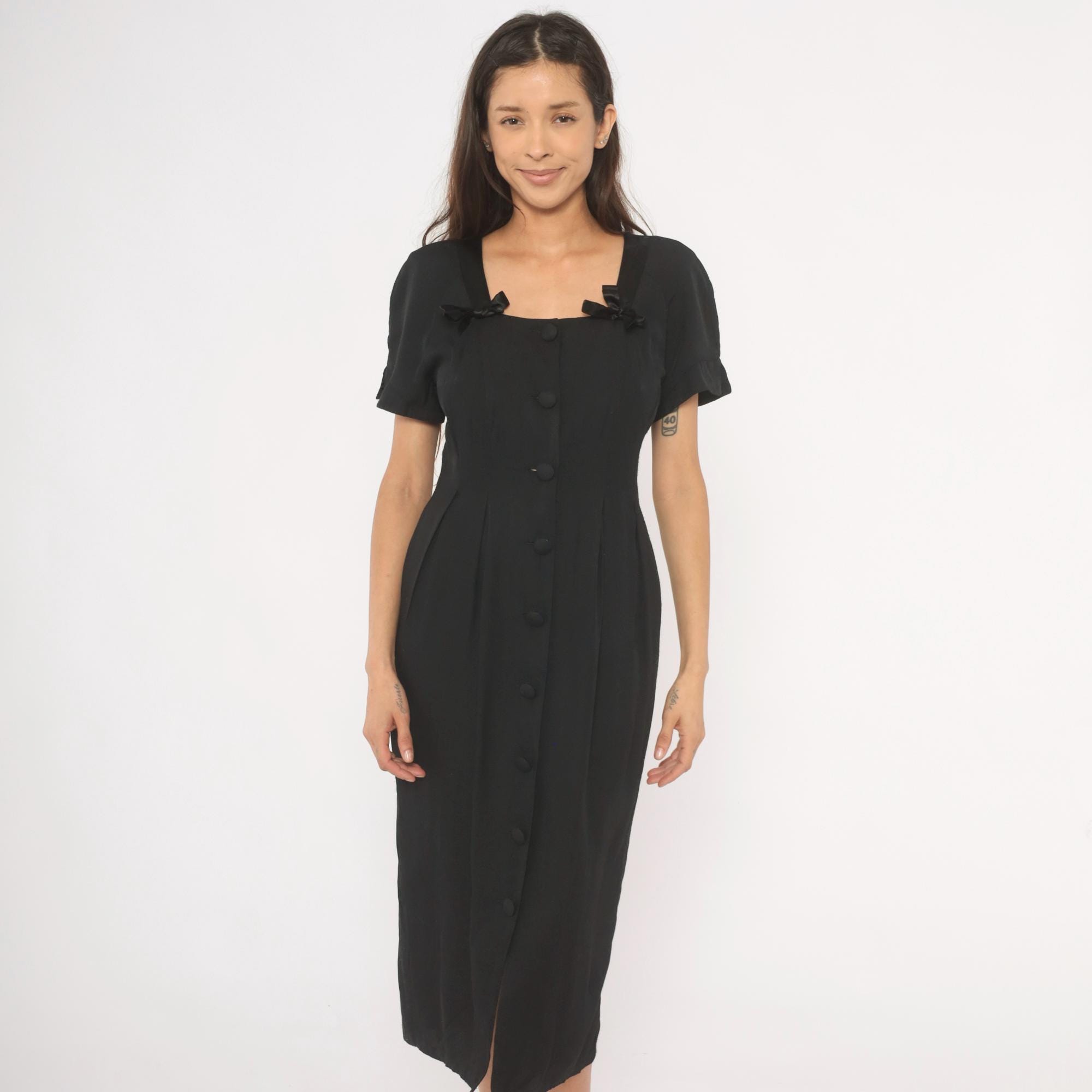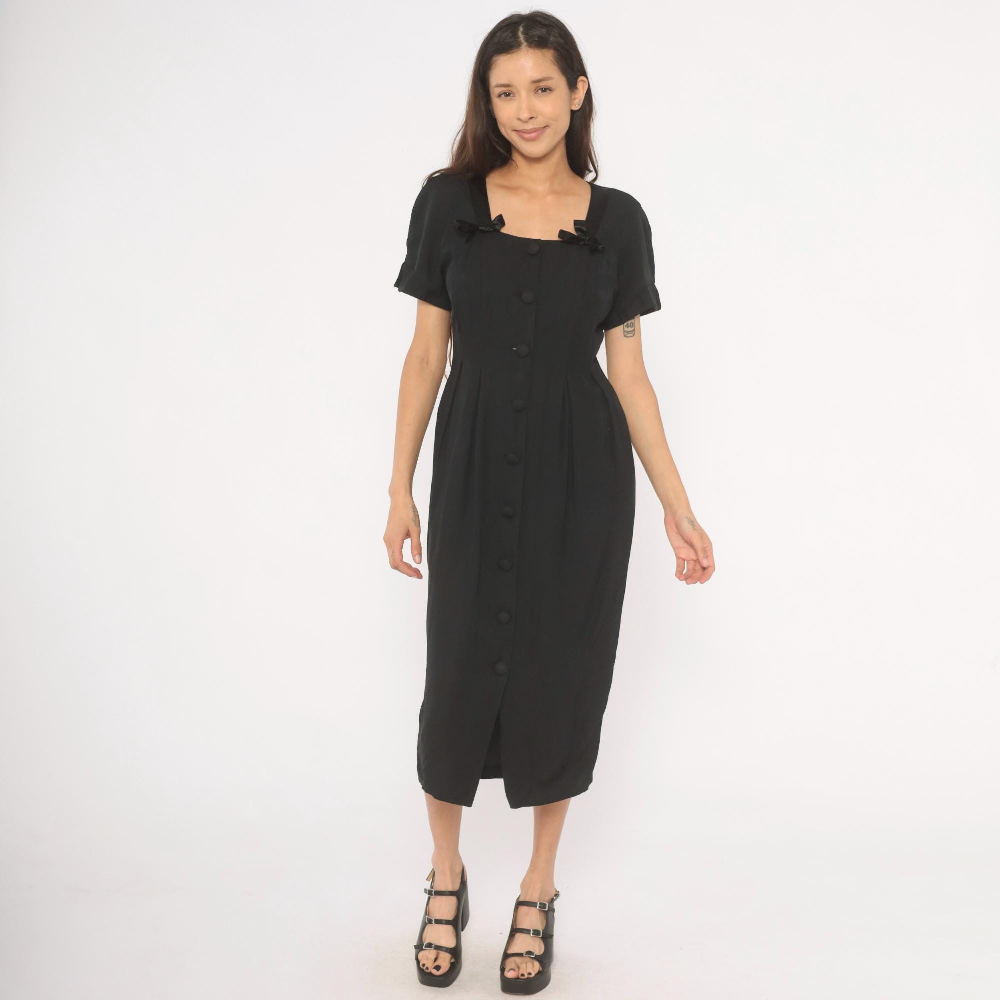 90s black midi dress from Atina by Karon Crosby with a square neckline edged by two small satin ribbon bows at each corner. Button front closure runs the full length of the center, with a fitted bodice, defined waist, and straight skirt with a center front kick vent at the hem. Short puff sleeves with a structured cap shape, and pleating at the skirt front below the waist.