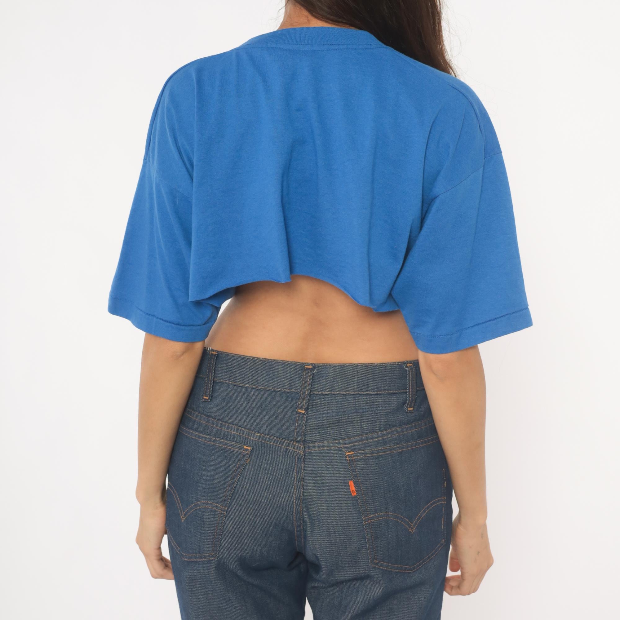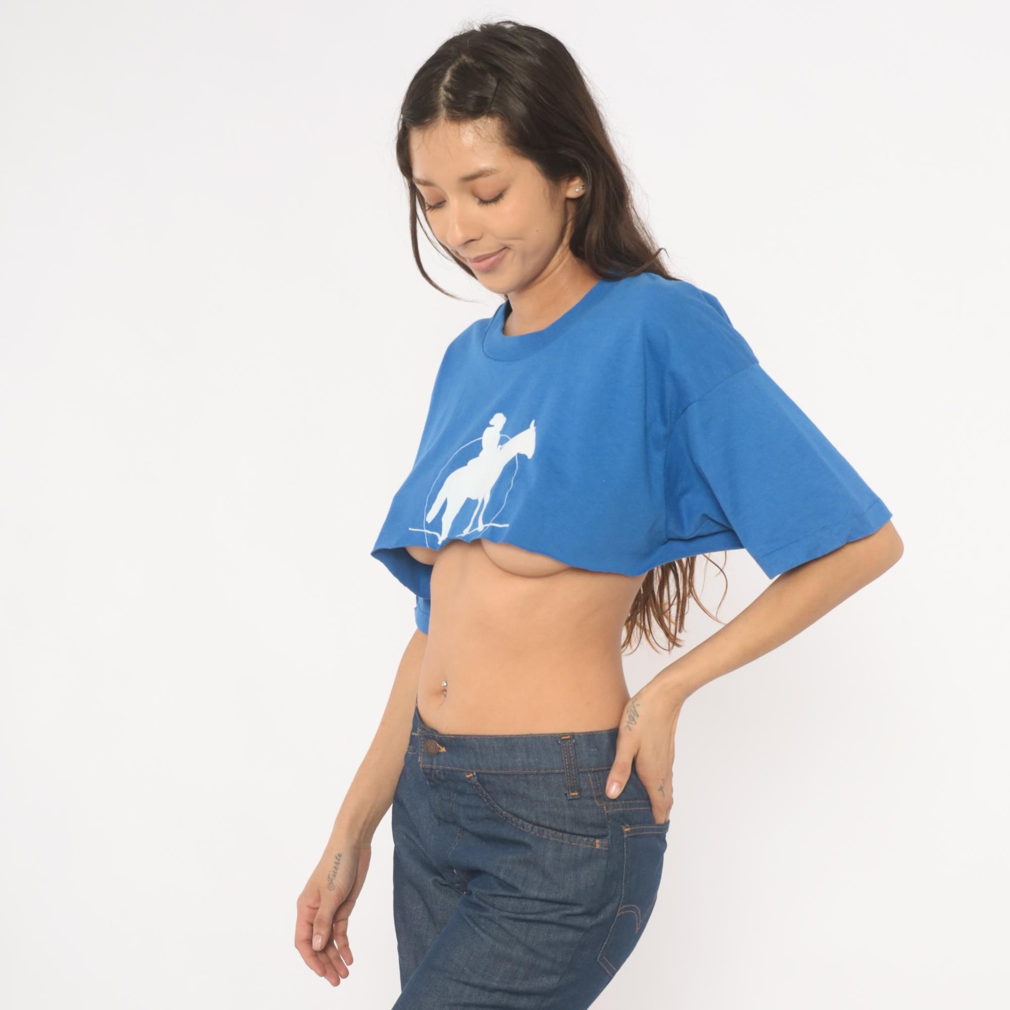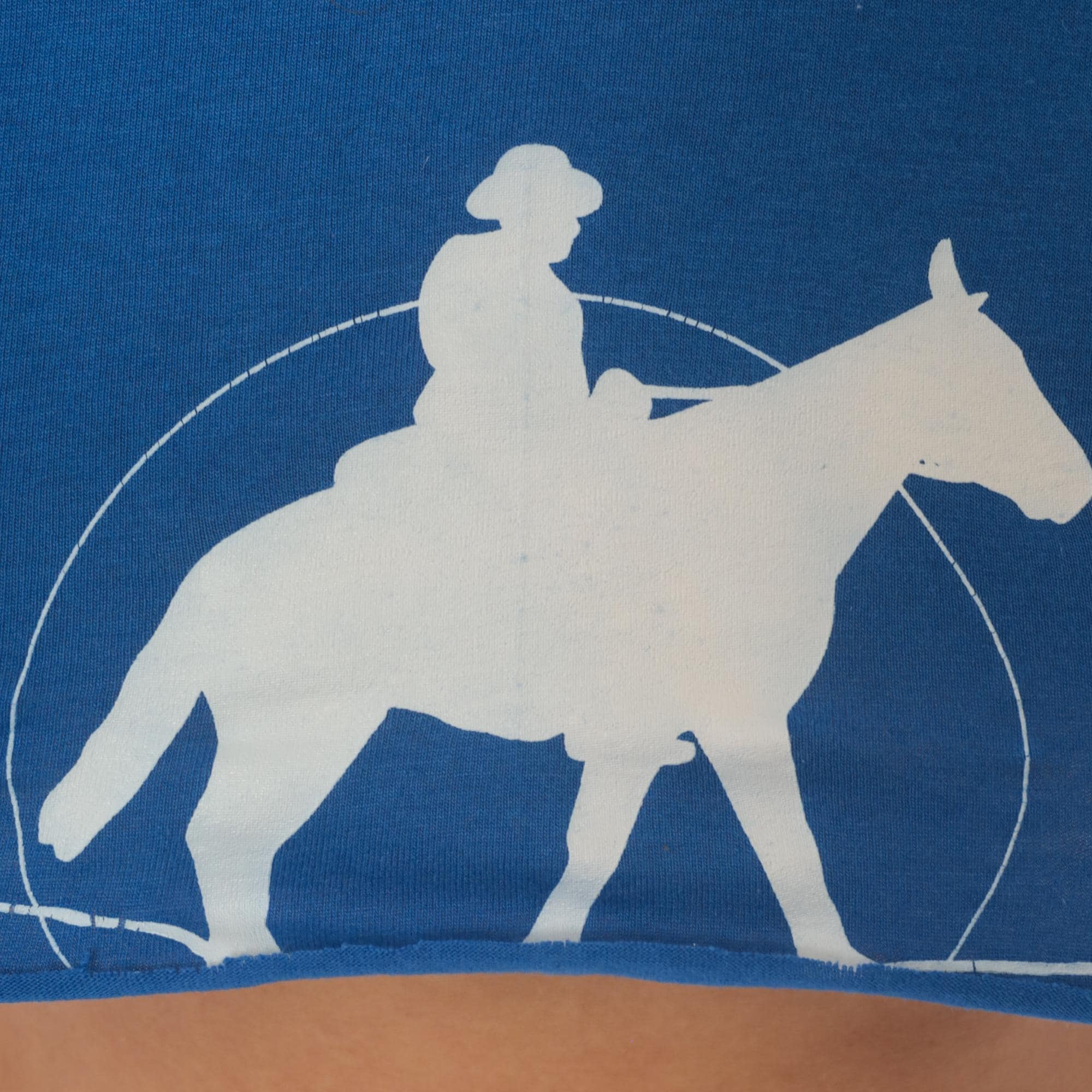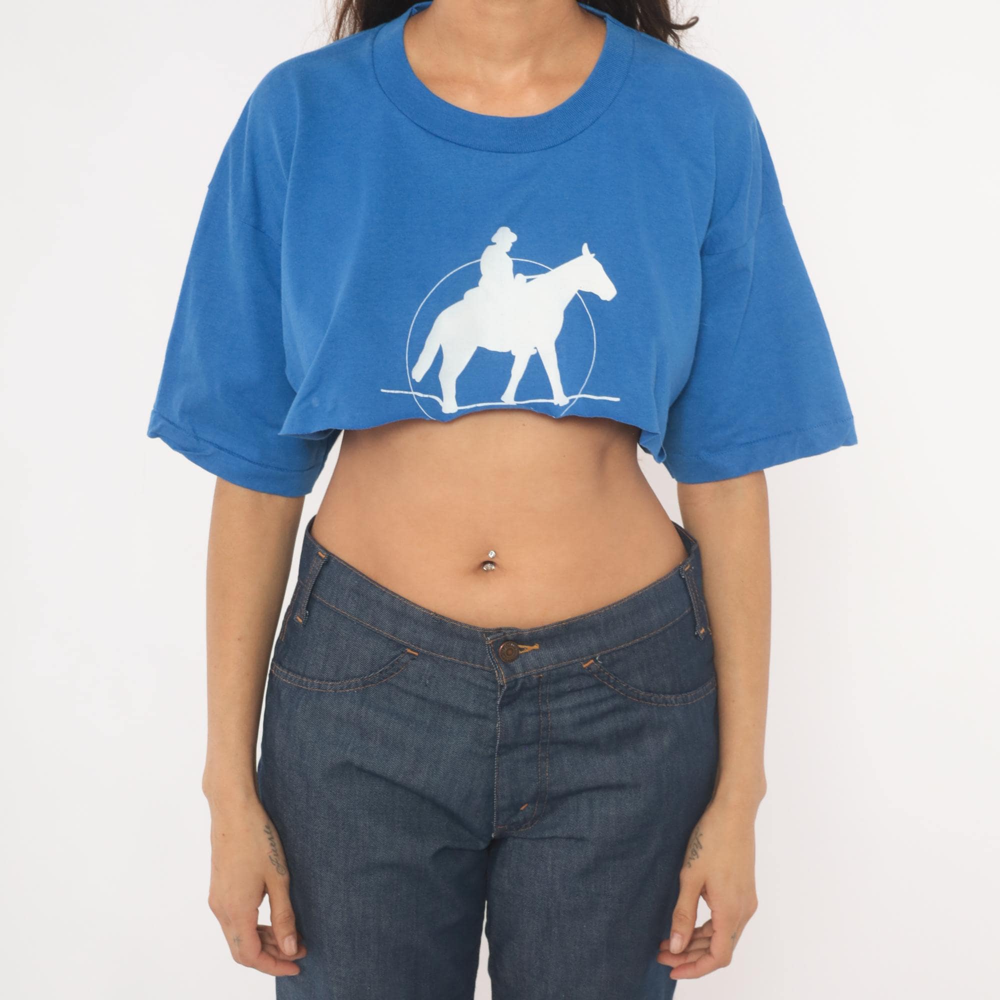 Royal cobalt blue crop tee from Fruit of the Loom with a white silhouette graphic of a cowboy on horseback inside a circular rope lasso design. Crew neckline, short sleeves, and a straight raw-cut hemline cropped at the midriff.