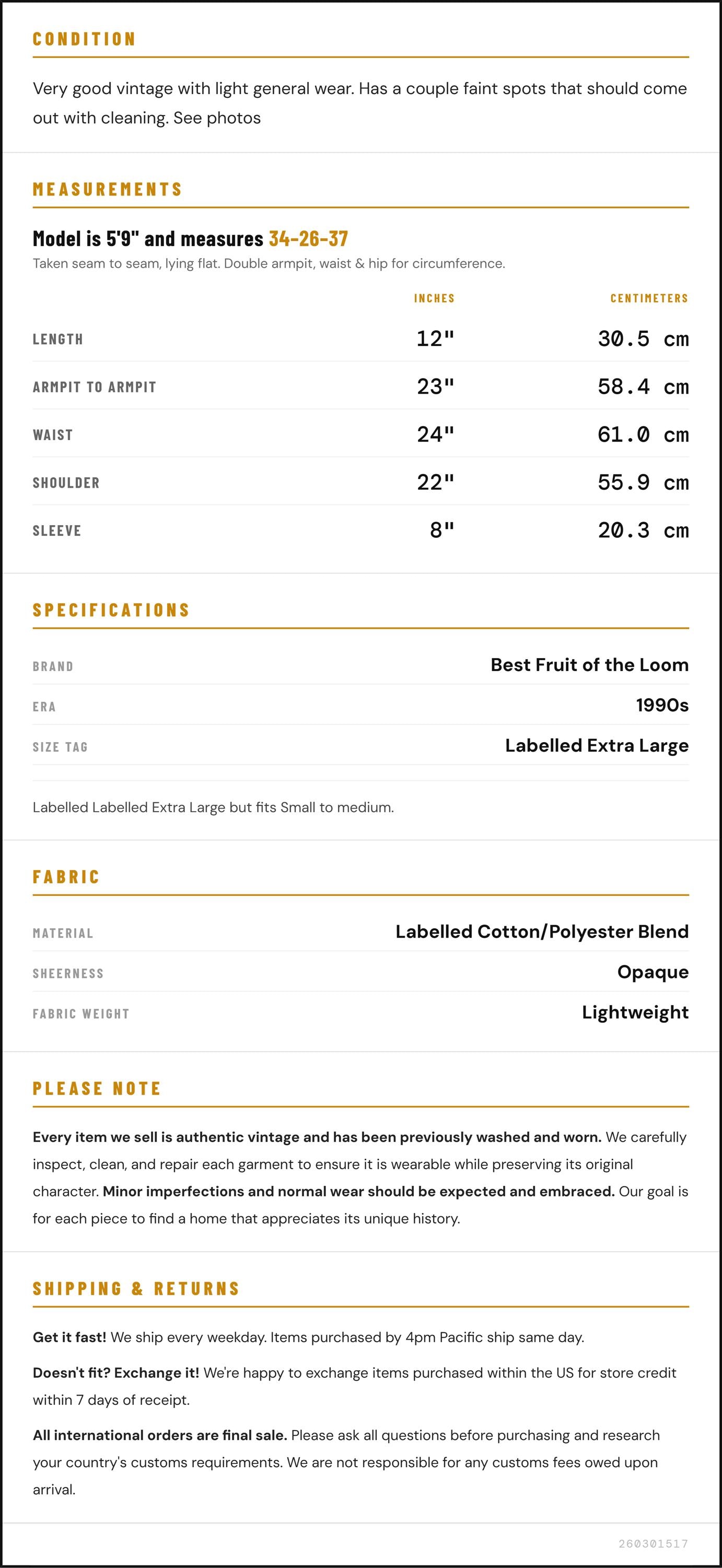 Doesn't fit? Exchange it! We're happy to exchange items purchased within the US for store credit within 7 days of receipt.