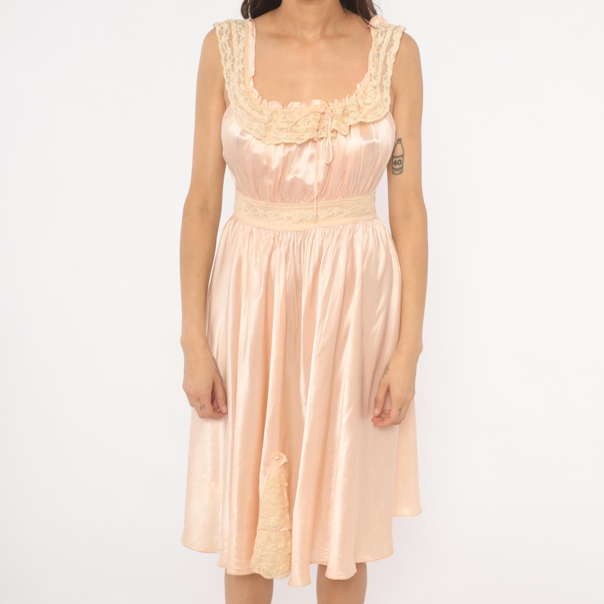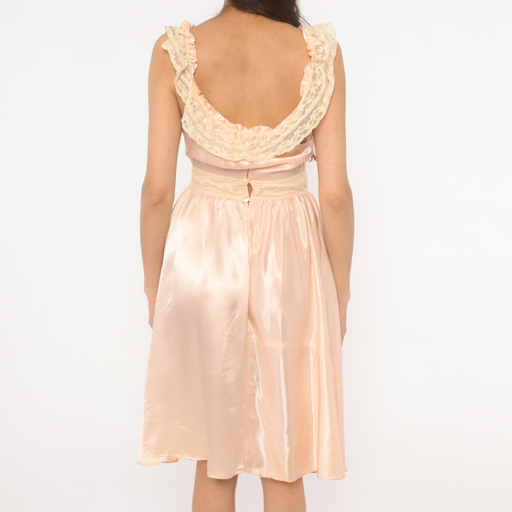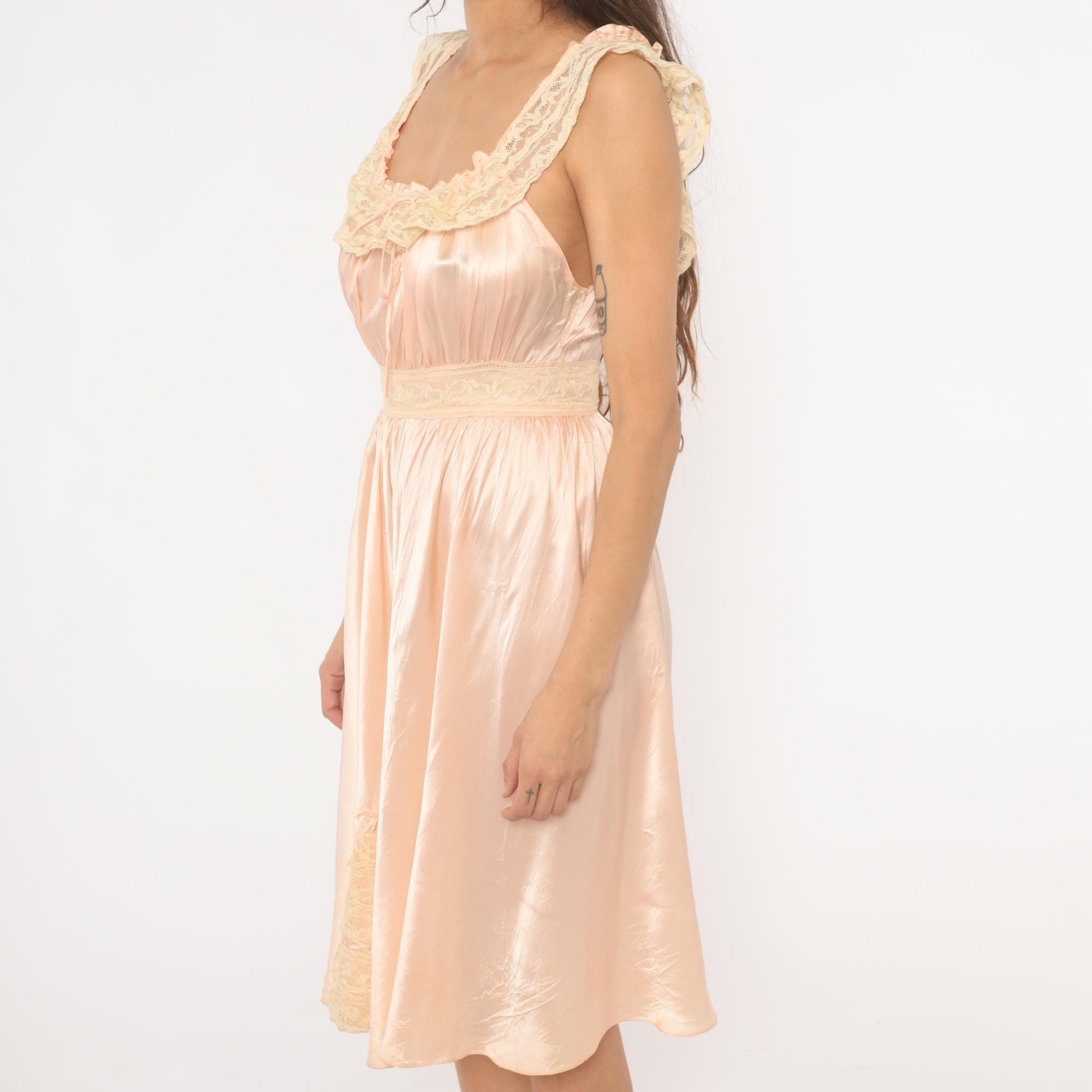 1940s blush pink satin nightgown with wide lace-trimmed straps and a scoop neckline framed by ruffled lace edging and a ribbon tie at center front. Gathered bodice with a lace waistband and button closure at the back. Full gathered skirt with a lace appliqué detail near the lower hem, falling to knee length.