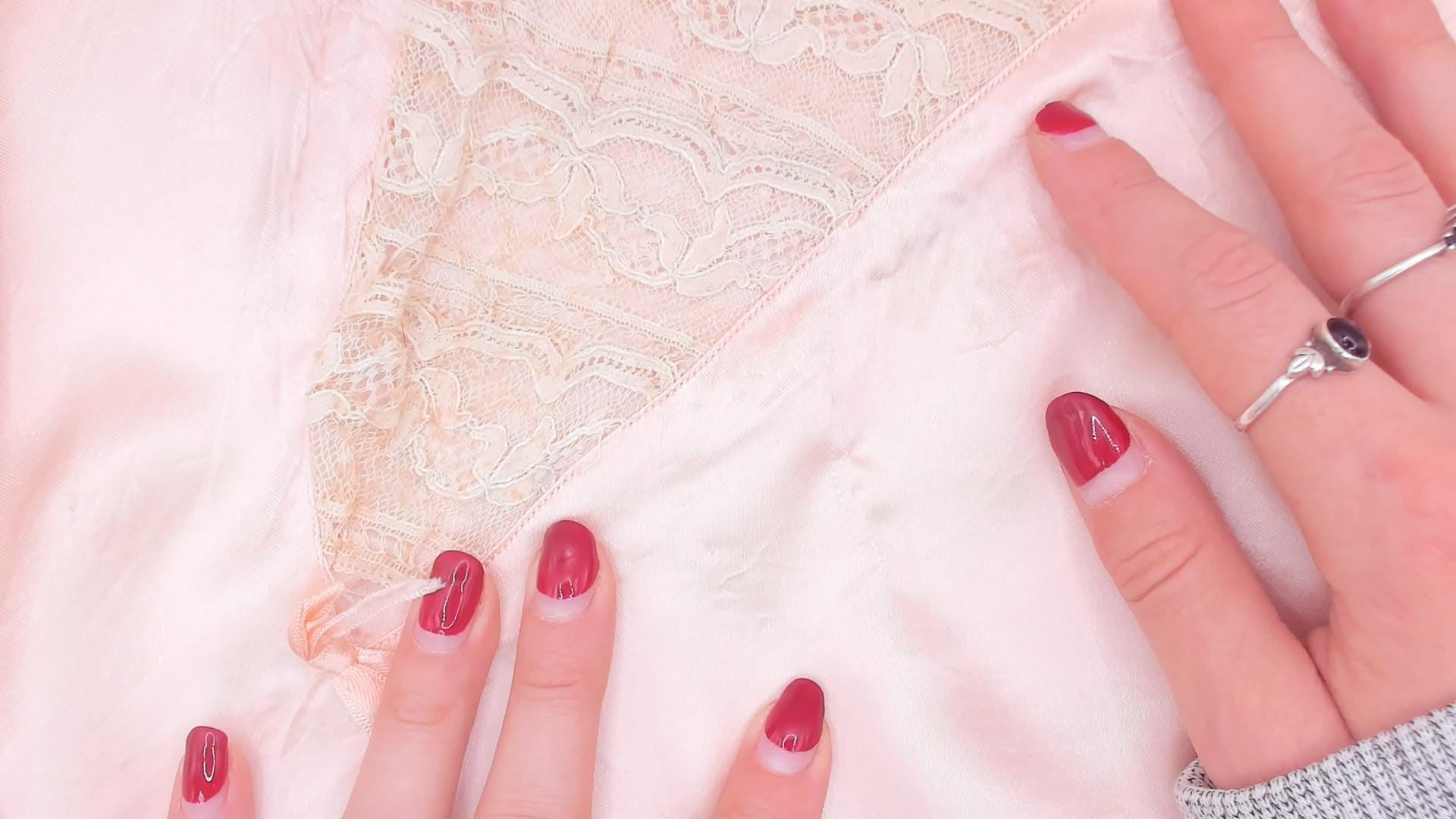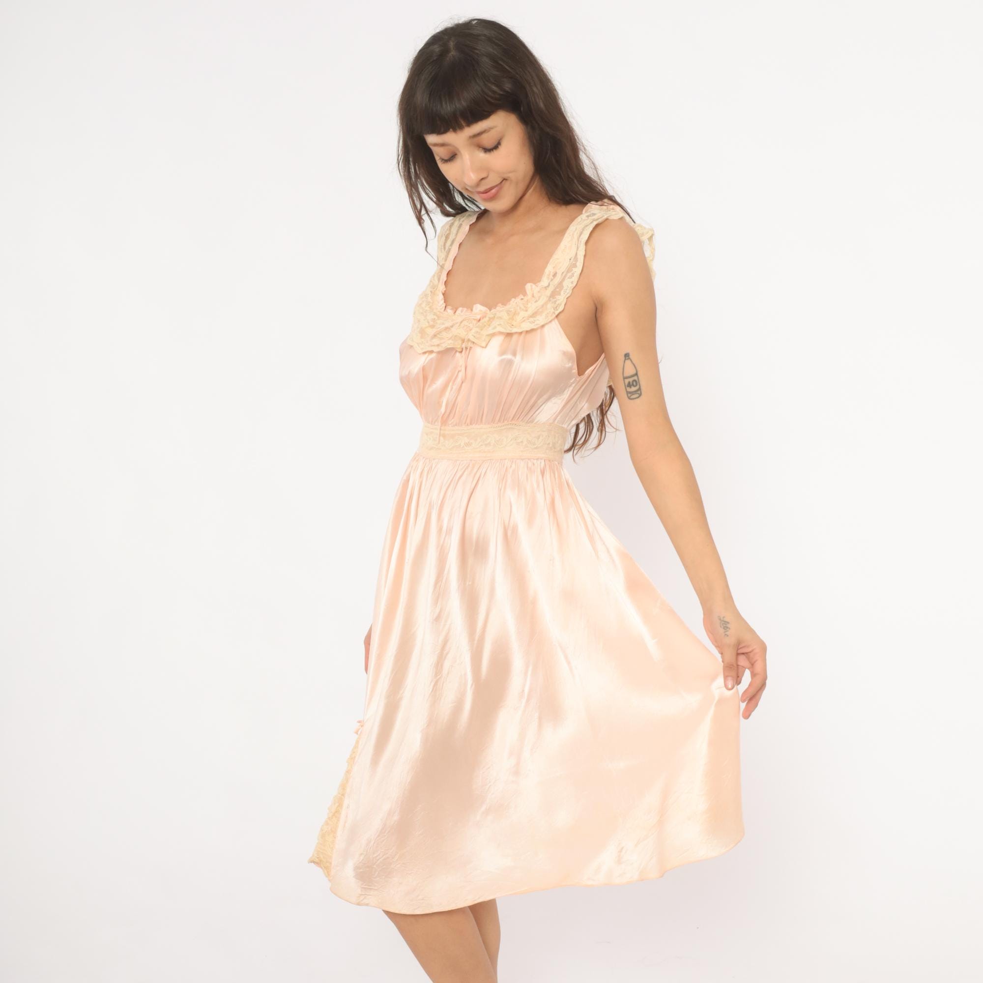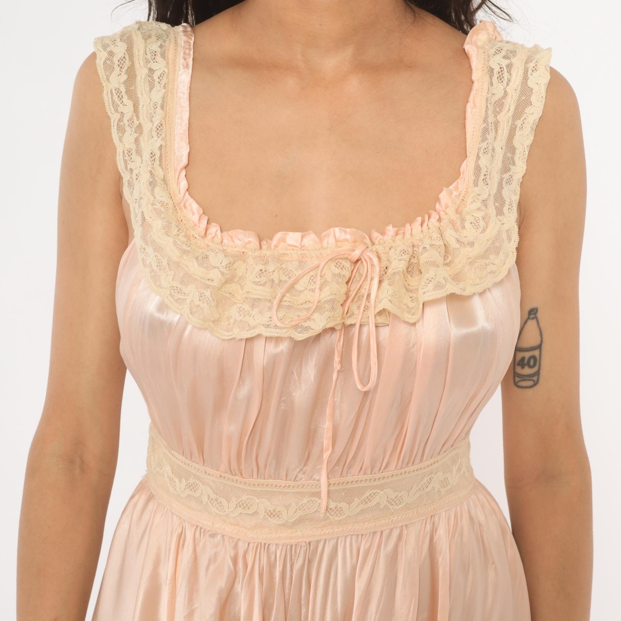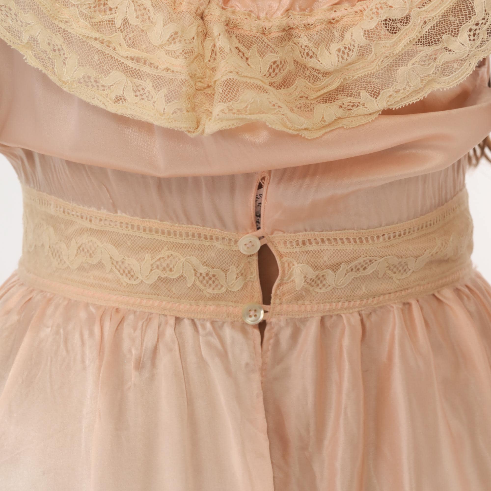 1940s blush pink satin nightgown with wide lace-trimmed straps and a scoop neckline framed by ruffled lace edging and a ribbon tie at center front. Gathered bodice with a lace waistband and button closure at the back. Full gathered skirt with a lace appliqué detail near the lower hem, falling to knee length.