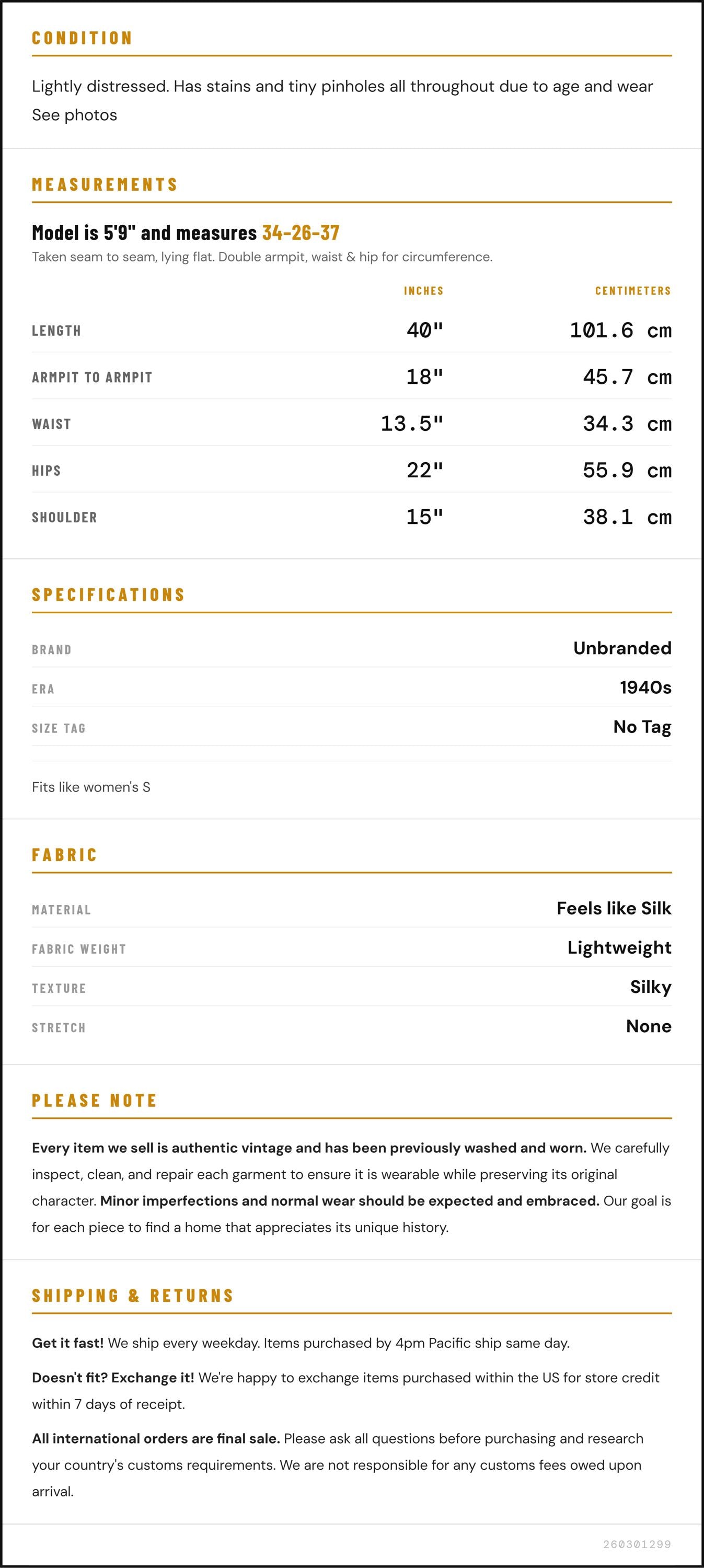 Measurements are taken laying flat and should be doubled where applicable. The "best fits" size is just an estimate, and vintage sizing can vary from modern sizing. Please use measurements to ensure proper fit. The best thing to do is measure a similar item of your own, and compare. When an item has stretch, we will list the unstretched dimensions with the stretched measurement afterwards.